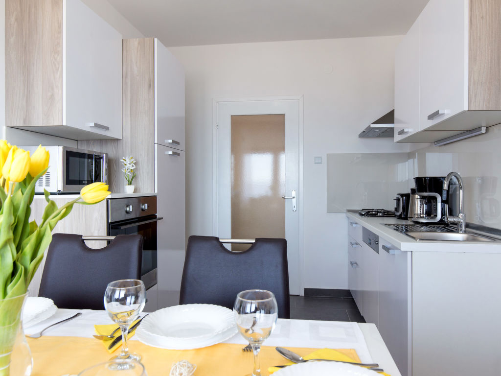 Haus LUKA, an ein weiteres Haus angrenzend, steht in Hanglage oberhalb der Küstenstraße in einem Wohn- und Ferienhausgebiet von Novi Vinodolski (Ortsmitte ca. 500 m). Schöner Blick auf das Meer und die Inseln Krk und San Marino. Nächste Einkaufsmöglichkeit ca. 200 m. Supermarkt 1 km. Fels-/Kiesstrand ca. 350 m. Von Mauer umgebenes, ca. 200 m² großes Grundstück mit Weinreben. Große Terrasse mit gemauertem und transportablem Grill sowie Mobiliar zur gemeinsamen Nutzung mit weiteren Feriengästen und dem Vermieter, der eine Wohnung im Erdgeschoss bewohnt. Eine Wohnung im Haus ist unbewohnt. Zu den Wohnungen gehört jeweils 1 Balkon mit Mobiliar, 2 Liegestühlen und Sonnenschirm. Pro Wohnung 1 Parkmöglichkeit auf dem Grundstück und 1 Parkmöglichkeit an der Straße beim Haus. NOV 105 ist feriengerecht und freundlich eingerichtet, mit Fliesen- und Parkettboden. NOV 106 mit moderner, heller Einrichtung, Fliesen-, Laminat- und Parkettboden. Sat-TV (deutsche Programme). Internetzugang (WLAN, inklusive). Waschmaschine beim Vermieter (Bezahlung). Klimaanlage mit Kühl-/Heizfunktion im Wohnraum. Hinweis: Rauchen ist in den Wohnungen nicht gestattet.