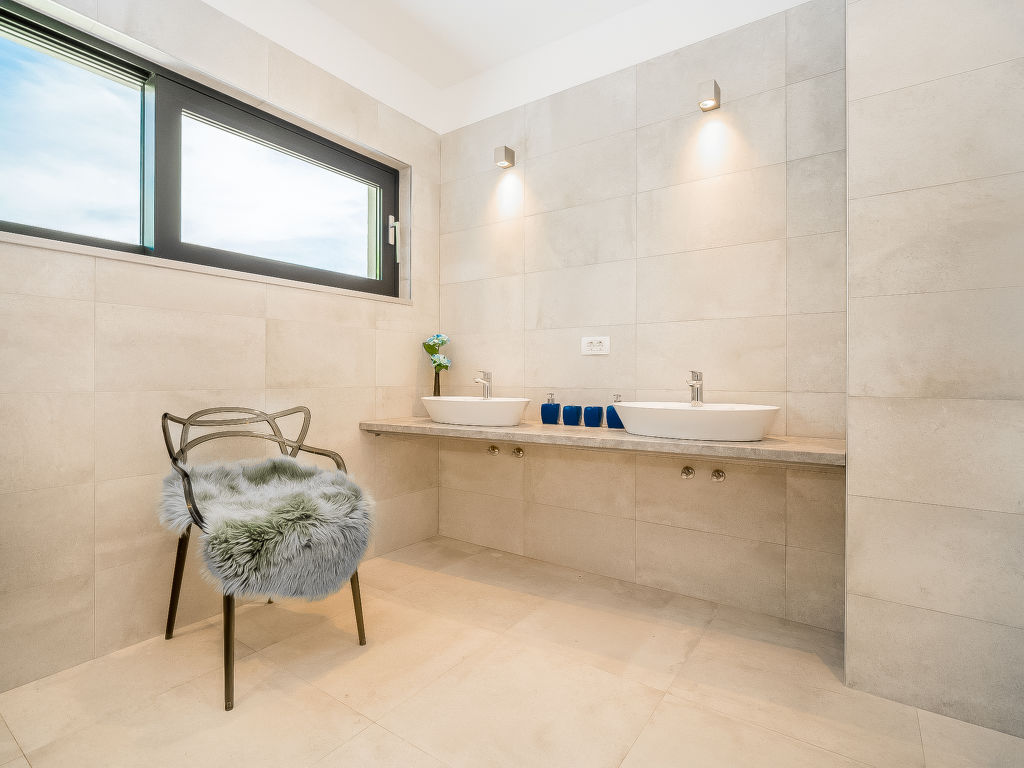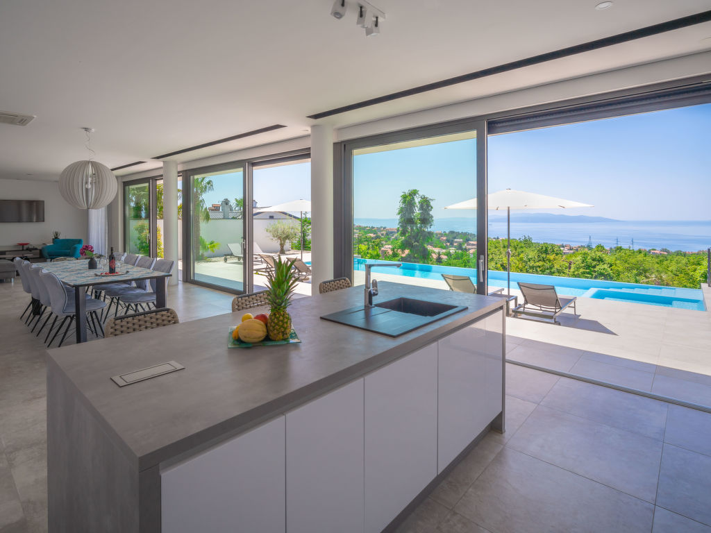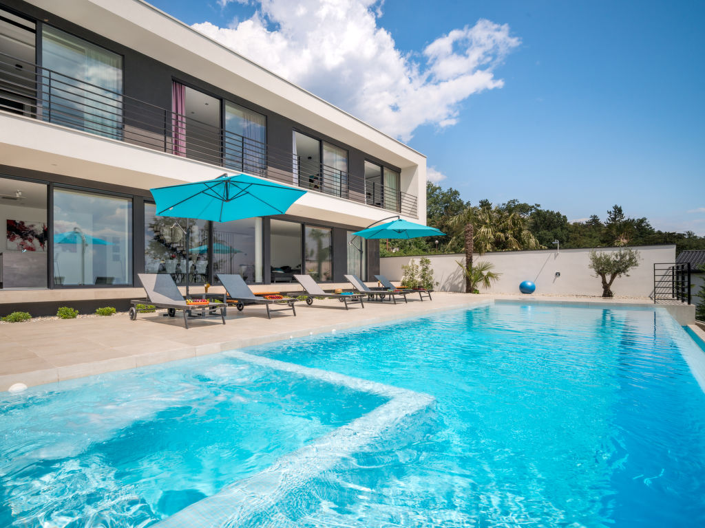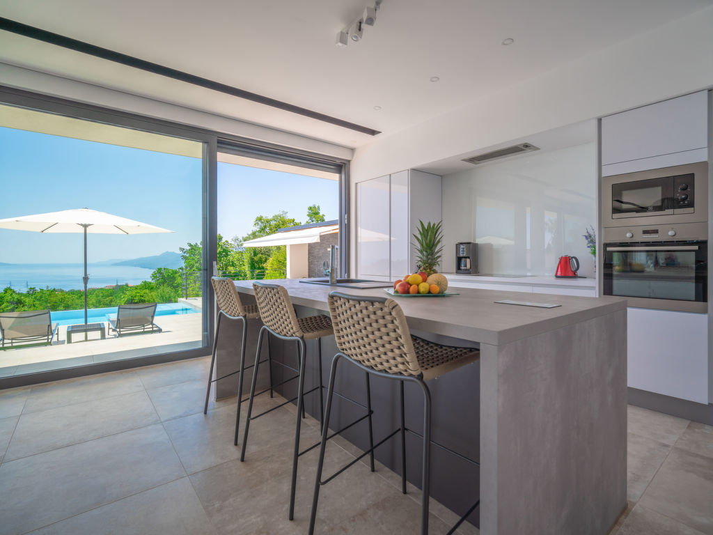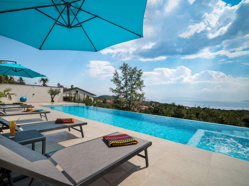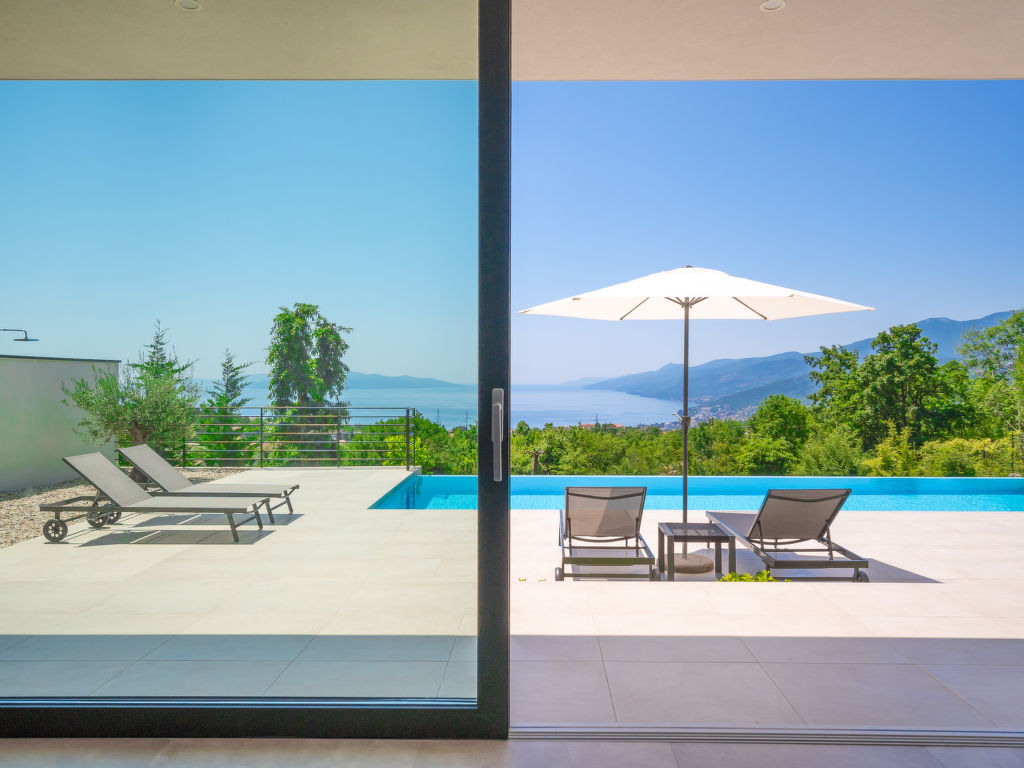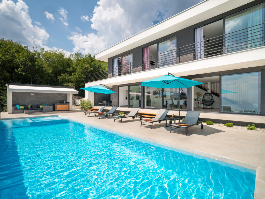 Matulji: Modernes Einfamilienhaus "Villa Minimal", auf 2 Stockwerken, Baujahr 2018. Im Weiler Spinčići, 1.5 km vom Zentrum von Matulji, 6 km vom Zentrum von Opatija, ruhige, sonnige, erhöhte Lage, 4 km vom Meer, 4 km vom Strand, in einer Sackgasse, im Grünen. Zur Alleinbenutzung: Grundstück 1'300 m2 (eingezäunt), Schwimmbad eckig, beheizt (10 x 4 m, 150 cm tief, 01.04.-30.10.) mit Innentreppe. Aussendusche, Tischtennis, Basketball, Terrasse (130 m2), Grill. Im Hause: Internetzugang, Sauna, Sprudelbad, Billard, Klimaanlage, Waschmaschine. Parkplatz (für 3 Autos) beim Haus auf dem Grundstück. Einkaufsgeschäft 350 m, Restaurant 1 km, Kieselstrand 4 km, betonierter Strand 4 km. Schwimmbad mit Hydromassage. Schwimmbad beheizt (extra).