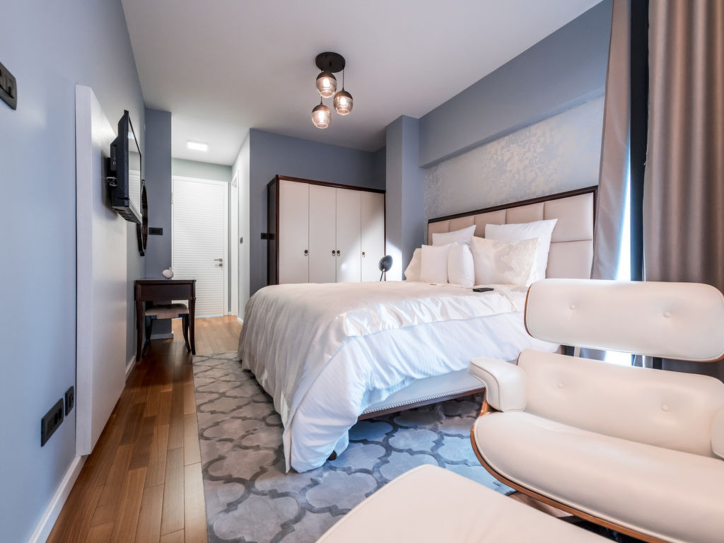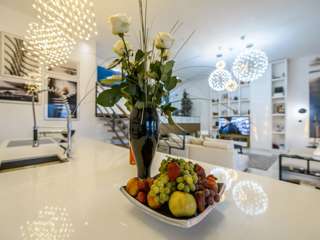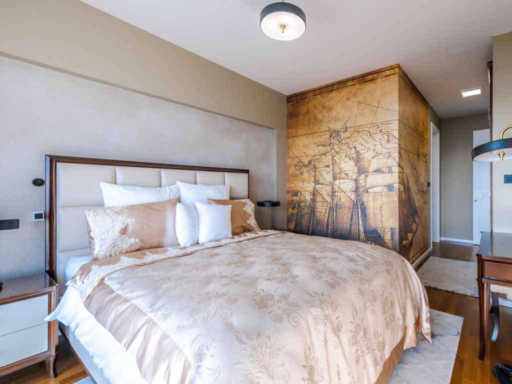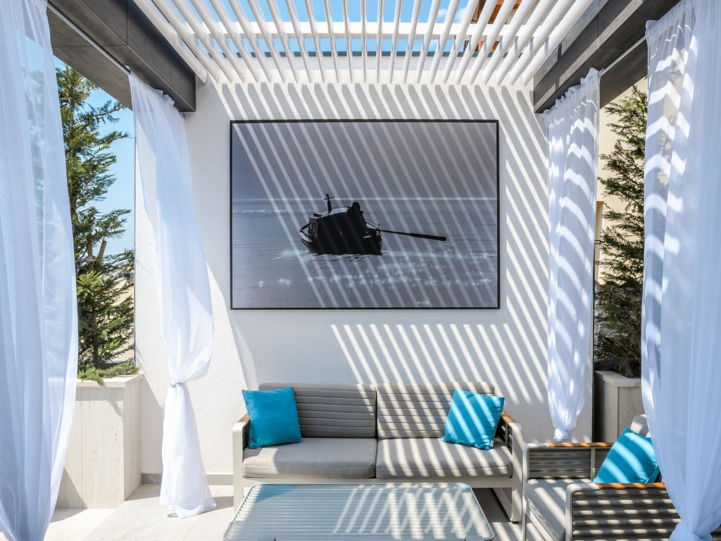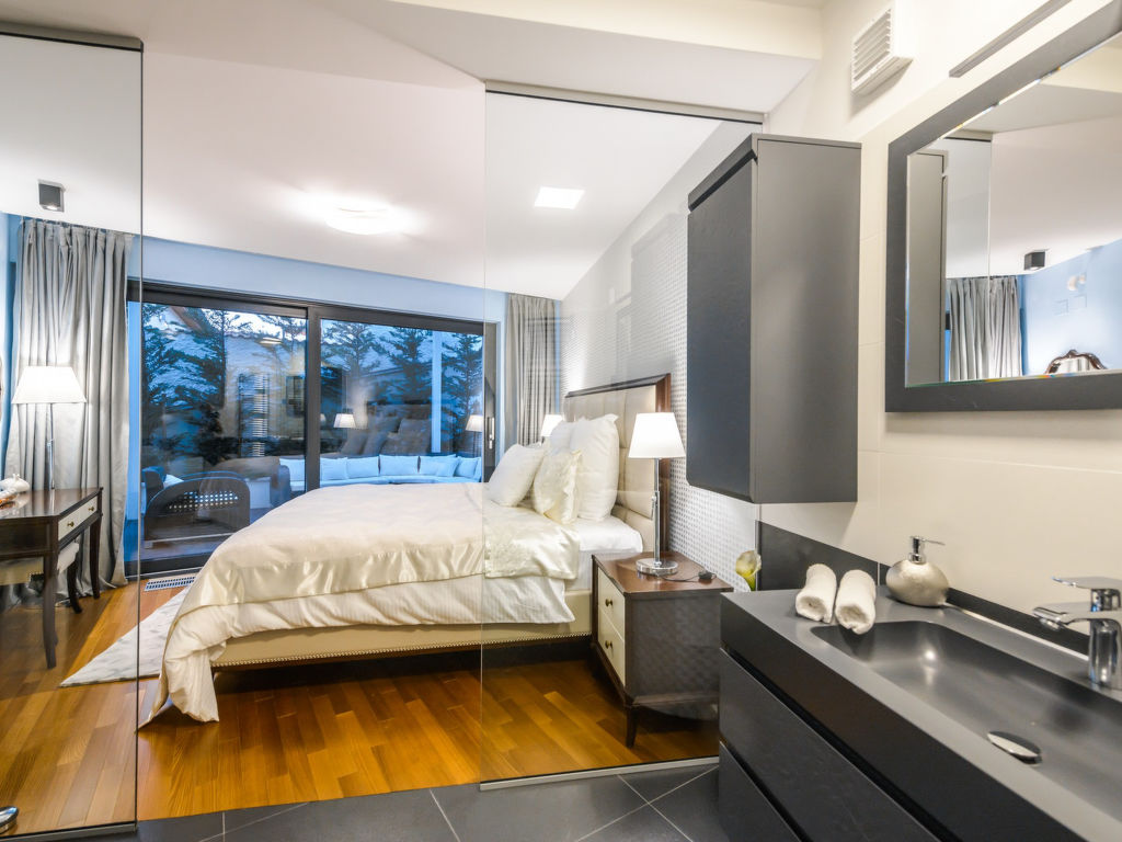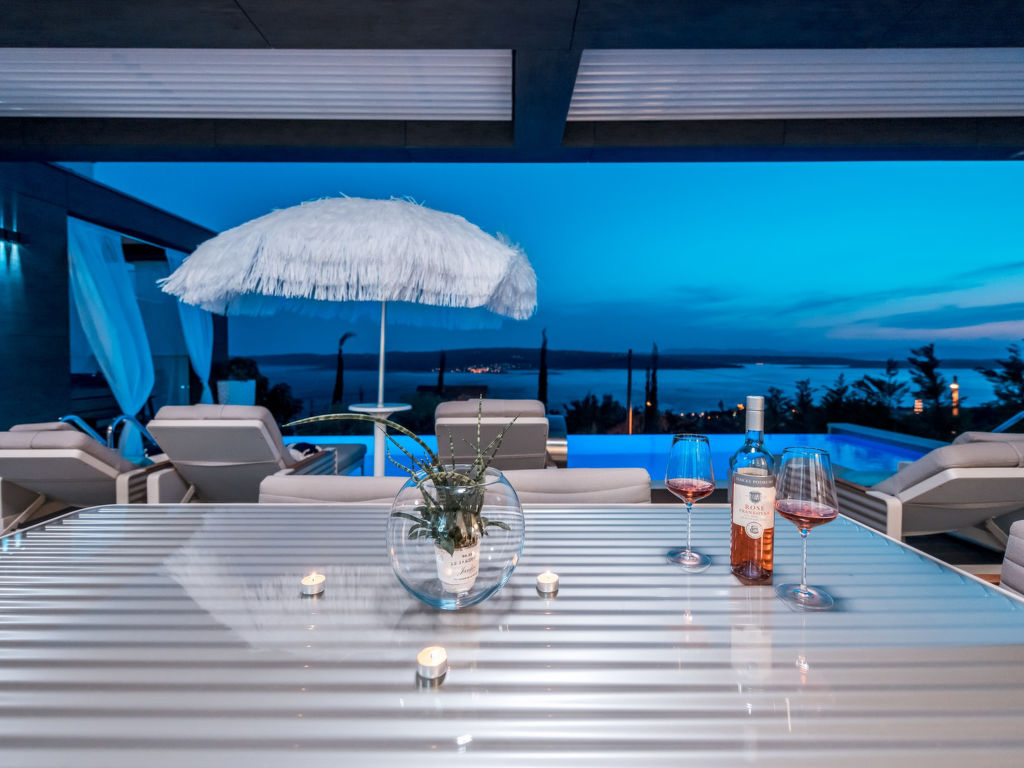 5-Zimmer-Haus 270 m2 auf 3 Stockwerken. Modern und luxuriös eingerichtet: Wohn-/Esszimmer 65 m2 mit Sat-TV (Flachbildschirm). Ausgang zur Terrasse. Offene Küche (Backofen, Geschirrspüler, 4 Glaskeramikherd Platten, Mikrowelle, Tiefkühler, elektrische Kaffeemaschine). Obergeschoss: 1 Zimmer mit 1 franz. Bett (180 cm, Länge 200 cm), Bad und Waschbecken. Ausgang zur Terrasse. Sep. WC. 2. Obergeschoss: 3 Zimmer, jedes Zimmer mit 1 franz. Bett (180 cm, Länge 200 cm), Dusche/WC und TV (Flachbildschirm). Ausgang zum Balkon. Bodenheizung. Balkon 15 m2, Terrasse 70 m2, Terrasse 15 m2. Terrassenmöbel, Gartengrill (mobil), Liegestühle. Schöne Sicht auf das Meer und das Schwimmbad. Zur Verfügung: Safe, Kinderhochstuhl, Babybett, Haartrockner. Internet (Wireless LAN, gratis). Parkplatz (überdacht, 1 Auto). Zur Verfügung: Wein-Kühlschrank.