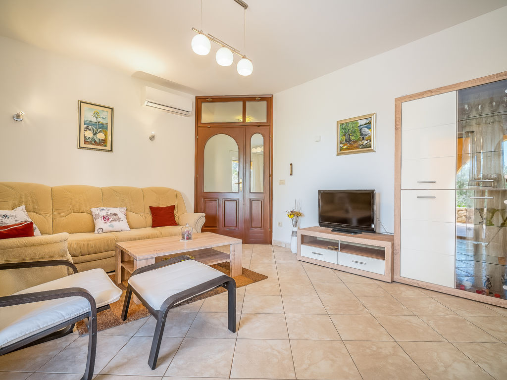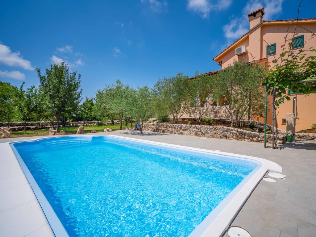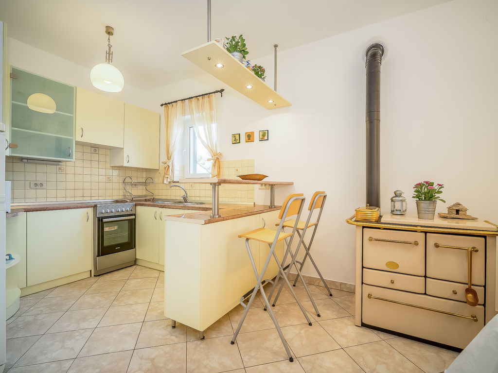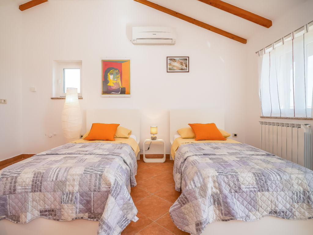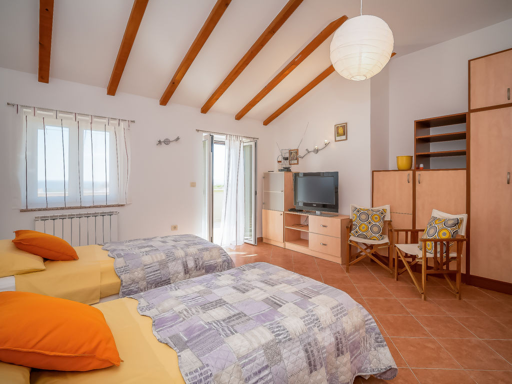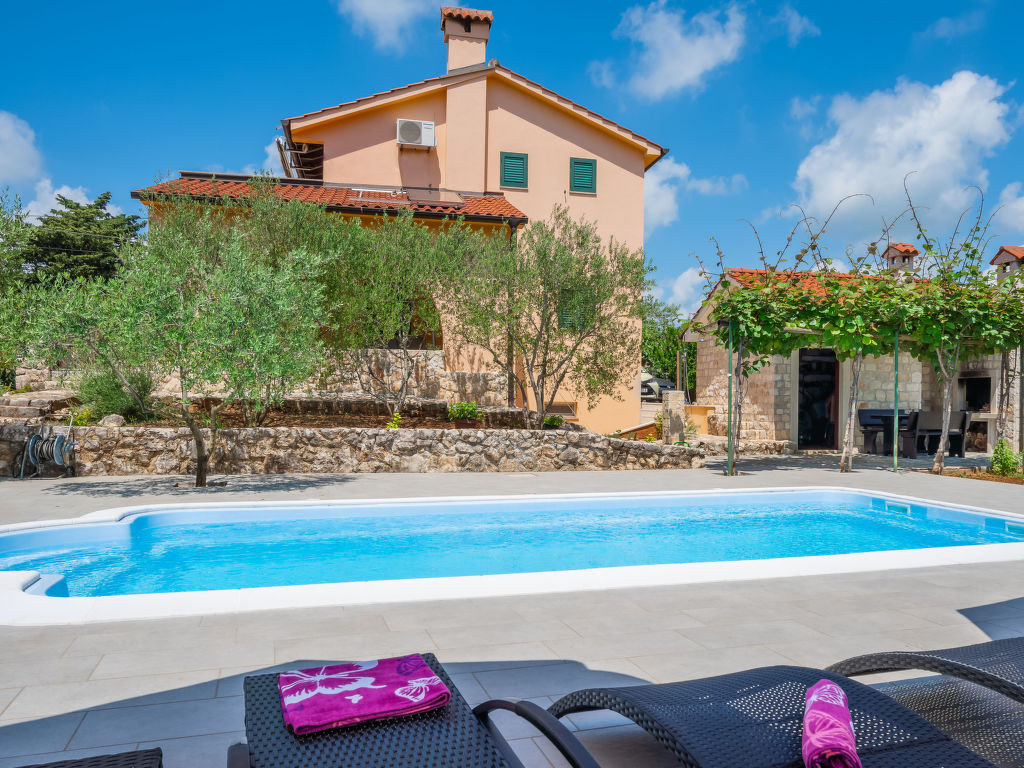 Kras: Einfamilienhaus "Mila", auf 2 Stockwerken. 3.5 km vom Zentrum von Dobrinj, 9 km vom Zentrum von Malinska, 11 km vom Zentrum von Krk, ruhige, sonnige Lage, 8.5 km vom Meer, im Grünen. Zur Alleinbenutzung: Grundstück 1'400 m2, Rasen 400 m2, Bäumen, Schwimmbad eckig (8 x 4 m, 140 cm tief, 01.05.-15.10.) mit Innentreppe. Aussendusche, Terrasse (24 m2), Gartenmöbel, Grill. Im Hause: Internetzugang, Waschmaschine. Parkplatz (für 4 Autos) beim Haus auf dem Grundstück. Einkaufsgeschäft 700 m, Supermarkt 8.5 km, Restaurant 3.5 km, Kieselstrand 8.5 km, betonierter Strand 8.5 km. Jugendgruppen nur auf Anfrage. Von Gruppen junger Leute wird ein doppeltes Pfand verlangt bei der Ankunft.
