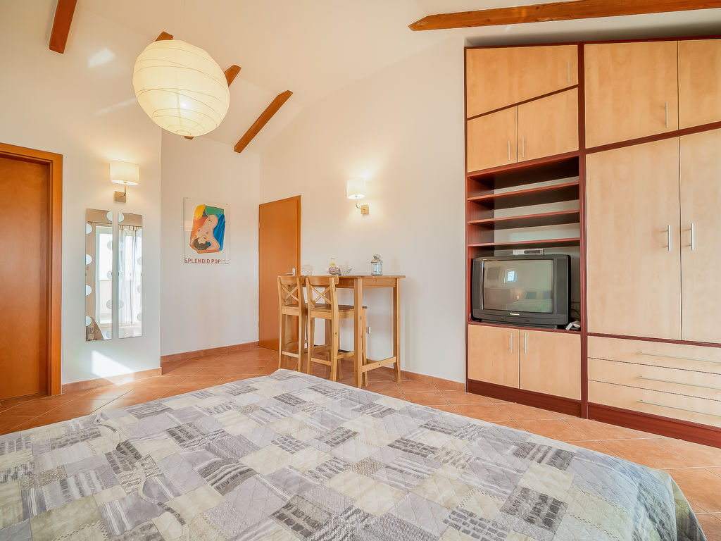 5-Zimmer-Haus 130 m2 auf 2 Stockwerken. Wohn-/Esszimmer 35 m2 mit Sat-TV (Flachbildschirm), Klimaanlage. Ausgang zur Terrasse. Eingang mit Klimaanlage. 2 Zimmer, jedes Zimmer mit 1 Doppelbett (2 x 90 cm, Länge 200 cm). Offene Küche (Backofen, Geschirrspüler, 4 Glaskeramikherd Platten, Mikrowelle, Tiefkühler, elektrische Kaffeemaschine). Dusche/WC, sep. WC. Obergeschoss: 1 Zimmer 20 m2 mit 1 franz. Bett (160 cm, Länge 200 cm), Küchenblock, Dusche/WC und Sat-TV (Flachbildschirm), Klimaanlage. Ausgang zur Terrasse. 1 Zimmer 20 m2 mit 2 Betten (90 cm, Länge 200 cm), Dusche/WC und Sat-TV (Flachbildschirm), Klimaanlage. Ausgang zur Terrasse. Terrasse 45 m2 teilweise überdacht, Terrasse 23 m2. Terrassenmöbel, Liegestühle. Sicht auf die Landschaft. Zur Verfügung: Kinderhochstuhl, Babybett. Internet (Wireless LAN, gratis).