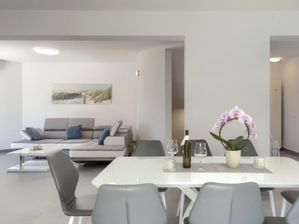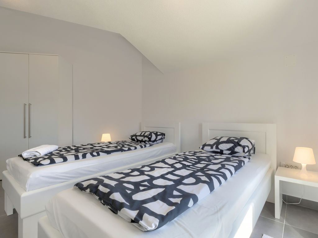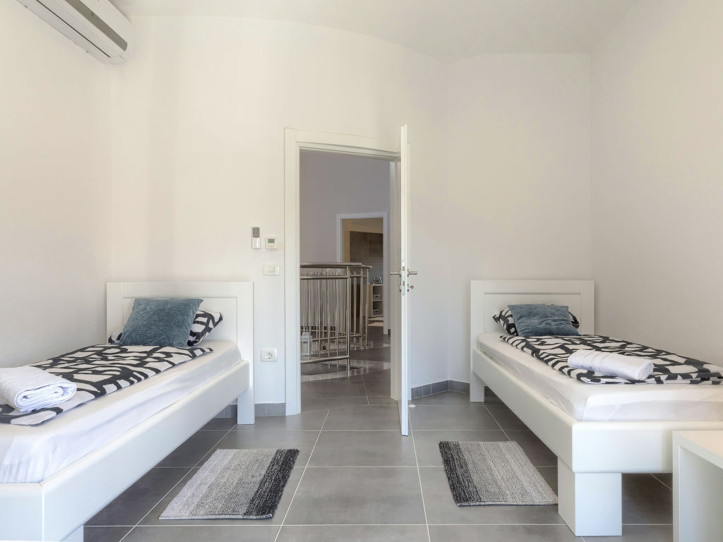 5-Zimmer-Haus 270 m2 auf 2 Stockwerken. Schön und gemütlich eingerichtet: Wohn-/Esszimmer 40 m2 mit Sat-TV (Flachbildschirm), Klimaanlage. Ausgang zur Terrasse, zum Schwimmbad. Offene Küche (Backofen, Geschirrspüler, 4 Glaskeramikherd Platten, Mikrowelle, Tiefkühler, elektrische Kaffeemaschine). Sep. WC. Obergeschoss: (Wendeltreppe) Eingang mit Klimaanlage. 1 Zimmer mit 1 Doppelbett (2 x 90 cm, Länge 200 cm), Klimaanlage. Dusche/WC. 2. Obergeschoss: (Wendeltreppe) Eingang mit Klimaanlage. 2 Zimmer, jedes Zimmer mit 2 Betten (90 cm, Länge 200 cm), Klimaanlage. 1 Zimmer mit 1 Doppelbett (2 x 90 cm, Länge 200 cm), Klimaanlage. Dusche/WC, Doppelwaschbecken. Liegestühle. Sicht auf das Schwimmbad. Zur Verfügung: Haartrockner. Internet (Wireless LAN, gratis). Bitte beachten: Feuerlöscher.