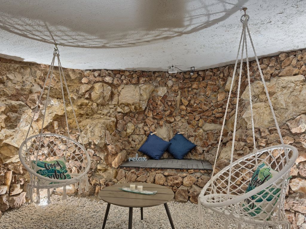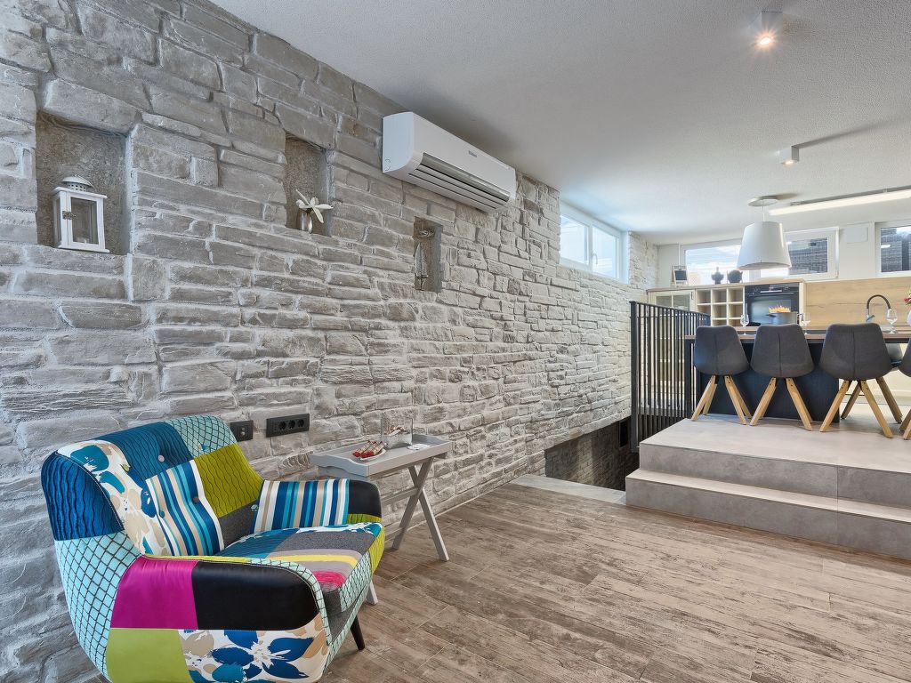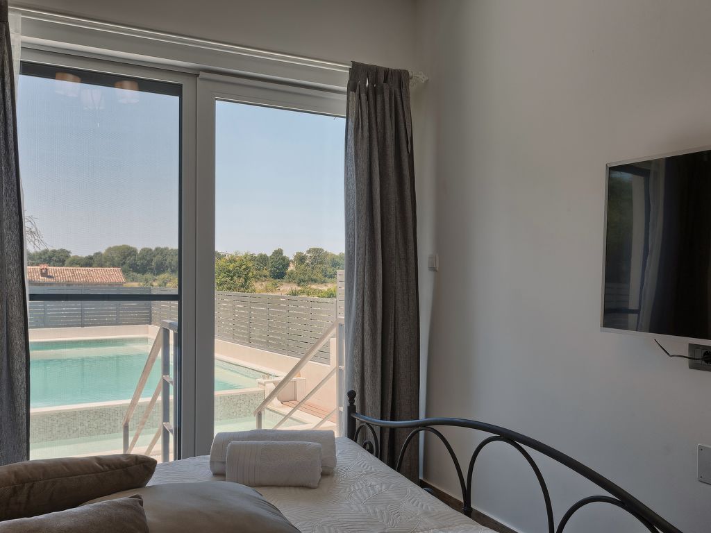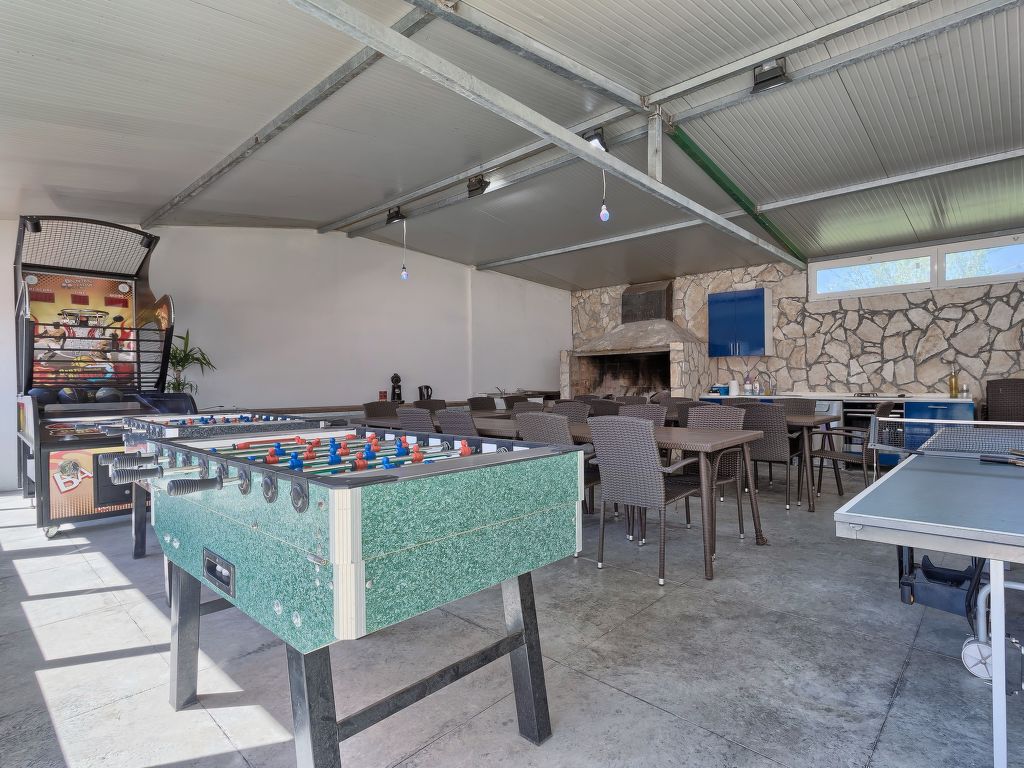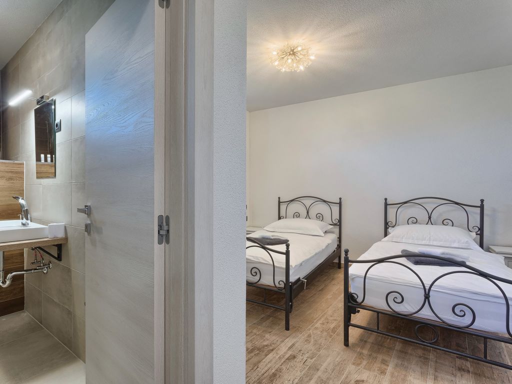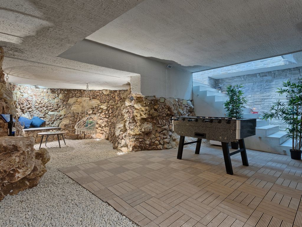 4-Zimmer-Villa 200 m2 auf 2 Stockwerken. 2 Zimmer, jedes Zimmer mit 1 franz. Bett (180 cm, Länge 200 cm), Dusche/WC und Sat-TV (Flachbildschirm), Klimaanlage. Ausgang zum Schwimmbad. Unteres Geschoss: Wohn-/Esszimmer mit 1 Doppeldiwanbett (160 cm, Länge 200 cm), Sat-TV (Flachbildschirm), Klimaanlage. Ausgang zum Garten, zum Schwimmbad. 1 Zimmer mit 2 Betten (90 cm, Länge 200 cm), Dusche/WC und Sat-TV (Flachbildschirm), Klimaanlage. Offene Küche (Backofen, Geschirrspüler, 4 Glaskeramikherd Platten, Mikrowelle, Tiefkühler, elektrische Kaffeemaschine). Sep. WC. Warmluftheizung. Gartengrill (mobil), Liegestühle. Zur Verfügung: Safe, Kinderhochstuhl, Haartrockner. Internet (Wireless LAN, gratis). 1 kleines Haustier/Hund erlaubt. Ess- / Wohnbereich, offene Küche und ein Schlafzimmer im unteren Erdgeschoss. Hoch platzierte Fenster im Schlafzimmer mit 2 Betten. Verfügbar: im Keller Höhle als Lounge eigerichtet.