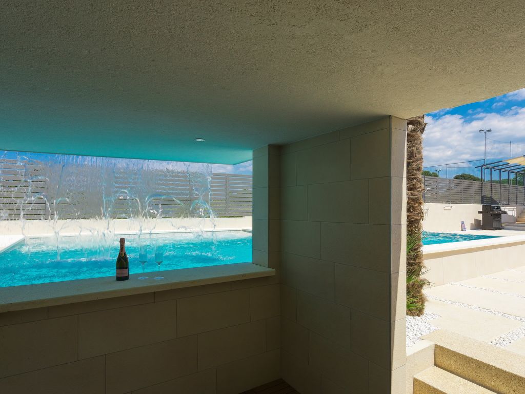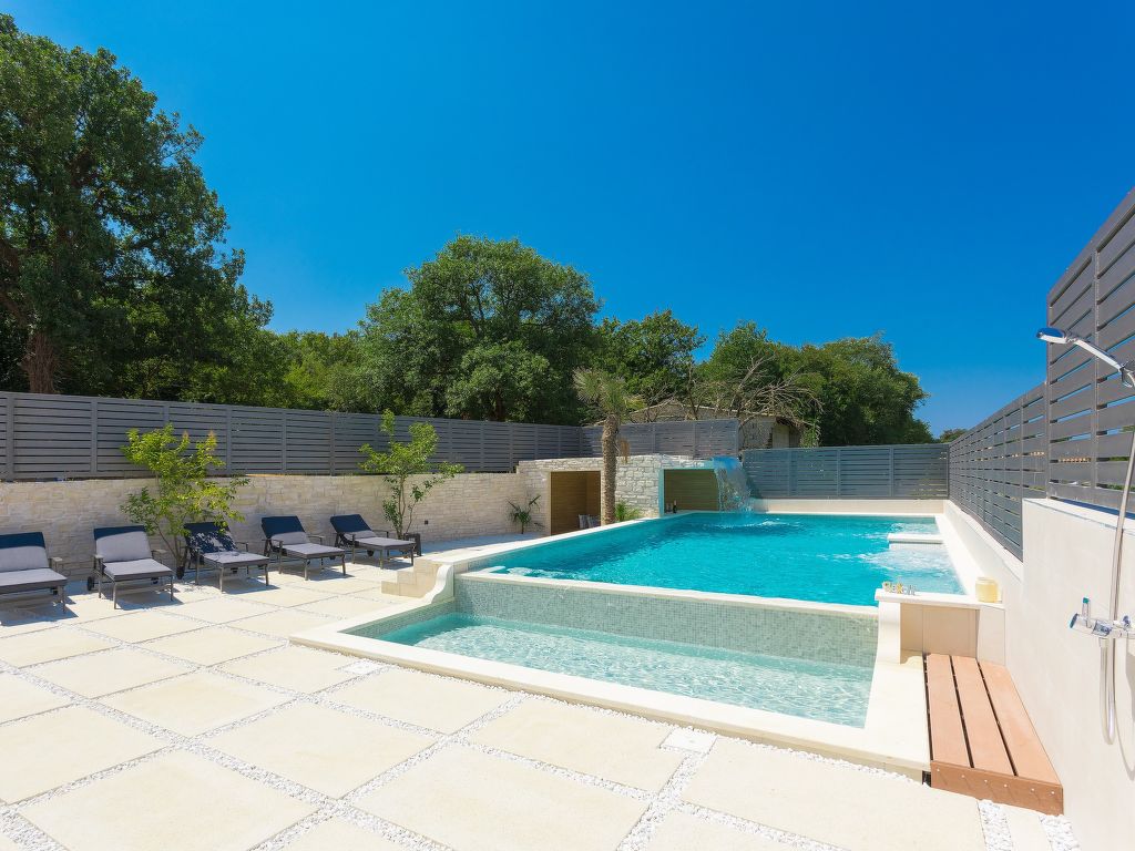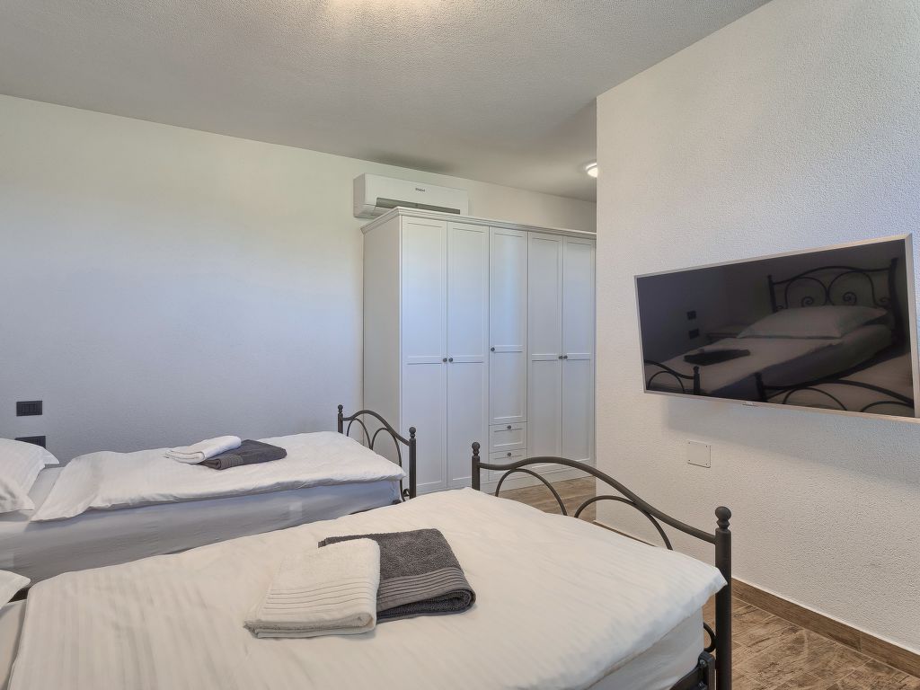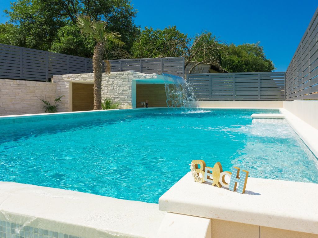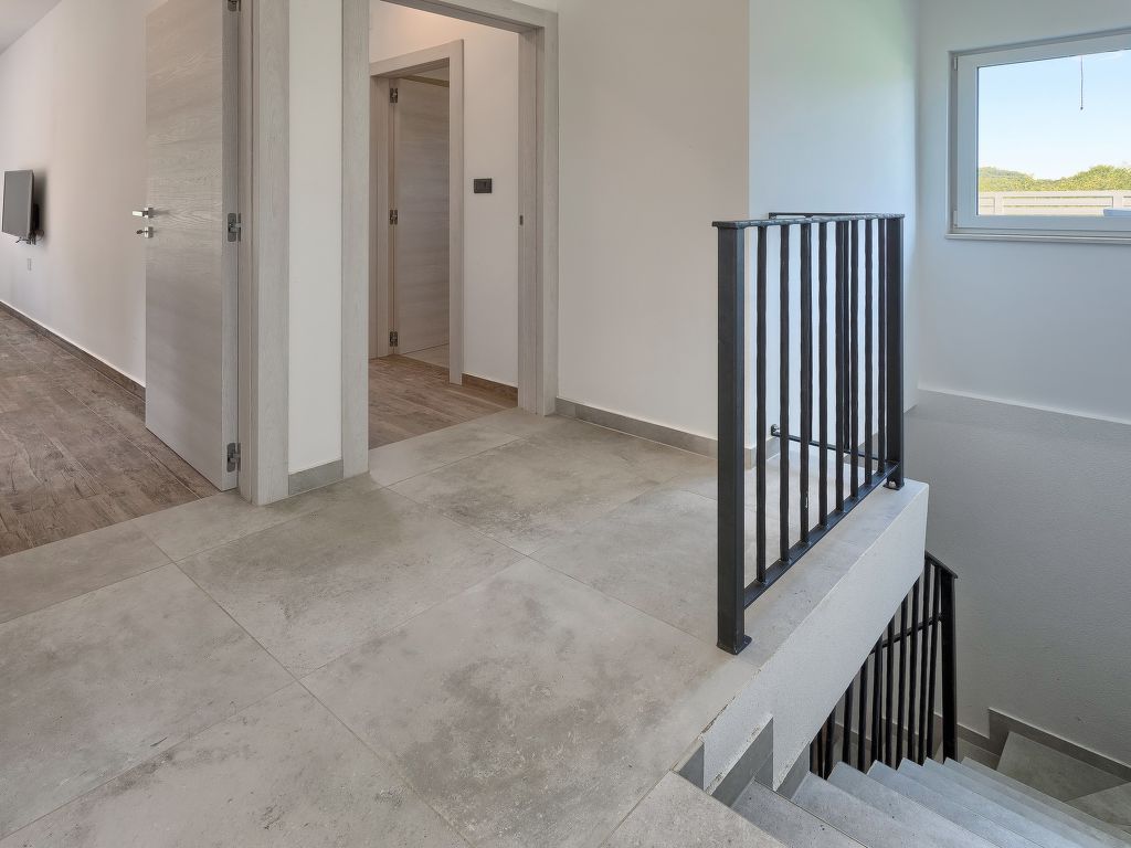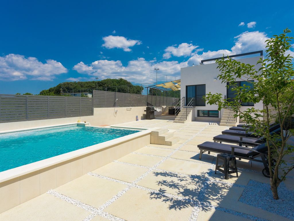 Moderne Villa "La Mer", auf 2 Stockwerken. Im Ortsteil Veli Vrh, 3 km vom Zentrum von Pula, sonnige Lage, 3 km vom Meer, in einer Sackgasse. Zur Alleinbenutzung: Grundstück 400 m2 (eingezäunt), Garten mit Pflanzen, Schwimmbad eckig, beheizt (12 x 5 m, 140 cm tief, 01.01.-31.12.) mit Innentreppe. Kinderbecken, Aussendusche, Terrasse (20 m2), Gartenmöbel. Im Hause: Internetzugang, Waschmaschine. Parkplatz beim Haus auf dem Grundstück. Einkaufsgeschäft 1 km, Supermarkt 2.5 km, Restaurant 1 km, Kieselstrand 4.5 km, Felsstrand 4.5 km. Tennis 5 km, Wanderwege ab Haus 200 m, Radweg 250 m. Nahe gelegene Sehenswürdigkeiten: Amphitheater 3 km, NP Brijuni 6 km. Schwimmbad beheizt (extra). Zur Mitbenutzung auf dem Nachbargrundstück mit dem Nachbarhaus HR2600.151, 30 m von der Villa: Hallenbad eckig, beheizt (6 x 5 m, Tiefe 140 cm, 01.01.-31.12., mit Innentreppe, mit Gegenstrom), Sprudelbad, Ruheraum, Wellnessbereich, Tischfußball, Tischtennis, Darts, Flipper, Kinderspielplatz (Rutsche), Fußballplatz (alles im Preis inbegriffen). Sauna, Massage (auf Anfrage, alles extra). Möglichkeit, 4 Fahrräder zu mieten (auf Anfrage, extra).