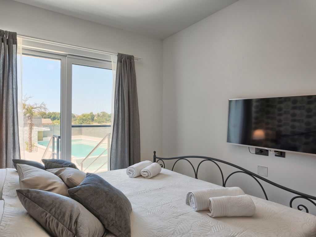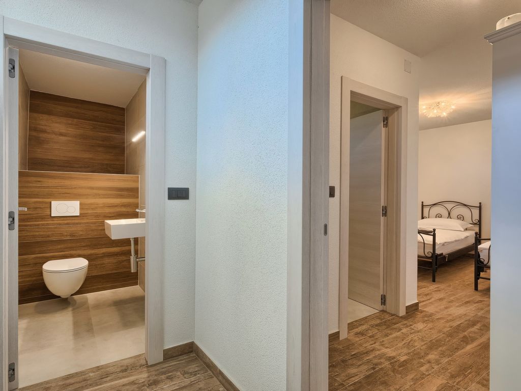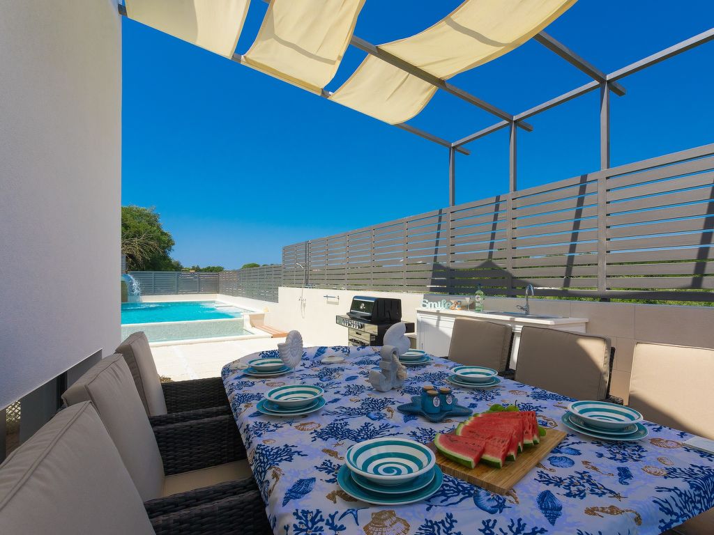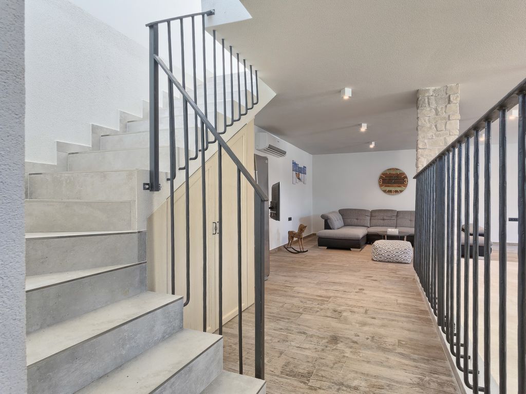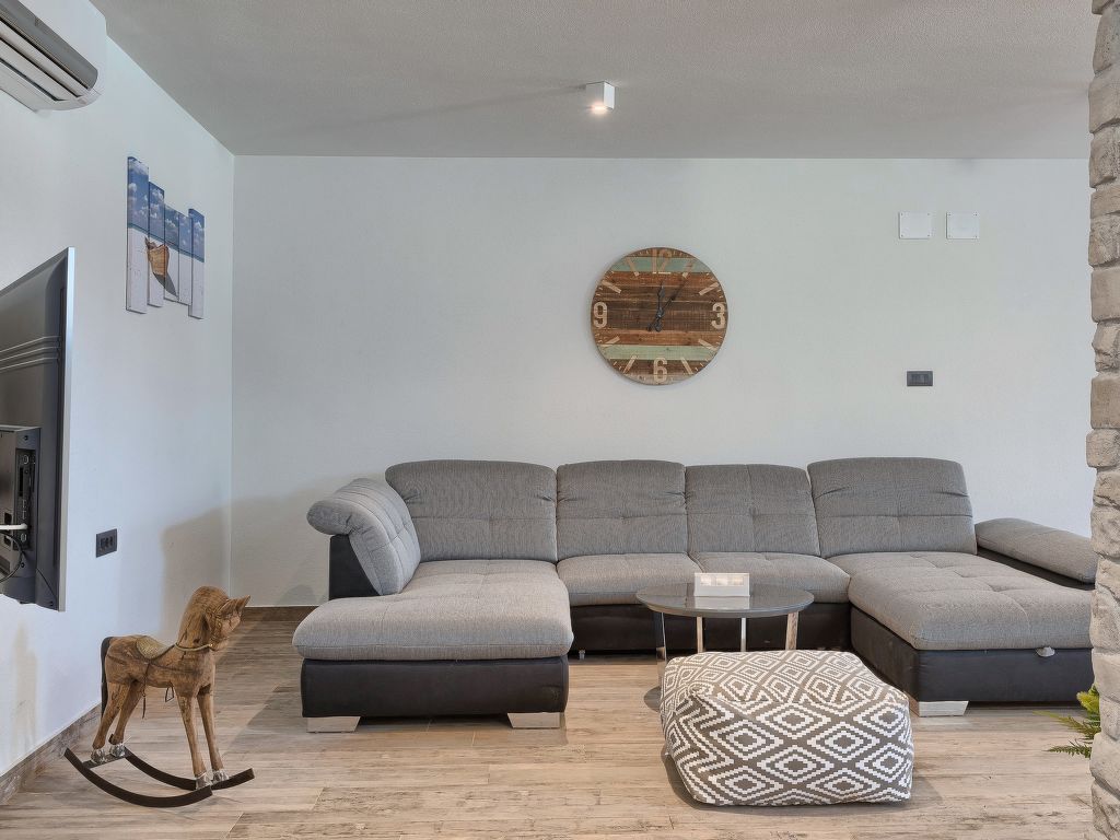 Moderne Villa "La Mer", auf 2 Stockwerken. Im Ortsteil Veli Vrh, 3 km vom Zentrum von Pula, sonnige Lage, 3 km vom Meer, in einer Sackgasse. Zur Alleinbenutzung: Grundstück 400 m2 (eingezäunt), Garten mit Pflanzen, Schwimmbad eckig, beheizt (12 x 5 m, 140 cm tief, 01.01.-31.12.) mit Innentreppe. Kinderbecken, Aussendusche, Terrasse (20 m2), Gartenmöbel. Im Hause: Internetzugang, Waschmaschine. Parkplatz beim Haus auf dem Grundstück. Einkaufsgeschäft 1 km, Supermarkt 2.5 km, Restaurant 1 km, Kieselstrand 4.5 km, Felsstrand 4.5 km. Tennis 5 km, Wanderwege ab Haus 200 m, Radweg 250 m. Nahe gelegene Sehenswürdigkeiten: Amphitheater 3 km, NP Brijuni 6 km. Schwimmbad beheizt (extra). Zur Mitbenutzung auf dem Nachbargrundstück mit dem Nachbarhaus HR2600.151, 30 m von der Villa: Hallenbad eckig, beheizt (6 x 5 m, Tiefe 140 cm, 01.01.-31.12., mit Innentreppe, mit Gegenstrom), Sprudelbad, Ruheraum, Wellnessbereich, Tischfußball, Tischtennis, Darts, Flipper, Kinderspielplatz (Rutsche), Fußballplatz (alles im Preis inbegriffen). Sauna, Massage (auf Anfrage, alles extra). Möglichkeit, 4 Fahrräder zu mieten (auf Anfrage, extra).