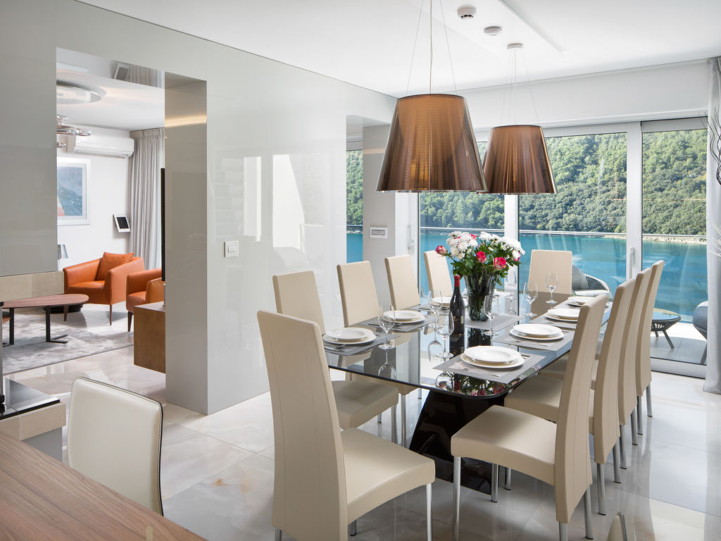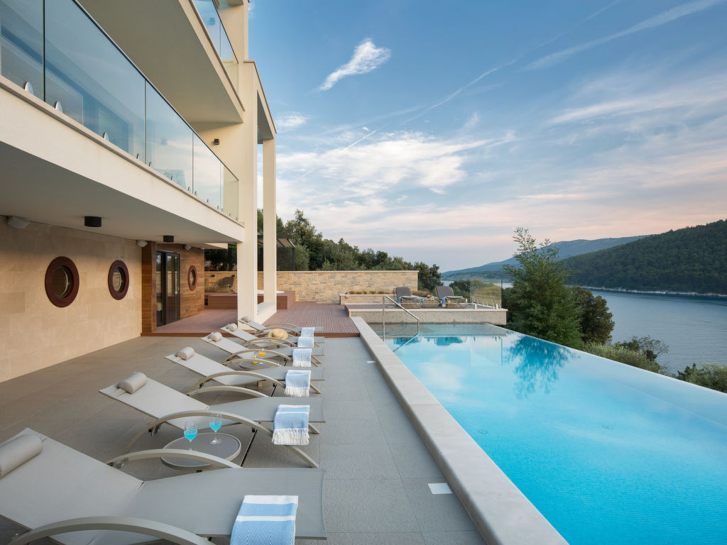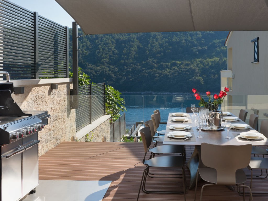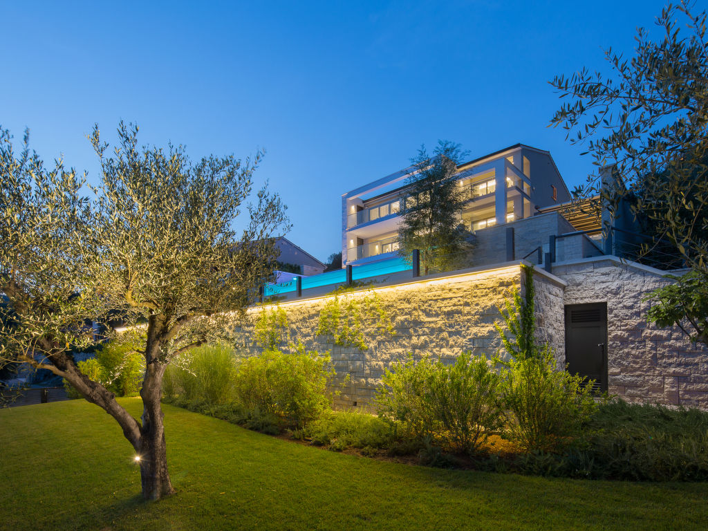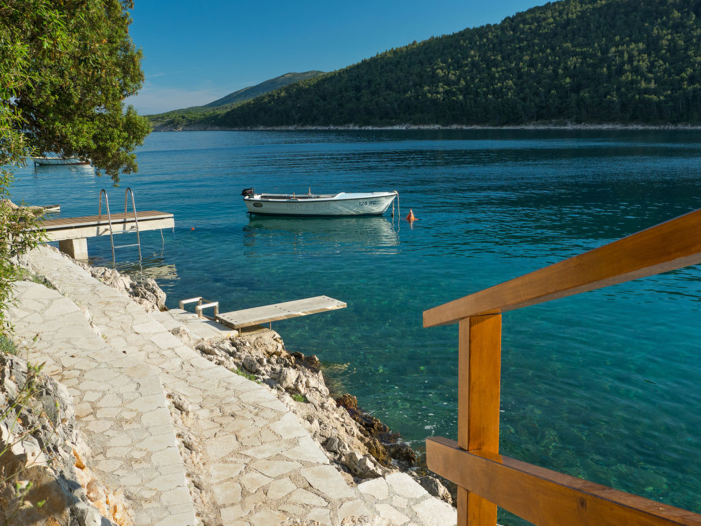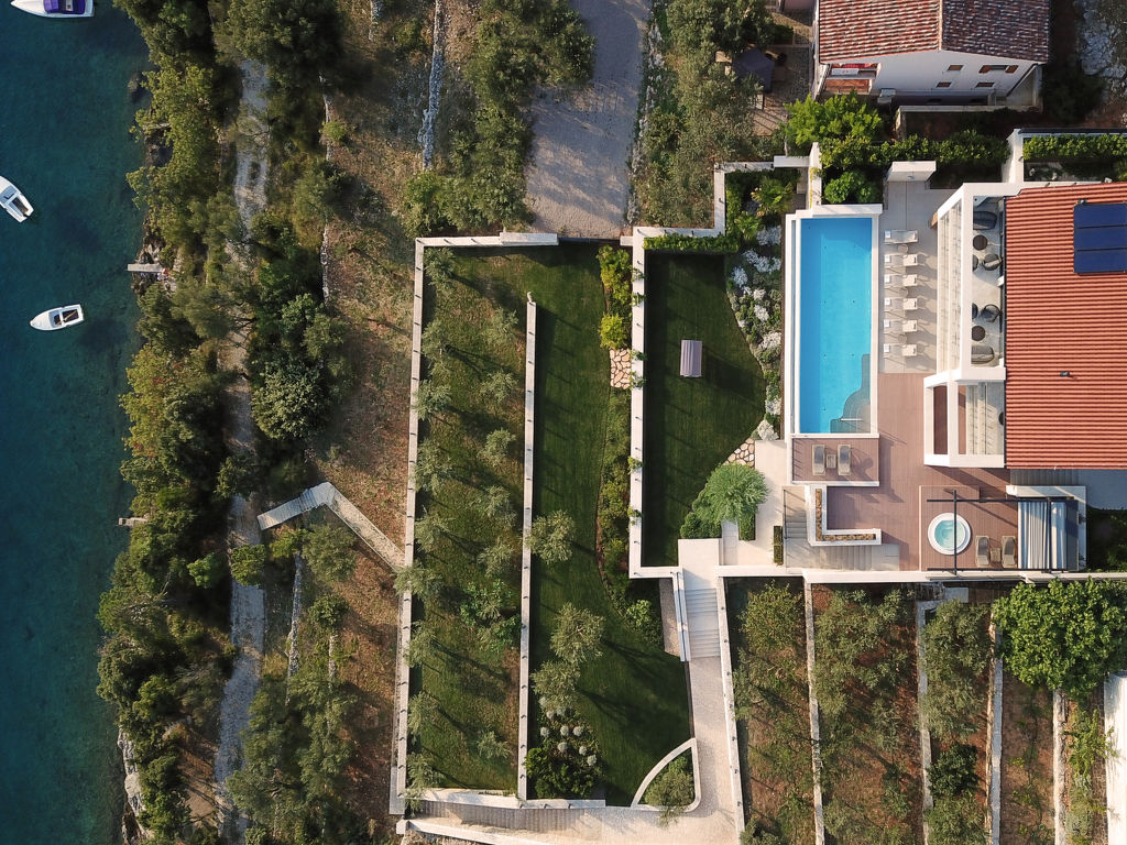 Prtlog (Duga Luka) 5 km von Labin: Moderne, luxuriöse Villa "Vlastelini II", auf 2 Stockwerken, Baujahr 2018. Ruhige, sonnige Lage, 30 m vom Meer, 30 m vom Strand, direkter Zugang zum Strand. Zur Alleinbenutzung: Grundstück 2'500 m2 (eingezäunt), schöner, gepflegter Garten Pflanzen und Bäumen, Schwimmbad eckig, beheizt (12 x 4 m, 50 m2, 140 cm tief, 21.03.-31.10.) mit Innentreppe. WC im Poolbereich, Aussendusche, Sprudelbad, Terrasse (25 m2), Gartenmöbel. Im Hause: Internetzugang, Sauna, Fitnessraum, Billard, Zentralheizung, Alarmanlage, Waschmaschine, Wäschetrockner. Koch möglich (extra). Parkplatz (für 4 Autos) beim Haus auf dem Grundstück. Supermarkt 5 km, Restaurant 5 km, Kieselstrand, Felsstrand 30 m. Wanderwege ab Haus 100 m, Radweg 150 m. Bitte beachten: Jugendgruppen nur auf Anfrage. Private Bootsanlegestelle, auf Anfrage. Schwimmbad mit Gegenstromanlage und mit Wasserfall. Es ist notwendig 7 Tage im Voraus bekannt zu geben, ob die Schwimmbadheizung eingeschaltet werden soll. Von Gruppen junger Leute wird ein doppeltes Pfand verlangt bei der Ankunft. Massage (extra) auf Anfrage.