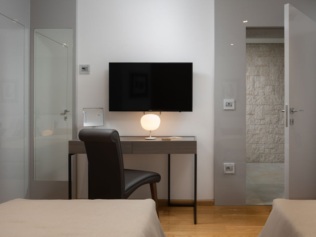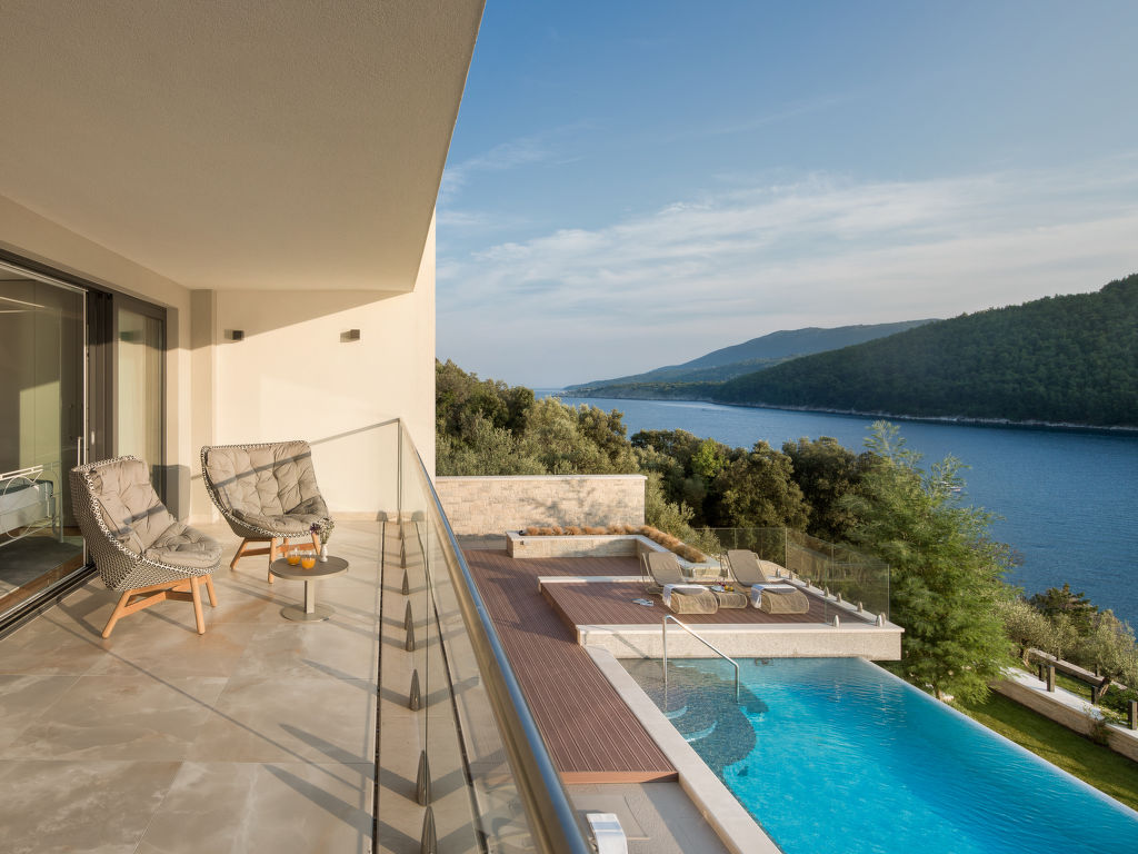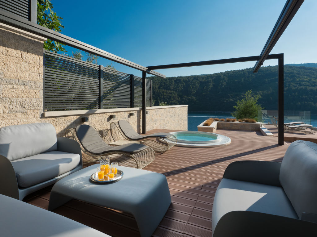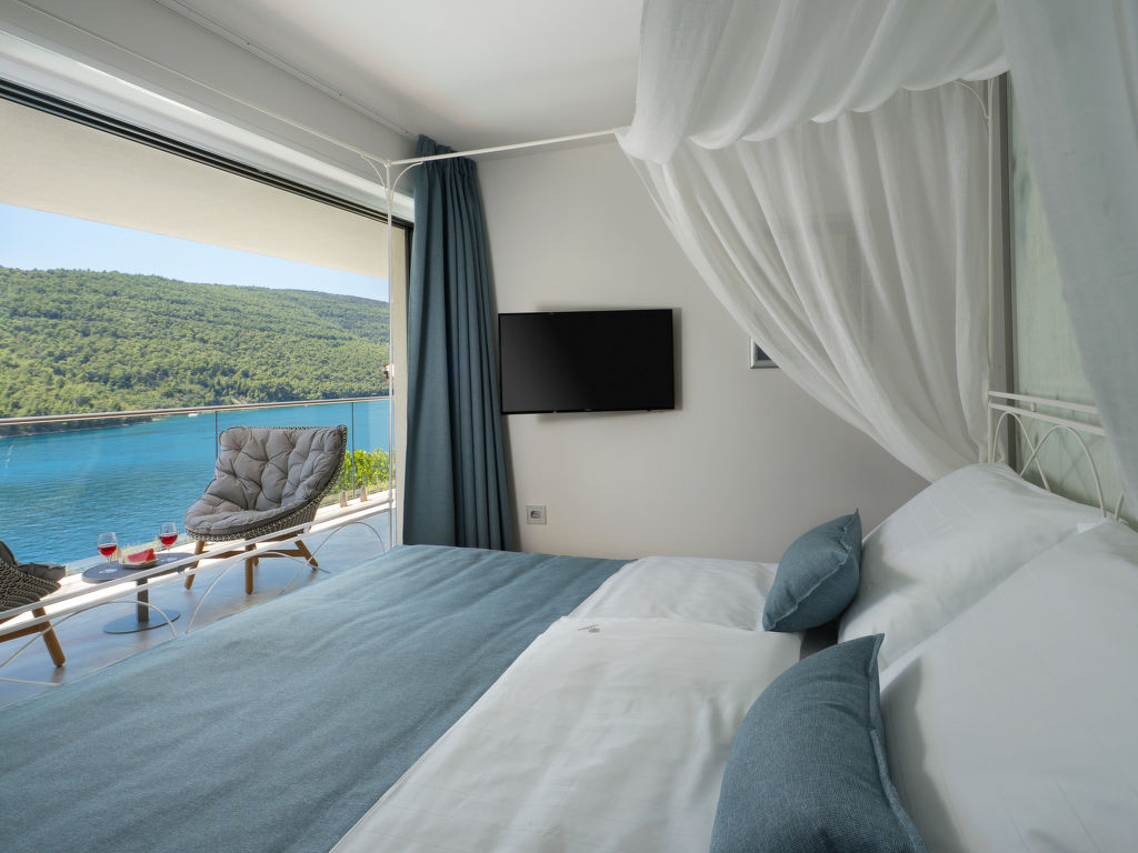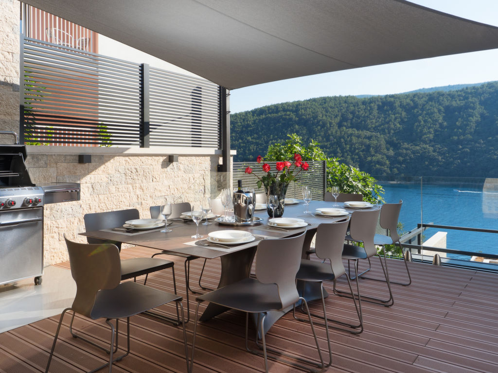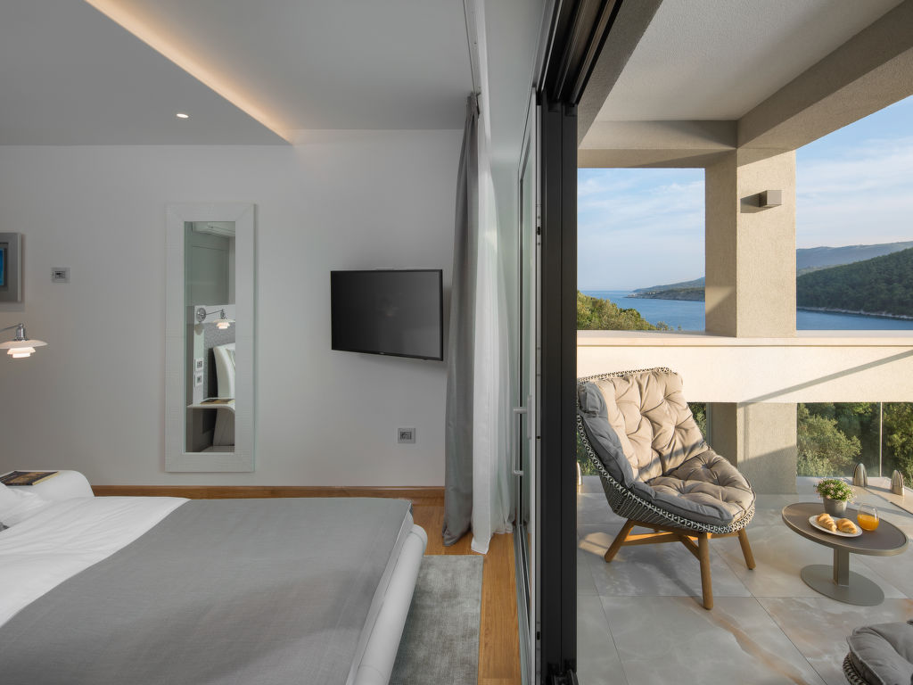 Prtlog (Duga Luka) 5 km von Labin: Moderne, luxuriöse Villa "Vlastelini II", auf 2 Stockwerken, Baujahr 2018. Ruhige, sonnige Lage, 30 m vom Meer, 30 m vom Strand, direkter Zugang zum Strand. Zur Alleinbenutzung: Grundstück 2'500 m2 (eingezäunt), schöner, gepflegter Garten Pflanzen und Bäumen, Schwimmbad eckig, beheizt (12 x 4 m, 50 m2, 140 cm tief, 21.03.-31.10.) mit Innentreppe. WC im Poolbereich, Aussendusche, Sprudelbad, Terrasse (25 m2), Gartenmöbel. Im Hause: Internetzugang, Sauna, Fitnessraum, Billard, Zentralheizung, Alarmanlage, Waschmaschine, Wäschetrockner. Koch möglich (extra). Parkplatz (für 4 Autos) beim Haus auf dem Grundstück. Supermarkt 5 km, Restaurant 5 km, Kieselstrand, Felsstrand 30 m. Wanderwege ab Haus 100 m, Radweg 150 m. Bitte beachten: Jugendgruppen nur auf Anfrage. Private Bootsanlegestelle, auf Anfrage. Schwimmbad mit Gegenstromanlage und mit Wasserfall. Es ist notwendig 7 Tage im Voraus bekannt zu geben, ob die Schwimmbadheizung eingeschaltet werden soll. Von Gruppen junger Leute wird ein doppeltes Pfand verlangt bei der Ankunft. Massage (extra) auf Anfrage.