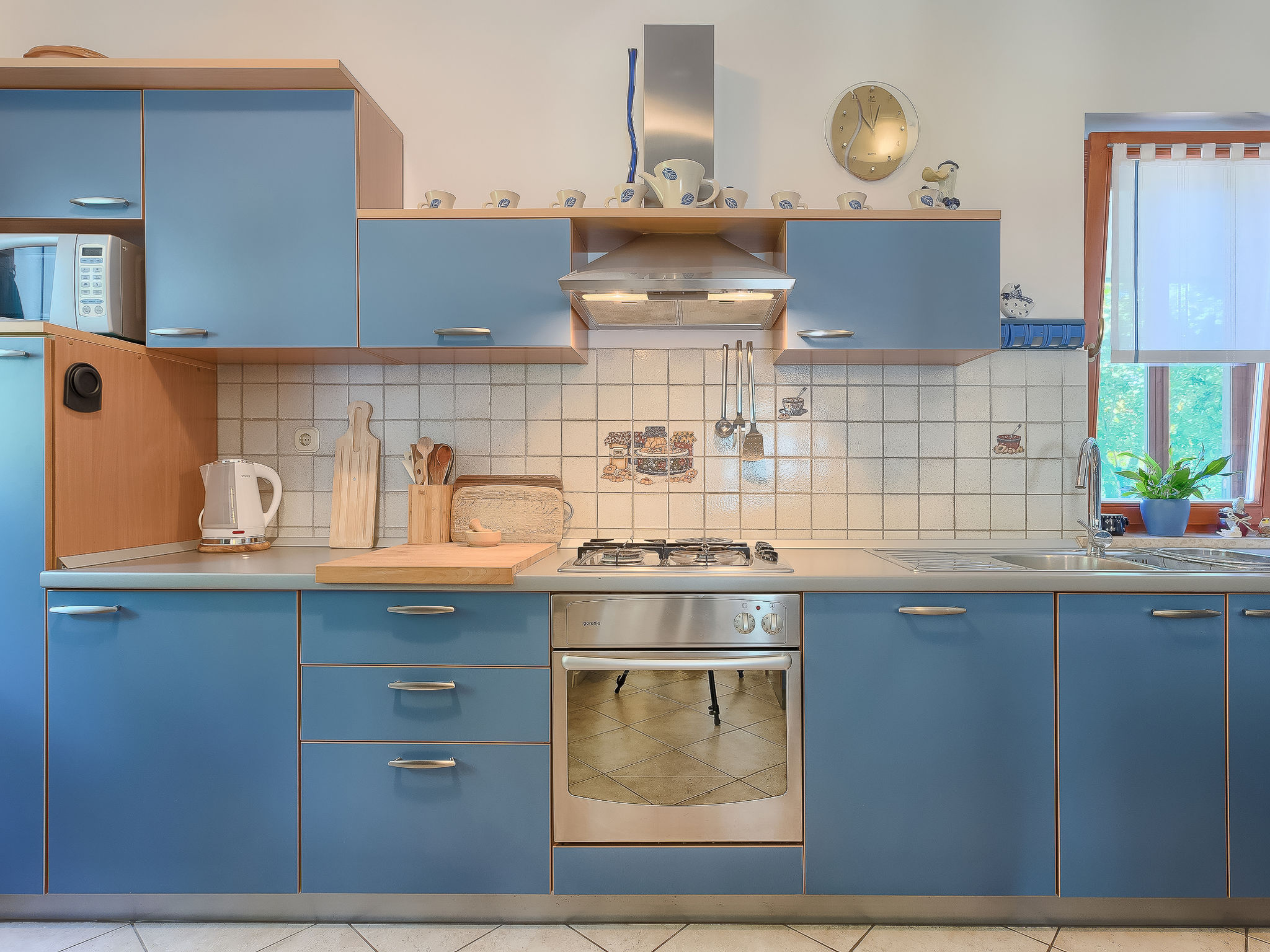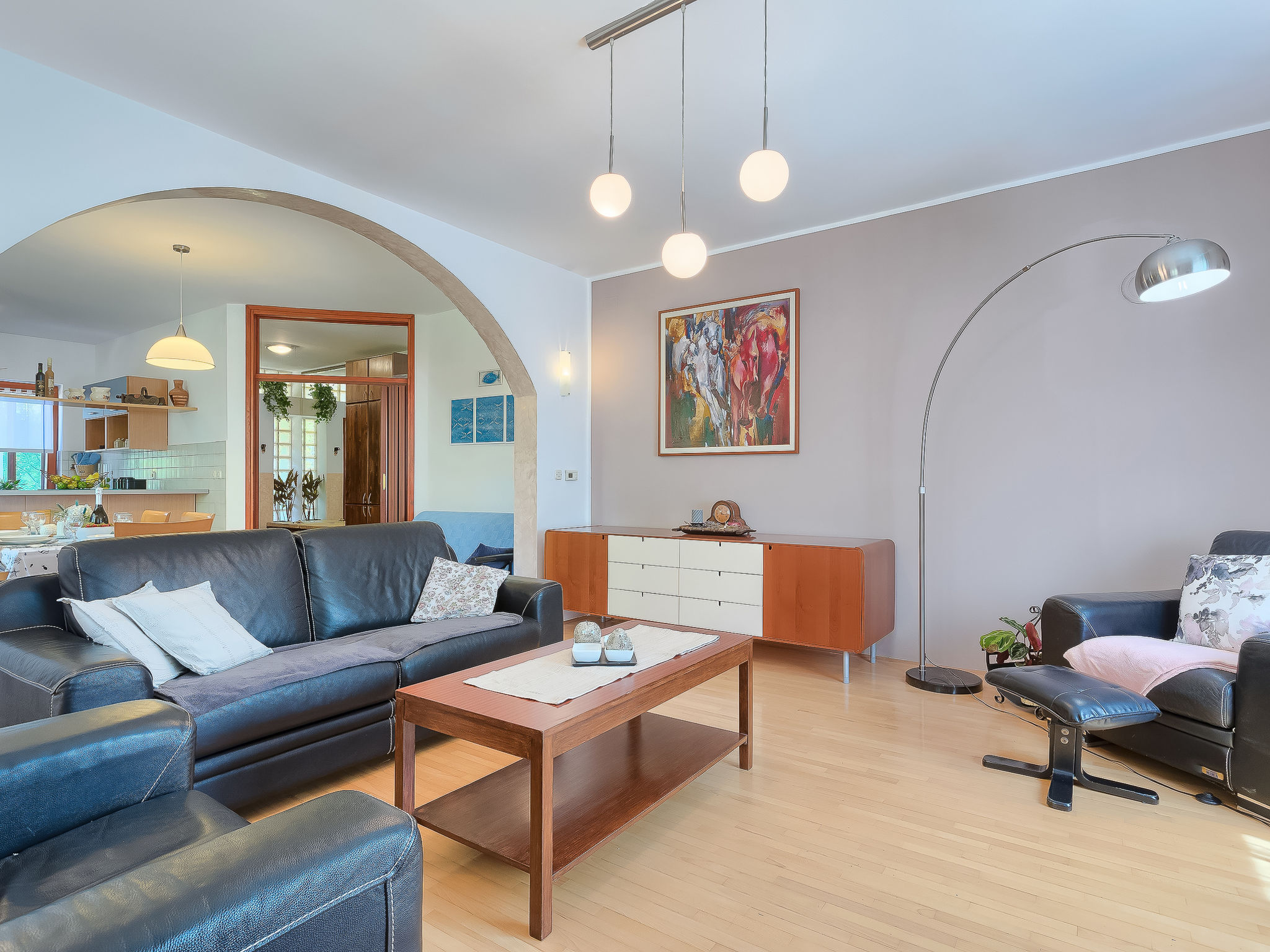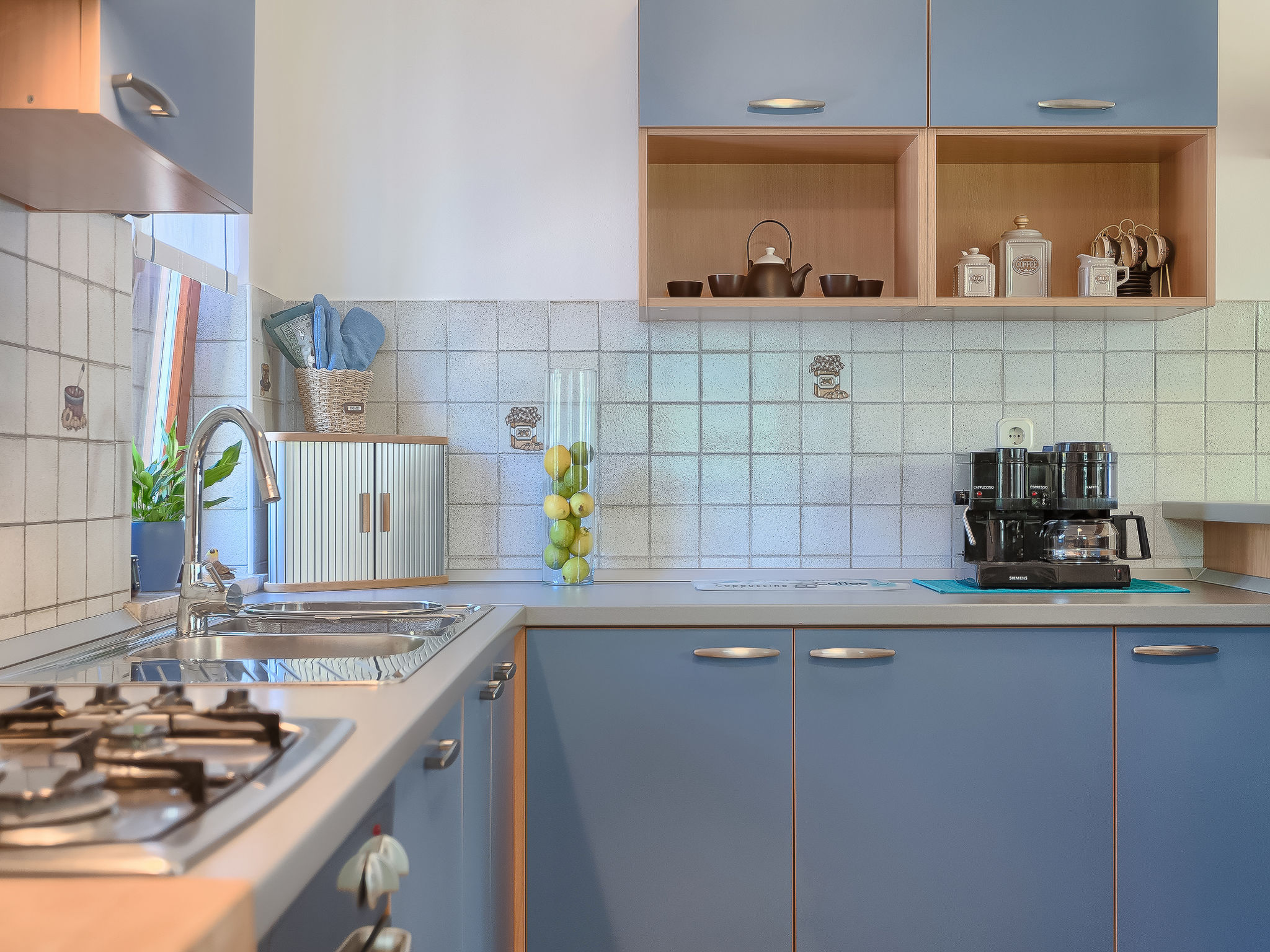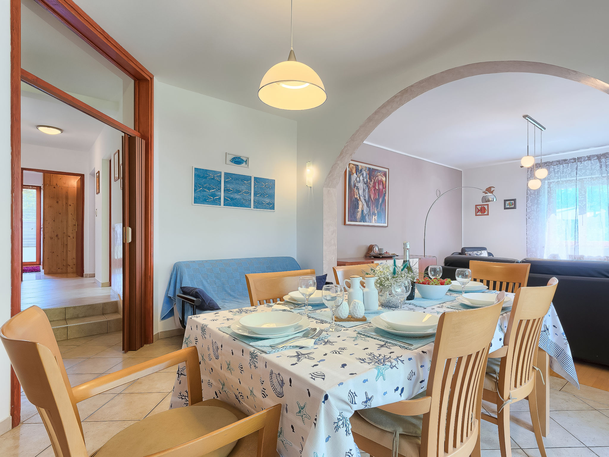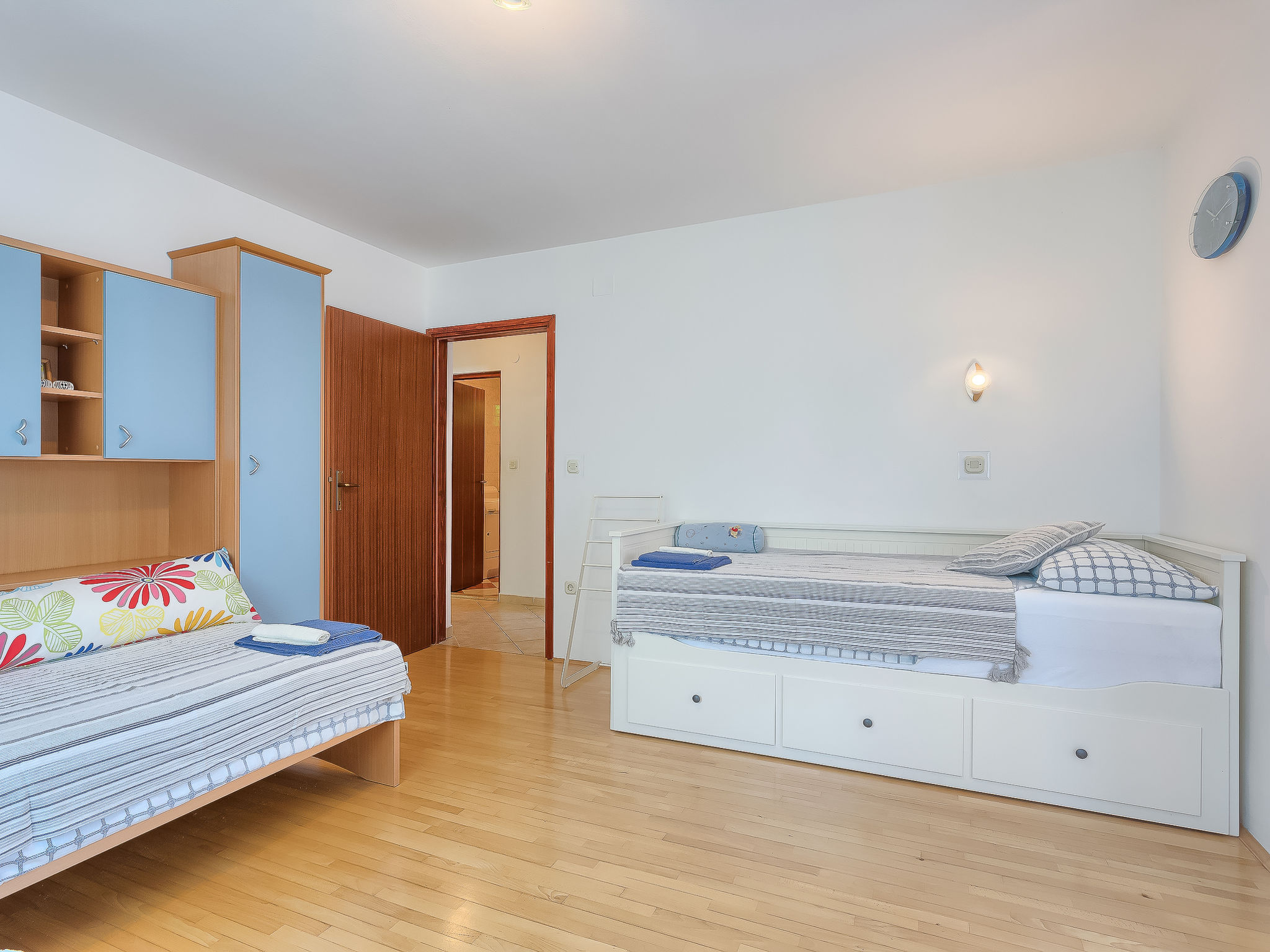 4-Zimmer-Doppelhaushälfte 100 m2. Wohn-/Esszimmer mit Sat-TV (Flachbildschirm), Klimaanlage. Ausgang zur Terrasse. 1 Zimmer mit 1 franz. Bett (160 cm, Länge 200 cm), Bad/WC. Ausgang zur Terrasse. 1 Zimmer mit 2 Betten (90 cm, Länge 200 cm). Ausgang zur Terrasse. 1 Zimmer mit 1 Bett (90 cm, Länge 200 cm), 1 Ausziehbett (Länge 200 cm). Offene Küche (4 Kochplatten, Backofen, Geschirrspüler, Mikrowelle, Tiefkühler, elektrische Kaffeemaschine). Dusche/WC. Terrasse 25 m2, überdacht, Terrasse 15 m2. Terrassenmöbel, Liegestühle. Sicht auf den Garten. Zur Verfügung: Babybett, Haartrockner. Internet (Wireless LAN, gratis).