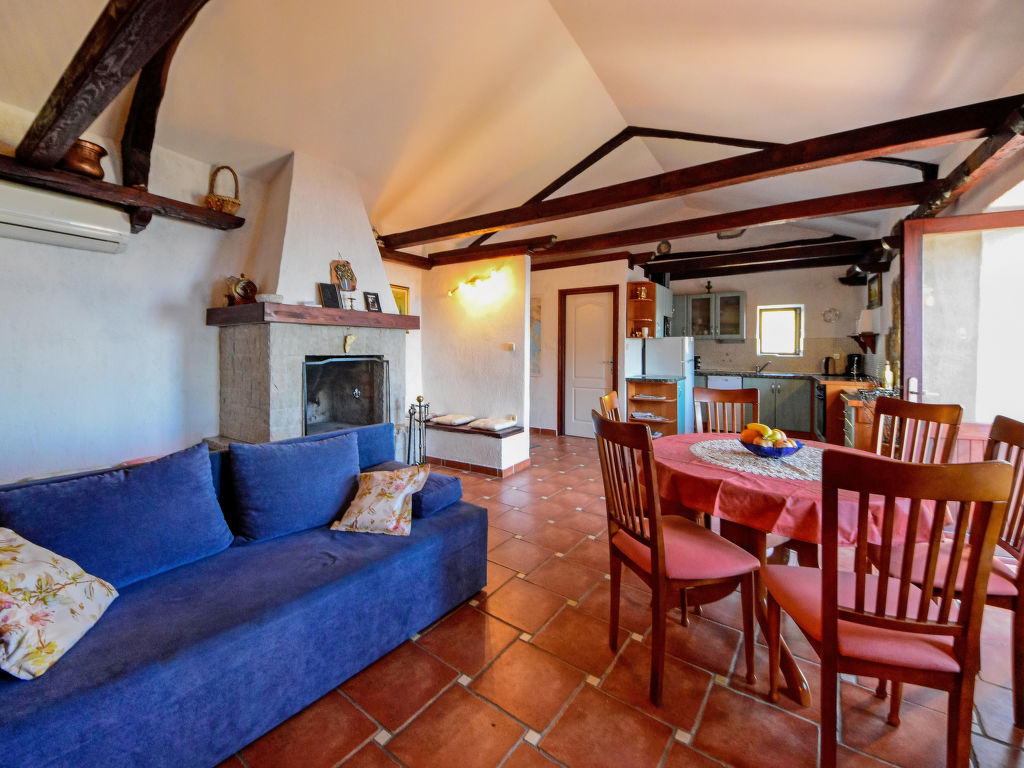 3-Zimmer-Doppelhaushälfte 90 m2 im 1. Stock, Südlage. Wohn-/Esszimmer 60 m2 mit 1 Diwanbett (120 cm, Länge 190 cm), offenem Kamin und Sat-TV (Flachbildschirm), Klimaanlage. Ausgang zur Terrasse. Abgeschrägte, offene Galerie, Deckenhöhe 53 - 173 cm mit 1 Bett (110 cm, Länge 190 cm). 1 Zimmer, Deckenhöhe 194 cm mit 1 franz. Bett (140 cm, Länge 200 cm). 1 Zimmer mit 2 Betten (90 cm, Länge 190 cm). Offene Küche (4 Kochplatten, Backofen, Geschirrspüler, Mikrowelle, Tiefkühler, elektrische Kaffeemaschine). Dusche/WC. Terrasse 13 m2. Terrassenmöbel, Liegestühle. Herrliche Sicht auf das Meer und die Landschaft. Zur Verfügung: Safe. Internet (Wireless LAN, gratis).