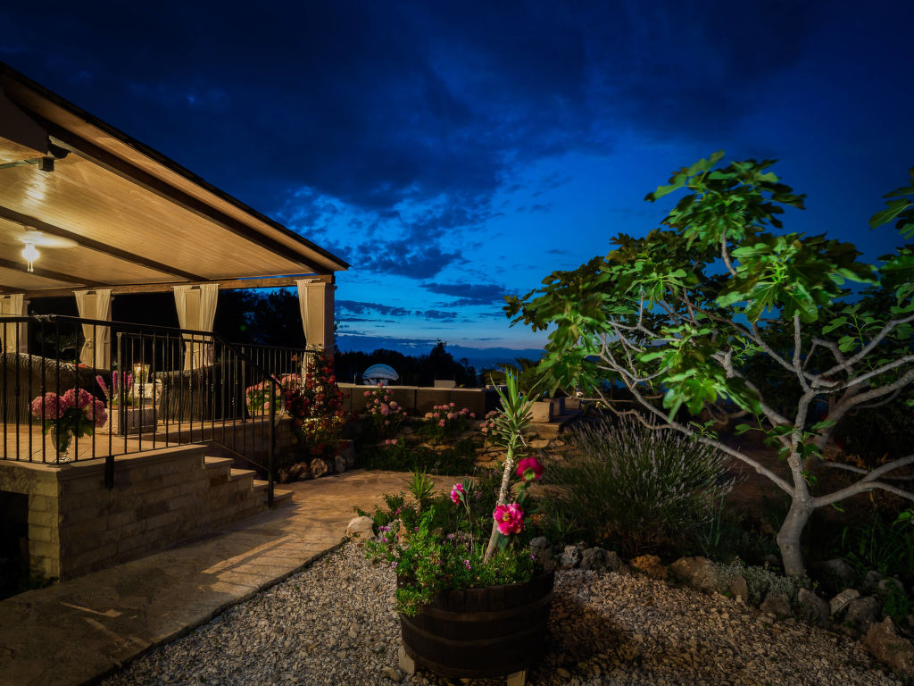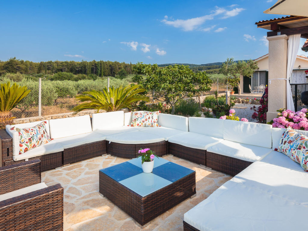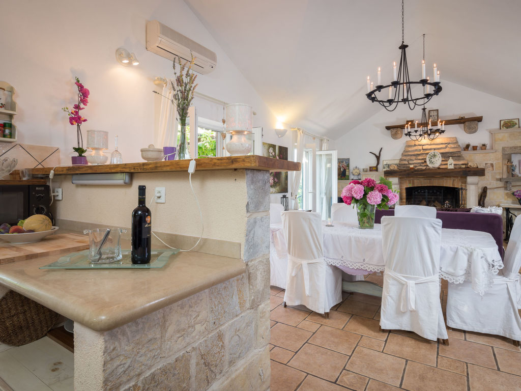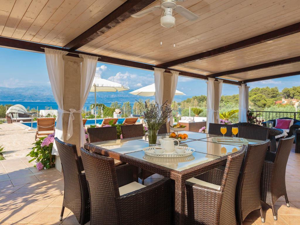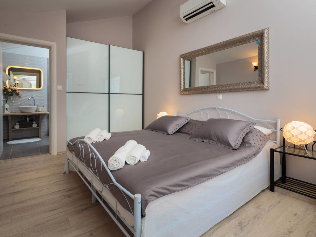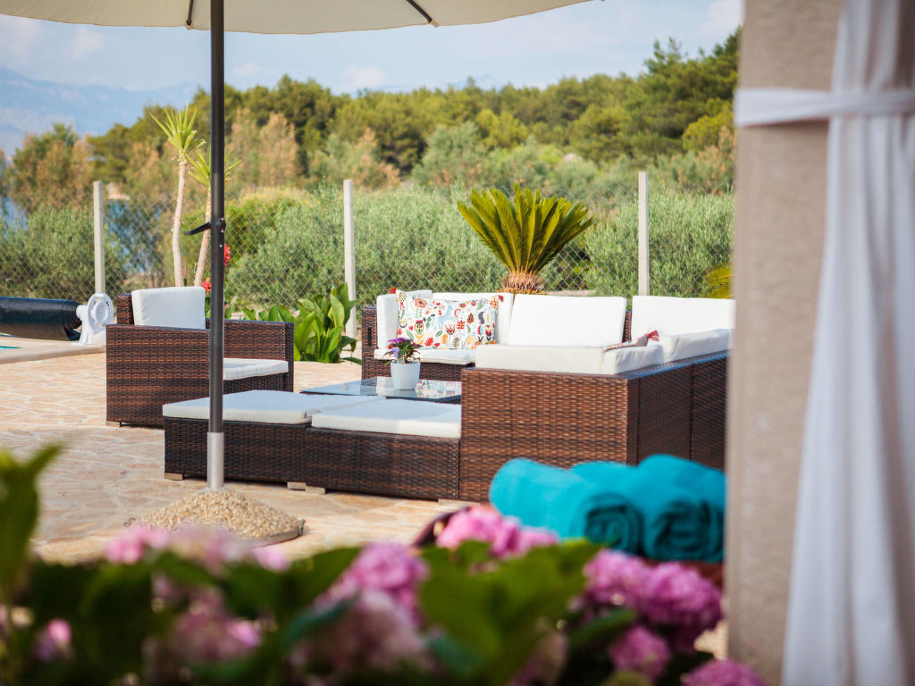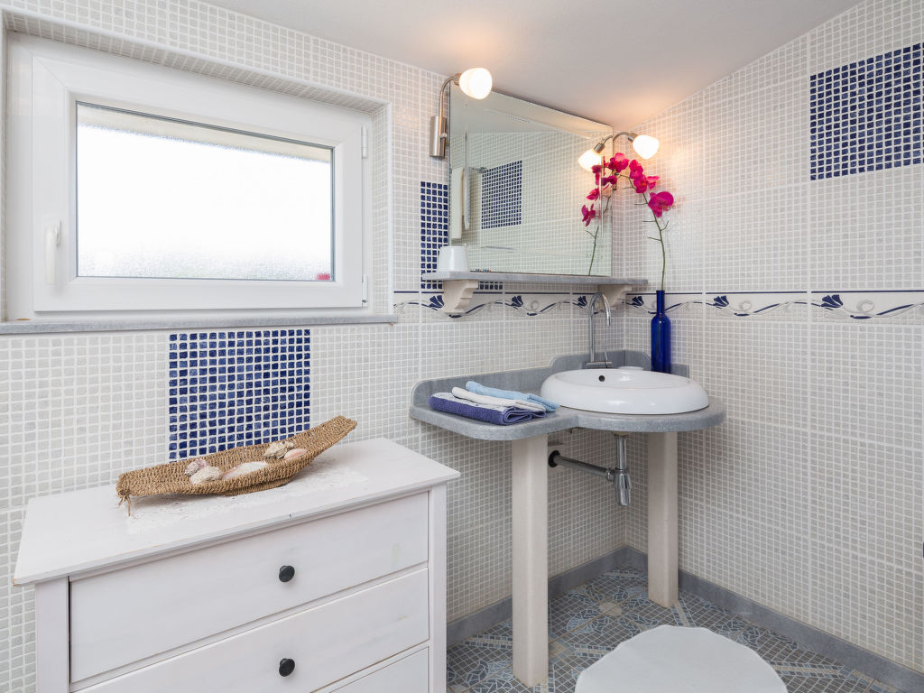 5-Zimmer-Haus 170 m2. 2 Zimmer, jedes Zimmer mit 1 Diwanbett (90 cm, Länge 190 cm), 1 franz. Bett (160 cm, Länge 200 cm), Küchenblock, Dusche/WC und Sat-TV (Flachbildschirm), Klimaanlage. Wohn-/Esszimmer mit 1 Diwanbett (100 cm, Länge 190 cm), Sat-TV (Flachbildschirm), Klimaanlage. Ausgang zur Terrasse. 1 Zimmer mit 1 franz. Bett (160 cm, Länge 200 cm), Dusche/WC. 1 Zimmer mit 2 Betten (90 cm, Länge 200 cm). Offene Küche (Backofen, Geschirrspüler, 4 Glaskeramikherd Platten, Mikrowelle, Tiefkühler, elektrische Kaffeemaschine). Dusche/WC. Terrasse 50 m2, überdacht. Terrassenmöbel, Liegestühle. Herrliche Sicht auf das Meer. Zur Verfügung: Safe, Babybett, Haartrockner. Internet (Wireless LAN, gratis). Parkplatz (überdacht, 2 Autos). Maximal 1 kleines Haustier/Hund erlaubt. Kleines, separates Haus mit 2 Schlafzimmern, jedes Schlafzimmer mit einem externen separaten Eingang. Haupthaus mit Wohn-/Essbereich, offener Küche und 2 Schlafzimmern.