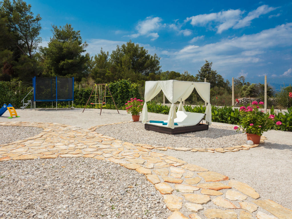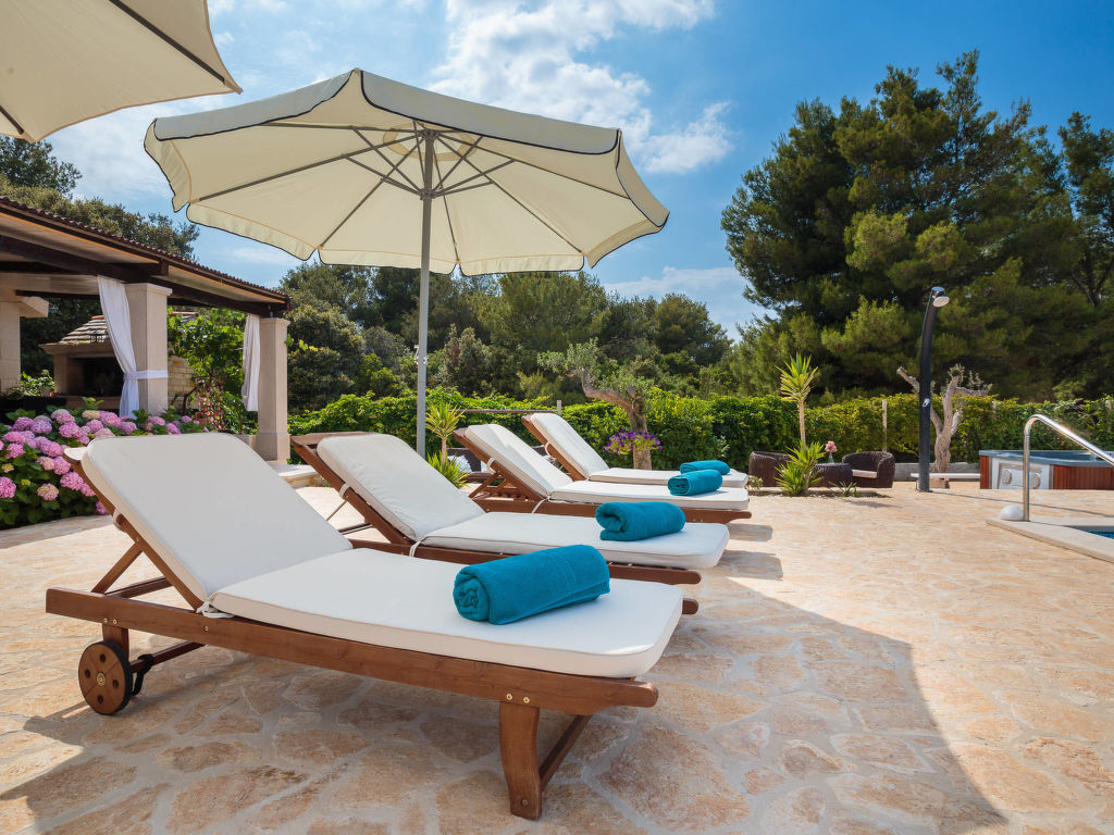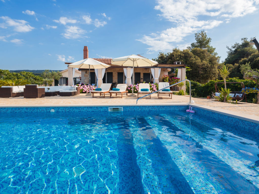 Mirca: Einfamilienhaus "Villa Mutnik". 2.4 km vom Zentrum von Supetar, alleinstehende, ruhige, sonnige Lage, direkt am Meer, direkt am Strand. Zur Alleinbenutzung: Grundstück 1'500 m2 (eingezäunt), Garten mit Pflanzen, Schwimmbad eckig, beheizt (10 x 4 m, 150 cm tief, 01.04.-15.11.) mit Innentreppe. Aussendusche, Sprudelbad, Terrasse (100 m2), Grill (Schaukel, Sandkasten). Im Hause: Internetzugang, Trampolin, Waschmaschine. Zur Verfügung: Fahrräder (7). Zufahrt bis zum Haus (500 m Naturweg). Parkplatz beim Haus auf dem Grundstück. Einkaufsgeschäft 1.2 km, Restaurant 1.6 km, Kieselstrand 20 m. Diese Einheit besteht aus dem kleinen separaten Haus und dem Haupthaus, die beide als eine Einheit vermietet werden.