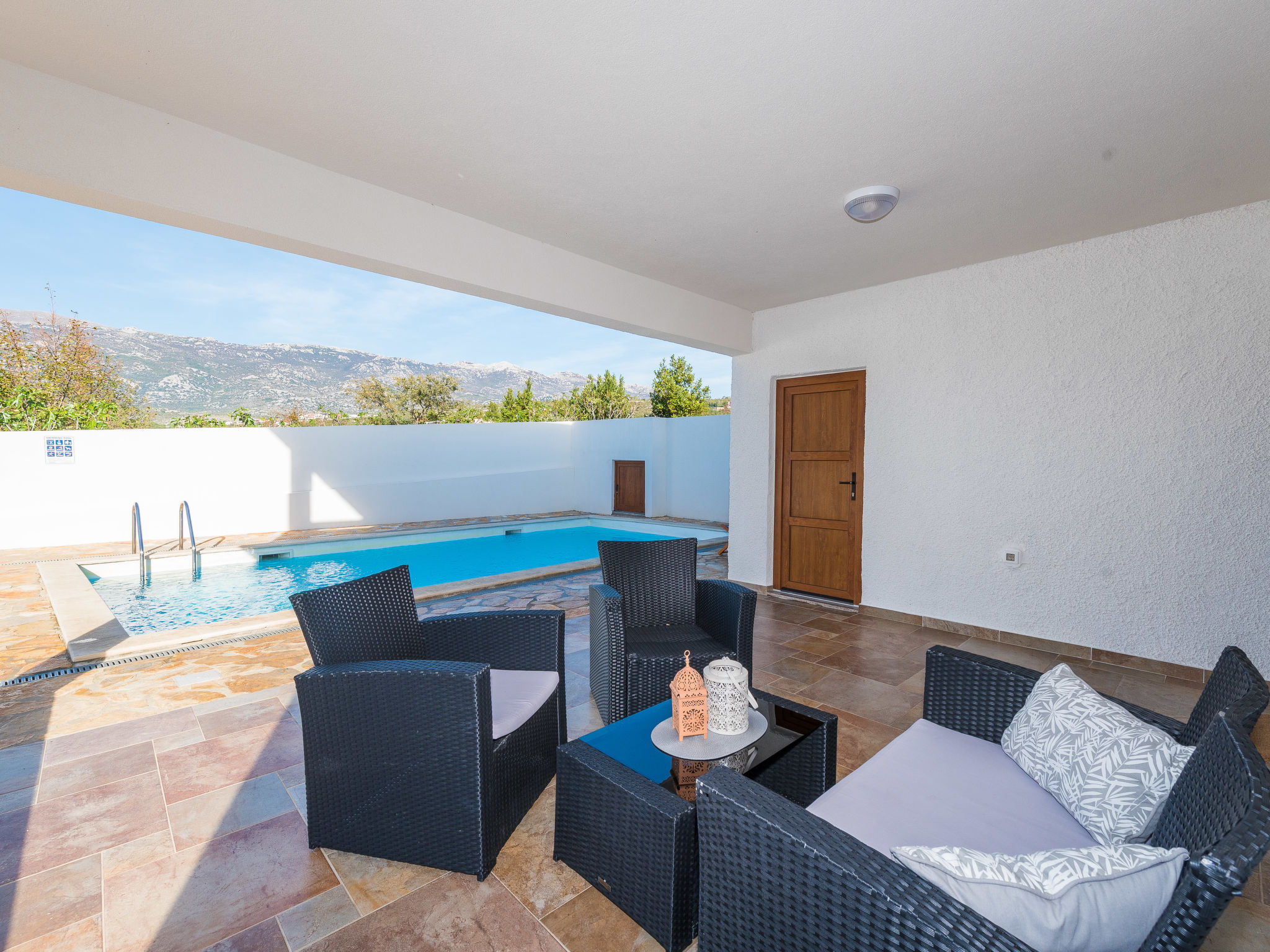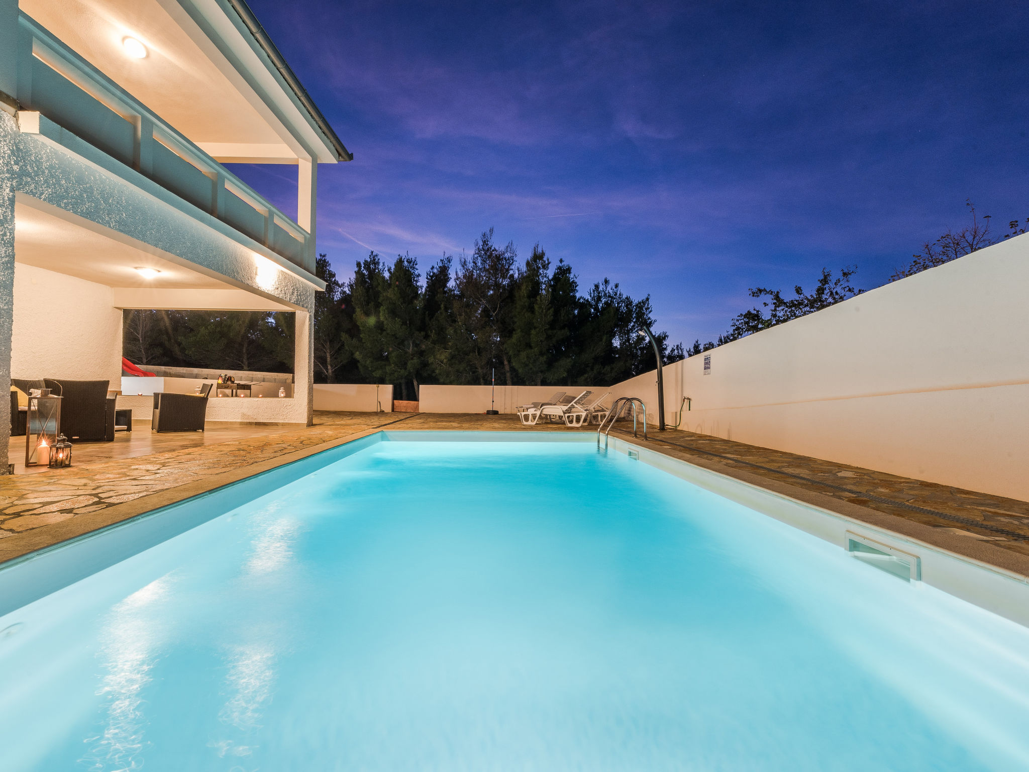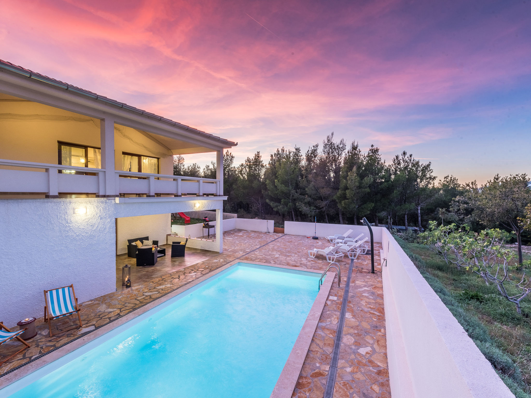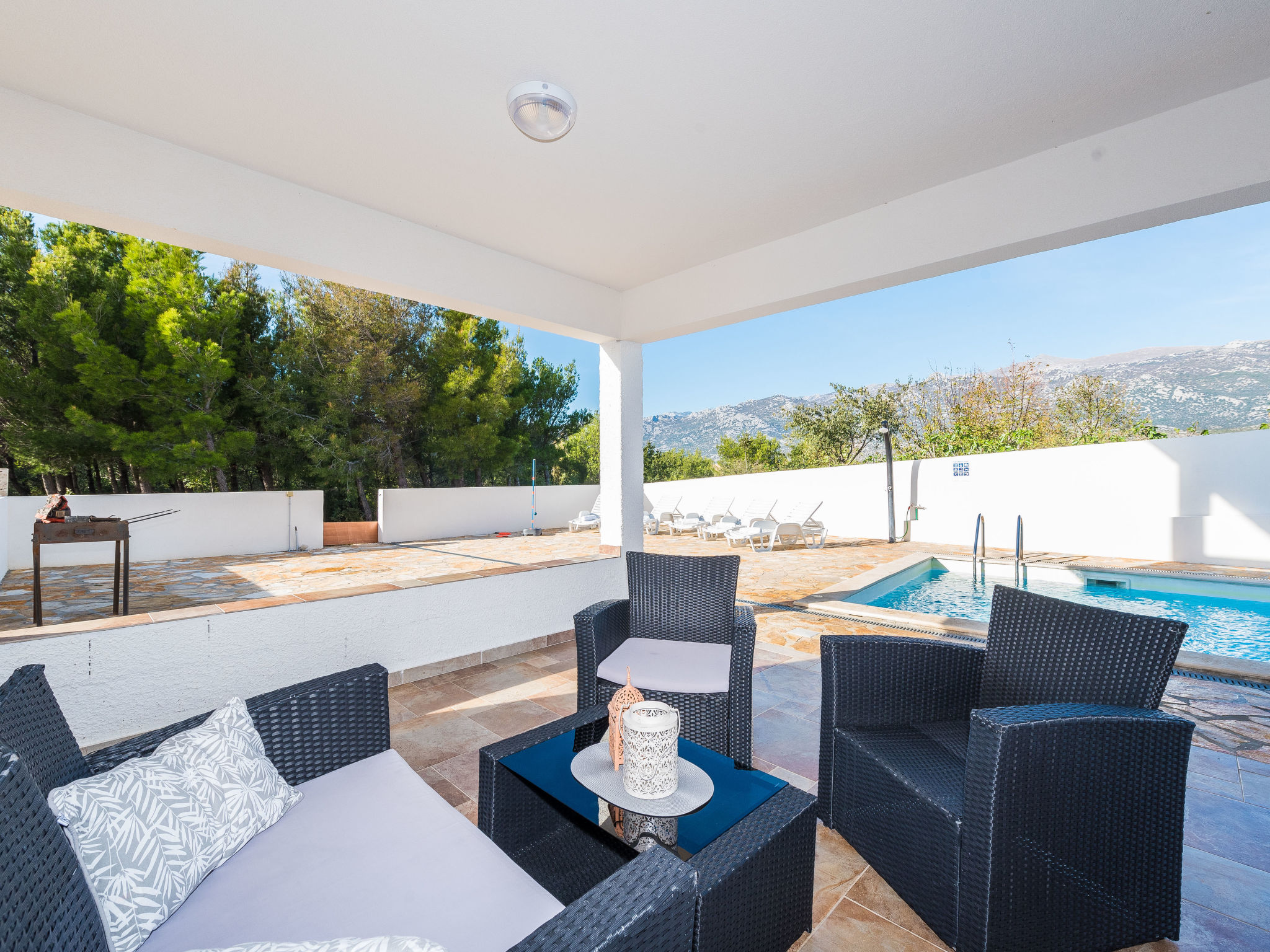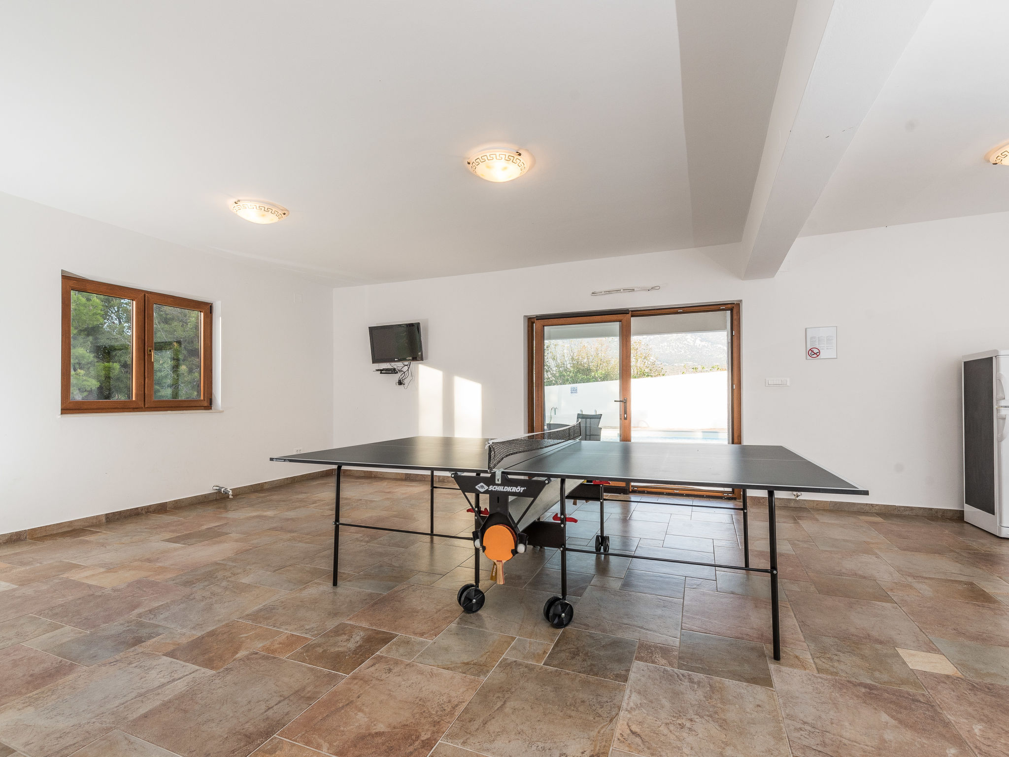 5-Zimmer-Haus 150 m2 auf 2 Stockwerken, Nordwestlage. Wohn-/Esszimmer 42 m2 mit 1 Doppeldiwanbett (140 cm, Länge 200 cm), Sat-TV (Flachbildschirm), Klimaanlage. Ausgang zur Terrasse. 1 Zimmer mit 2 Betten (90 cm, Länge 200 cm). 1 Zimmer mit 1 franz. Bett (160 cm, Länge 200 cm), Bad/WC und Doppelwaschbecken. 1 Zimmer mit 1 franz. Bett (160 cm, Länge 200 cm), Sat-TV (Flachbildschirm). Offene Küche (Backofen, Geschirrspüler, 4 Glaskeramikherd Platten, Mikrowelle, Tiefkühler, elektrische Kaffeemaschine). Dusche/WC. Unteres Geschoss: 1 Zimmer mit 1 franz. Bett (160 cm, Länge 200 cm). Dusche/WC, Doppelwaschbecken. Terrasse 36 m2, überdacht, Terrasse 20 m2, überdacht. Terrassenmöbel, Liegestühle. Sicht auf das Schwimmbad. Zur Verfügung: Haartrockner. Internet (Wireless LAN, gratis). Bitte beachten: Nichtraucher-Haus. Im Untergeschoss: Zimmer mit Tischtennis, Darts, Sat-TV (Flachbildschirm), Klimaanlage, Ausgang zur Terrasse.