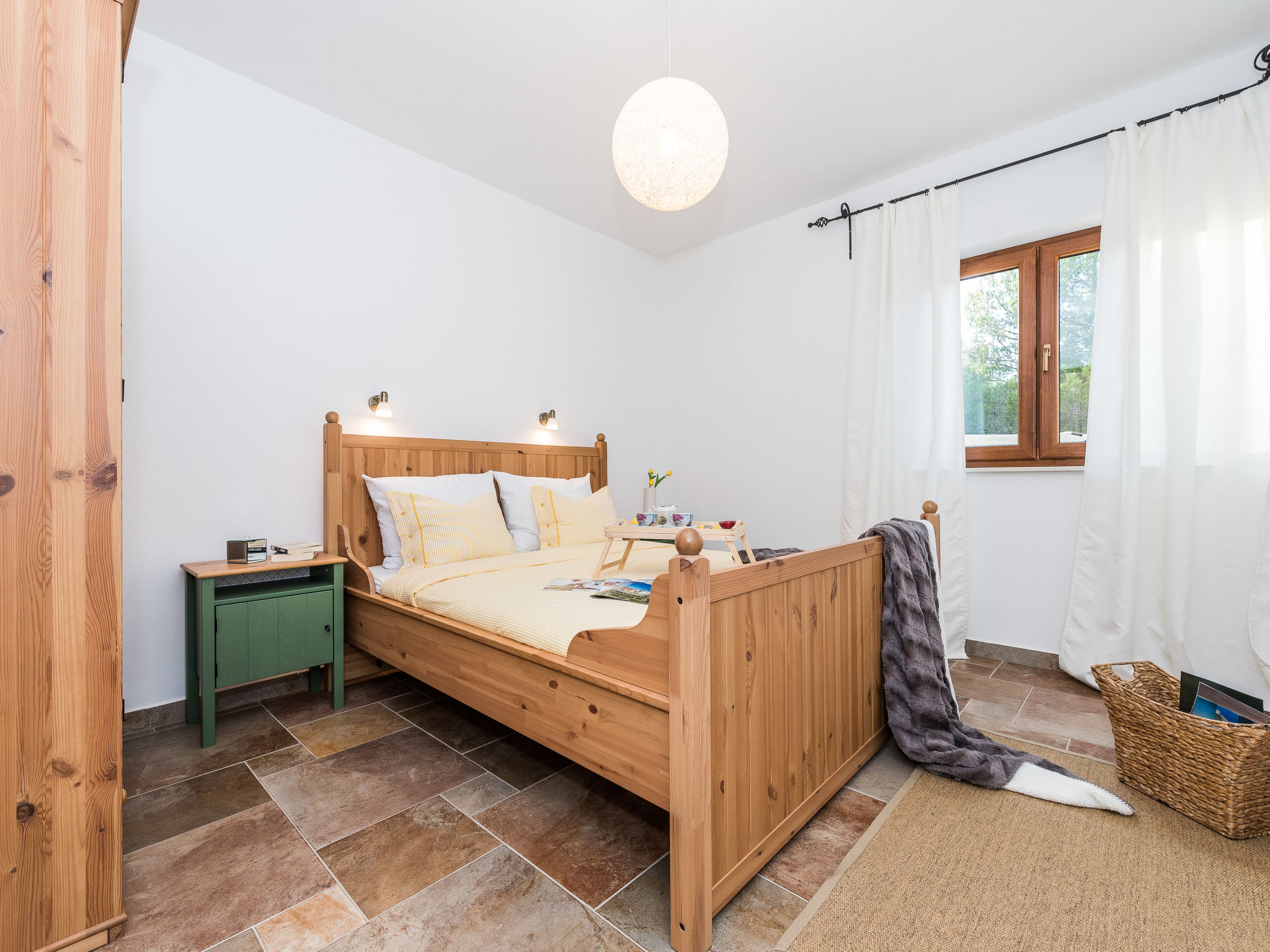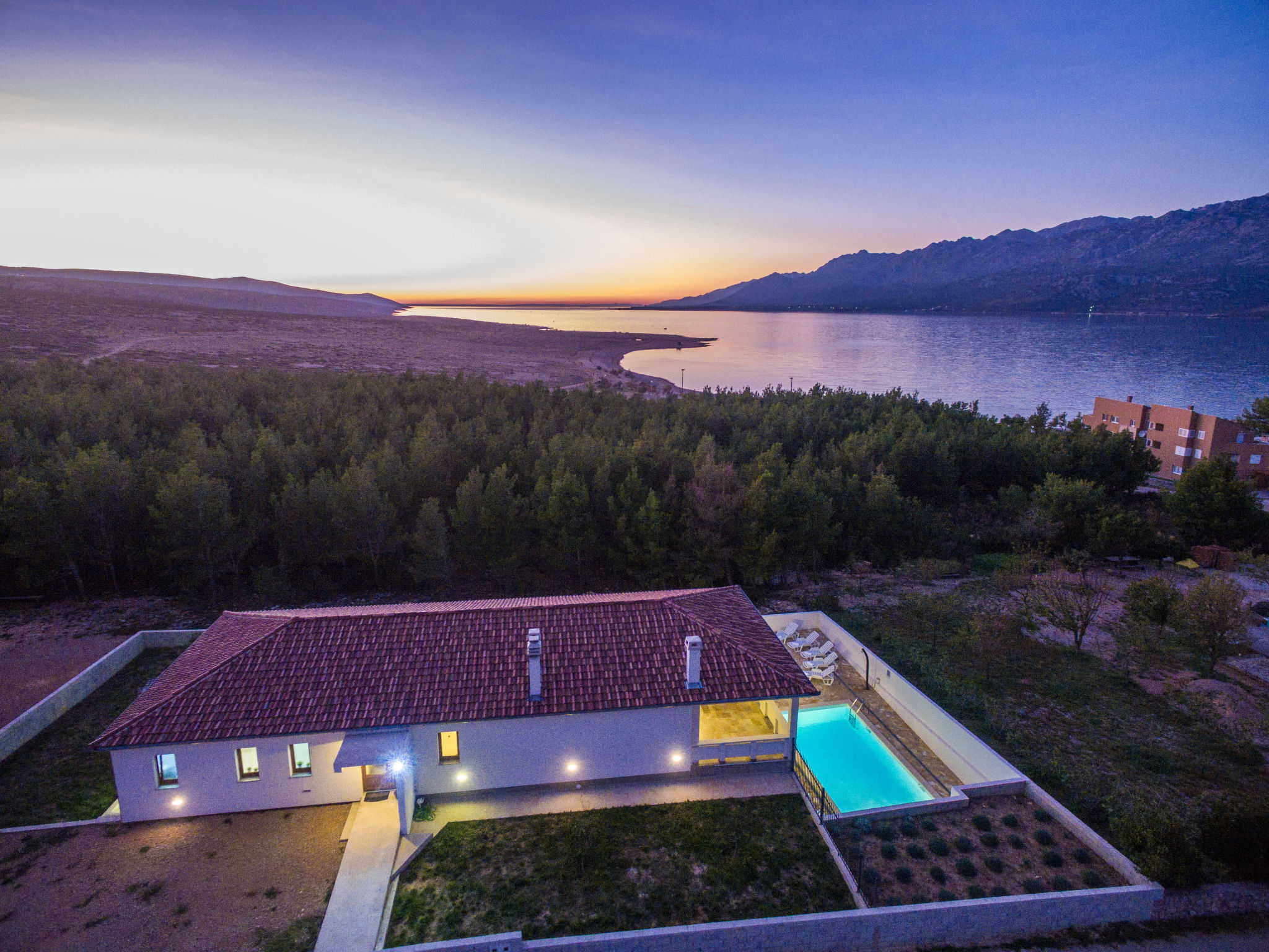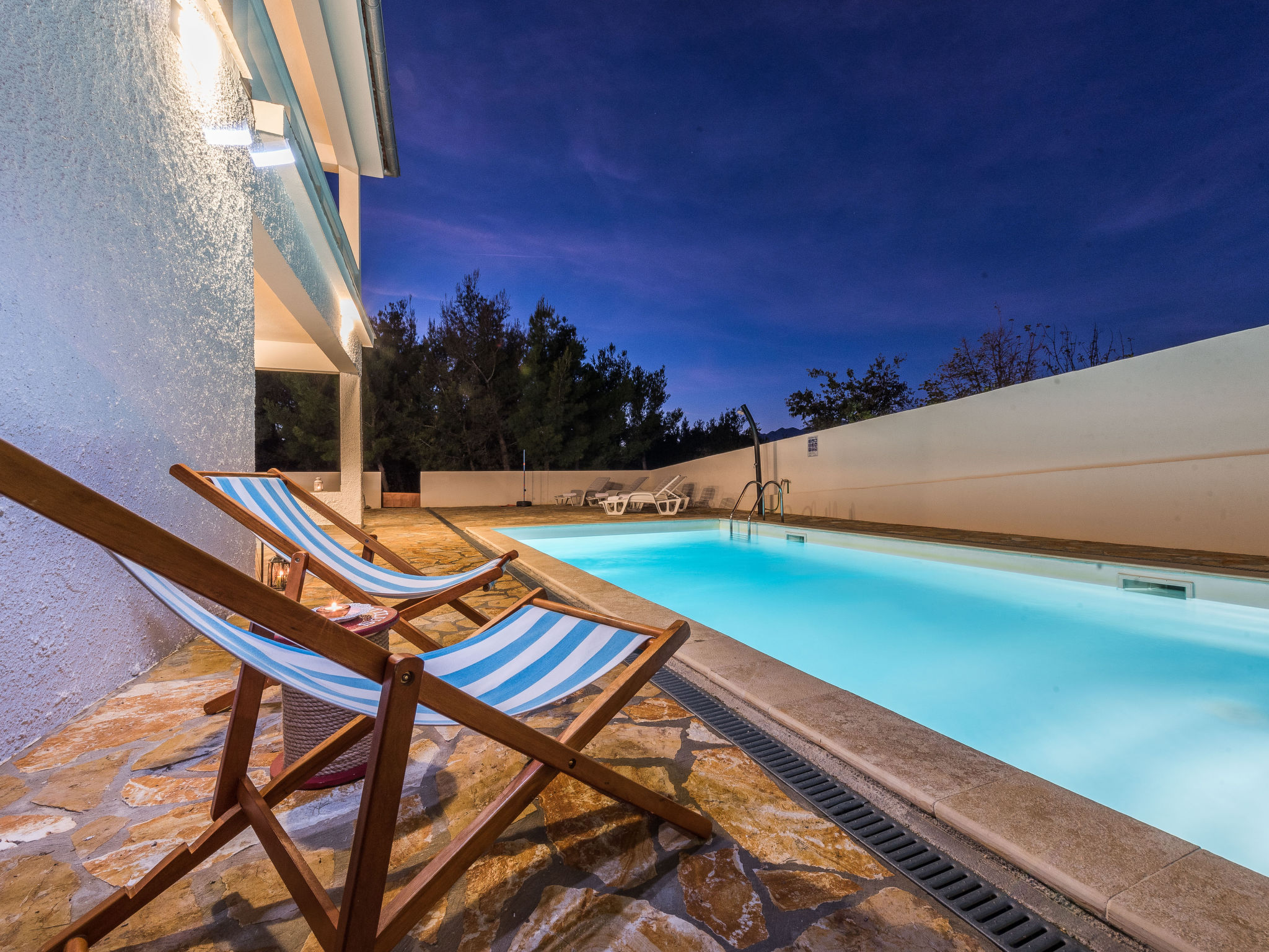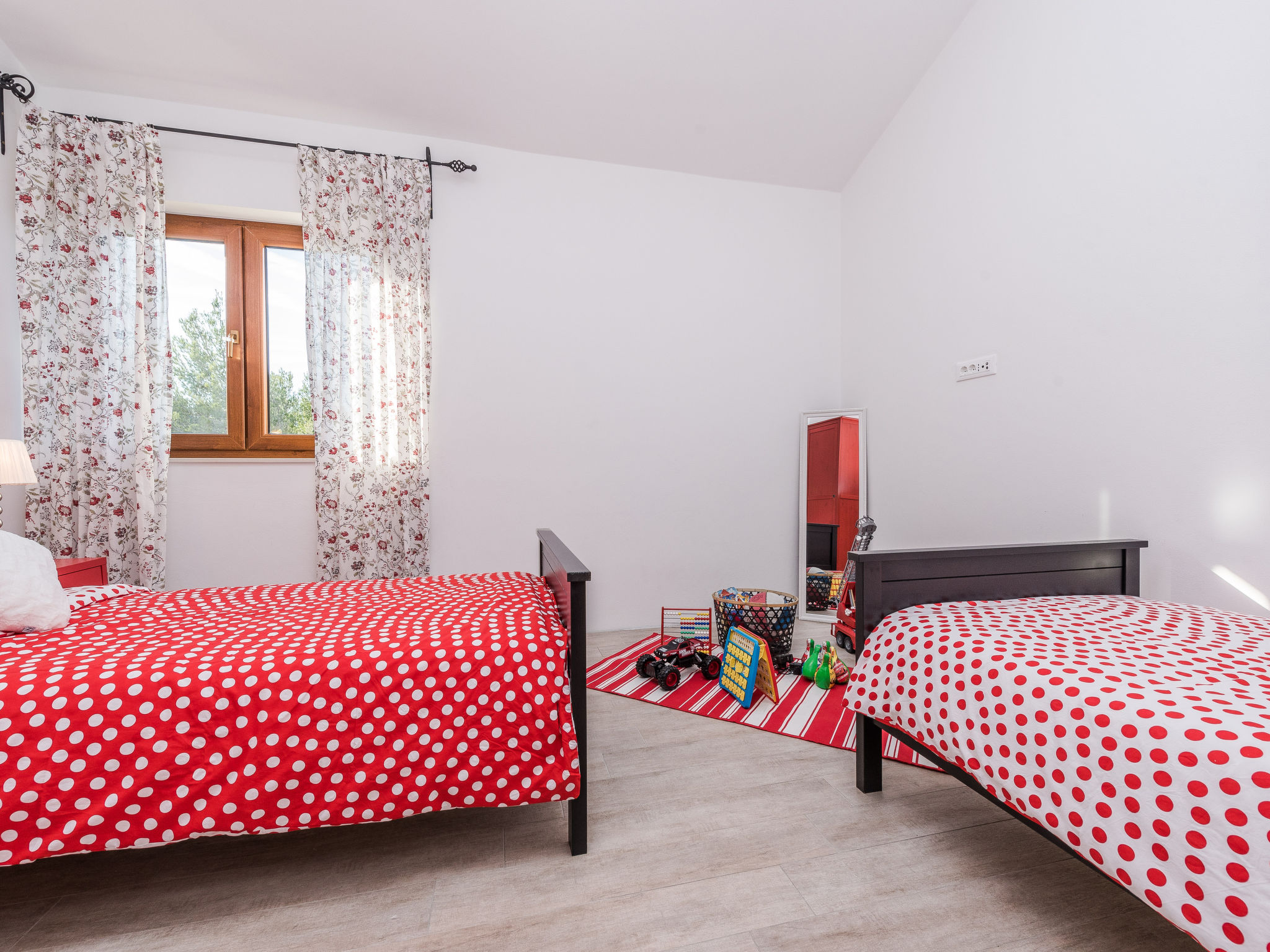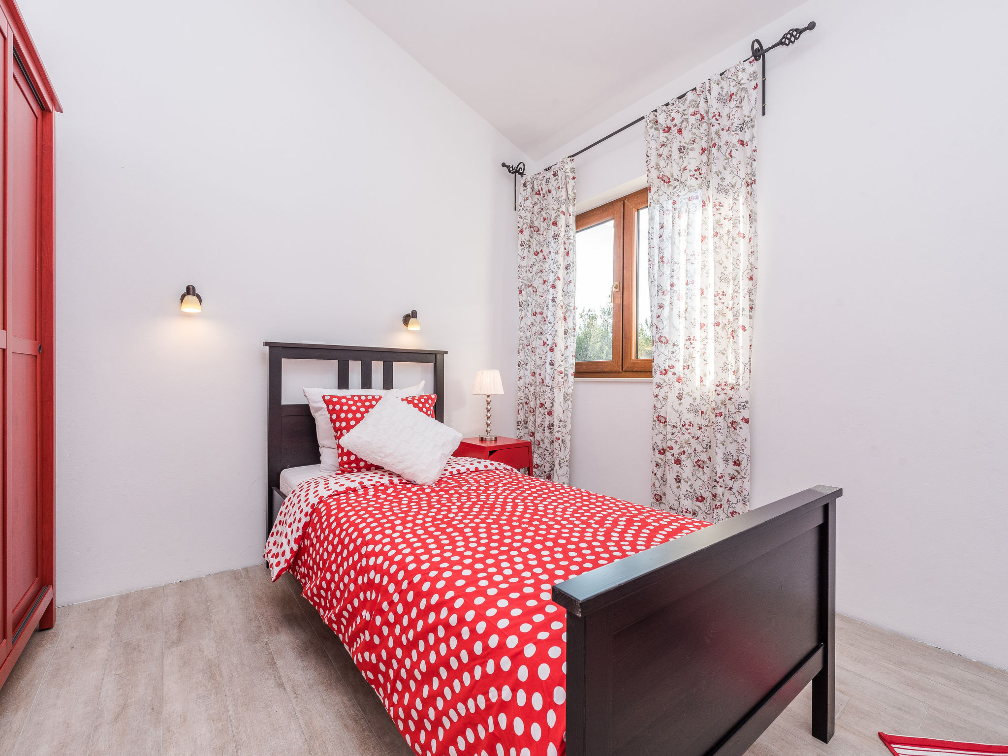 5-Zimmer-Haus 150 m2 auf 2 Stockwerken, Nordwestlage. Wohn-/Esszimmer 42 m2 mit 1 Doppeldiwanbett (140 cm, Länge 200 cm), Sat-TV (Flachbildschirm), Klimaanlage. Ausgang zur Terrasse. 1 Zimmer mit 2 Betten (90 cm, Länge 200 cm). 1 Zimmer mit 1 franz. Bett (160 cm, Länge 200 cm), Bad/WC und Doppelwaschbecken. 1 Zimmer mit 1 franz. Bett (160 cm, Länge 200 cm), Sat-TV (Flachbildschirm). Offene Küche (Backofen, Geschirrspüler, 4 Glaskeramikherd Platten, Mikrowelle, Tiefkühler, elektrische Kaffeemaschine). Dusche/WC. Unteres Geschoss: 1 Zimmer mit 1 franz. Bett (160 cm, Länge 200 cm). Dusche/WC, Doppelwaschbecken. Terrasse 36 m2, überdacht, Terrasse 20 m2, überdacht. Terrassenmöbel, Liegestühle. Sicht auf das Schwimmbad. Zur Verfügung: Haartrockner. Internet (Wireless LAN, gratis). Bitte beachten: Nichtraucher-Haus. Im Untergeschoss: Zimmer mit Tischtennis, Darts, Sat-TV (Flachbildschirm), Klimaanlage, Ausgang zur Terrasse.