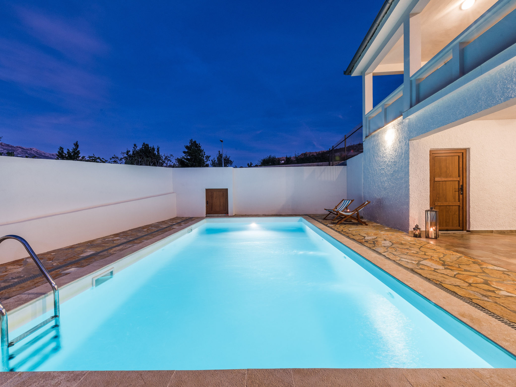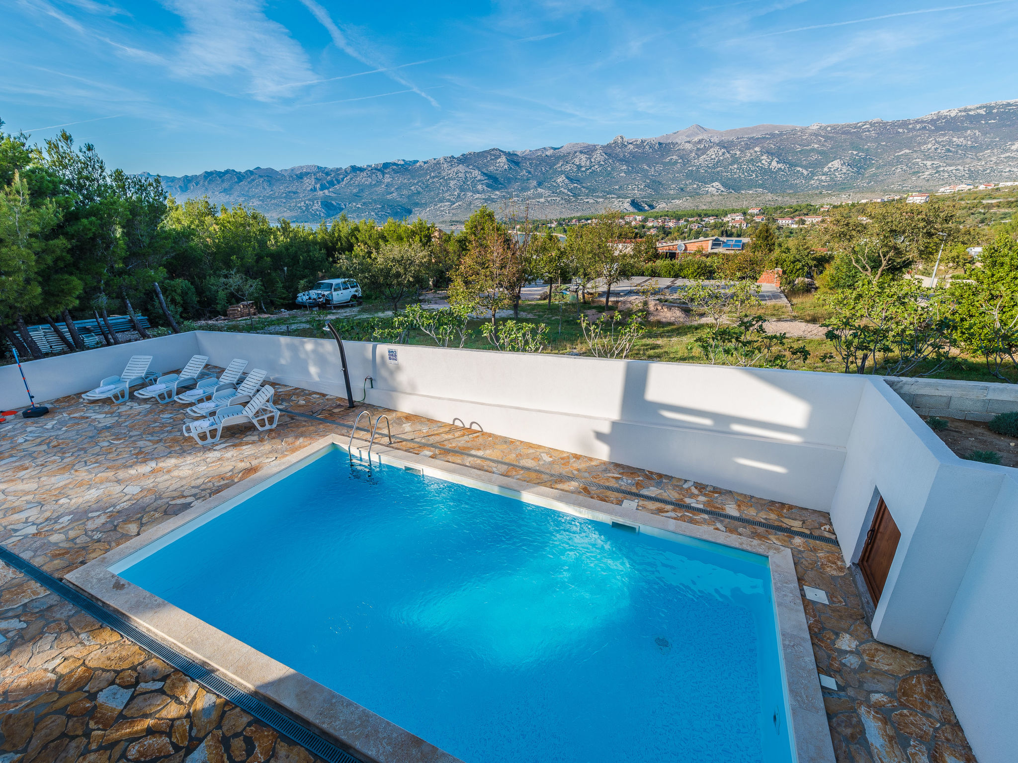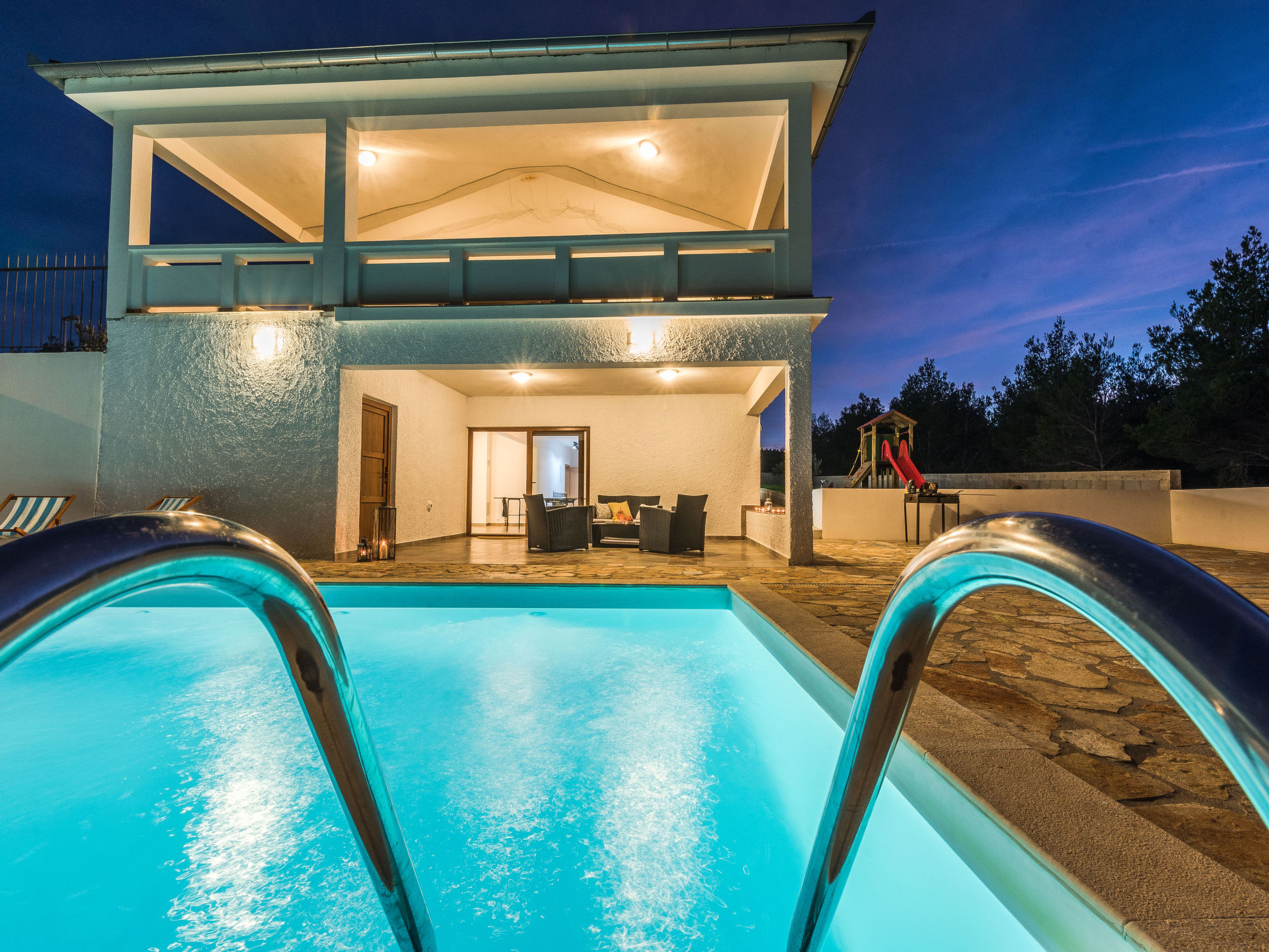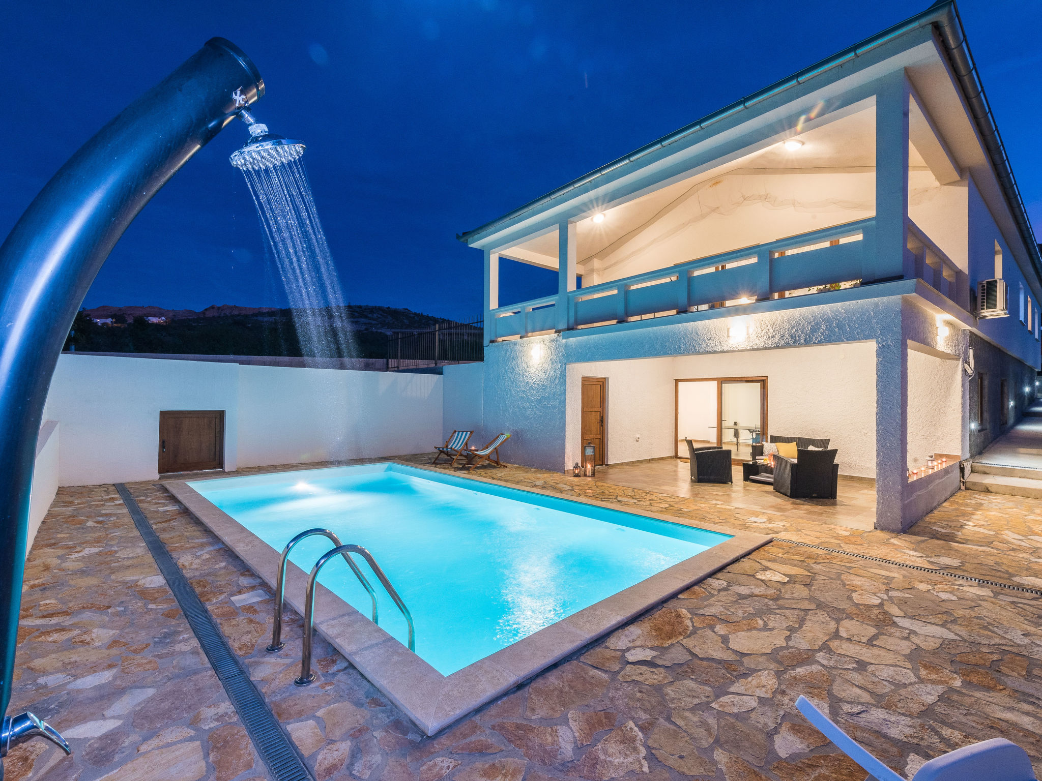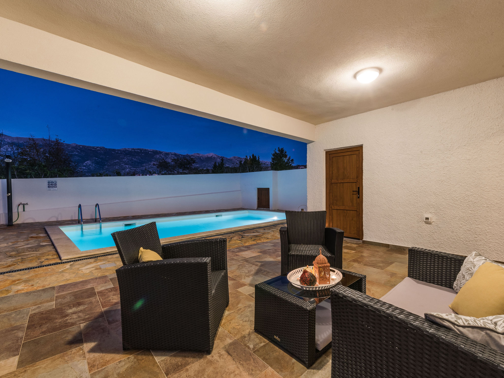 5-Zimmer-Haus 150 m2 auf 2 Stockwerken, Nordwestlage. Wohn-/Esszimmer 42 m2 mit 1 Doppeldiwanbett (140 cm, Länge 200 cm), Sat-TV (Flachbildschirm), Klimaanlage. Ausgang zur Terrasse. 1 Zimmer mit 2 Betten (90 cm, Länge 200 cm). 1 Zimmer mit 1 franz. Bett (160 cm, Länge 200 cm), Bad/WC und Doppelwaschbecken. 1 Zimmer mit 1 franz. Bett (160 cm, Länge 200 cm), Sat-TV (Flachbildschirm). Offene Küche (Backofen, Geschirrspüler, 4 Glaskeramikherd Platten, Mikrowelle, Tiefkühler, elektrische Kaffeemaschine). Dusche/WC. Unteres Geschoss: 1 Zimmer mit 1 franz. Bett (160 cm, Länge 200 cm). Dusche/WC, Doppelwaschbecken. Terrasse 36 m2, überdacht, Terrasse 20 m2, überdacht. Terrassenmöbel, Liegestühle. Sicht auf das Schwimmbad. Zur Verfügung: Haartrockner. Internet (Wireless LAN, gratis). Bitte beachten: Nichtraucher-Haus. Im Untergeschoss: Zimmer mit Tischtennis, Darts, Sat-TV (Flachbildschirm), Klimaanlage, Ausgang zur Terrasse.