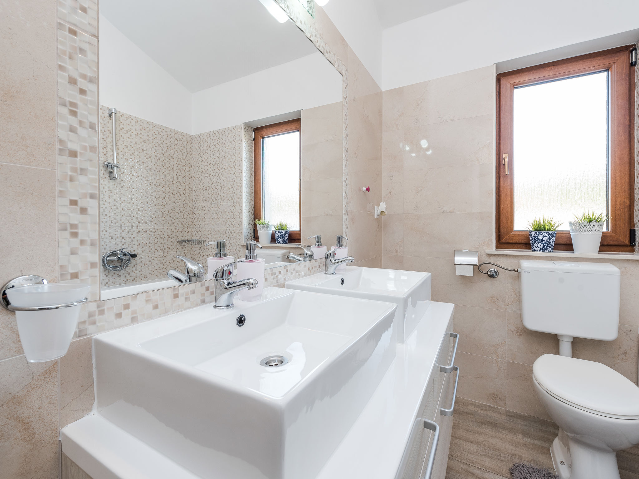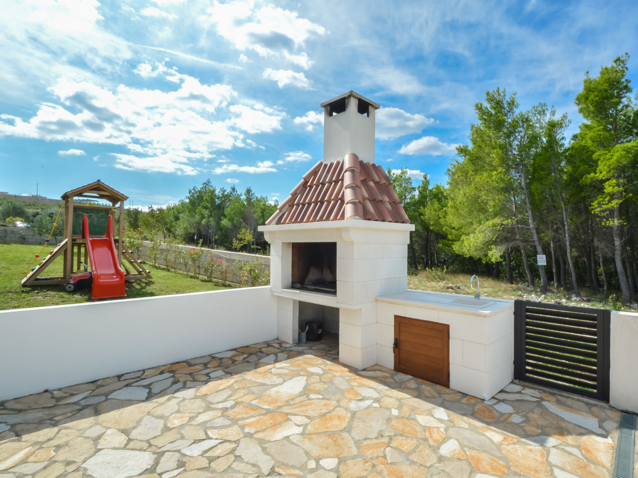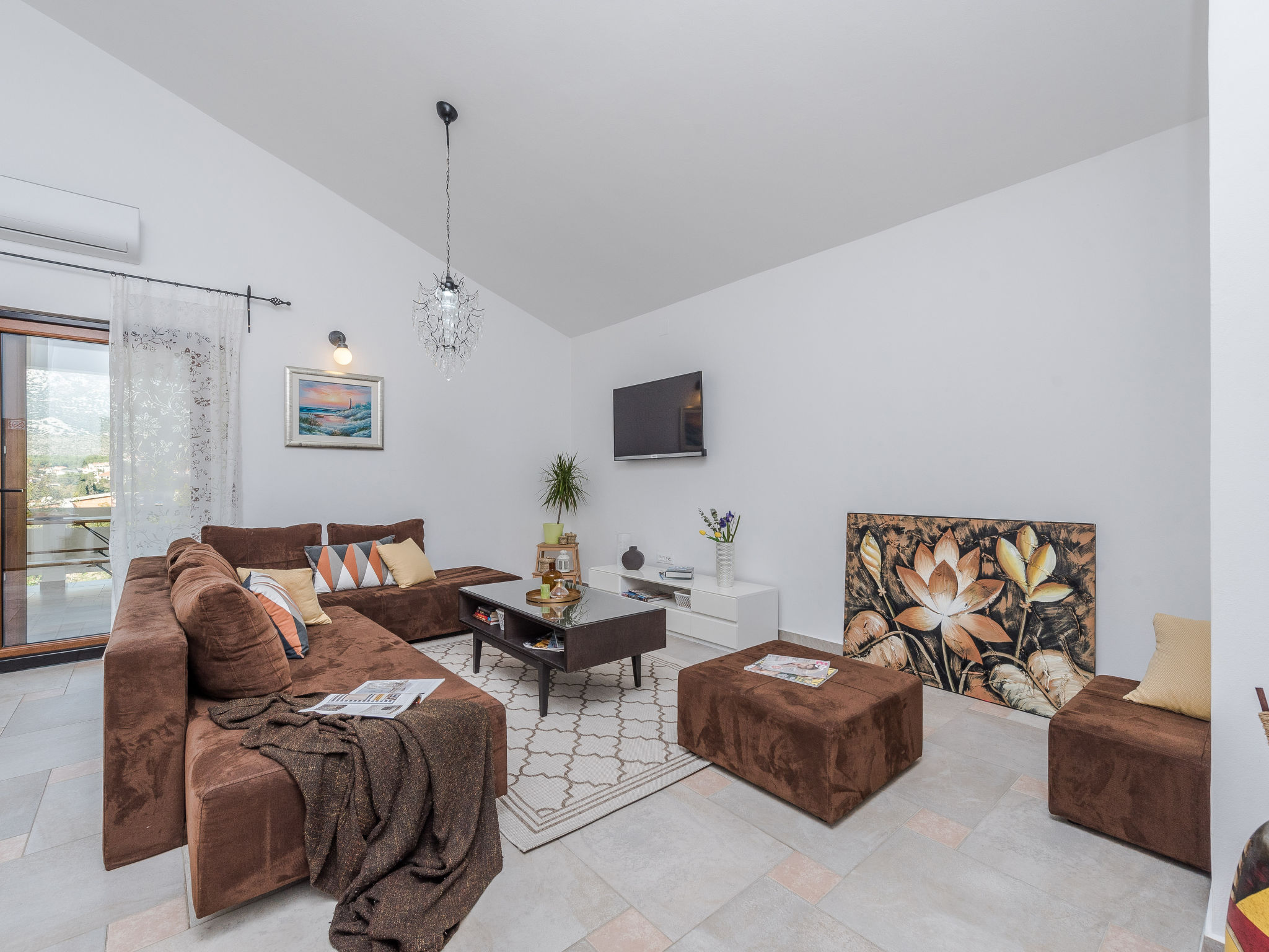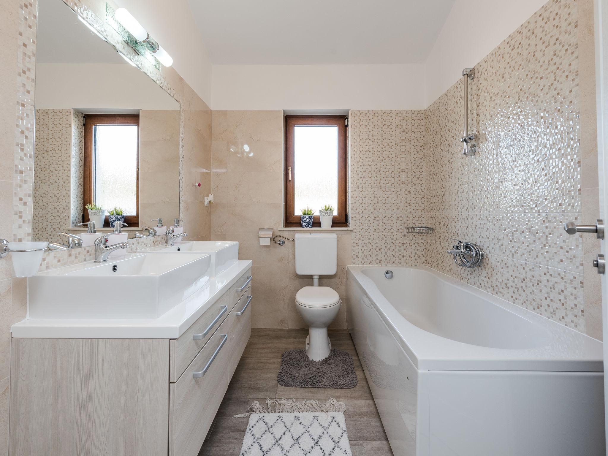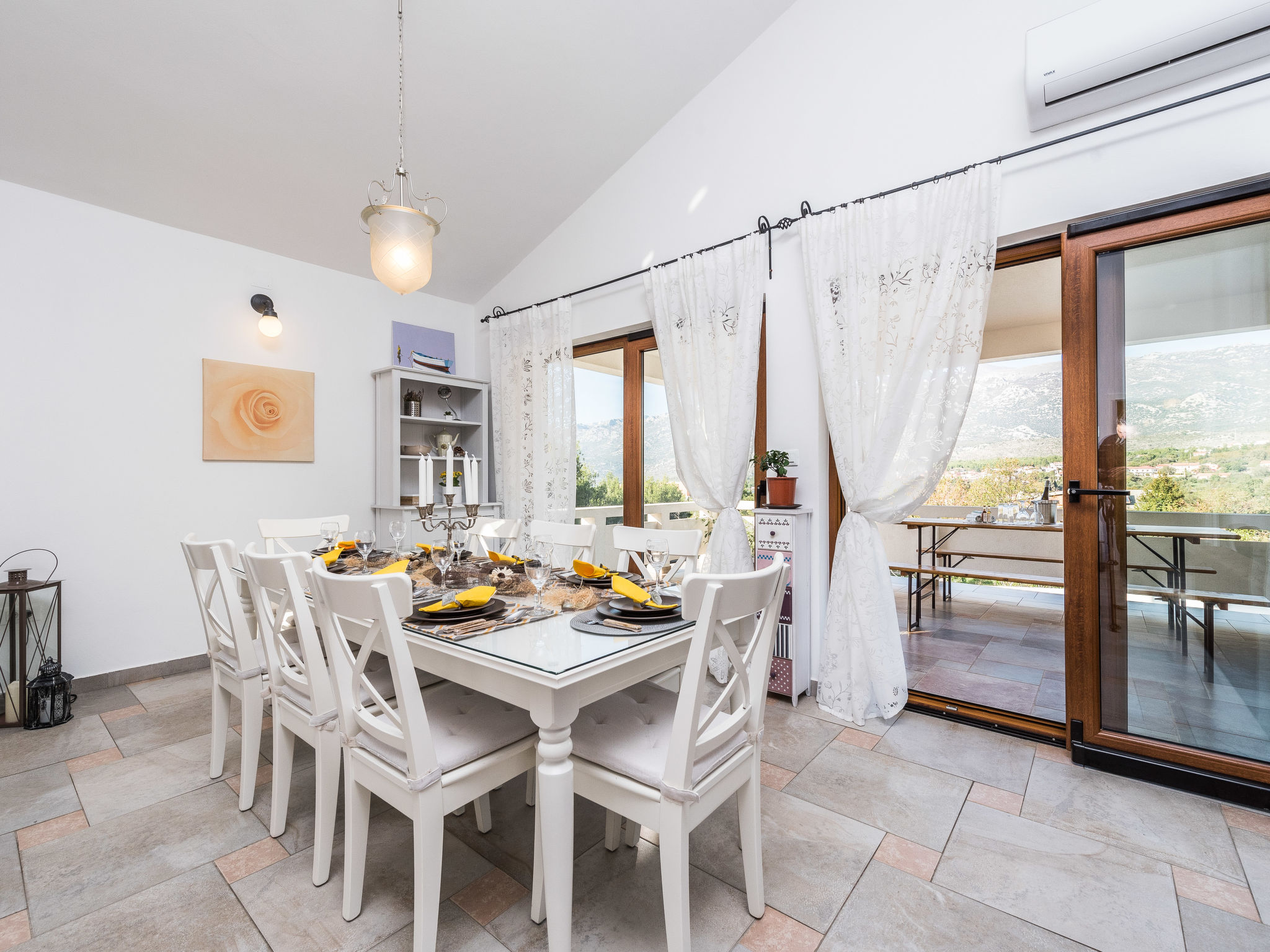 5-Zimmer-Haus 150 m2 auf 2 Stockwerken, Nordwestlage. Wohn-/Esszimmer 42 m2 mit 1 Doppeldiwanbett (140 cm, Länge 200 cm), Sat-TV (Flachbildschirm), Klimaanlage. Ausgang zur Terrasse. 1 Zimmer mit 2 Betten (90 cm, Länge 200 cm). 1 Zimmer mit 1 franz. Bett (160 cm, Länge 200 cm), Bad/WC und Doppelwaschbecken. 1 Zimmer mit 1 franz. Bett (160 cm, Länge 200 cm), Sat-TV (Flachbildschirm). Offene Küche (Backofen, Geschirrspüler, 4 Glaskeramikherd Platten, Mikrowelle, Tiefkühler, elektrische Kaffeemaschine). Dusche/WC. Unteres Geschoss: 1 Zimmer mit 1 franz. Bett (160 cm, Länge 200 cm). Dusche/WC, Doppelwaschbecken. Terrasse 36 m2, überdacht, Terrasse 20 m2, überdacht. Terrassenmöbel, Liegestühle. Sicht auf das Schwimmbad. Zur Verfügung: Haartrockner. Internet (Wireless LAN, gratis). Bitte beachten: Nichtraucher-Haus. Im Untergeschoss: Zimmer mit Tischtennis, Darts, Sat-TV (Flachbildschirm), Klimaanlage, Ausgang zur Terrasse.