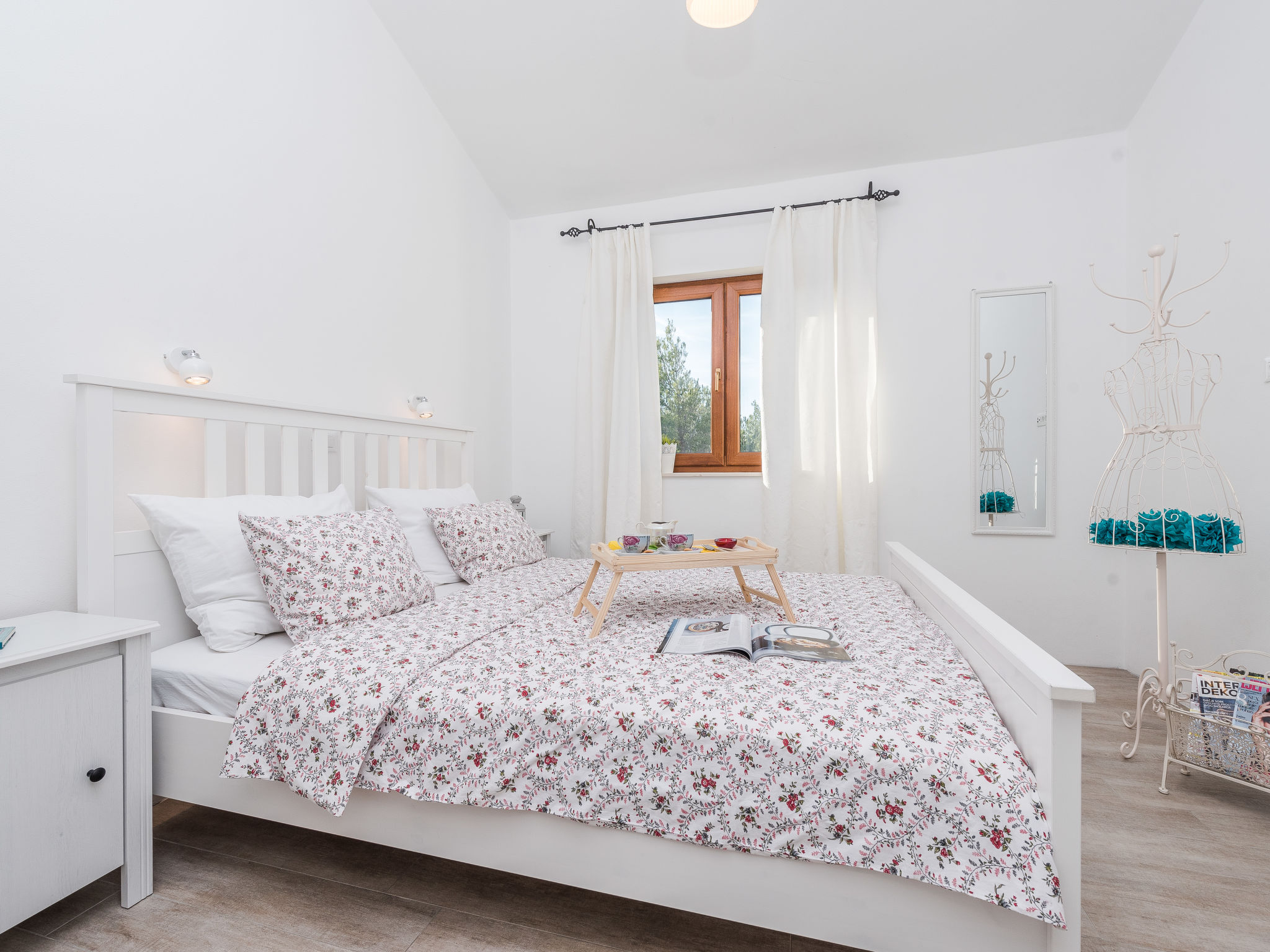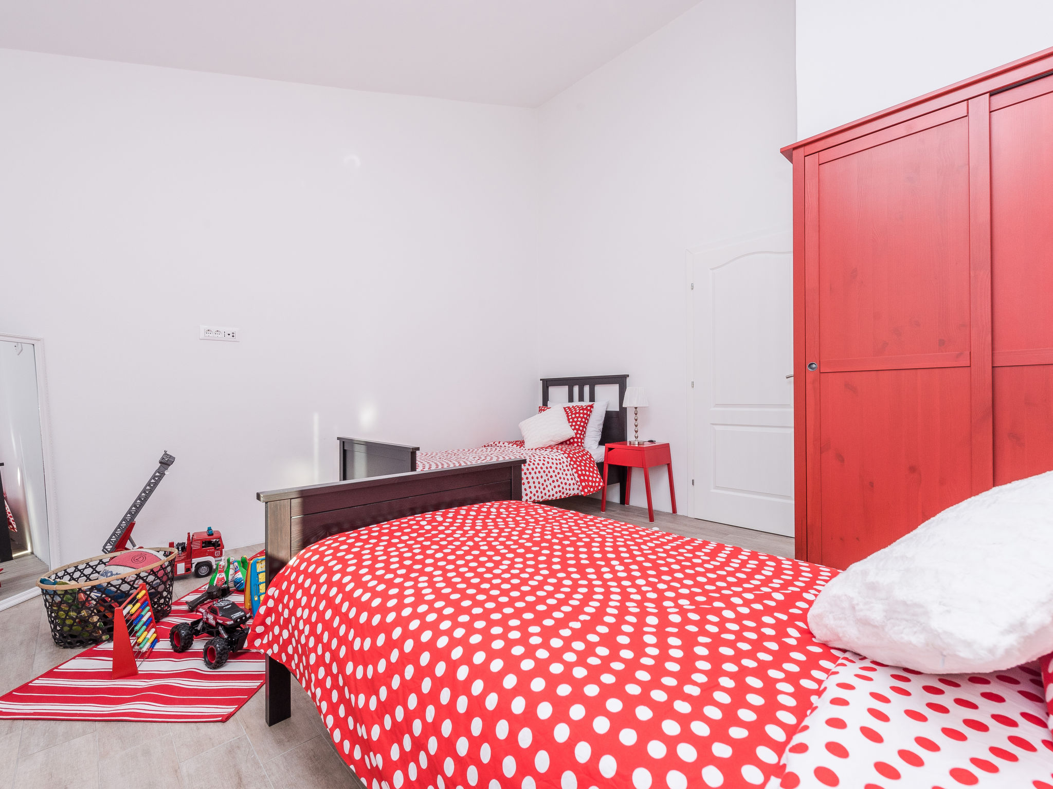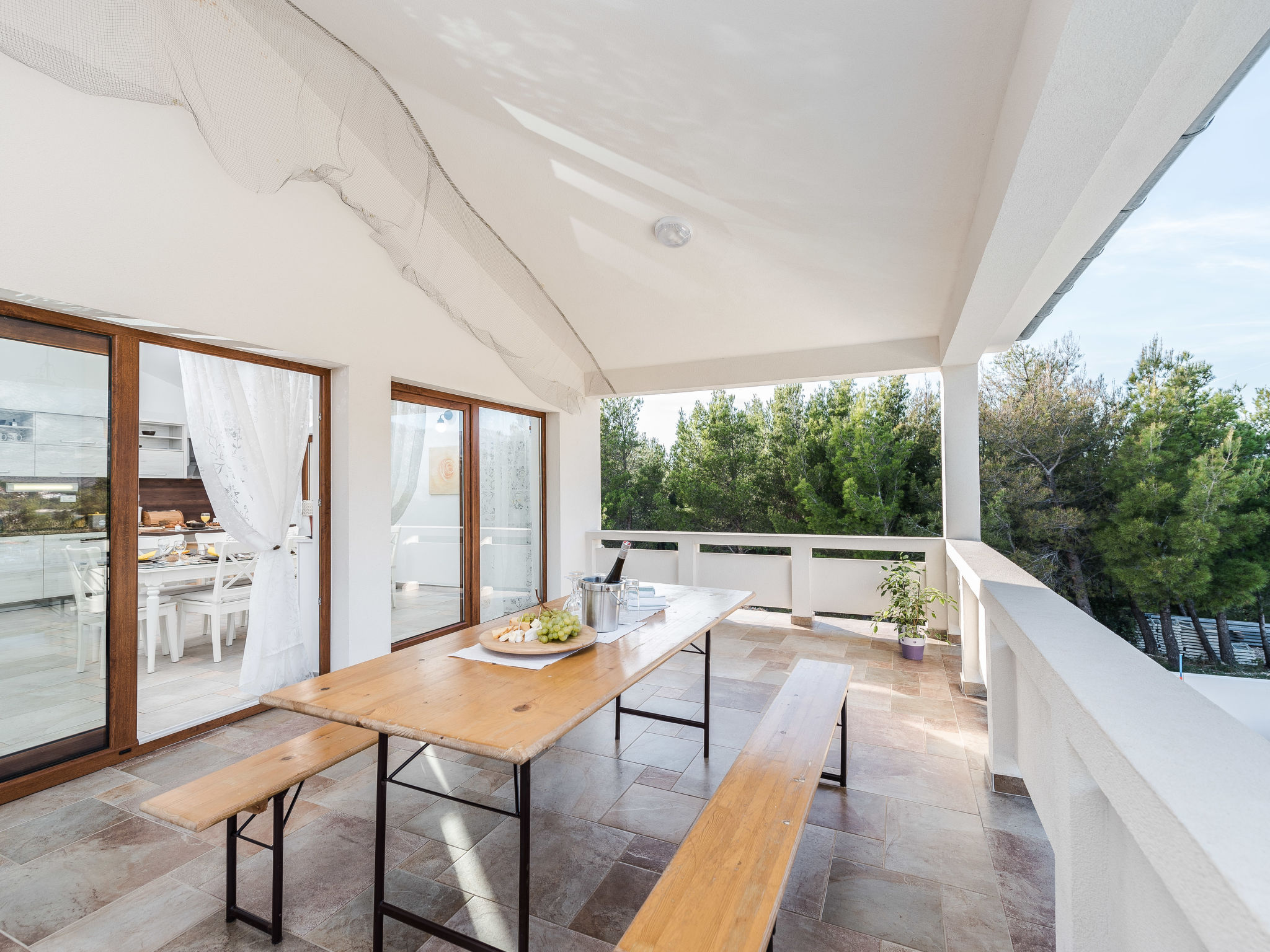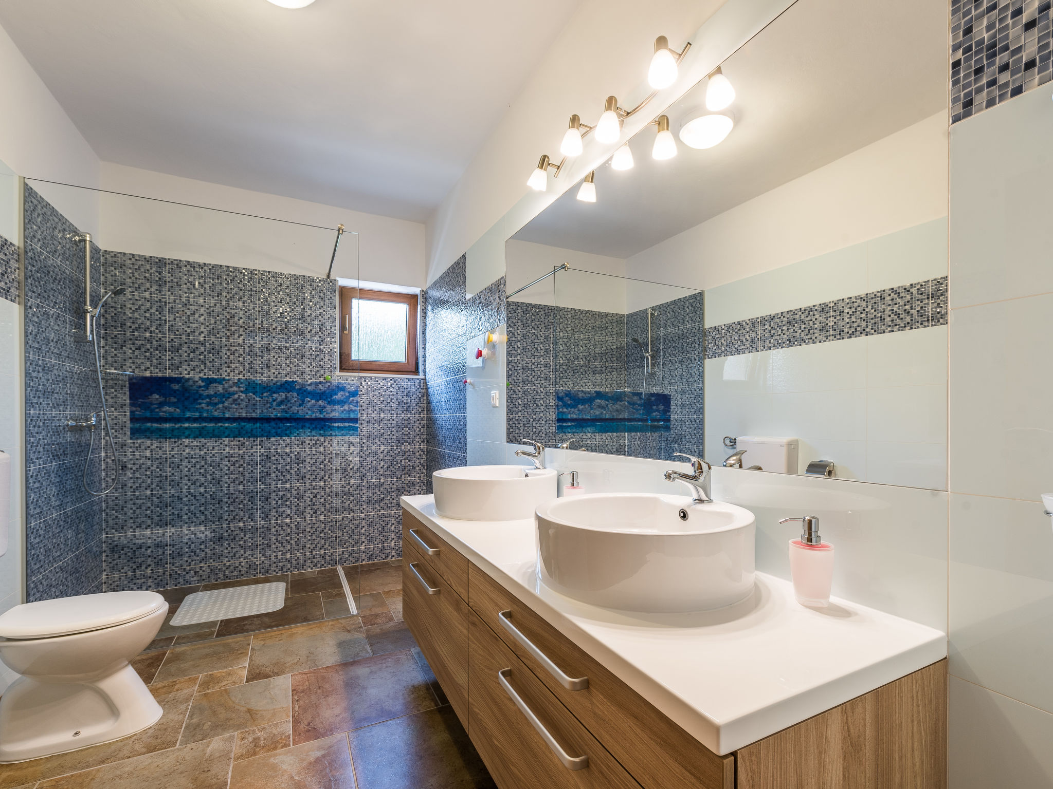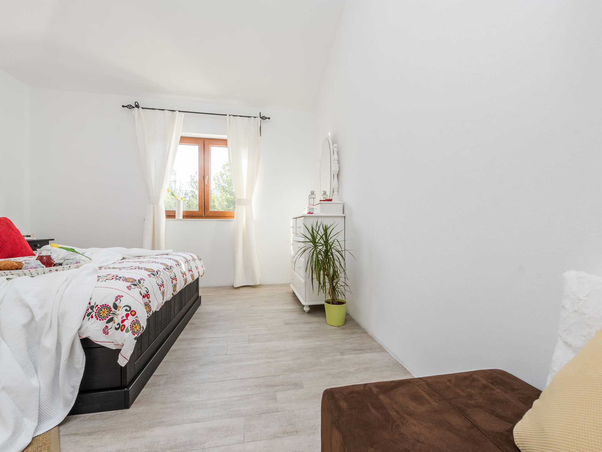 5-Zimmer-Haus 150 m2 auf 2 Stockwerken, Nordwestlage. Wohn-/Esszimmer 42 m2 mit 1 Doppeldiwanbett (140 cm, Länge 200 cm), Sat-TV (Flachbildschirm), Klimaanlage. Ausgang zur Terrasse. 1 Zimmer mit 2 Betten (90 cm, Länge 200 cm). 1 Zimmer mit 1 franz. Bett (160 cm, Länge 200 cm), Bad/WC und Doppelwaschbecken. 1 Zimmer mit 1 franz. Bett (160 cm, Länge 200 cm), Sat-TV (Flachbildschirm). Offene Küche (Backofen, Geschirrspüler, 4 Glaskeramikherd Platten, Mikrowelle, Tiefkühler, elektrische Kaffeemaschine). Dusche/WC. Unteres Geschoss: 1 Zimmer mit 1 franz. Bett (160 cm, Länge 200 cm). Dusche/WC, Doppelwaschbecken. Terrasse 36 m2, überdacht, Terrasse 20 m2, überdacht. Terrassenmöbel, Liegestühle. Sicht auf das Schwimmbad. Zur Verfügung: Haartrockner. Internet (Wireless LAN, gratis). Bitte beachten: Nichtraucher-Haus. Im Untergeschoss: Zimmer mit Tischtennis, Darts, Sat-TV (Flachbildschirm), Klimaanlage, Ausgang zur Terrasse.