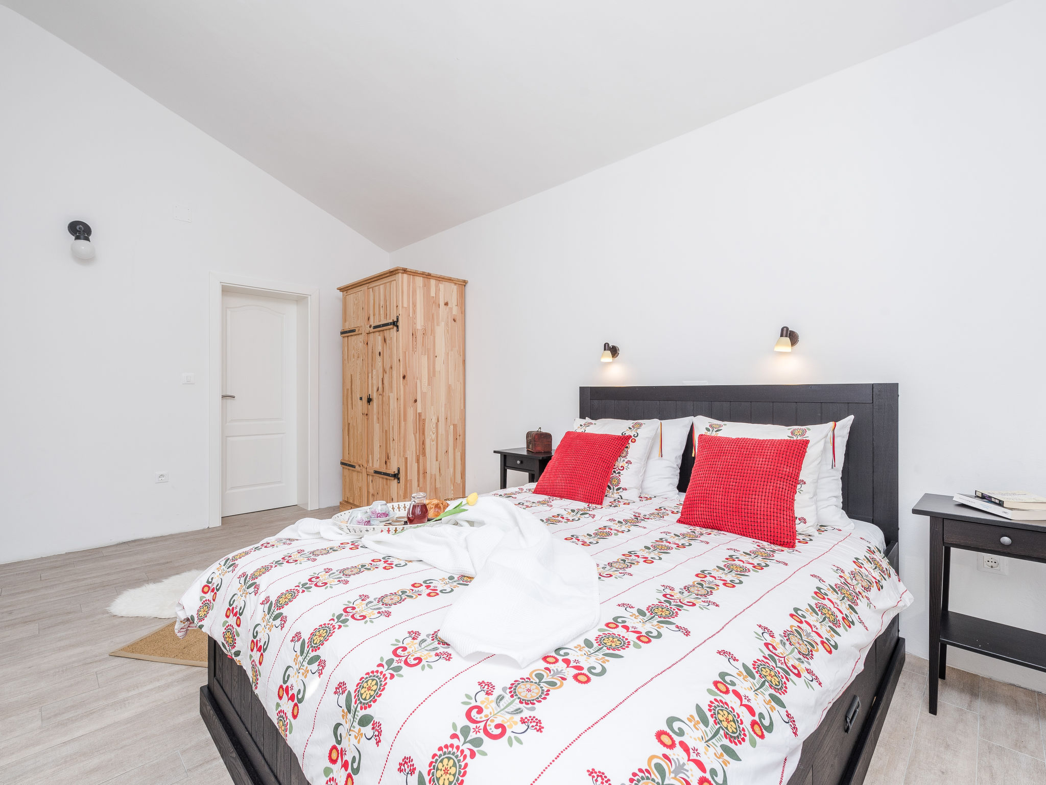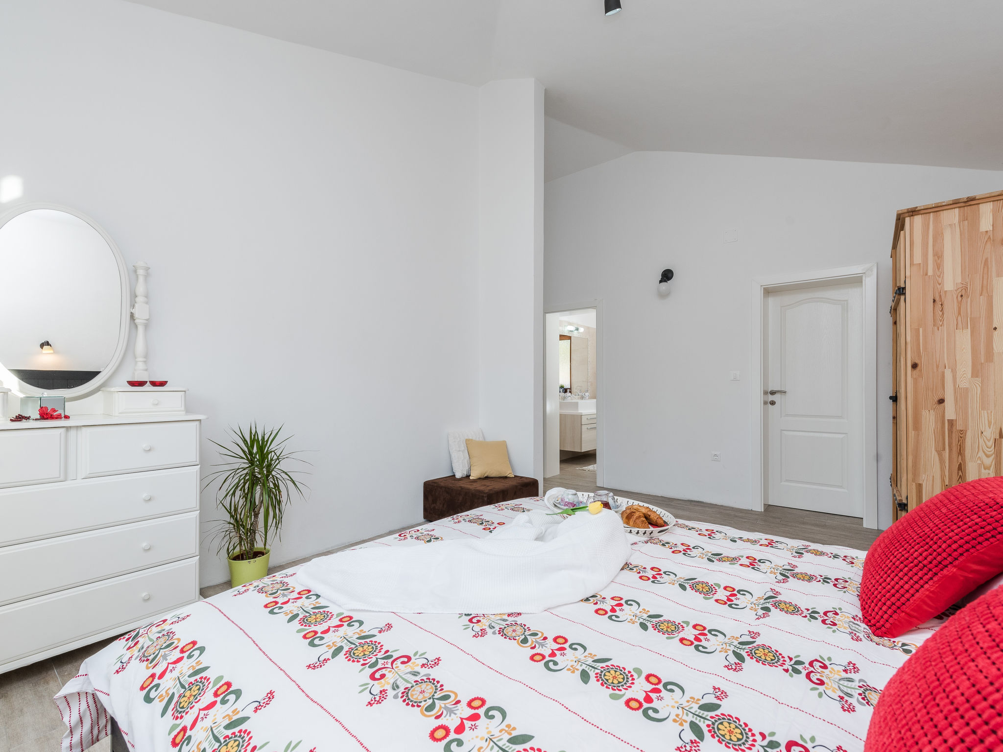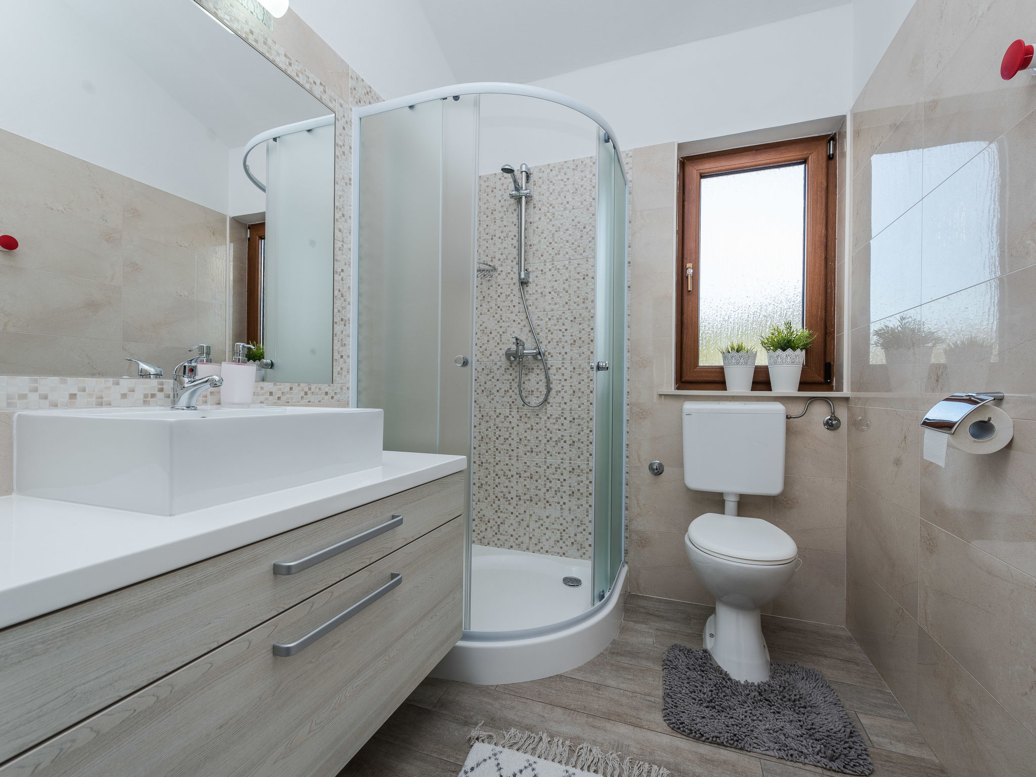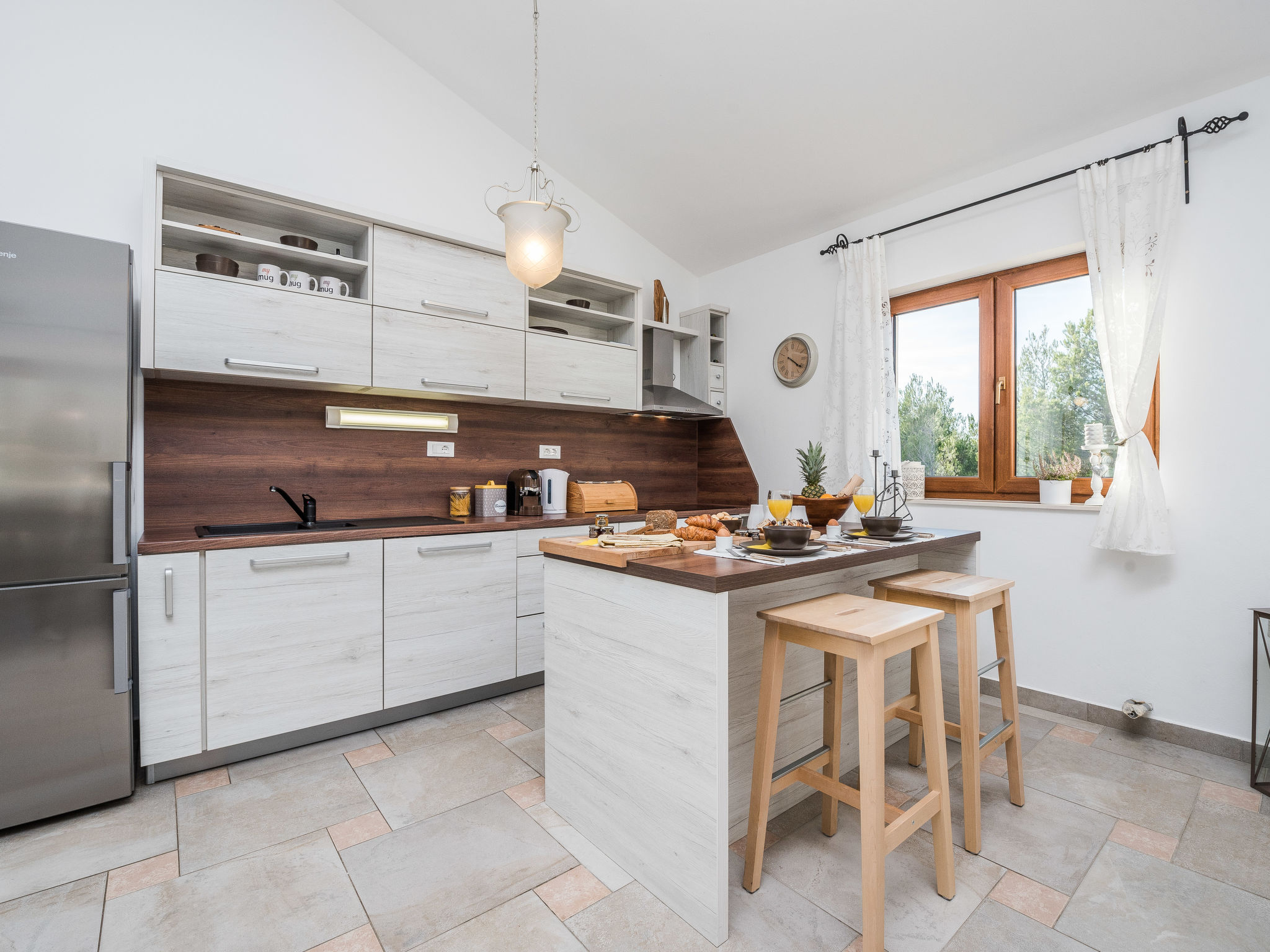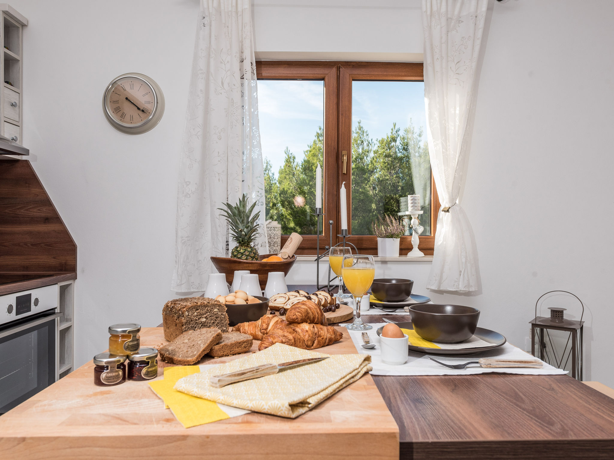 5-Zimmer-Haus 150 m2 auf 2 Stockwerken, Nordwestlage. Wohn-/Esszimmer 42 m2 mit 1 Doppeldiwanbett (140 cm, Länge 200 cm), Sat-TV (Flachbildschirm), Klimaanlage. Ausgang zur Terrasse. 1 Zimmer mit 2 Betten (90 cm, Länge 200 cm). 1 Zimmer mit 1 franz. Bett (160 cm, Länge 200 cm), Bad/WC und Doppelwaschbecken. 1 Zimmer mit 1 franz. Bett (160 cm, Länge 200 cm), Sat-TV (Flachbildschirm). Offene Küche (Backofen, Geschirrspüler, 4 Glaskeramikherd Platten, Mikrowelle, Tiefkühler, elektrische Kaffeemaschine). Dusche/WC. Unteres Geschoss: 1 Zimmer mit 1 franz. Bett (160 cm, Länge 200 cm). Dusche/WC, Doppelwaschbecken. Terrasse 36 m2, überdacht, Terrasse 20 m2, überdacht. Terrassenmöbel, Liegestühle. Sicht auf das Schwimmbad. Zur Verfügung: Haartrockner. Internet (Wireless LAN, gratis). Bitte beachten: Nichtraucher-Haus. Im Untergeschoss: Zimmer mit Tischtennis, Darts, Sat-TV (Flachbildschirm), Klimaanlage, Ausgang zur Terrasse.