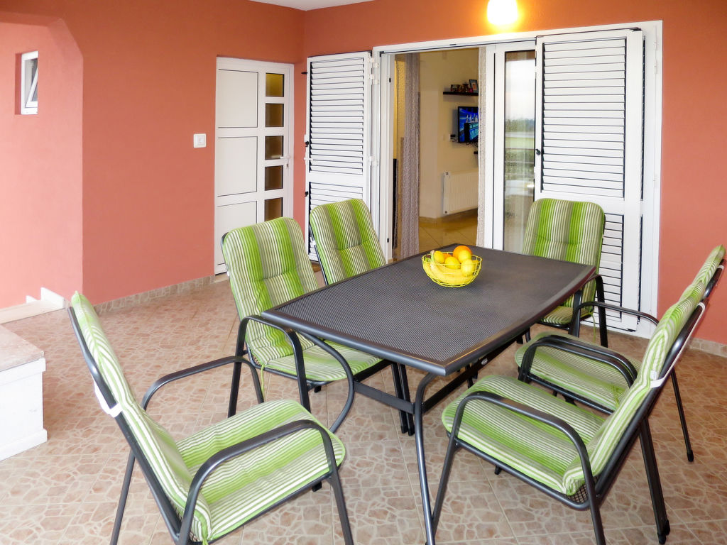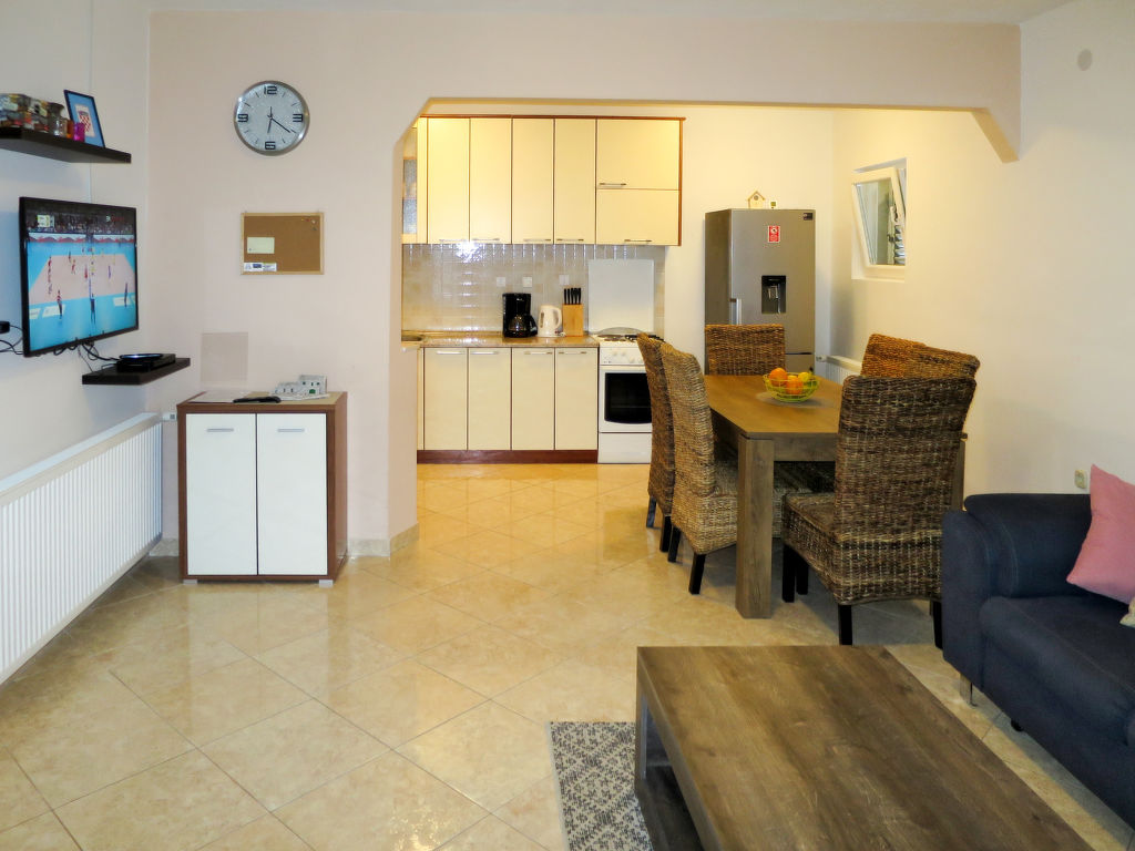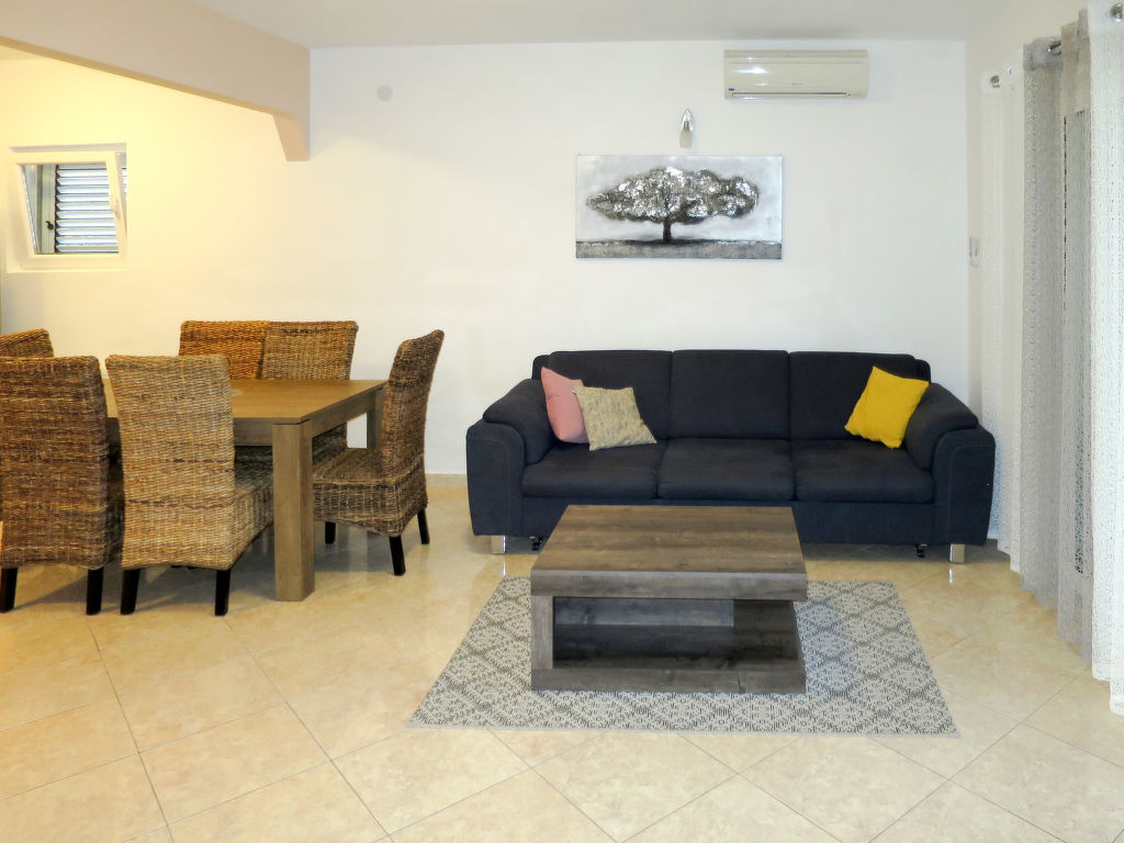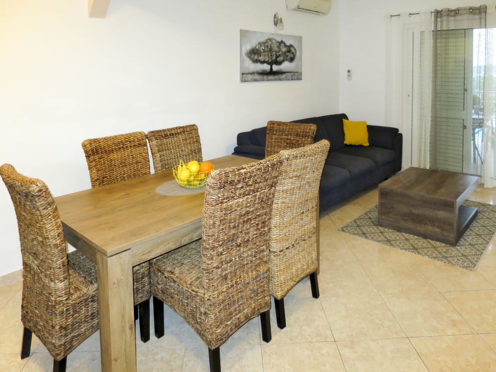 4-Zimmer-Haus 80 m2, im erhöhten Erdgeschoss. Wohn-/Esszimmer mit 1 Diwanbett, Sat-TV und Klimaanlage. Ausgang zur Terrasse. Eingang mit Klimaanlage. 2 Zimmer, jedes Zimmer mit 1 franz. Bett (160 cm, Länge 200 cm). 1 Zimmer mit 2 Betten. Offene Küche (2 Kochplatten, Backofen, Geschirrspüler, 2 Flammen, Toaster, Wasserkocher, Tiefkühler, elektrische Kaffeemaschine). Bad/WC, sep. WC. Terrasse überdacht. Terrassenmöbel, Liegestühle. Sicht auf das Meer. Zur Verfügung: Internet (Wireless LAN, gratis).