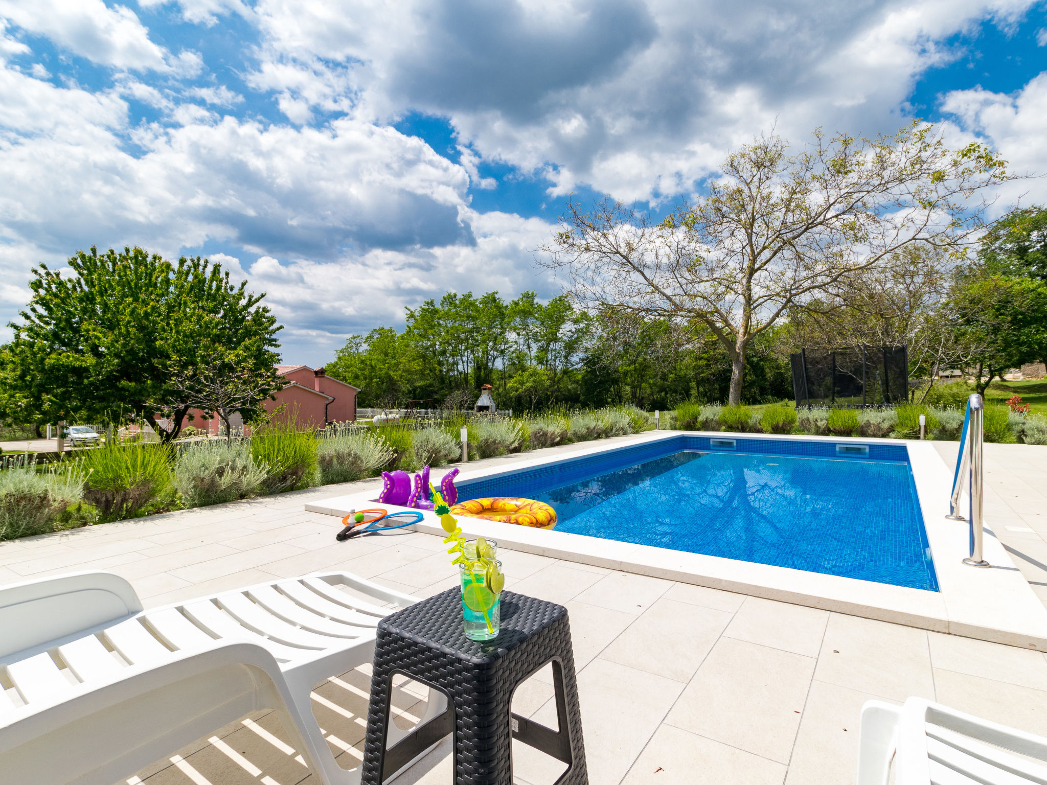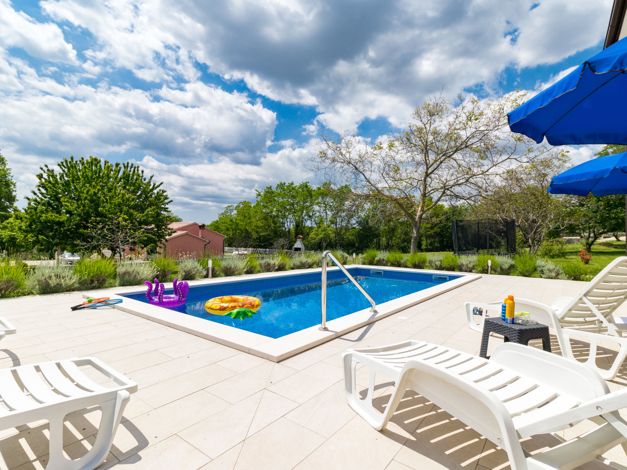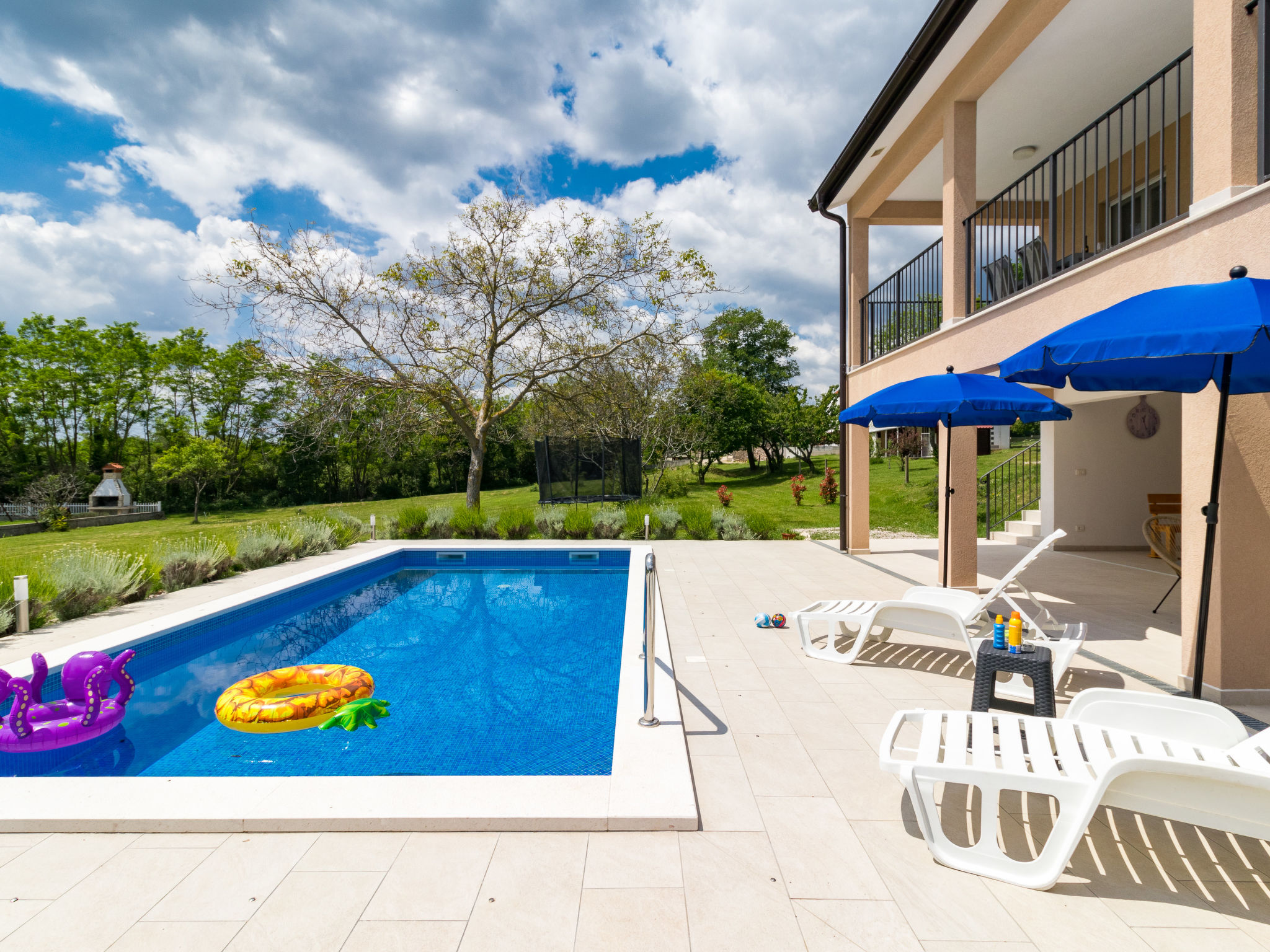 Einfamilienhaus "Marina (LBN411)", auf 2 Stockwerken, Baujahr 2018. Im Ortsteil Vinež, 1 km vom Zentrum von Labin, 6 km vom Zentrum von Rabac, in einem Wohnquartier, 6 km vom Meer. Zur Alleinbenutzung: Grundstück 3'000 m2 mit Rasen und Bäumen, Schwimmbad (8 x 4 m, 135 cm tief, 01.05.-01.10.) mit Innentreppe. Aussendusche, Terrasse, Gartenmöbel, Grill, Poolpflege durch den Besitzer/Gärtner. Im Hause: Internetzugang, Trampolin, Waschmaschine. Zufahrt bis zum Haus (30 m Naturweg). Parkplatz (für 3 Autos) auf dem Grundstück. Einkaufsgeschäft 200 m, Supermarkt 1 km, Kieselstrand 6 km. Jugendgruppen nur auf Anfrage.