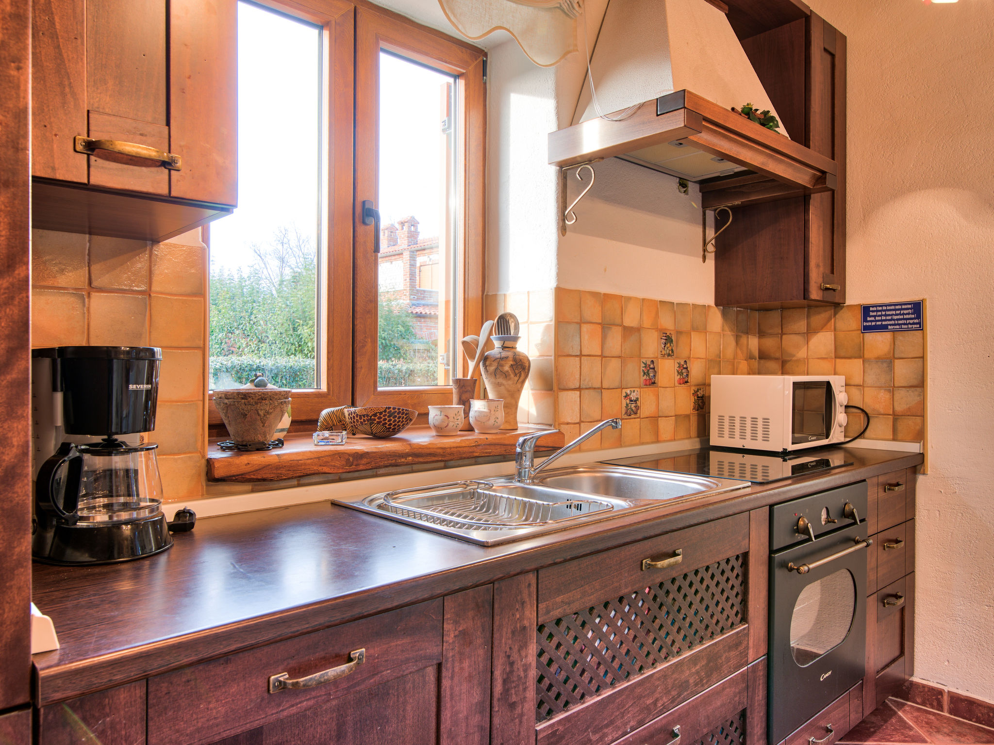4-Zimmer-Haus 110 m2 auf 2 Stockwerken. Rustikal und geschmackvoll eingerichtet: Wohn-/Esszimmer mit offenem Kamin (nur Deko), Sat-TV und Klimaanlage. Ausgang zur Terrasse. Offene Küche (Backofen, Geschirrspüler, 4 Glaskeramikherd Platten, Toaster, Wasserkocher, Mikrowelle, elektrische Kaffeemaschine). Dusche/WC. Klimaanlage. Obergeschoss: Eingang mit Klimaanlage. 1 Zimmer mit 1 Doppelbett (2 x 90 cm, Länge 200 cm). 1 Zimmer mit 1 Bett (80 cm, Länge 200 cm), 1 Ausziehbett (Länge 200 cm). Ausgang zum Balkon. 1 Zimmer mit 1 franz. Bett (160 cm, Länge 200 cm), Sat-TV. Ausgang zum Balkon. Dusche/Bidet/WC. Klimaanlage. Balkon 10 m2, Terrasse 25 m2, überdacht. Terrassenmöbel, Liegestühle. Zur Verfügung: Babybett. Internet (Wireless LAN, gratis). Bitte beachten: Nichtraucher-Haus.