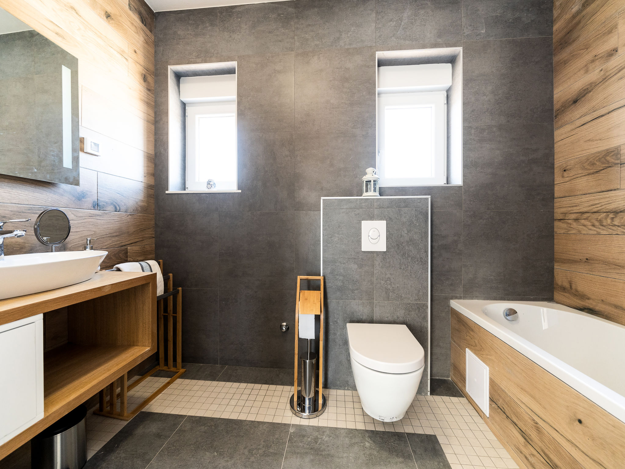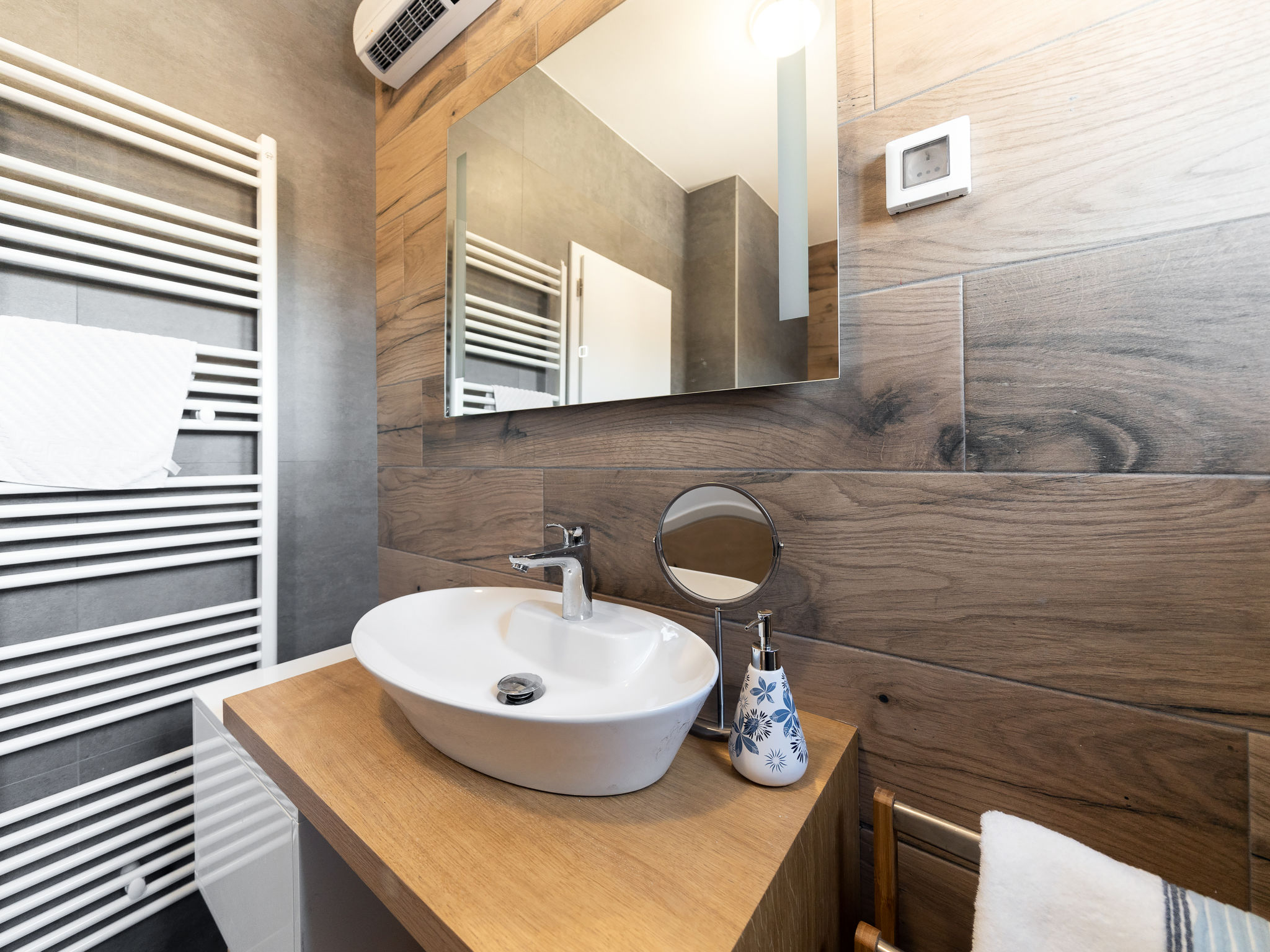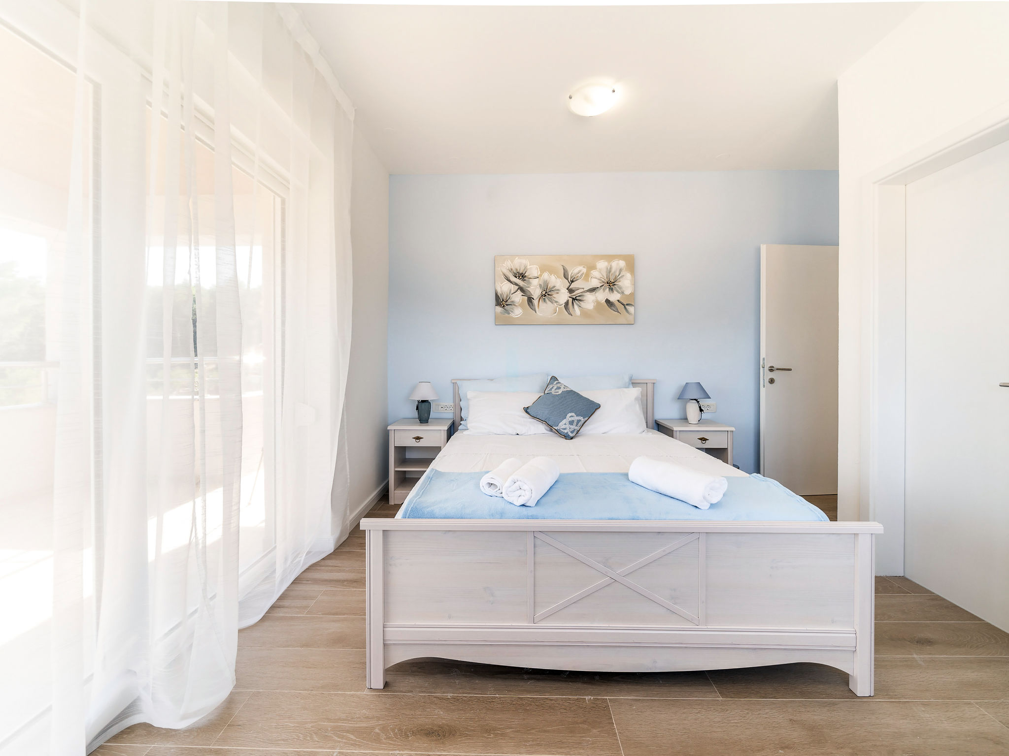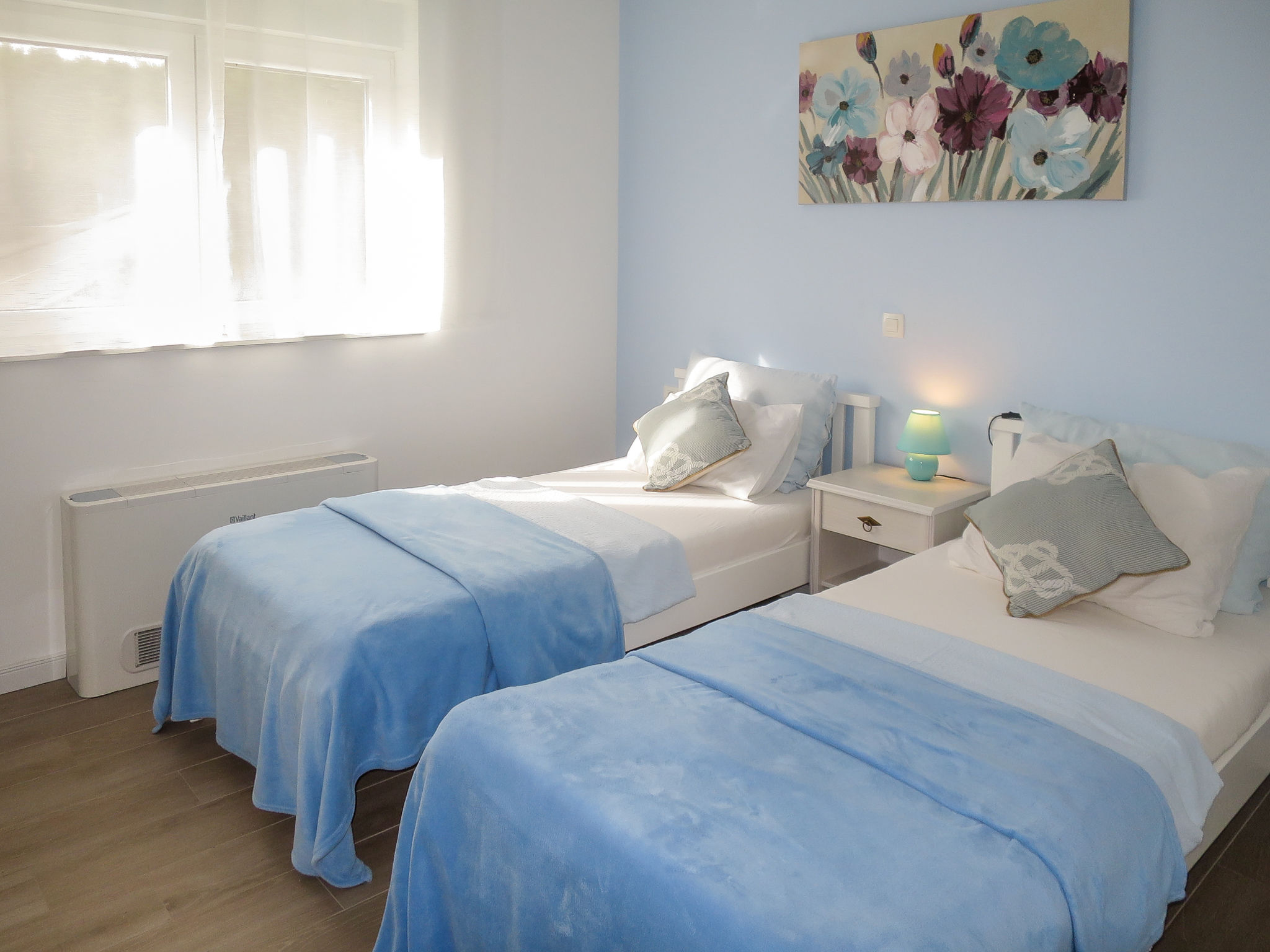 5-Zimmer-Haus 256 m2 auf 3 Stockwerken. 1 Zimmer mit 1 franz. Bett (160 cm, Länge 200 cm). Bad/Dusche, sep. WC. Obergeschoss: Wohn-/Esszimmer mit 1 Doppeldiwanbett (155 cm, Länge 200 cm), Sat-TV. Ausgang zum Balkon. Offene Küche (Backofen, Geschirrspüler, 4 Glaskeramikherd Platten, Toaster, Wasserkocher, Mikrowelle, Tiefkühler, elektrische Kaffeemaschine). Dusche/WC. 2. Obergeschoss: 1 Zimmer mit 1 franz. Bett (160 cm, Länge 200 cm), Dusche/WC. Ausgang zum Balkon. 1 Zimmer mit 2 Betten (90 cm, Länge 200 cm). 1 Zimmer mit 1 franz. Bett (180 cm, Länge 200 cm). Ausgang zum Balkon. Bad/WC. Klimaanlage, Warmluftheizung. 2 Balkone 13 m2. Gartengrill (mobil), Liegestühle, Abstellkammer. Sicht auf das Meer. Zur Verfügung: Safe, Bügeleisen, Babybett. Internet (Wireless LAN, gratis). Parkplatz (eingezäunt, 2 Autos). Bitte beachten: Nichtraucher-Haus.