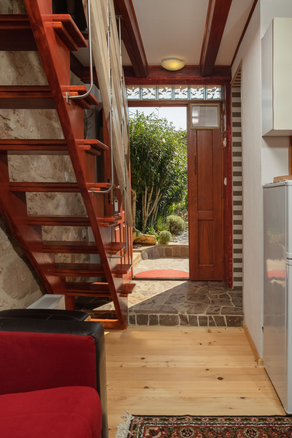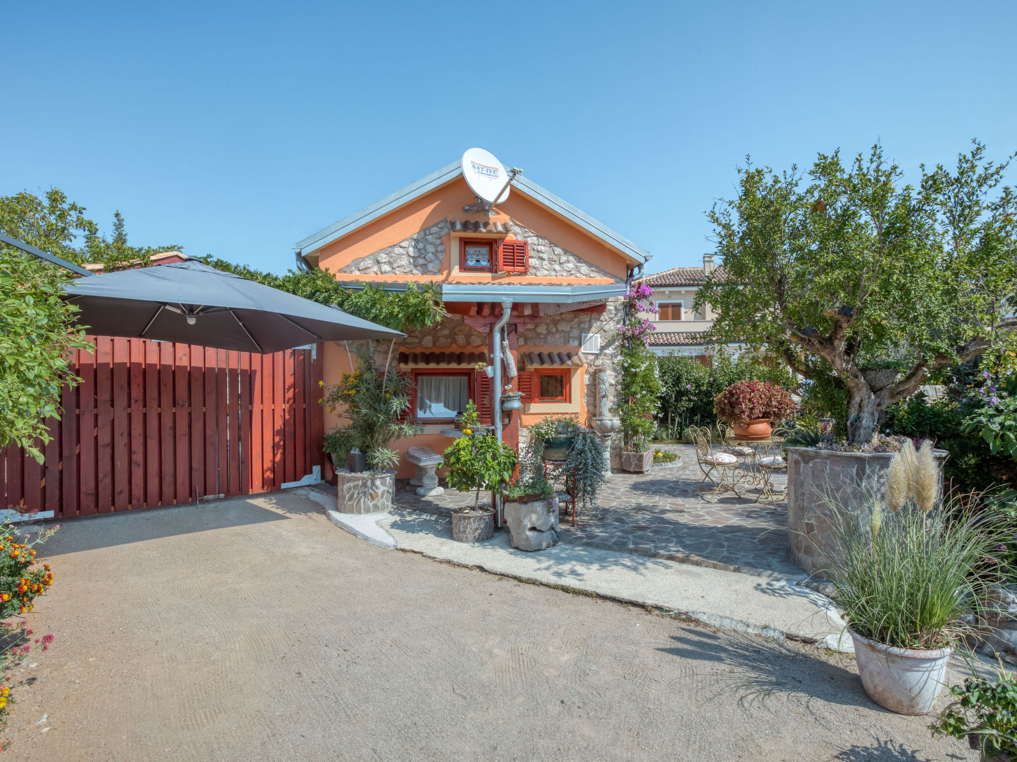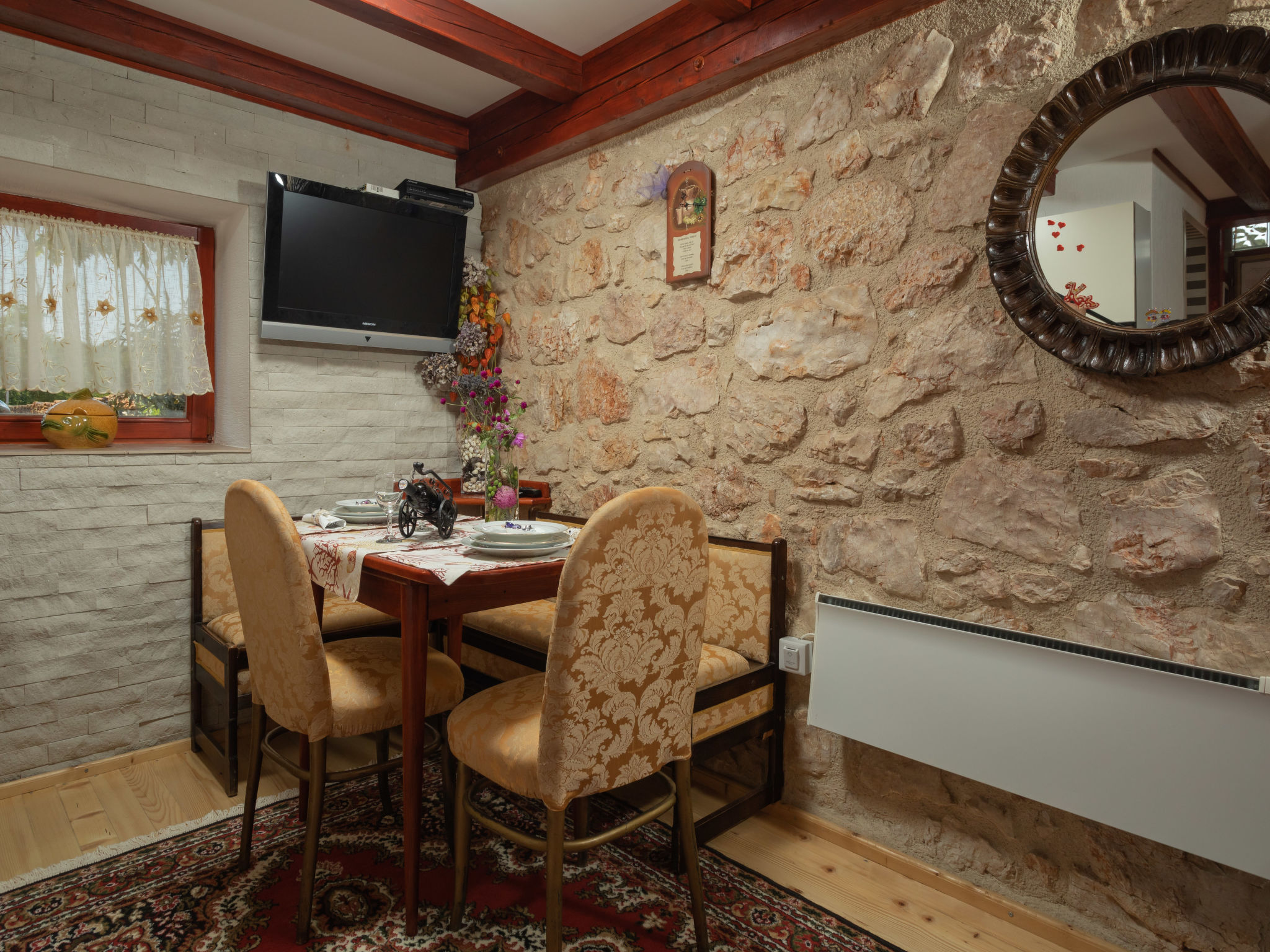 Das 2015 restaurierte Haus MARIA, ein Natursteinhaus, steht im kleinen Ort Polje, 13 km von Malinska mit Supermarkt entfernt. Nächste Einkaufsmöglichkeit ca. 400 m. Meer 2,5 km. Fels-/Kiesstrand sowie kleiner Sandstrand, jeweils 3,5 km. Soline 4 km. Krk Stadt 18 km. Das Ferienhaus steht zusammen mit dem Haus des Besitzers auf einem abgeschlossenen, ca. 500 m² großen, gepflegten Grundstück mit Olivenbäumen, Ziersträuchern, Blumen und abschließbarem Einfahrtstor. Zum Ferienhaus gehört ein eigener kleiner Grundstücksanteil (ca. 50 m²) mit gefliester, teilüberdachter Terrasse, Gartenmöbeln, Steintisch und Bänken sowie transportablem Grill. 2 Parkmöglichkeiten auf dem Grundstück des Vermieters. Gemütliche, feriengerechte Einrichtung. Rustikale Wohnatmosphäre durch sichtbare Natursteinwände und Holzbalkendecken. Fliesen- und Holzdielenboden. Sat-TV (deutsche Programme). Internetzugang (WLAN, inklusive). Klimaanlage mit Kühl-/Heizfunktion im Schlafzimmer. Elektro-Zustellheizung im Wohnraum. Hinweis: Rauchen ist im Haus nicht gestattet.