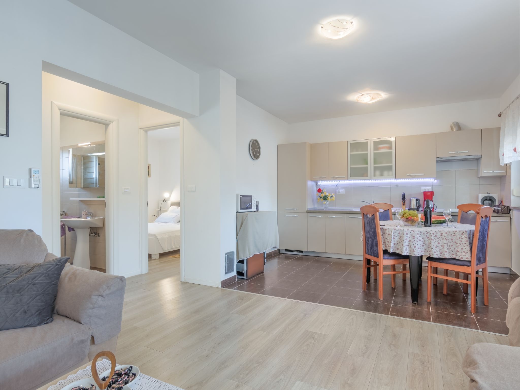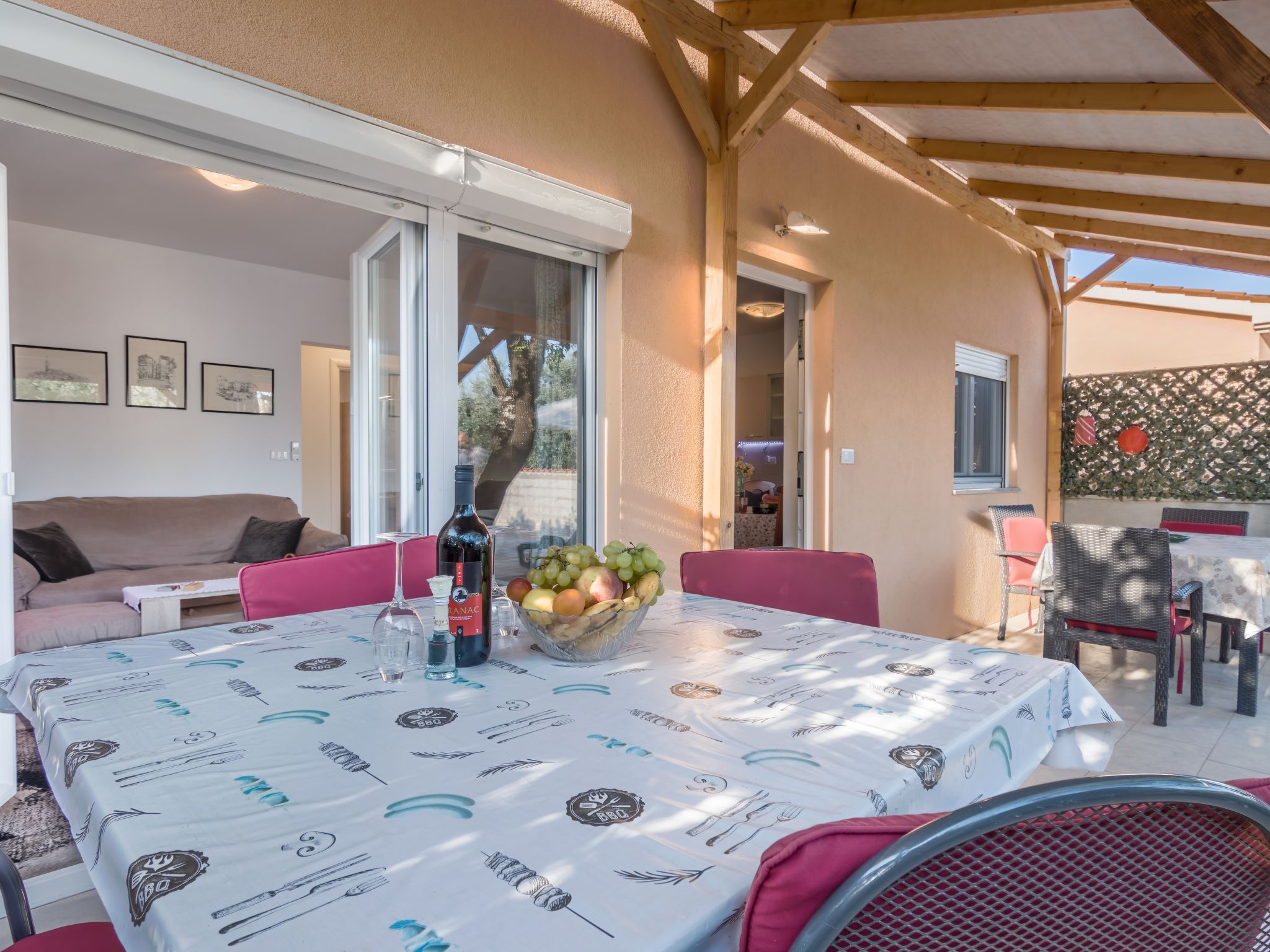 3-Zimmer-Haus 64 m2. Wohn-/Esszimmer mit 1 Diwanbett und Sat-TV (Flachbildschirm), Klimaanlage. Ausgang zur Terrasse. 2 Zimmer, jedes Zimmer mit 1 franz. Bett (160 cm). Offene Küche (Backofen, 4 Glaskeramikherd Platten, Toaster, Wasserkocher, Mikrowelle, Tiefkühler, elektrische Kaffeemaschine). Dusche/WC. Liegestühle (2). Zur Verfügung: Bügeleisen, Babybett. Internet (Wireless LAN, gratis). Bitte beachten: Nichtraucher-Haus. Maximal 2 Haustiere/Hunde erlaubt.