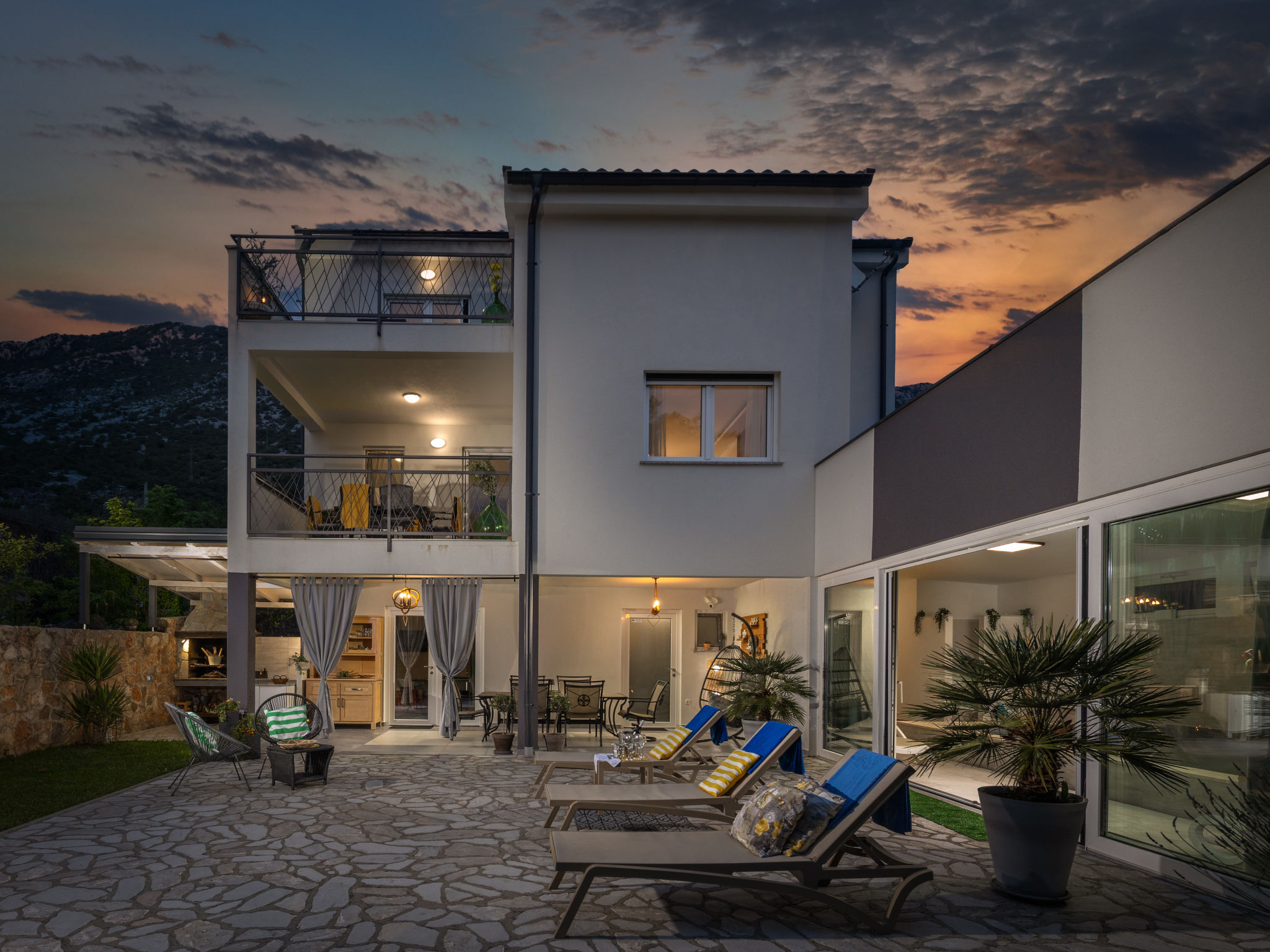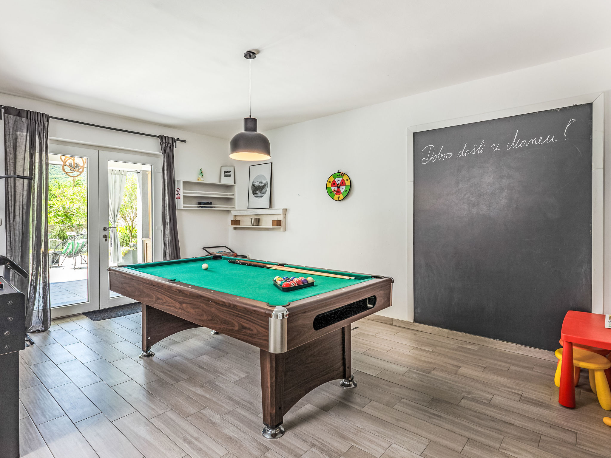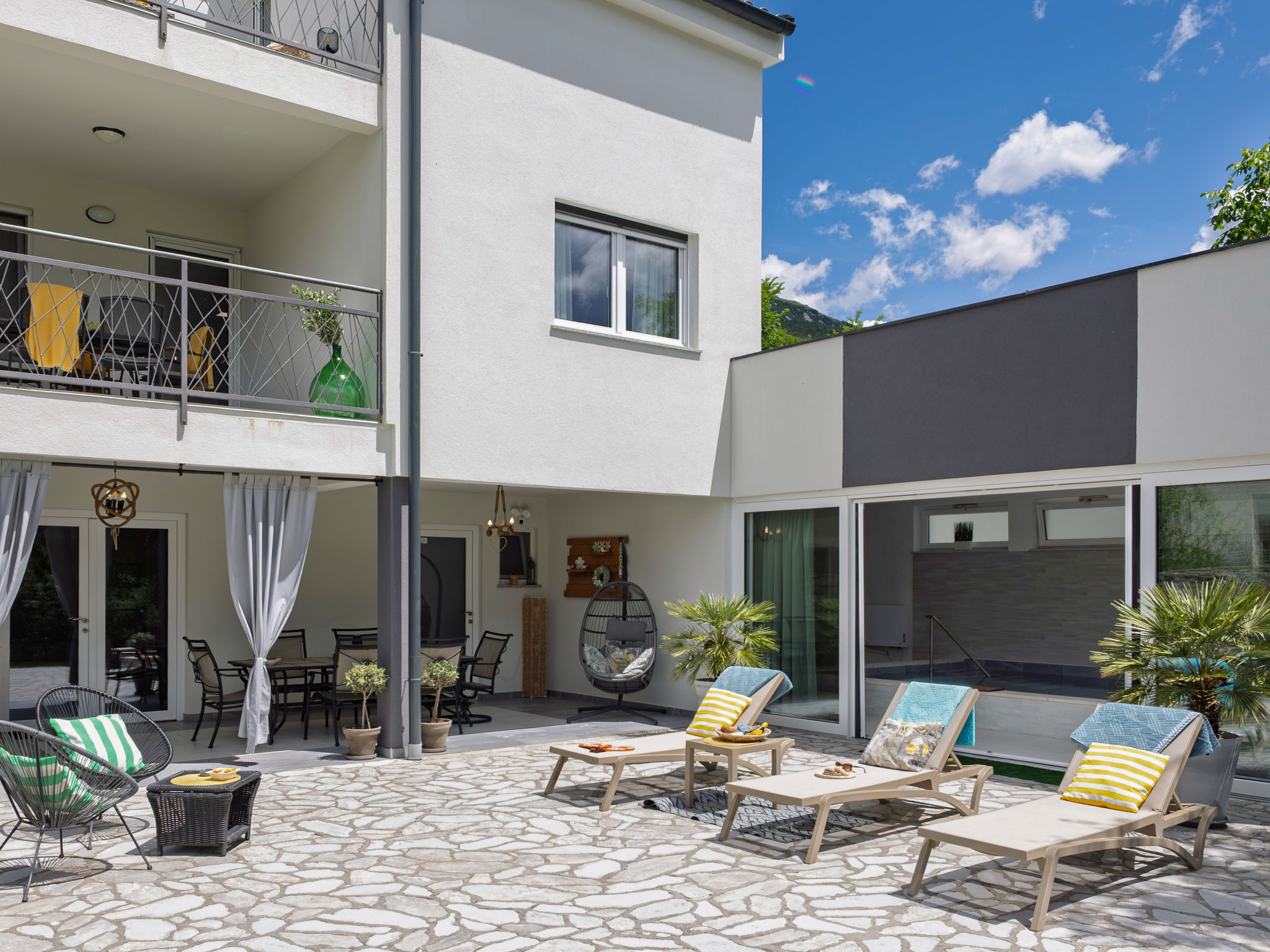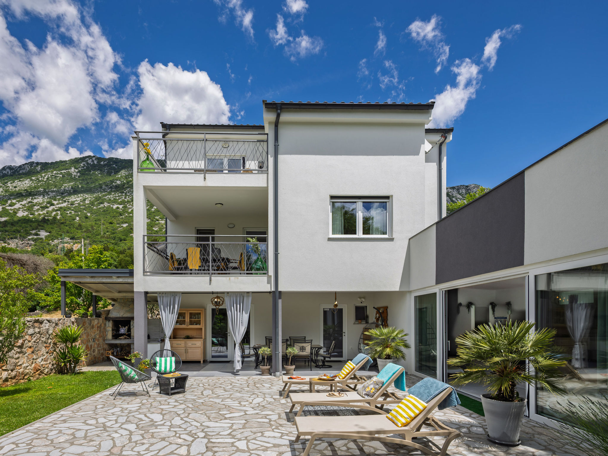 Tribalj: Einfamilienhaus "Manea", auf 3 Stockwerken, Baujahr 2018. 800 m vom Zentrum von Tribalj, 7 km vom Zentrum von Crikvenica, ruhige, sonnige Lage, 7 km vom Meer, im Grünen. Zur Alleinbenutzung: Grundstück 600 m2 (eingezäunt), Pflanzen, Hallenbad eckig, beheizt (7 x 4 m, 135 cm tief, 01.01.-31.12.) mit Innentreppe. Terrasse (100 m2), Gartenmöbel, Grill. Im Hause: Internetzugang, Sauna, Wellnessbereich, Tischfussball, Alarmanlage, Waschmaschine, Wäschetrockner. Zur Verfügung: Fahrräder (4). Parkplatz (für 3 Autos) beim Haus auf dem Grundstück. Einkaufsgeschäft 750 m, Restaurant 7 km, Sandstrand 7 km, Kieselstrand 7 km, Strandbad 7 km. Nahe gelegene Sehenswürdigkeiten: Tribaljsko jezero 100 m. Jugendgruppen nur auf Anfrage. Von Gruppen junger Leute wird ein doppeltes Pfand verlangt bei der Ankunft. Schwimmbad mit Hydromassage. Es ist notwendig 7 Tage im Voraus bekannt zu geben, ob die Schwimmbadheizung eingeschaltet werden soll. Der Eigentümer kann die Lieferung von Fertiggerichten, Lebensmitteln und andreren Haushaltsgegenständen arrangieren (auf Anfrage, extra). Desinfektionsmittel und OP-Masken im Objekt erhältlich.
