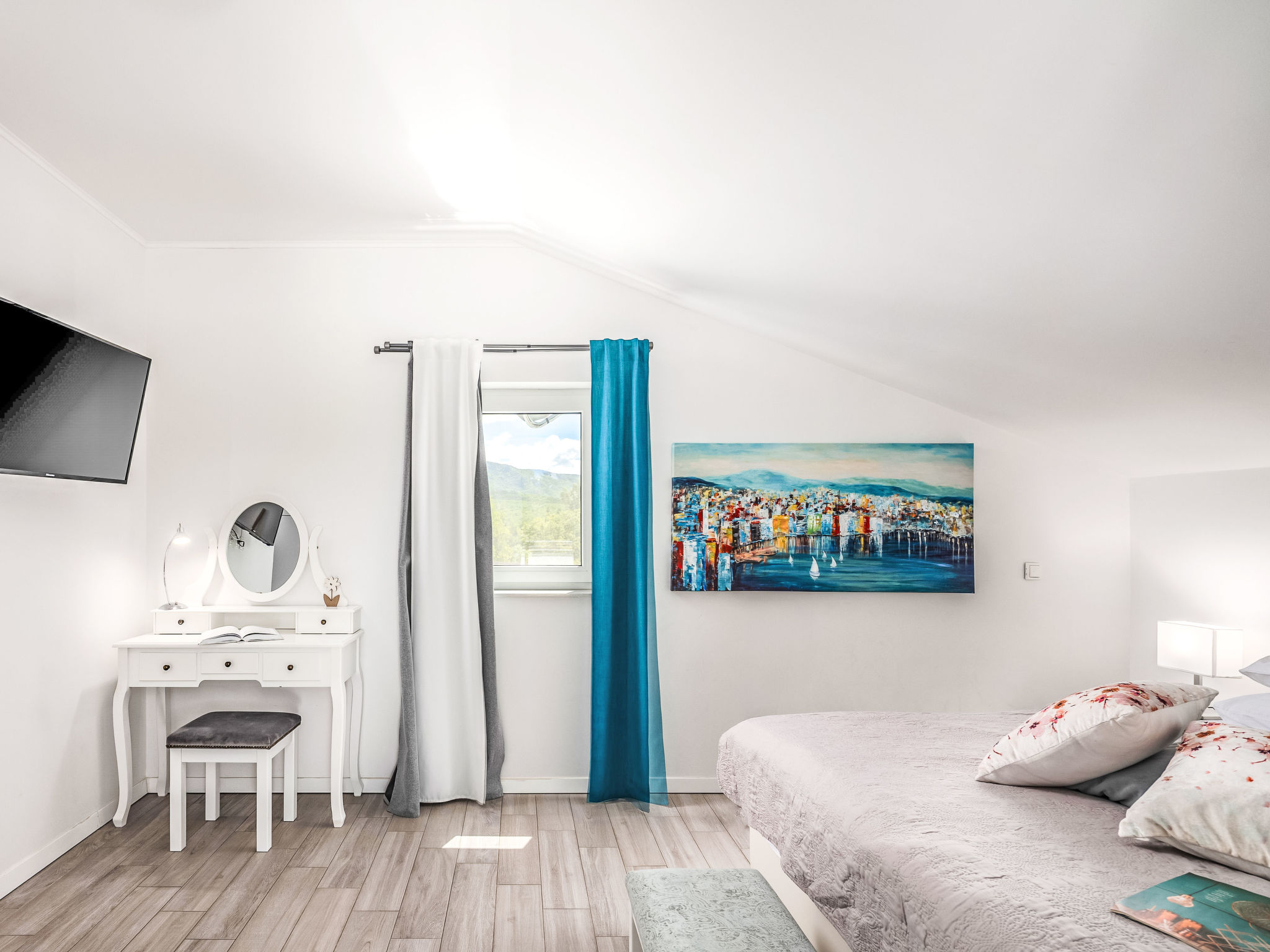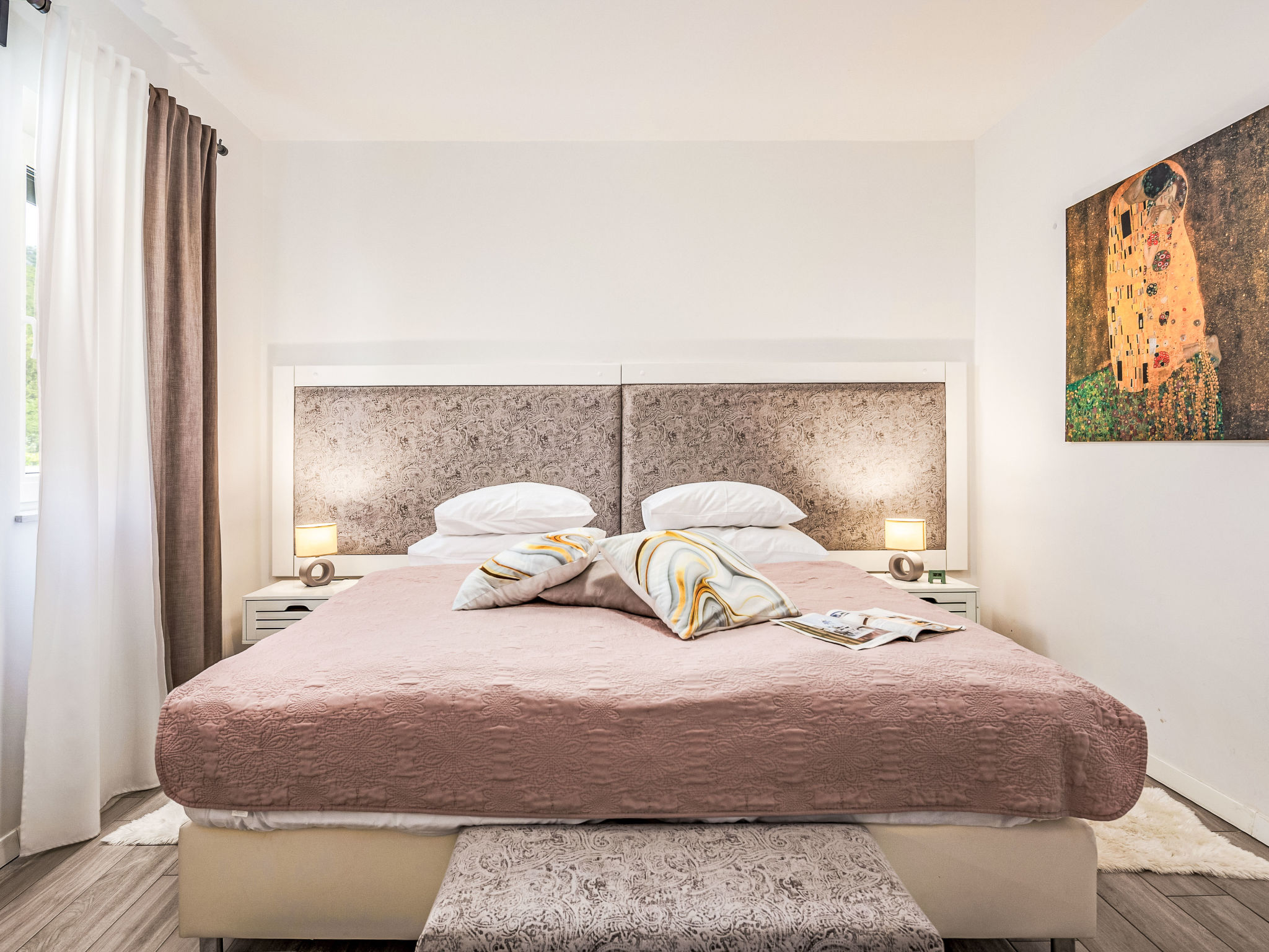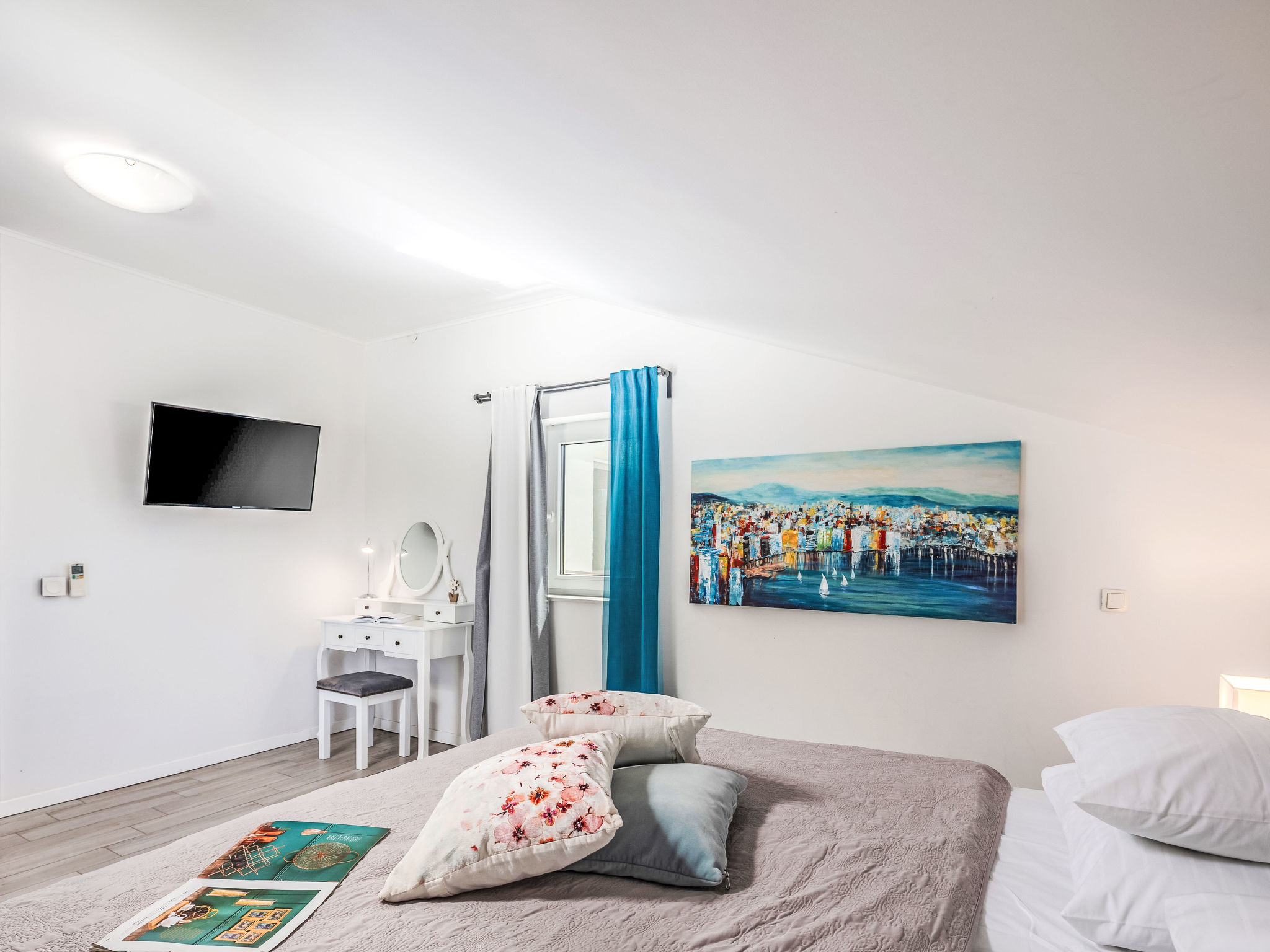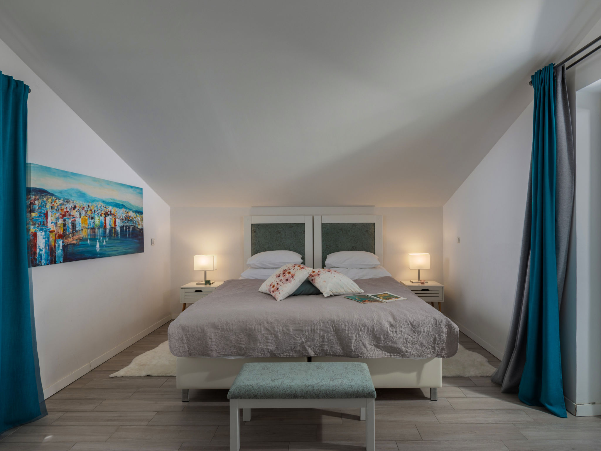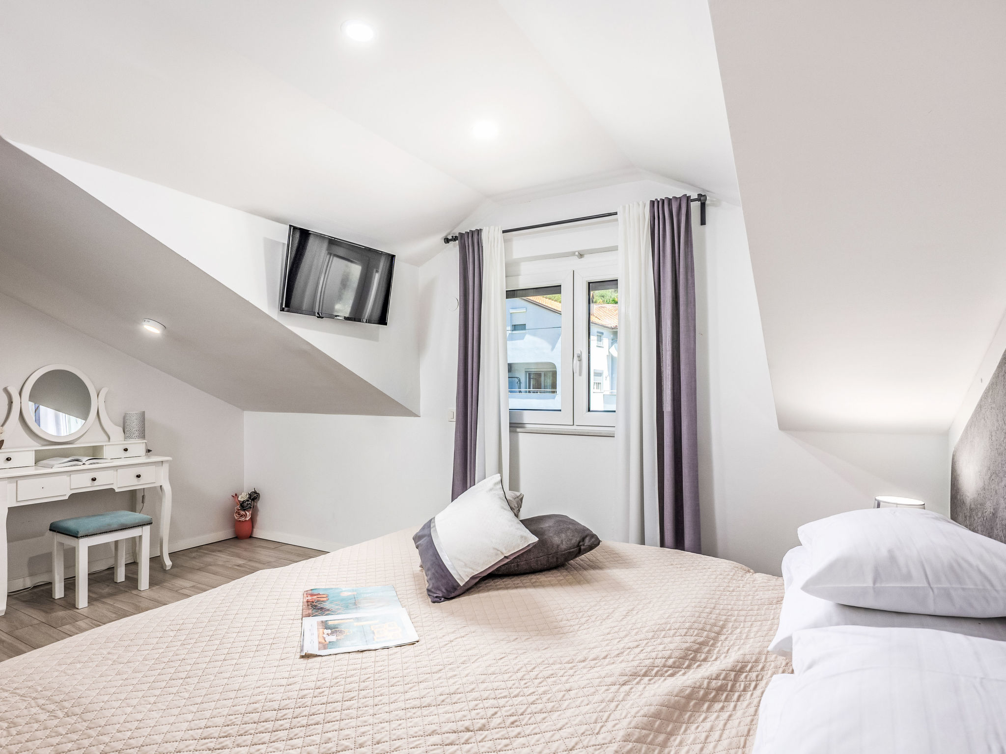 6-Zimmer-Haus 400 m2 auf 3 Stockwerken, Südlage. Schön und modern eingerichtet: Billardzimmer mit Klimaanlage. Ausgang zur Terrasse. Dusche, sep. WC. Obergeschoss: Wohn-/Esszimmer mit Sat-TV (Flachbildschirm). Ausgang zur Terrasse. 1 Zimmer mit 1 Doppelbett (2 x 90 cm, Länge 210 cm), Bad/WC und Klimaanlage. Offene Küche (Backofen, Geschirrspüler, 4 Induktionskochplatten, Mikrowelle, Tiefkühler, elektrische Kaffeemaschine). Sep. WC. 2. Obergeschoss: 1 abgeschrägtes Zimmer, Deckenhöhe 150 - 255 cm mit 1 Doppelbett (2 x 90 cm, Länge 210 cm), Dusche/WC und Sat-TV (Flachbildschirm), Klimaanlage. Ausgang zur Terrasse. 1 Zimmer mit 1 Doppelbett (2 x 90 cm, Länge 210 cm), Dusche/WC und Sat-TV (Flachbildschirm), Klimaanlage. Ausgang zur Terrasse. 1 abgeschrägtes Zimmer, Deckenhöhe 110 - 255 cm mit 1 Doppelbett (2 x 90 cm, Länge 210 cm), Dusche/WC und Sat-TV (Flachbildschirm), Klimaanlage. Bodenheizung (extra). Terrasse 12 m2, überdacht, Terrasse 12 m2. Terrassenmöbel, Liegestühle, Abstellkammer. Sicht auf den See. Zur Verfügung: Safe, Kinderhochstuhl, Babybett, Haartrockner. Internet (Wireless LAN, gratis).
