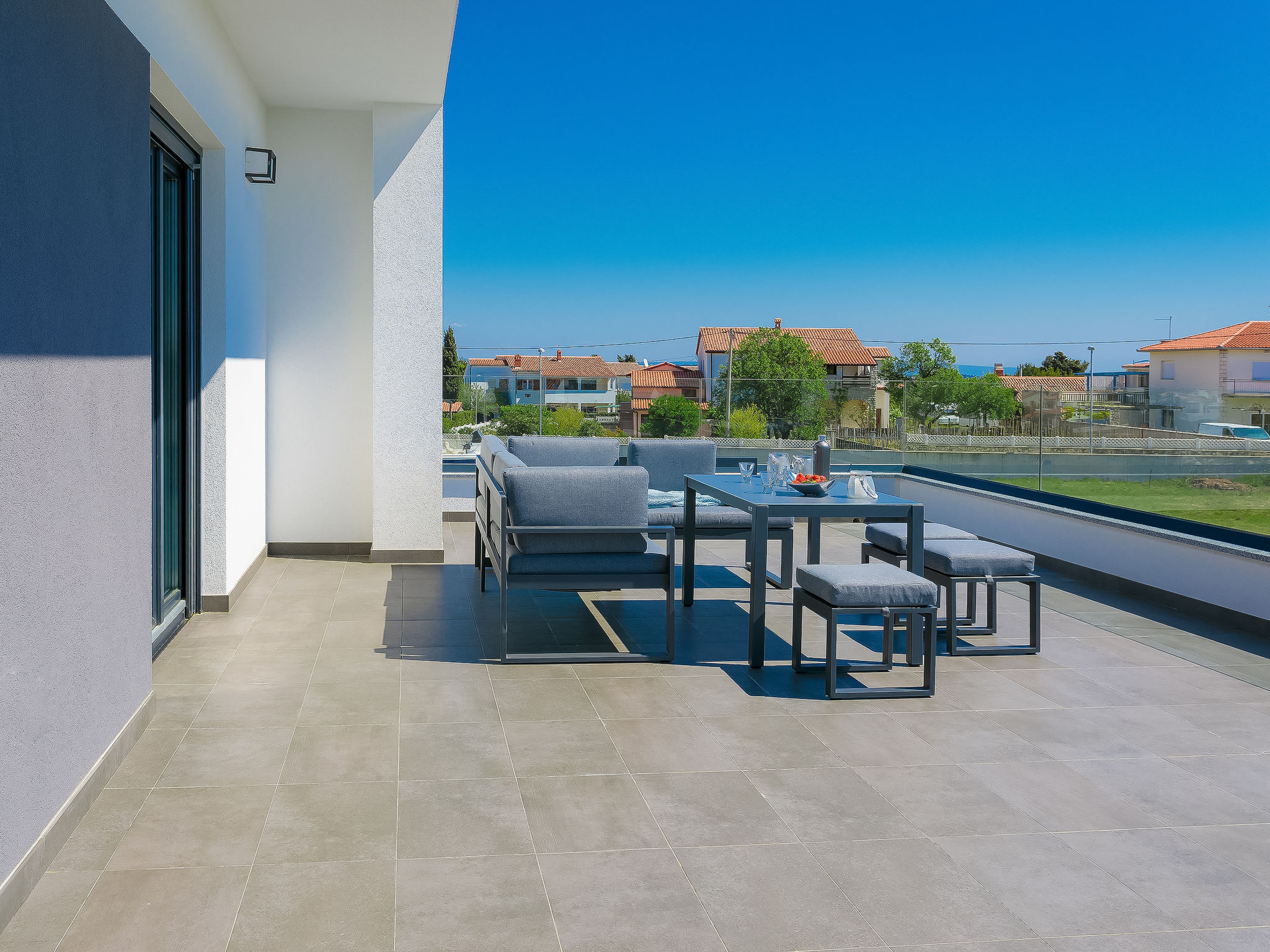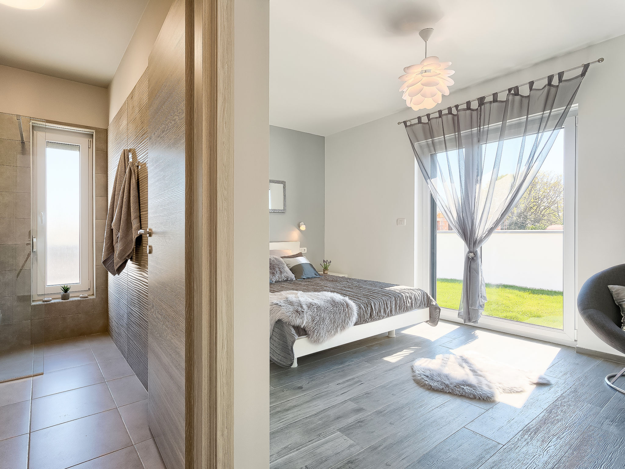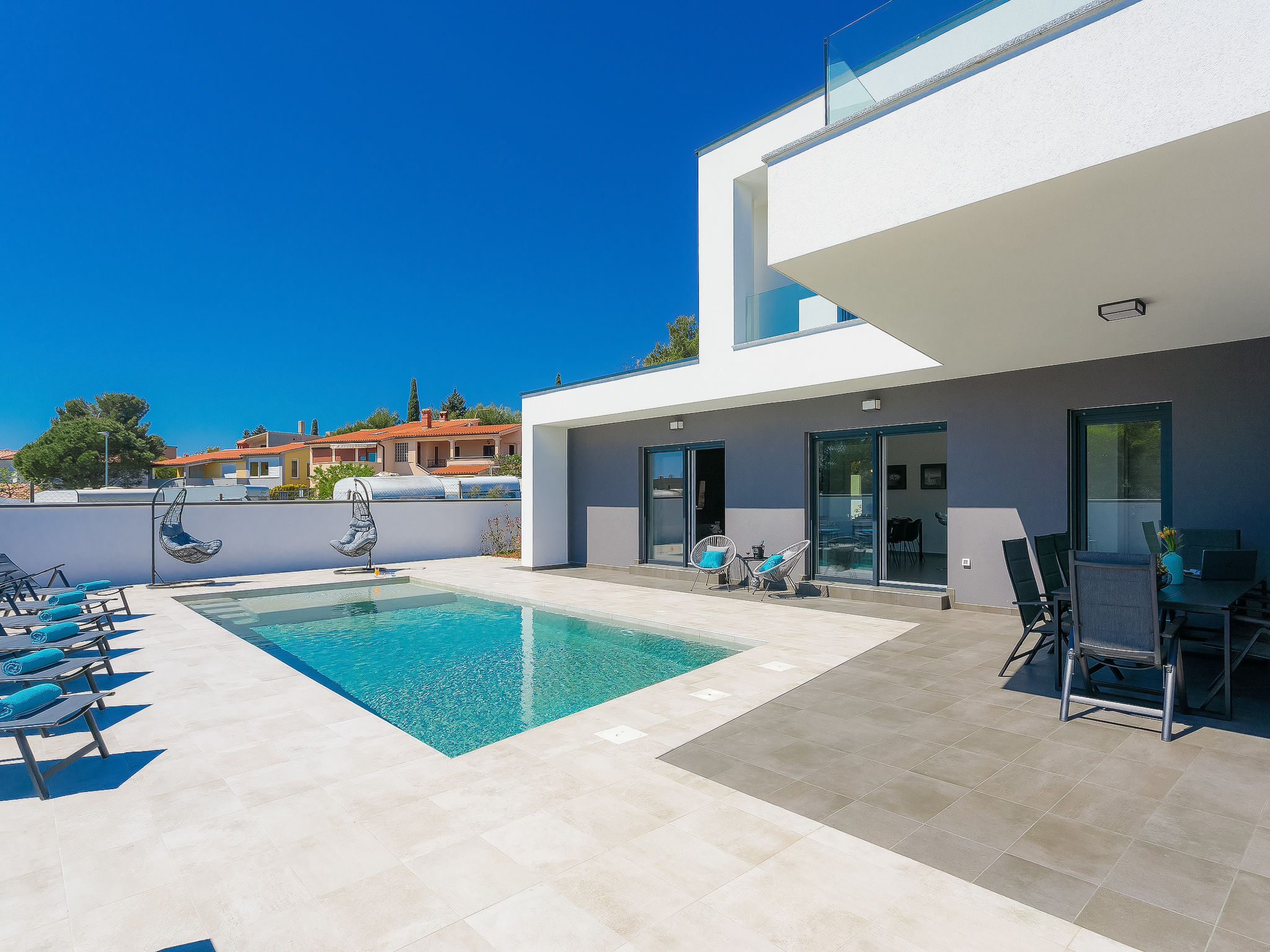 Premantura 11 km von Pula: Schöne Villa "Ella Premantura", auf 2 Stockwerken, Baujahr 2018. 250 m vom Zentrum von Premantura, sonnige Lage, 500 m vom Meer, 500 m vom Strand. Zur Alleinbenutzung: Grundstück 600 m2 (eingezäunt), schöner Garten mit Rasen, Schwimmbad eckig (8 x 4 m, 140 cm tief, 04.04.-10.10.) mit Innentreppe. Aussendusche, Grill. Im Hause: Internetzugang, Waschmaschine. Parkplatz (für 2 Autos) beim Haus auf dem Grundstück. Einkaufsgeschäft 250 m, Supermarkt 4.5 km, Restaurant 50 m, Kieselstrand 2.5 km, Felsstrand 500 m. Golfplatz 600 m, Surfschule 2.5 km, Tennis 750 m, Reitstall 10 km, Wanderwege ab Haus 100 m, Radweg 150 m. Nahe gelegene Sehenswürdigkeiten: Nature park Kamenjak 650 m. Jugendgruppen nur auf Anfrage. Die Nachbarschaft ist sehr lärmempfindlich. Ruhe und gutes Benehmen wird erwartet. Schwimmbad mit Hydromassage.