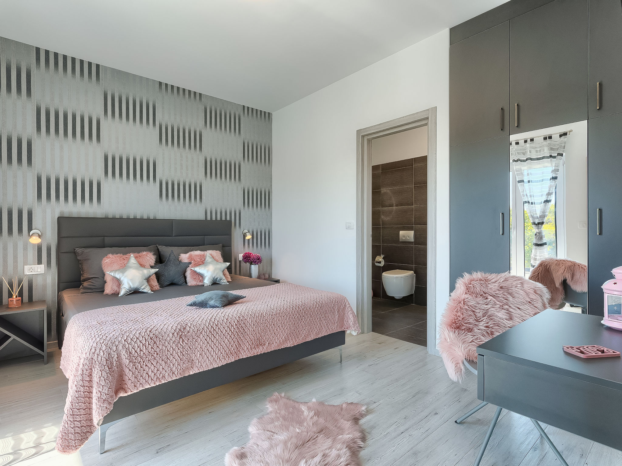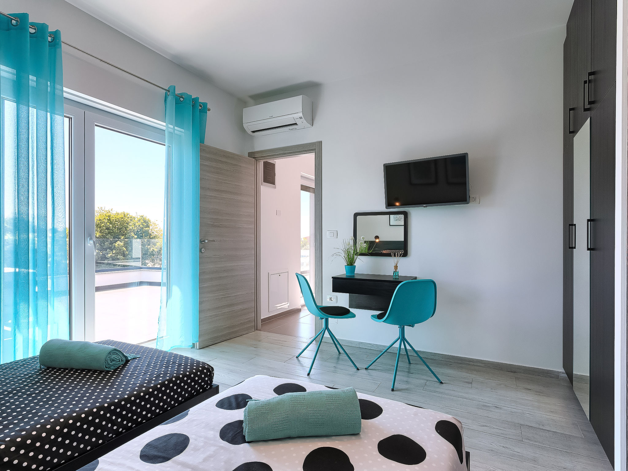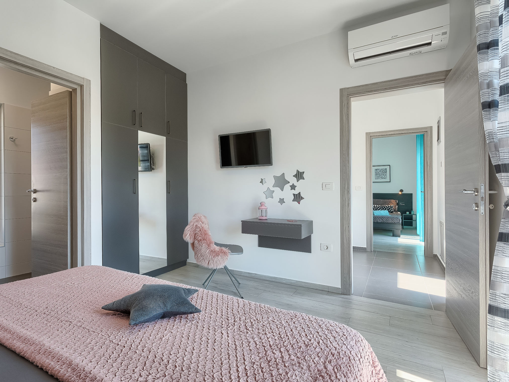 4-Zimmer-Villa 170 m2 auf 2 Stockwerken. Modern eingerichtet: Wohn-/Esszimmer mit Sat-TV (Flachbildschirm), Klimaanlage. Ausgang zur Terrasse, zum Schwimmbad. 1 Zimmer mit 1 franz. Bett (180 cm, Länge 200 cm), Dusche/WC und Sat-TV (Flachbildschirm), Klimaanlage. Ausgang zum Garten. Offene Küche (Backofen, Geschirrspüler, 4 Glaskeramikherd Platten, Mikrowelle, Tiefkühler, elektrische Kaffeemaschine). Sep. WC. Obergeschoss: 1 Zimmer mit 1 franz. Bett (180 cm, Länge 200 cm), Dusche/WC und Sat-TV (Flachbildschirm), Klimaanlage. Ausgang zur Terrasse. 1 Zimmer mit 2 Betten (90 cm, Länge 200 cm), Dusche/WC und Sat-TV (Flachbildschirm), Klimaanlage. Ausgang zur Terrasse. Terrasse 17 m2 teilweise überdacht, Terrasse 30 m2. Terrassenmöbel, Liegestühle. Zur Verfügung: Safe, Kinderhochstuhl, Babybett, Haartrockner. Internet (Wireless LAN, gratis).