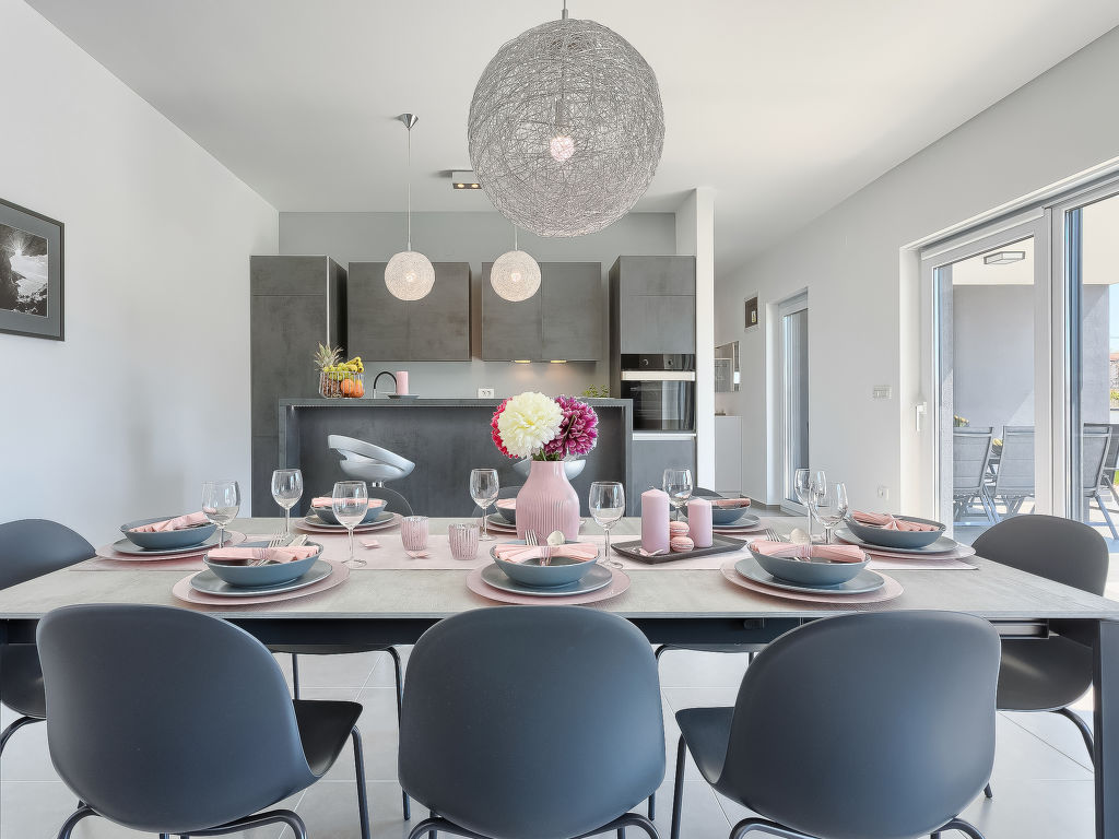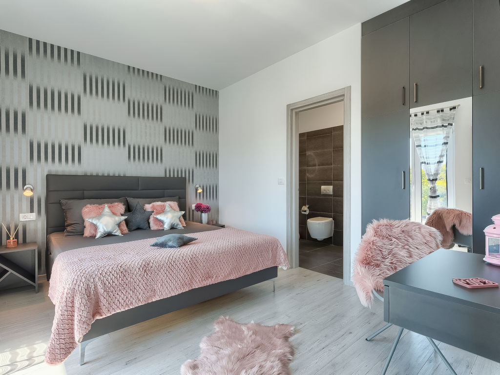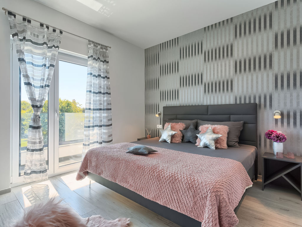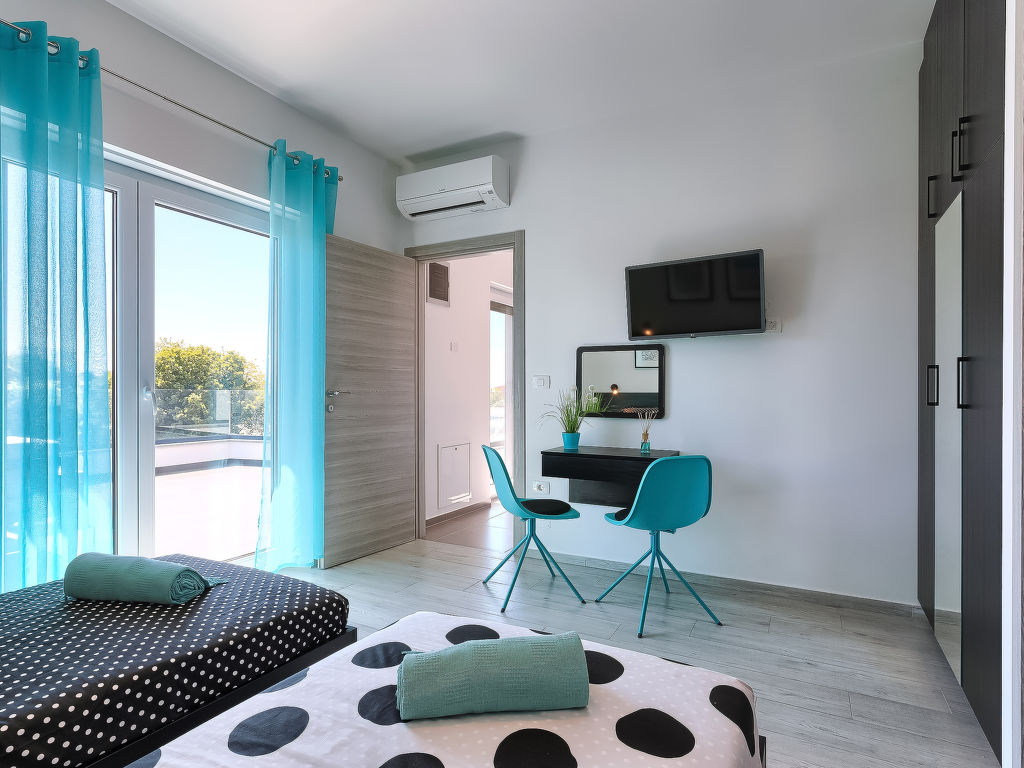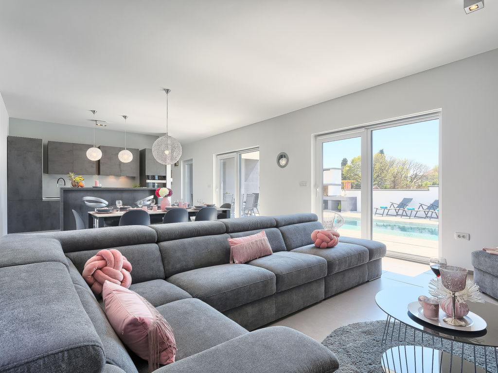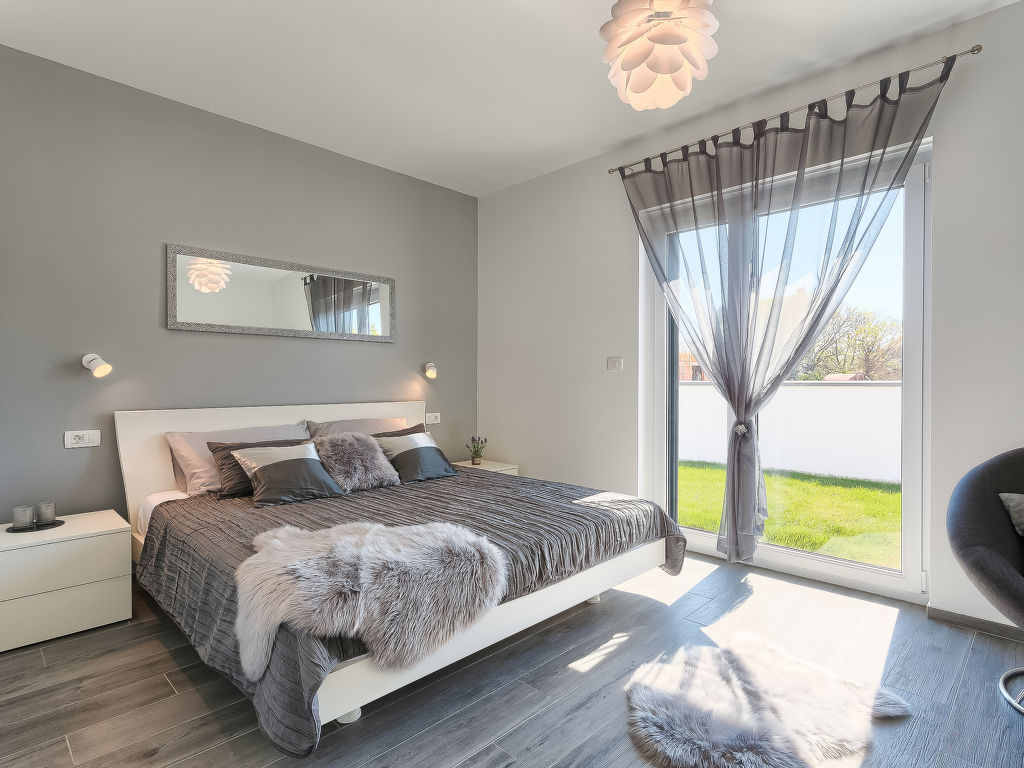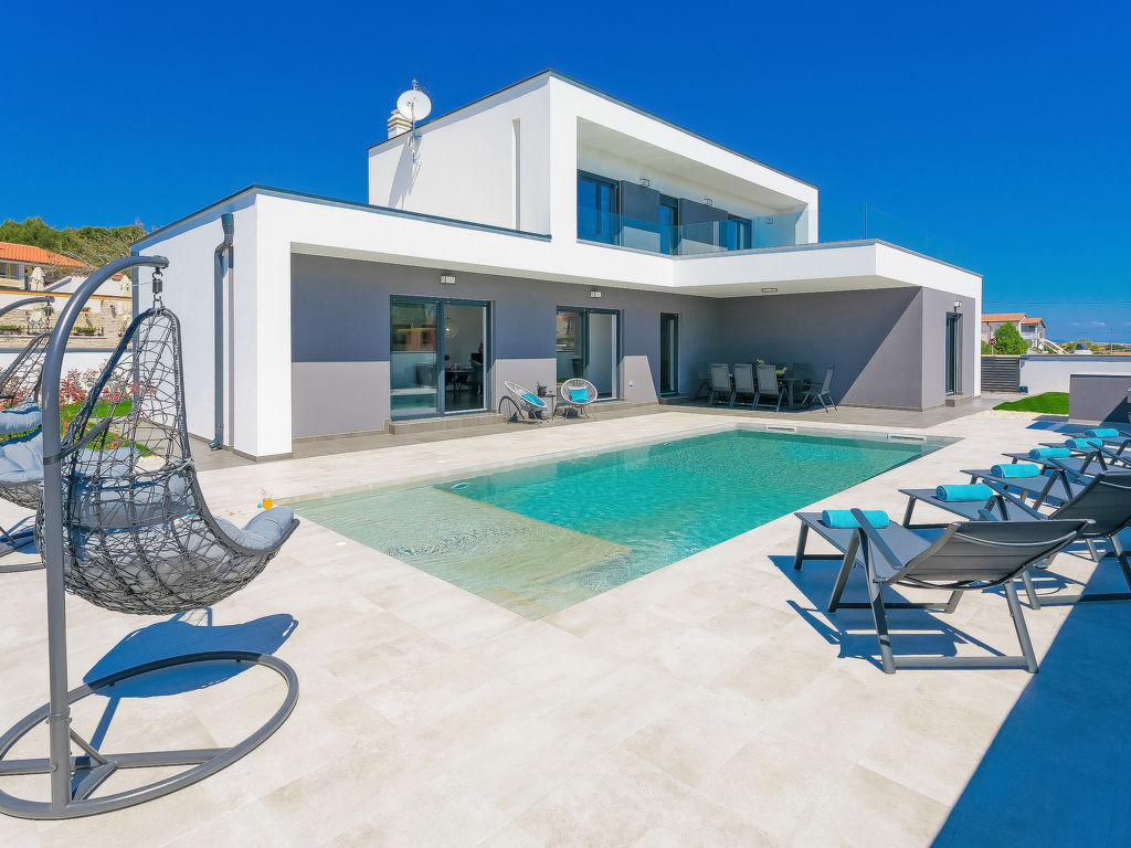 Premantura 11 km von Pula: Schöne Villa "Ella Premantura", auf 2 Stockwerken, Baujahr 2018. 250 m vom Zentrum von Premantura, sonnige Lage, 500 m vom Meer, 500 m vom Strand. Zur Alleinbenutzung: Grundstück 600 m2 (eingezäunt), schöner Garten mit Rasen, Schwimmbad eckig (8 x 4 m, 140 cm tief, 04.04.-10.10.) mit Innentreppe. Aussendusche, Grill. Im Hause: Internetzugang, Waschmaschine. Parkplatz (für 2 Autos) beim Haus auf dem Grundstück. Einkaufsgeschäft 250 m, Supermarkt 4.5 km, Restaurant 50 m, Kieselstrand 2.5 km, Felsstrand 500 m. Golfplatz 600 m, Surfschule 2.5 km, Tennis 750 m, Reitstall 10 km, Wanderwege ab Haus 100 m, Radweg 150 m. Nahe gelegene Sehenswürdigkeiten: Nature park Kamenjak 650 m. Jugendgruppen nur auf Anfrage. Die Nachbarschaft ist sehr lärmempfindlich. Ruhe und gutes Benehmen wird erwartet. Schwimmbad mit Hydromassage.