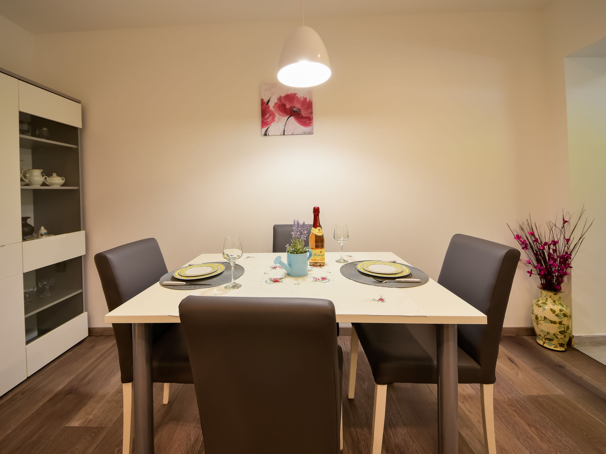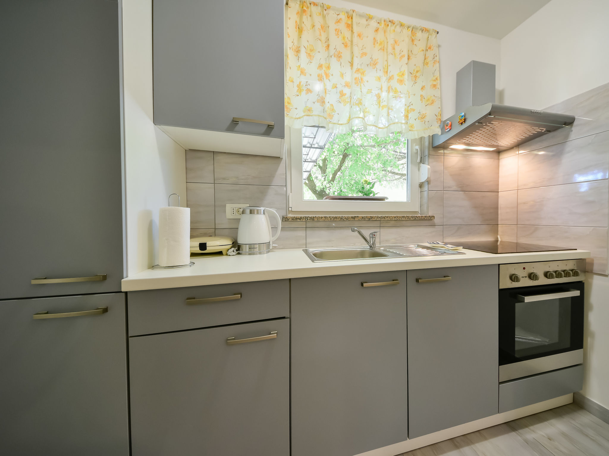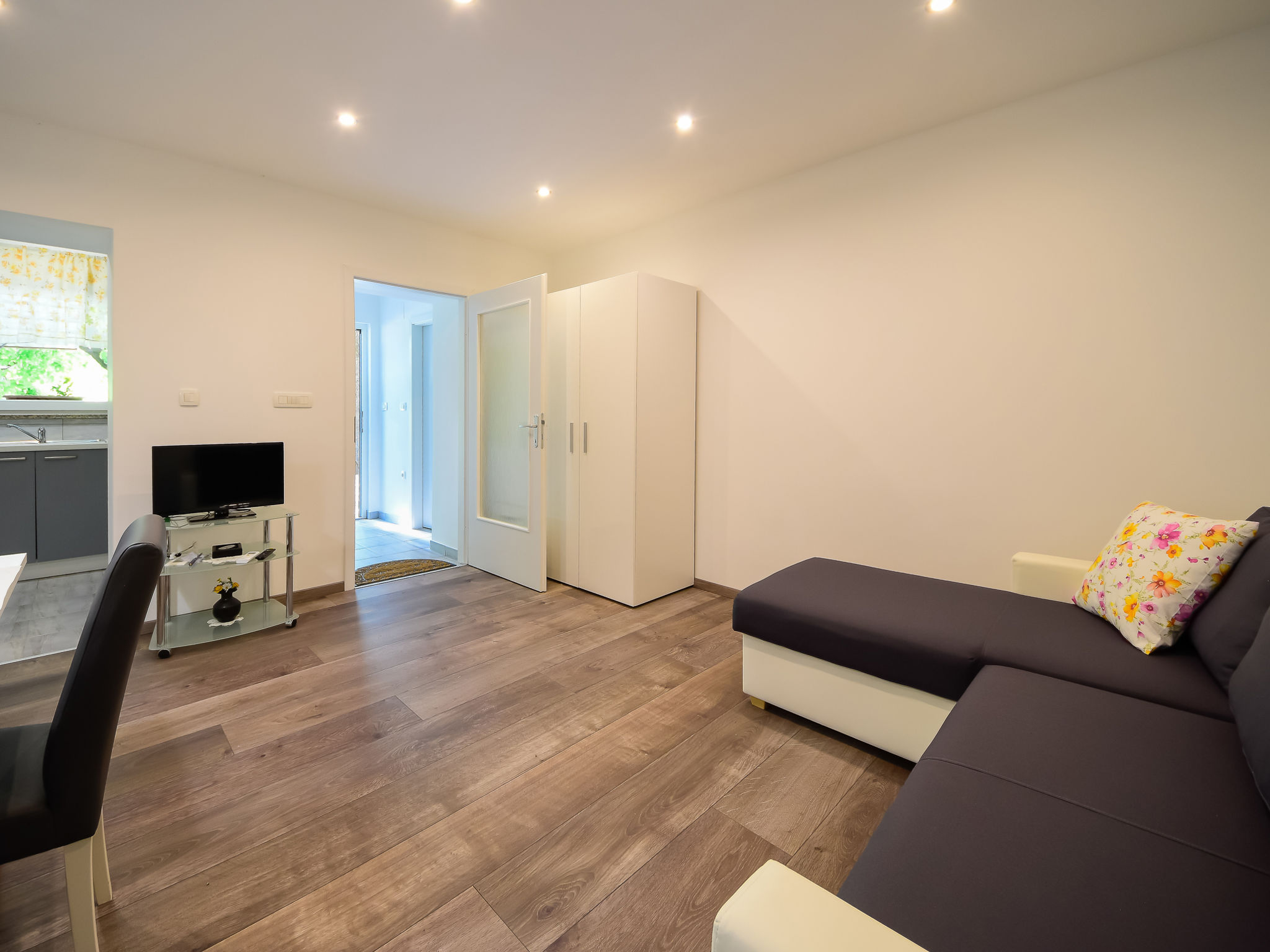 1-Zimmer-Wohnung 30 m2, im Erdgeschoss, Südlage. Studio mit 1 Doppeldiwanbett (140 cm, Länge 200 cm), Esstisch und Sat-TV (Flachbildschirm), Klimaanlage. Offene Küche (Backofen, 4 Glaskeramikherd Platten, elektrische Kaffeemaschine). Dusche/WC. Zur Verfügung: Internet (Wireless LAN, gratis).