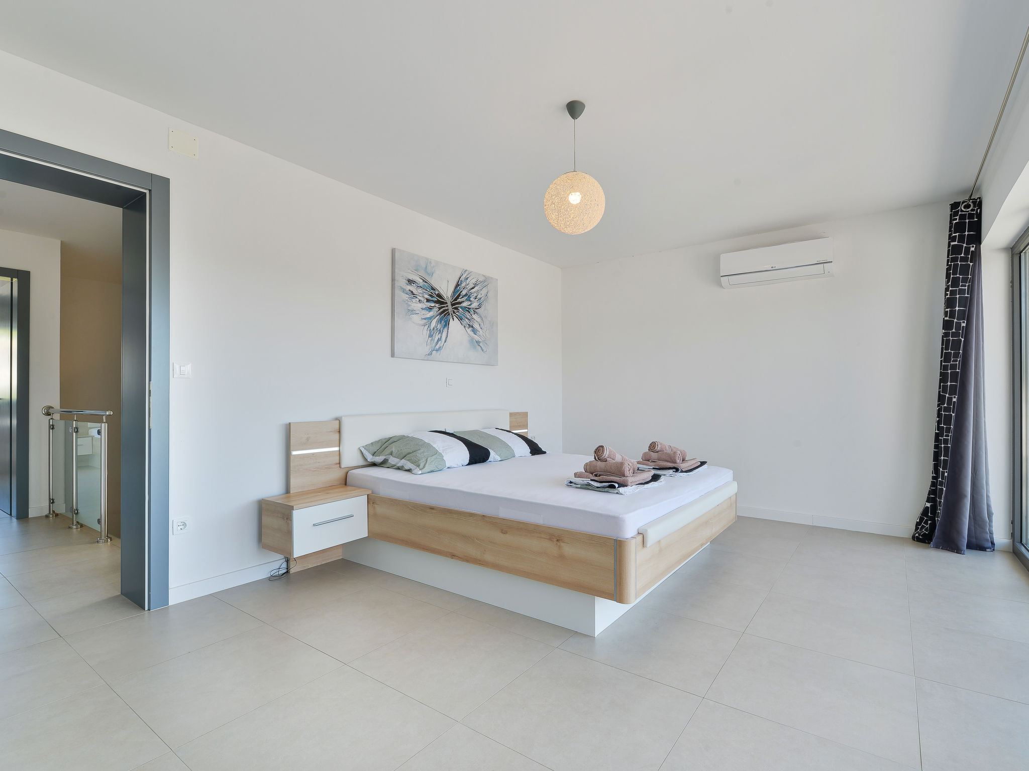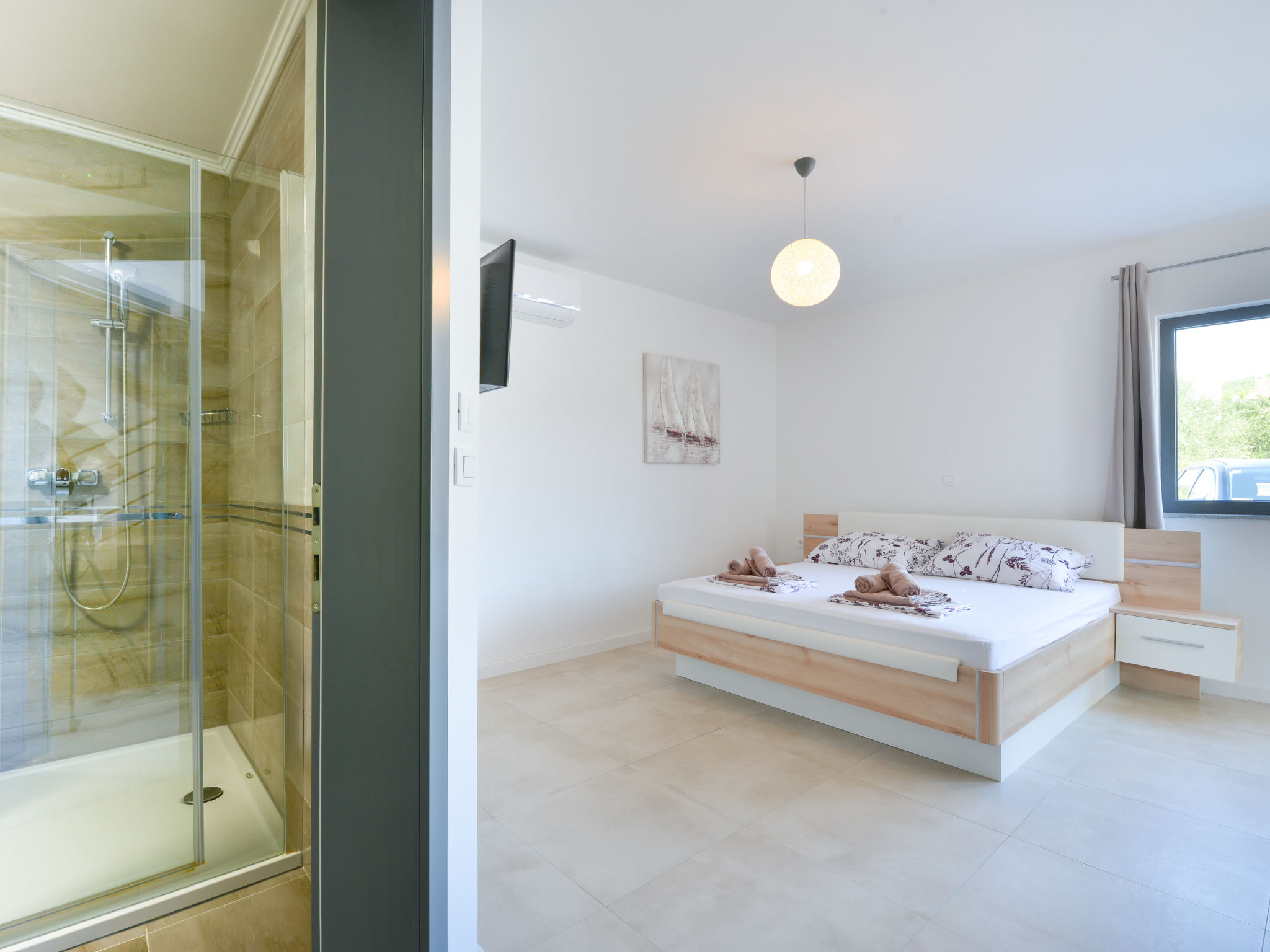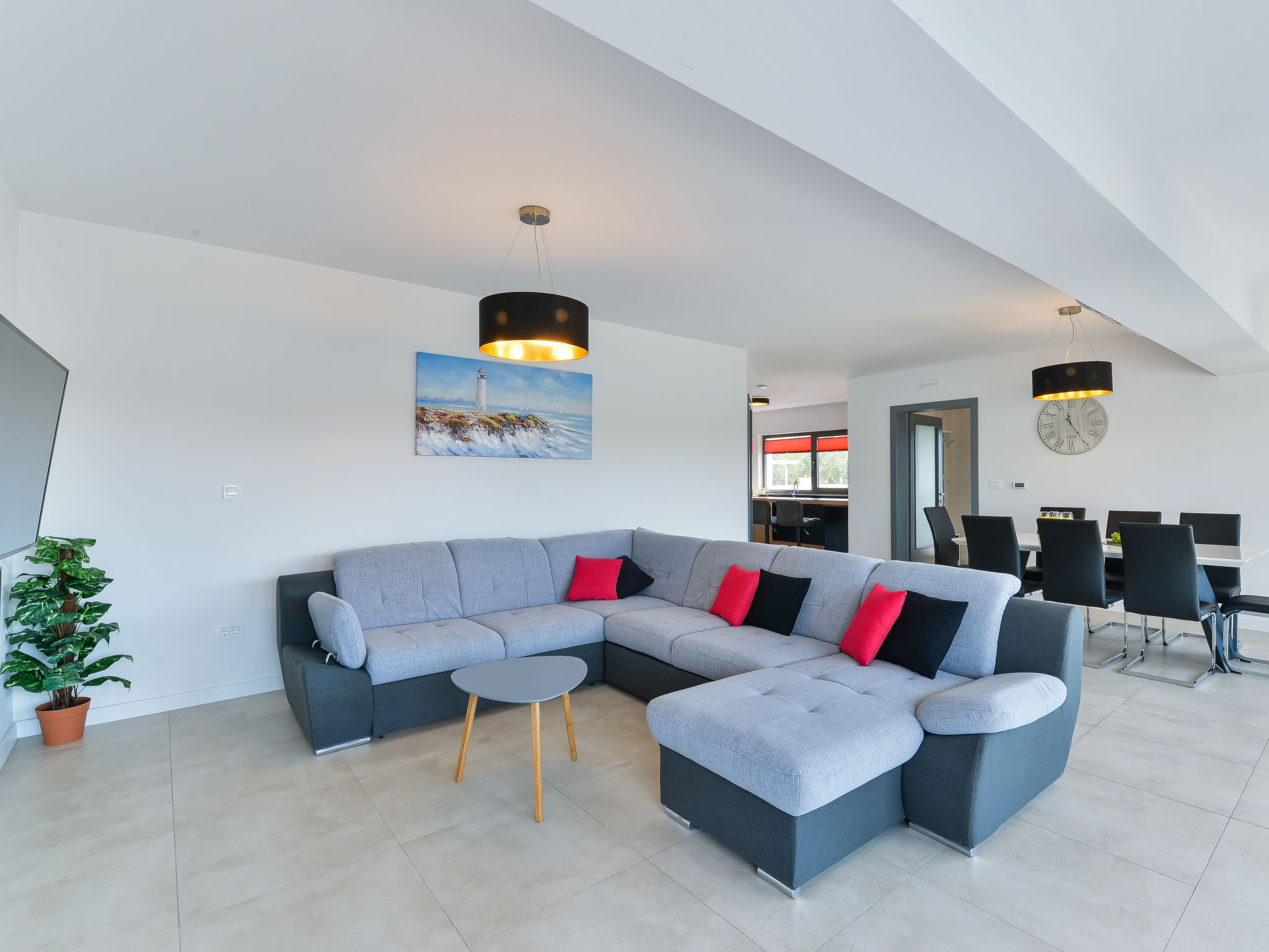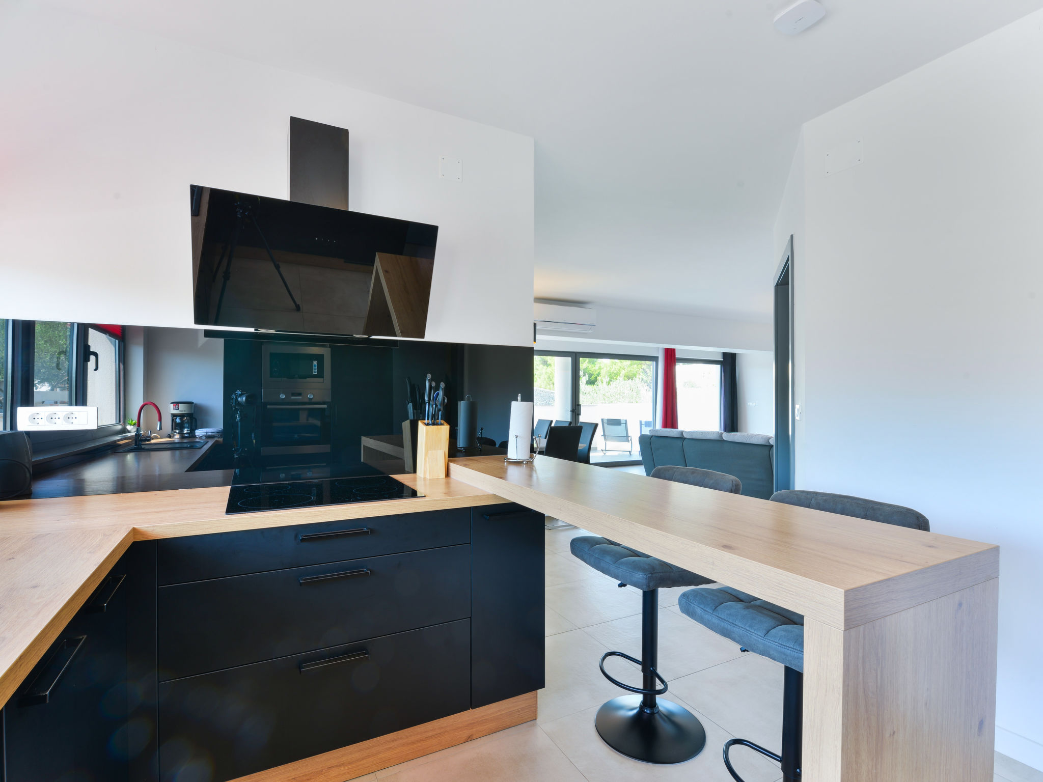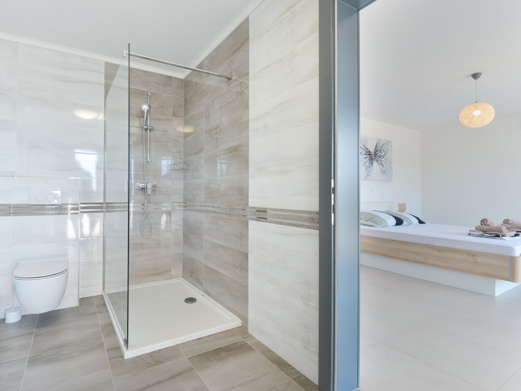 5-Zimmer-Doppelhaushälfte 260 m2 auf 2 Stockwerken, Südostlage. Modern eingerichtet: Wohn-/Esszimmer 45 m2 mit 1 Diwanbett (125 cm, Länge 220 cm), 1 Klappbett (80 cm, Länge 190 cm), Sat-TV (Flachbildschirm), Klimaanlage. Ausgang zur Terrasse. 1 Zimmer 20 m2 mit 1 franz. Bett (180 cm, Länge 200 cm), Dusche/WC und Sat-TV (Flachbildschirm), Klimaanlage. Ausgang zum Balkon. Offene Küche (Backofen, Geschirrspüler, 4 Glaskeramikherd Platten, Mikrowelle, Tiefkühler, elektrische Kaffeemaschine). Sep. WC. Obergeschoss: 2 Zimmer 20 m2, jedes Zimmer mit 1 franz. Bett (180 cm, Länge 200 cm), Dusche/WC und Sat-TV (Flachbildschirm), Klimaanlage. Ausgang zur Terrasse. 1 Zimmer 20 m2 mit 1 franz. Bett (180 cm, Länge 200 cm), Dusche/WC und Sat-TV (Flachbildschirm), Klimaanlage. Ausgang zum Balkon. Warmluftheizung. 2 Balkone 6 m2, Terrasse 80 m2 teilweise überdacht, Terrasse 38 m2, überdacht. Terrassenmöbel, Liegestühle. Sicht auf das Schwimmbad. Zur Verfügung: Safe, Bügeleisen, Babybett. Internet (Wireless LAN, gratis).