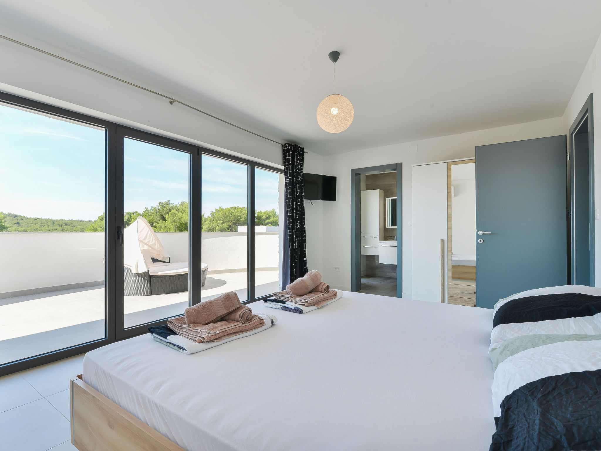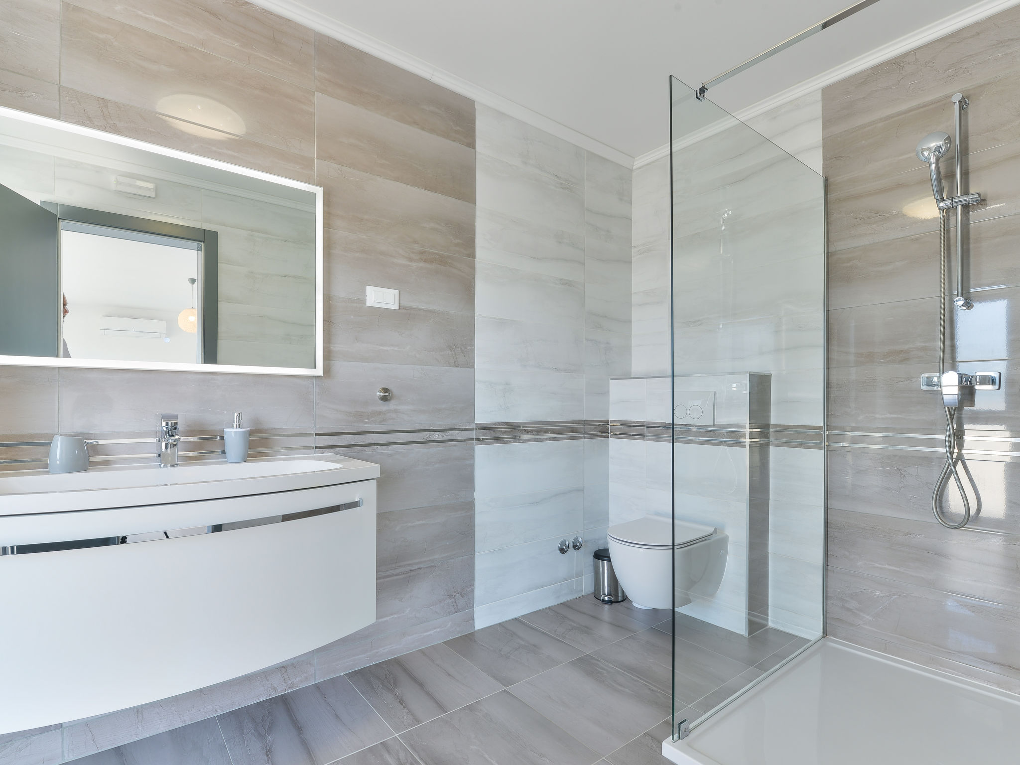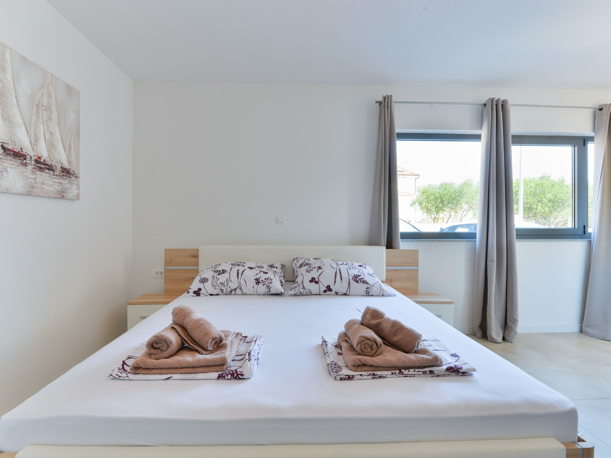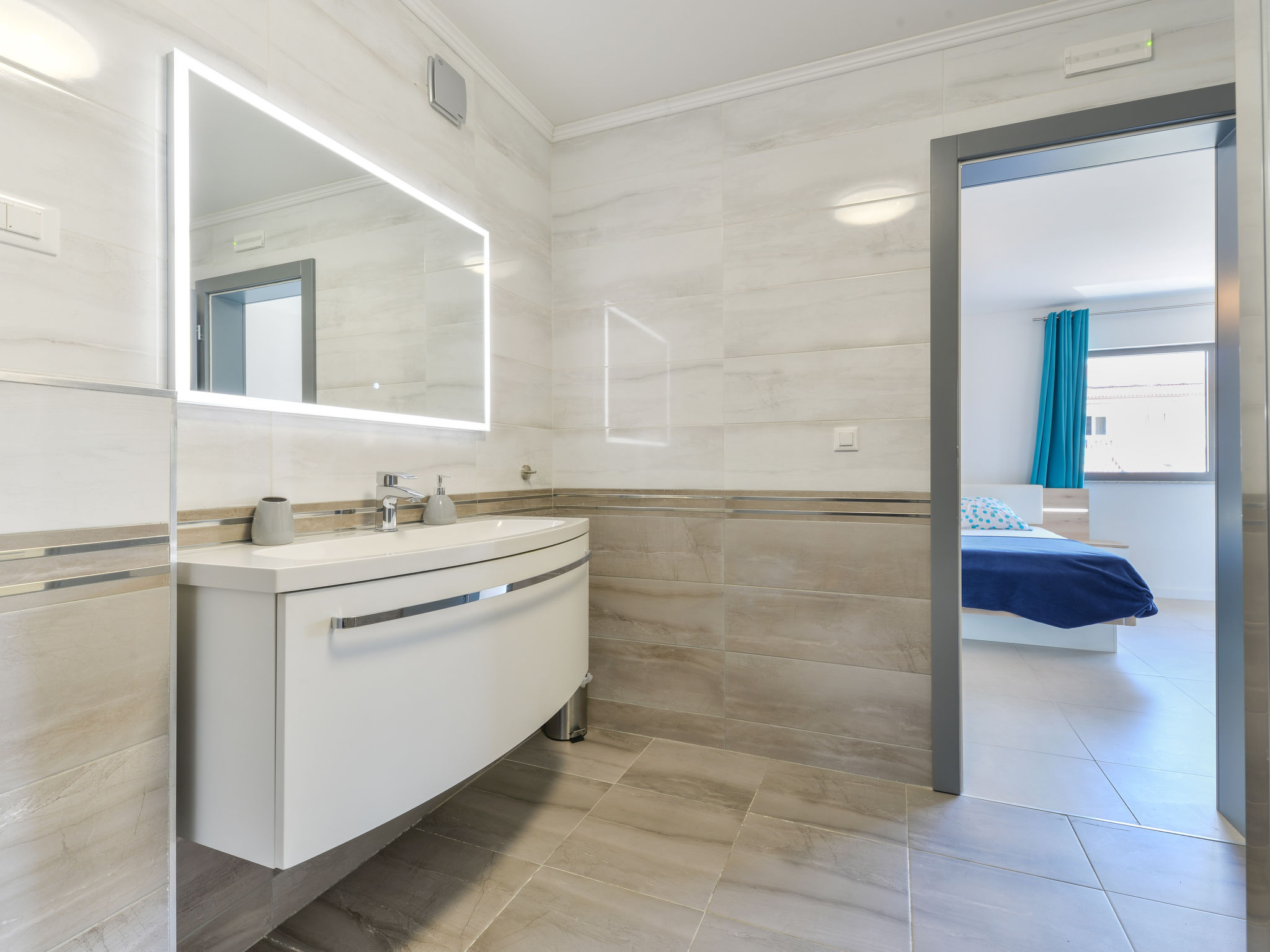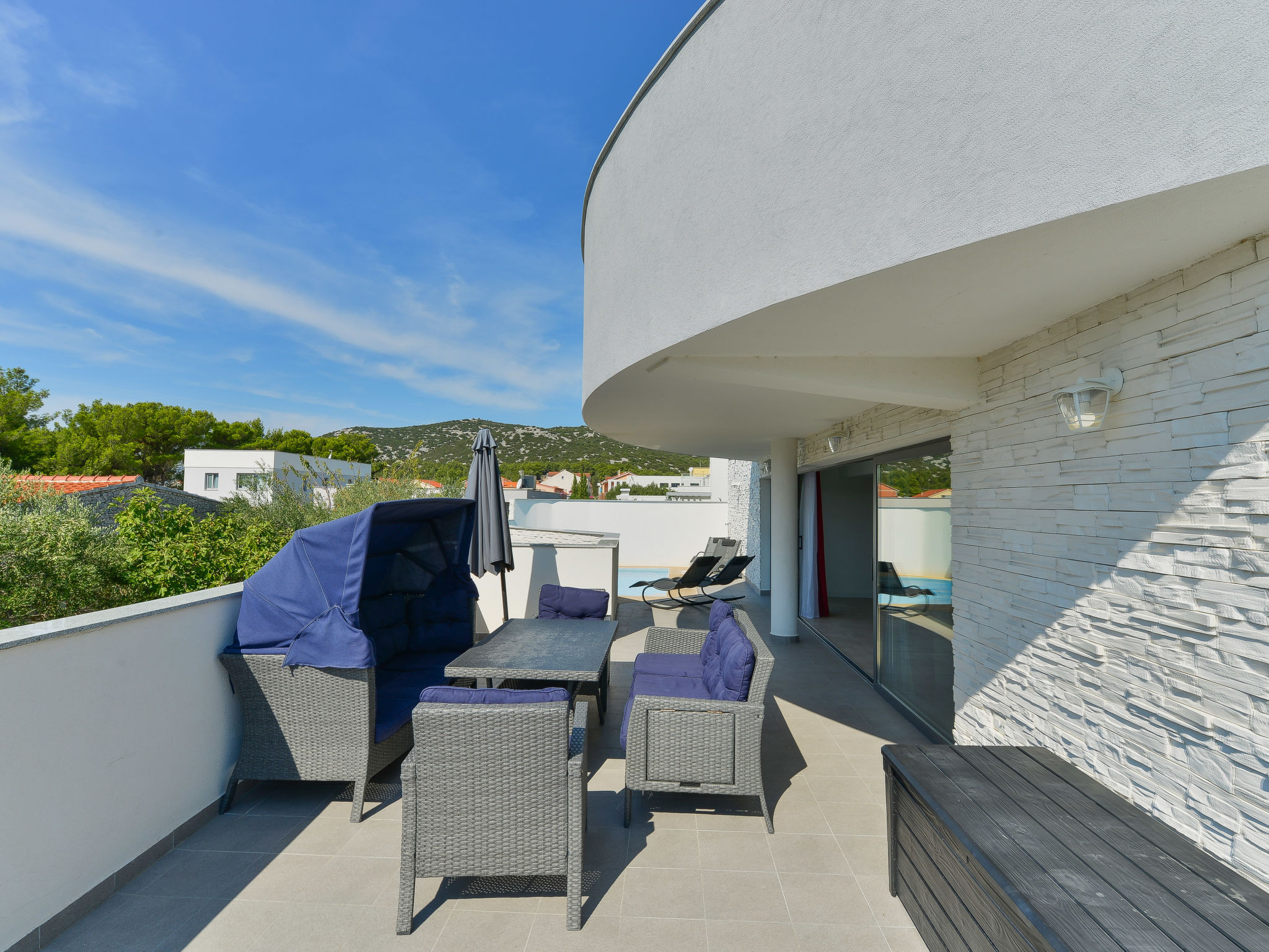 5-Zimmer-Doppelhaushälfte 260 m2 auf 2 Stockwerken, Südostlage. Modern eingerichtet: Wohn-/Esszimmer 45 m2 mit 1 Diwanbett (125 cm, Länge 220 cm), 1 Klappbett (80 cm, Länge 190 cm), Sat-TV (Flachbildschirm), Klimaanlage. Ausgang zur Terrasse. 1 Zimmer 20 m2 mit 1 franz. Bett (180 cm, Länge 200 cm), Dusche/WC und Sat-TV (Flachbildschirm), Klimaanlage. Ausgang zum Balkon. Offene Küche (Backofen, Geschirrspüler, 4 Glaskeramikherd Platten, Mikrowelle, Tiefkühler, elektrische Kaffeemaschine). Sep. WC. Obergeschoss: 2 Zimmer 20 m2, jedes Zimmer mit 1 franz. Bett (180 cm, Länge 200 cm), Dusche/WC und Sat-TV (Flachbildschirm), Klimaanlage. Ausgang zur Terrasse. 1 Zimmer 20 m2 mit 1 franz. Bett (180 cm, Länge 200 cm), Dusche/WC und Sat-TV (Flachbildschirm), Klimaanlage. Ausgang zum Balkon. Warmluftheizung. 2 Balkone 6 m2, Terrasse 80 m2 teilweise überdacht, Terrasse 38 m2, überdacht. Terrassenmöbel, Liegestühle. Sicht auf das Schwimmbad. Zur Verfügung: Safe, Bügeleisen, Babybett. Internet (Wireless LAN, gratis).