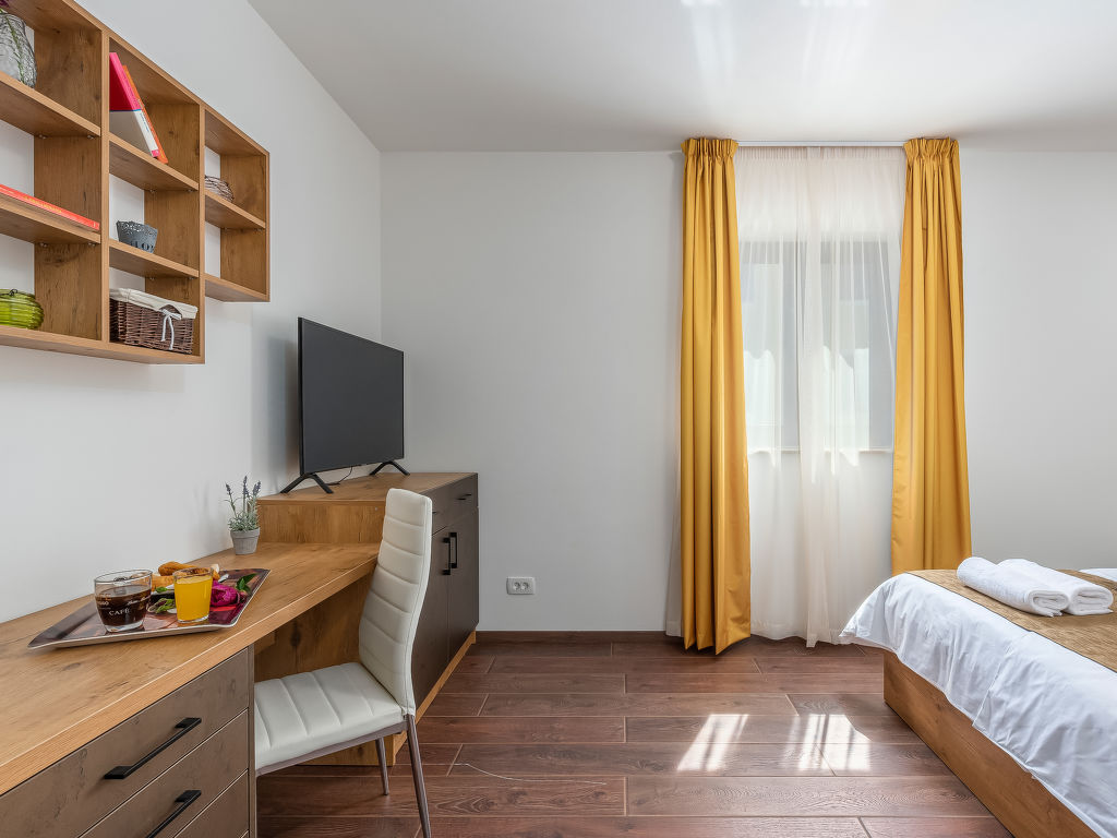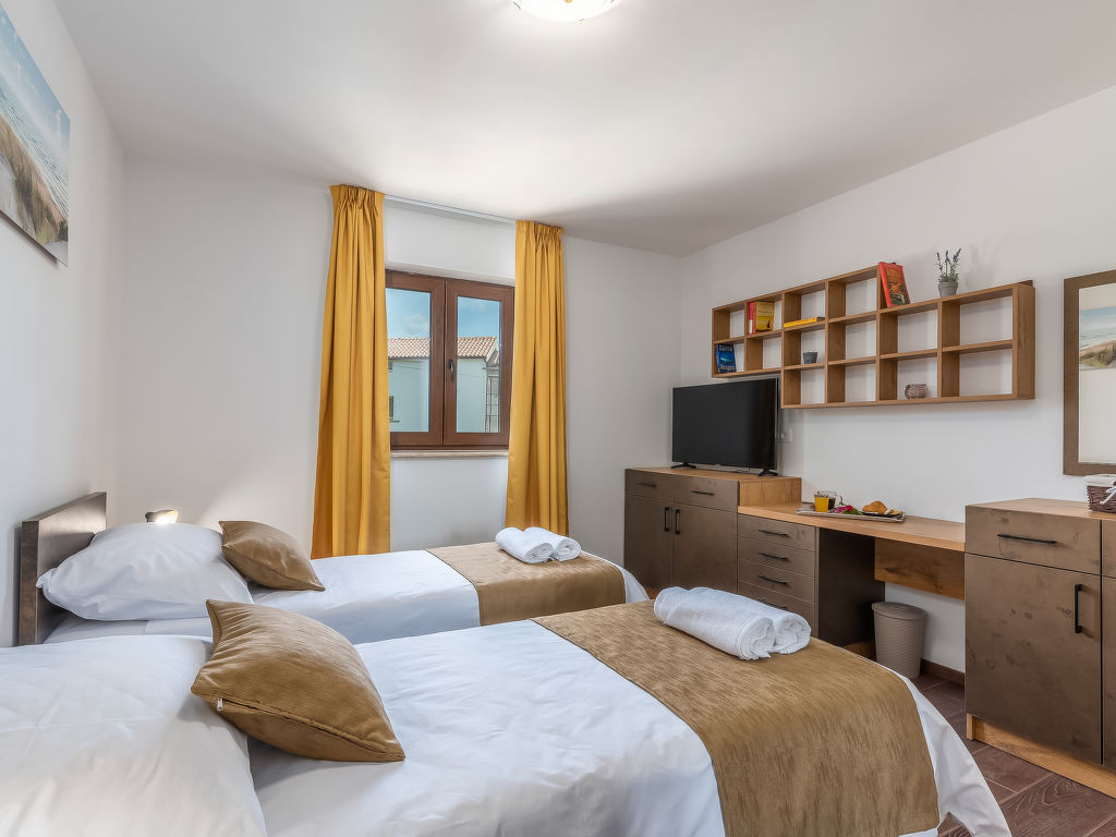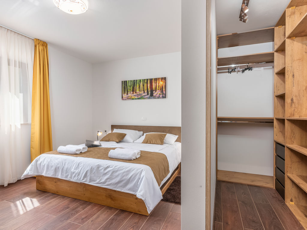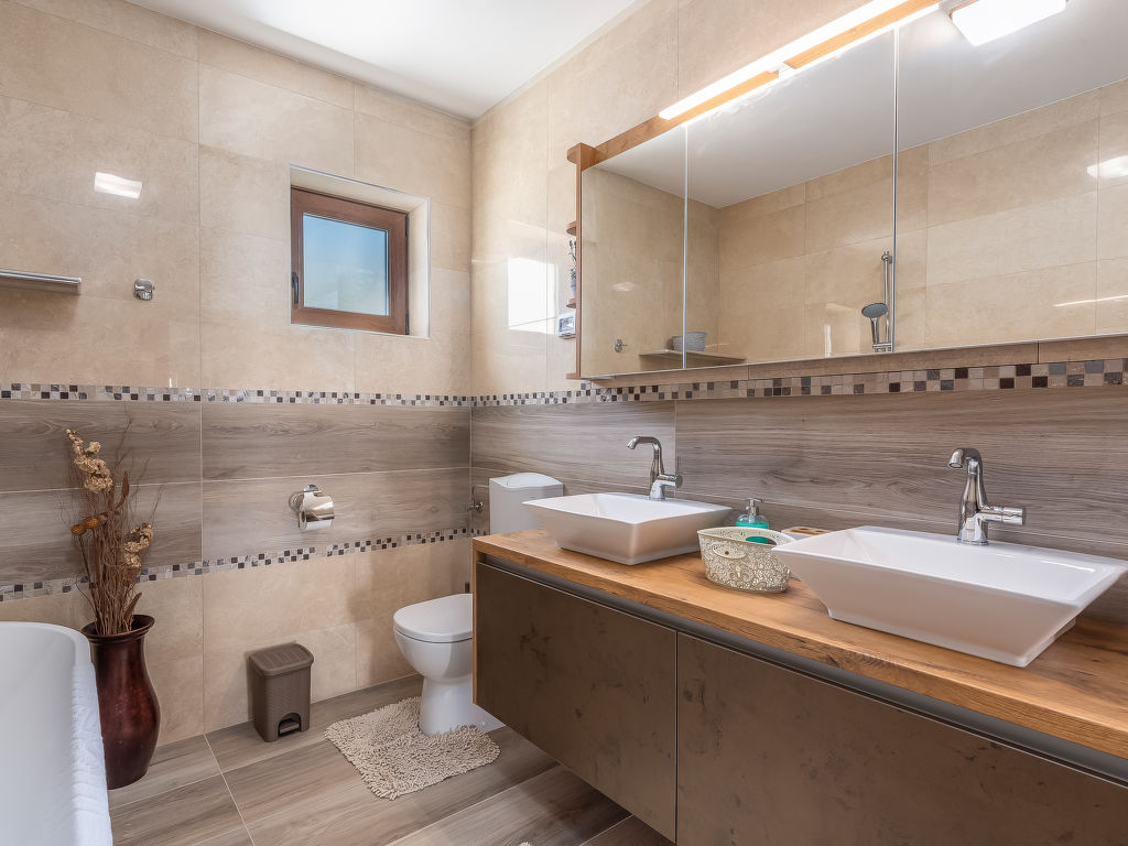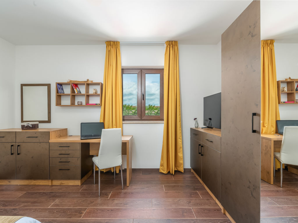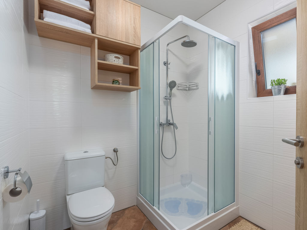4-Zimmer-Haus 128 m2. Geschmackvoll eingerichtet: Wohnzimmer 18 m2 mit 1 Diwanbett (140 cm, Länge 200 cm), Sat-TV (Flachbildschirm), Klimaanlage. 1 Zimmer mit 1 franz. Bett (180 cm, Länge 200 cm), Sat-TV (Flachbildschirm), Klimaanlage. 1 Zimmer mit 2 Betten (80 cm, Länge 200 cm), Sat-TV (Flachbildschirm), Klimaanlage. 1 Zimmer mit 1 Bett (90 cm, Länge 200 cm), 1 Ausziehbett (Länge 200 cm), Sat-TV (Flachbildschirm), Klimaanlage. Offene Küche (4 Kochplatten, Backofen, Geschirrspüler, Mikrowelle, Tiefkühler, elektrische Kaffeemaschine) mit Esstisch und Sat-TV (Flachbildschirm), Klimaanlage. Bad/Bidet/WC, Dusche/WC. Terrasse 15 m2, überdacht. Gartengrill (mobil), Liegestühle. Zur Verfügung: Safe, Babybett, Haartrockner. Internet (Wireless LAN, gratis).