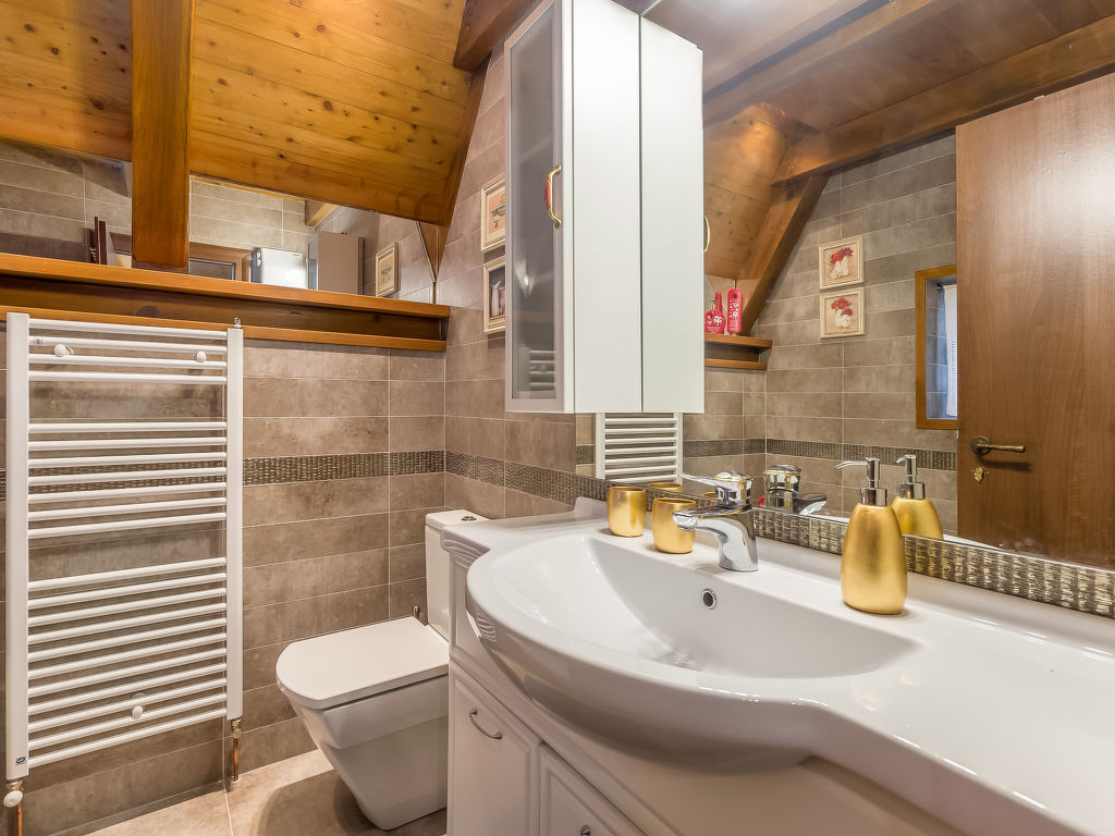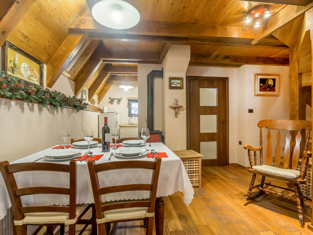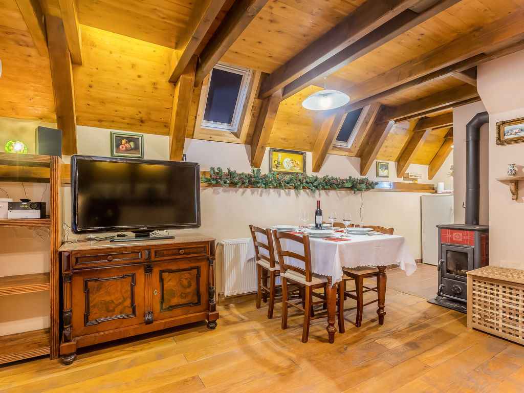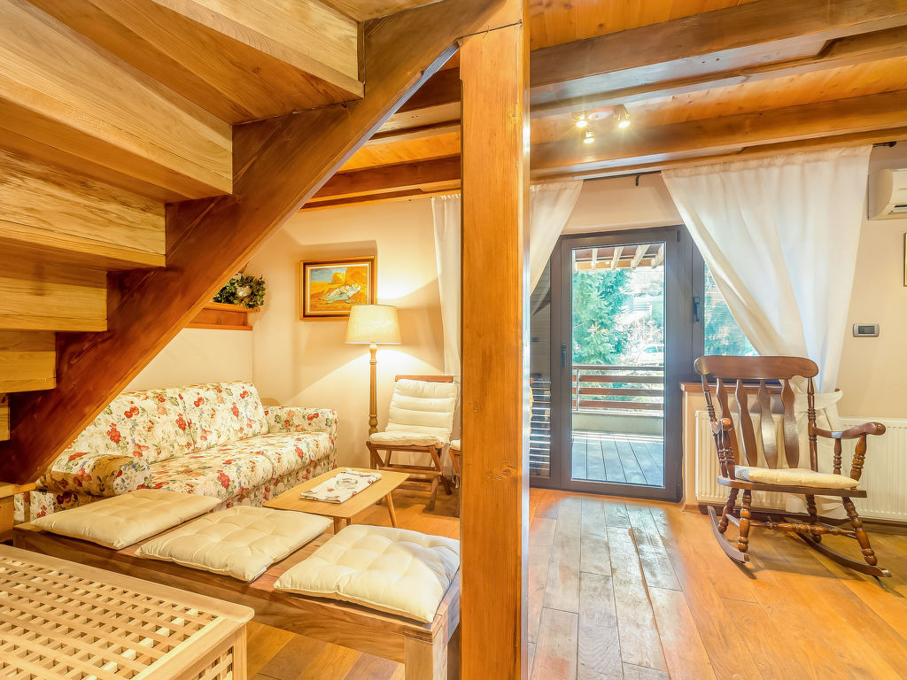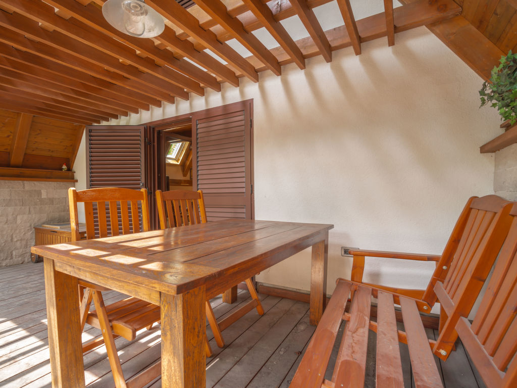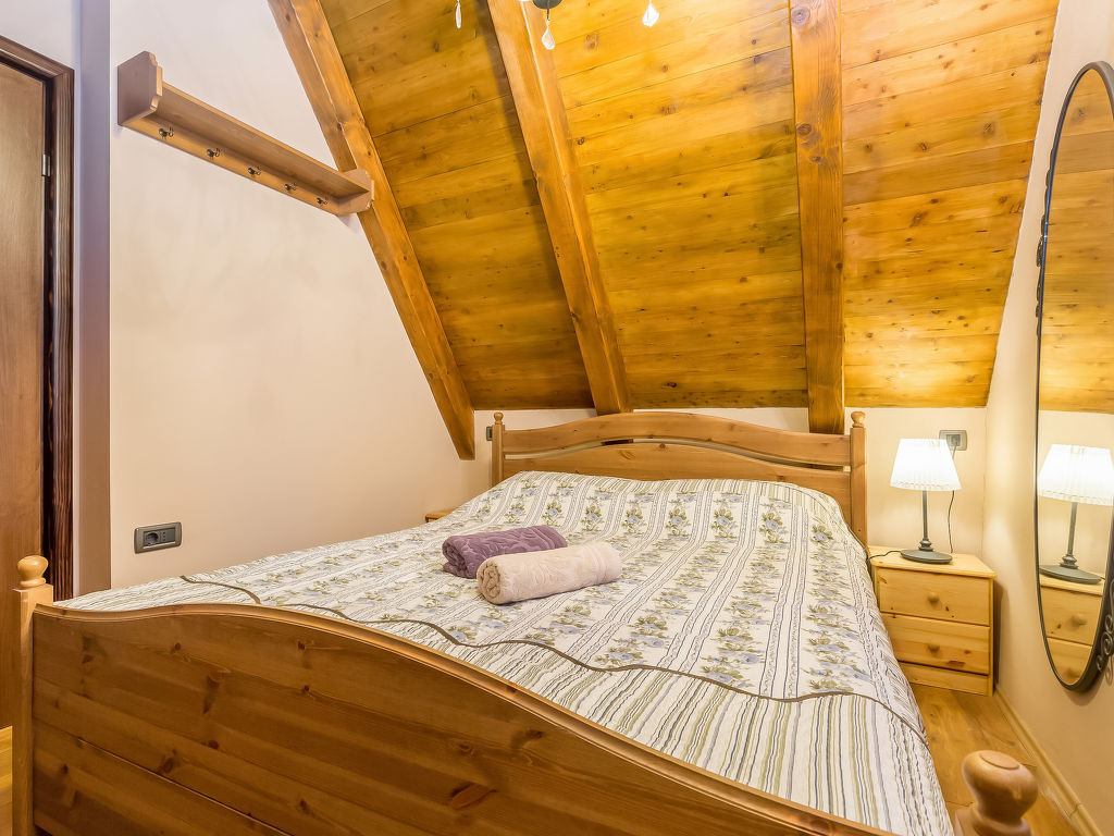 3-Zimmer-Chalet 110 m2 auf 3 Stockwerken. Dusche/Bidet/WC. Obergeschoss: (Aussentreppe) Wohn-/Esszimmer 25 m2 mit Kabel-TV (Flachbildschirm), Klimaanlage. Ausgang zur Terrasse. Offene Küche (Backofen, 4 Glaskeramikherd Platten, Mikrowelle). Bad/WC. Dachgeschoss: 2 abgeschrägte Zimmer, Deckenhöhe 105 - 280 cm, jedes Zimmer mit 1 Doppelbett (2 x 80 cm, Länge 190 cm). Heizung. Terrasse 18 m2, überdacht. Terrassenmöbel, Liegestühle. Zur Verfügung: Internet (Wireless LAN, gratis). Erdgeschoss: Wellnesslandschaft mit Sprudelbad, Infrarotsauna, Liegestühlen (alles im Preis inbegriffen). Kleines Fenster in einem Schlafzimmer in der obersten Etage. Heizung ist nur im Zeitraum ab 01.09. bis 31.05. möglich.