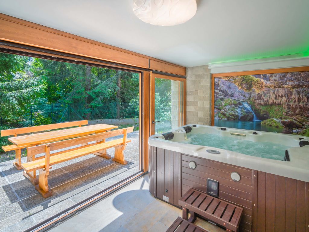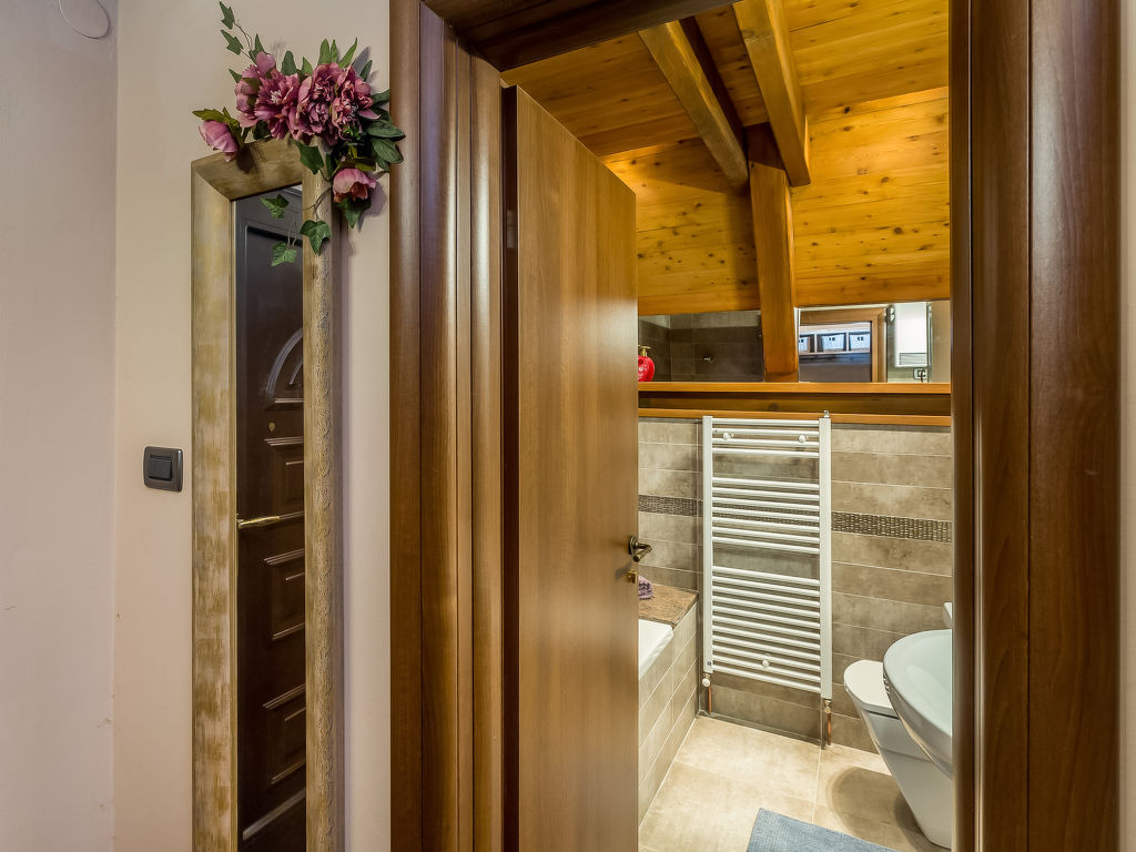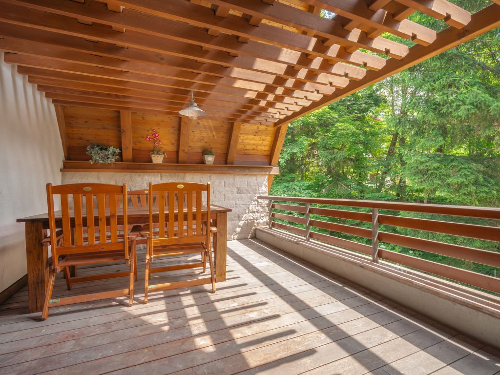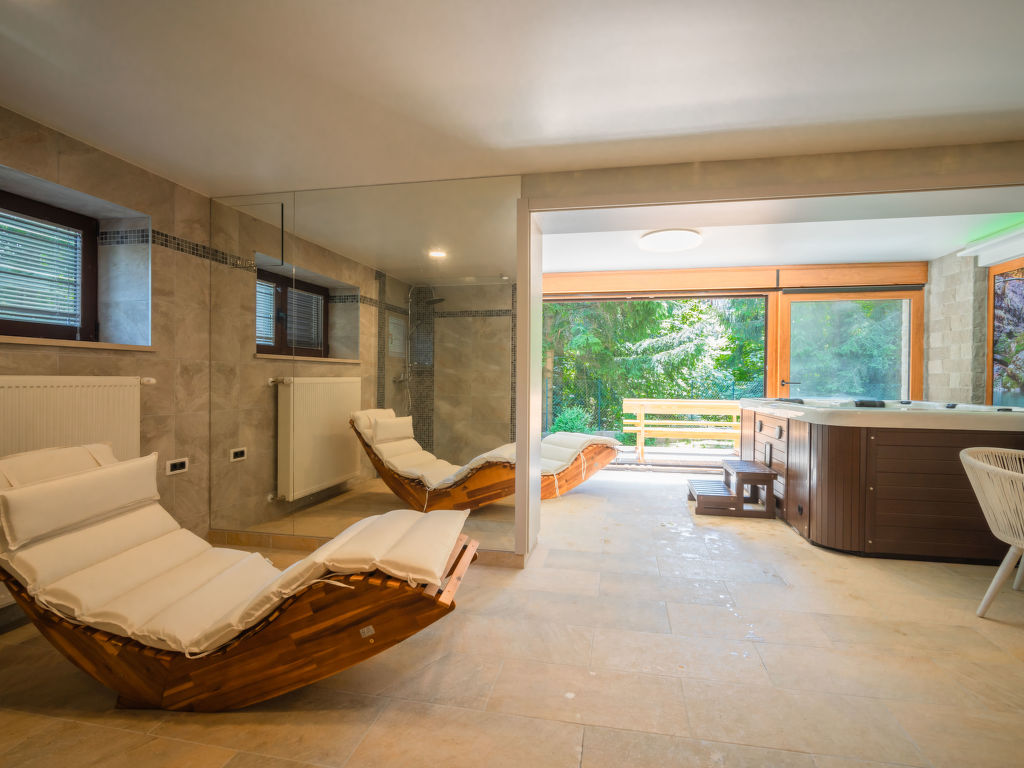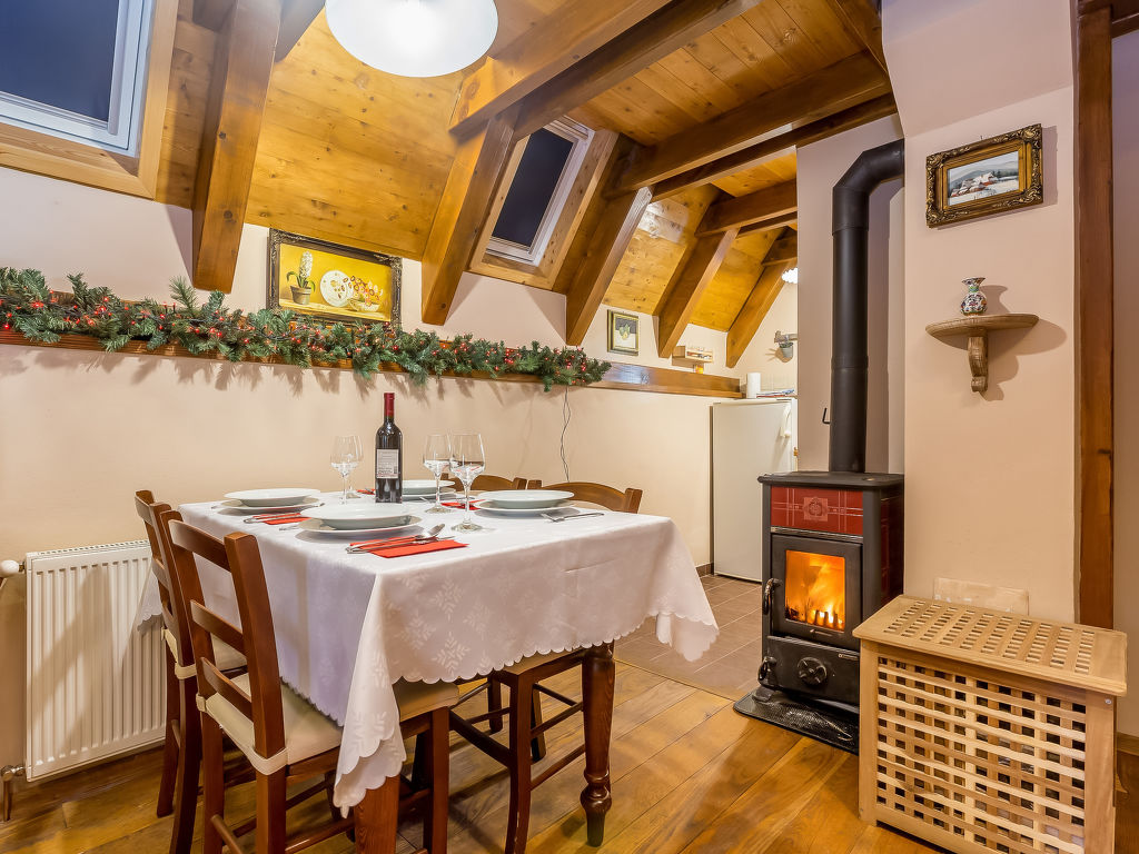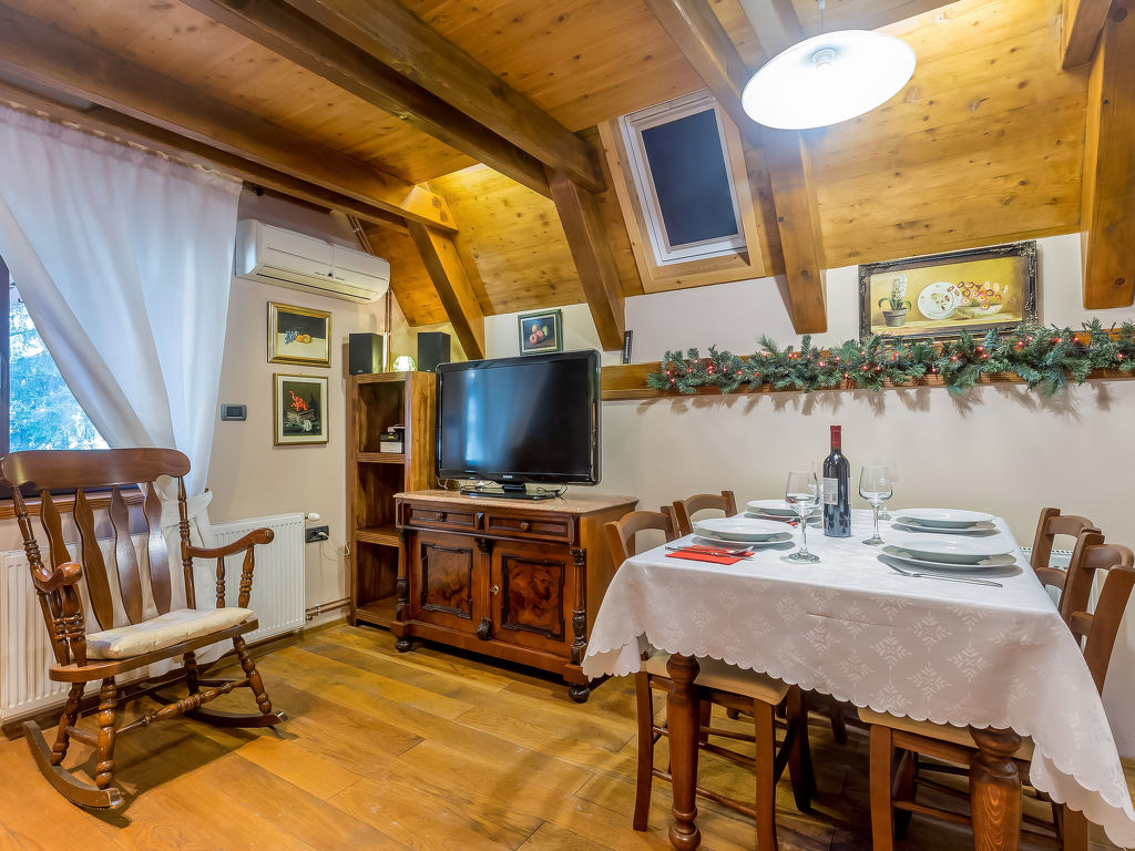 3-Zimmer-Chalet 110 m2 auf 3 Stockwerken. Dusche/Bidet/WC. Obergeschoss: (Aussentreppe) Wohn-/Esszimmer 25 m2 mit Kabel-TV (Flachbildschirm), Klimaanlage. Ausgang zur Terrasse. Offene Küche (Backofen, 4 Glaskeramikherd Platten, Mikrowelle). Bad/WC. Dachgeschoss: 2 abgeschrägte Zimmer, Deckenhöhe 105 - 280 cm, jedes Zimmer mit 1 Doppelbett (2 x 80 cm, Länge 190 cm). Heizung. Terrasse 18 m2, überdacht. Terrassenmöbel, Liegestühle. Zur Verfügung: Internet (Wireless LAN, gratis). Erdgeschoss: Wellnesslandschaft mit Sprudelbad, Infrarotsauna, Liegestühlen (alles im Preis inbegriffen). Kleines Fenster in einem Schlafzimmer in der obersten Etage. Heizung ist nur im Zeitraum ab 01.09. bis 31.05. möglich.