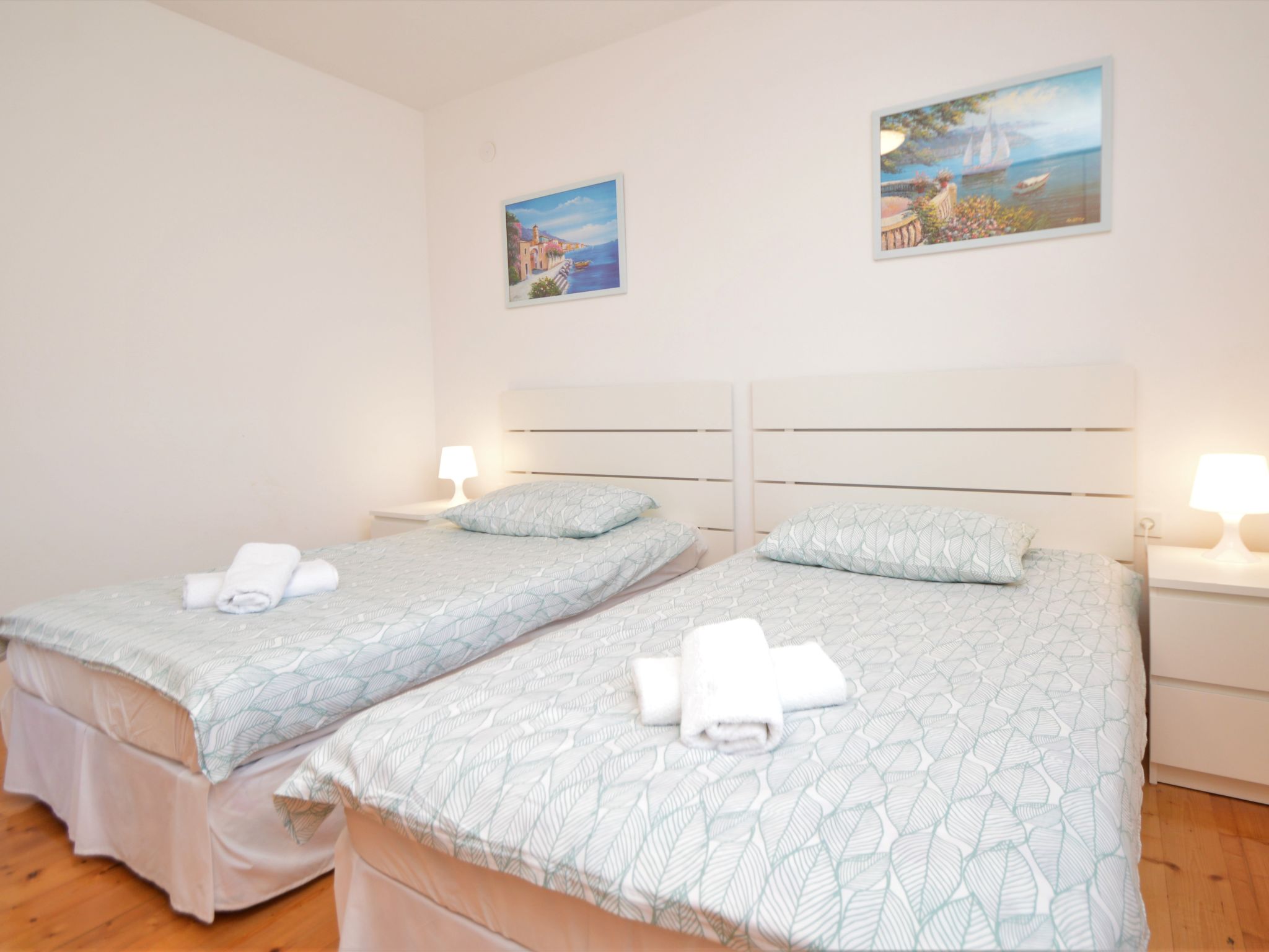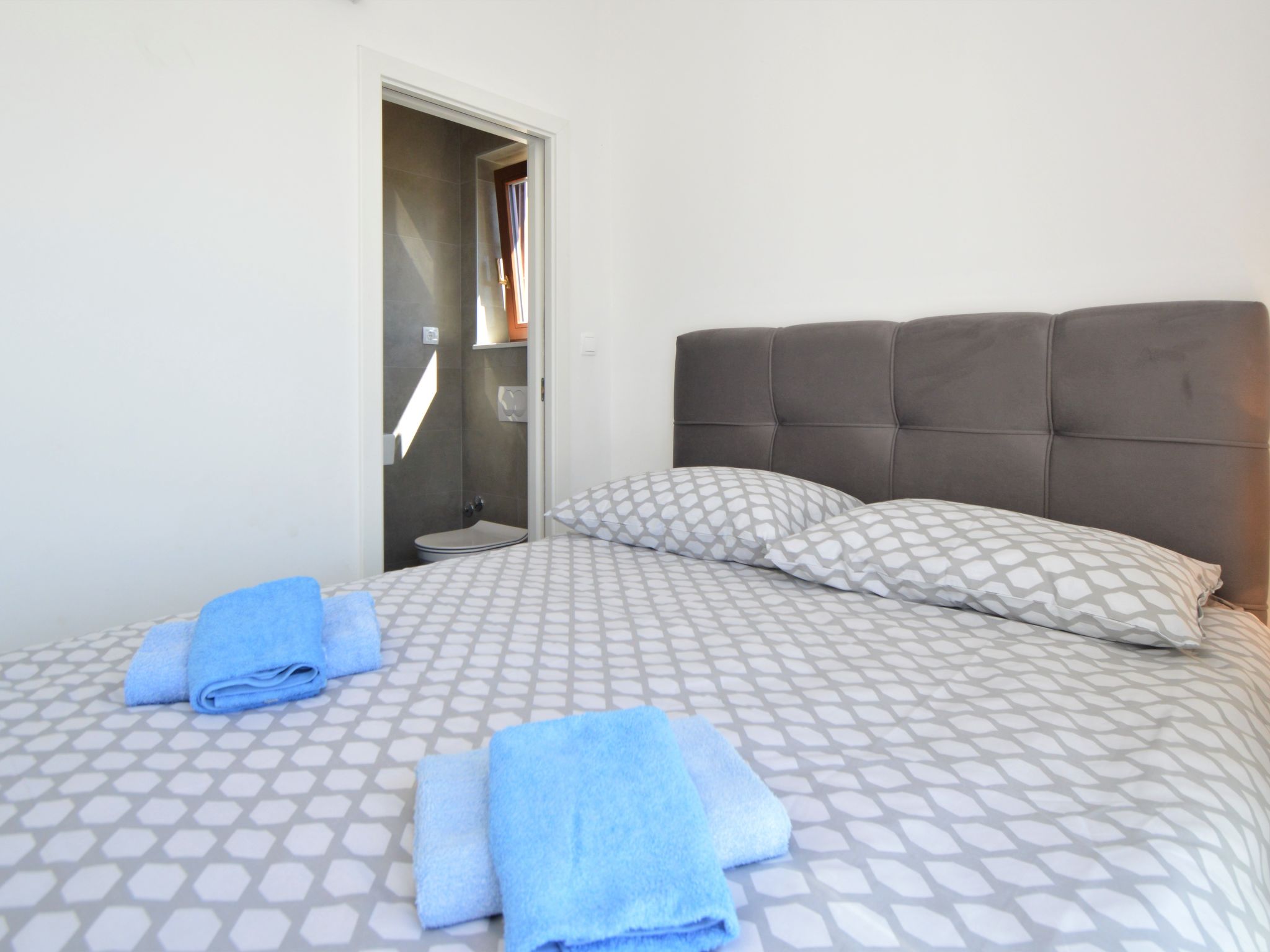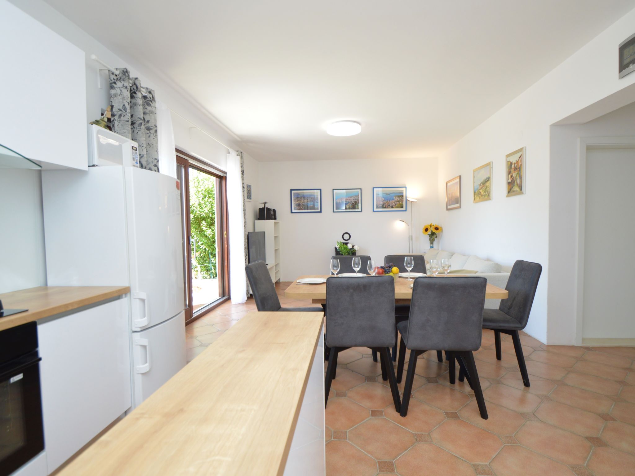 4-Zimmer-Haus 90 m2, Südlage. Wohn-/Esszimmer 36 m2 mit 1 Diwanbett (80 cm, Länge 200 cm), Sat-TV (Flachbildschirm), Klimaanlage. Ausgang zur Terrasse. 1 Zimmer mit 1 franz. Bett (160 cm, Länge 200 cm). 1 Zimmer mit 3 Betten (90 cm, Länge 200 cm). 1 Zimmer mit 1 franz. Bett (160 cm, Länge 200 cm), Dusche/WC. Ausgang zur Terrasse. Offene Küche (4 Kochplatten, Backofen, Geschirrspüler, Mikrowelle, Tiefkühler). Dusche, sep. WC. Terrasse 22 m2, überdacht, Terrasse 8 m2. Terrassenmöbel, Gartengrill (mobil), Liegestühle. Sicht auf das Meer. Zur Verfügung: Internet (Wireless LAN, gratis). Garage (extra) (2 Autos). 1 Haustier/Hund erlaubt.