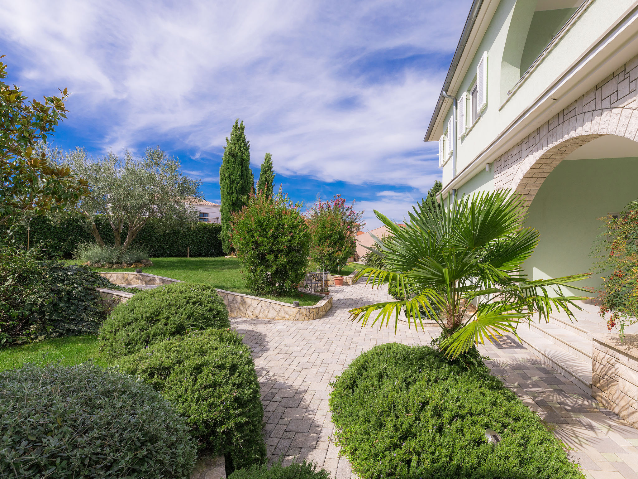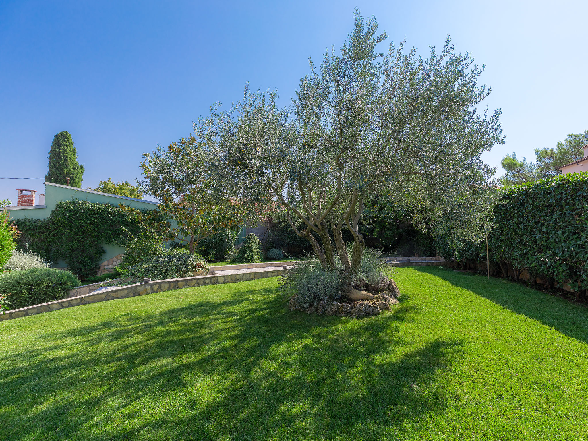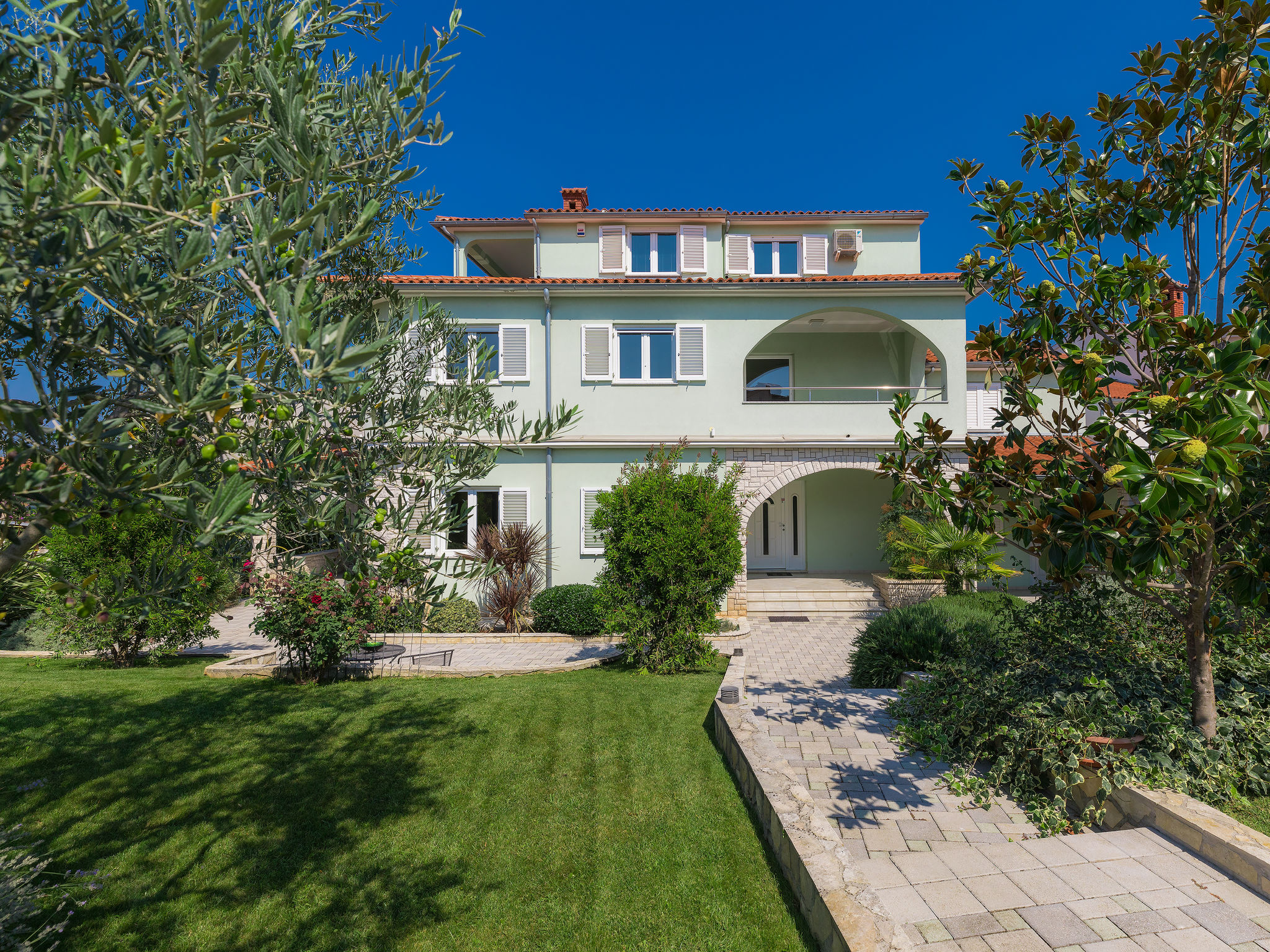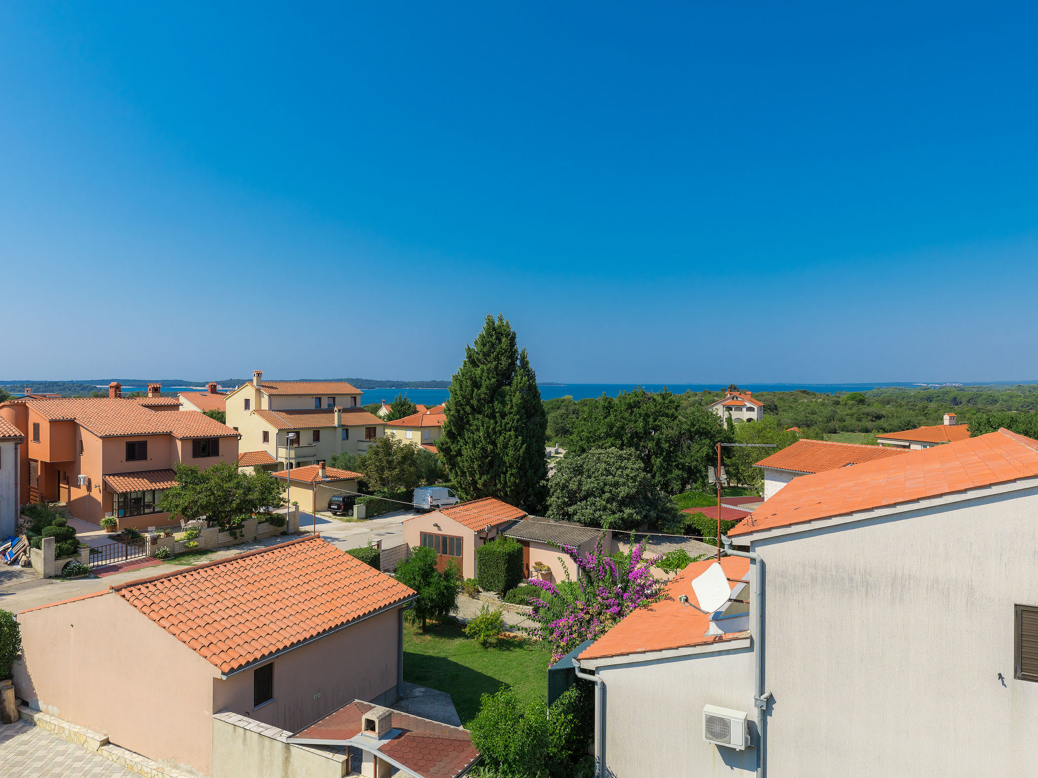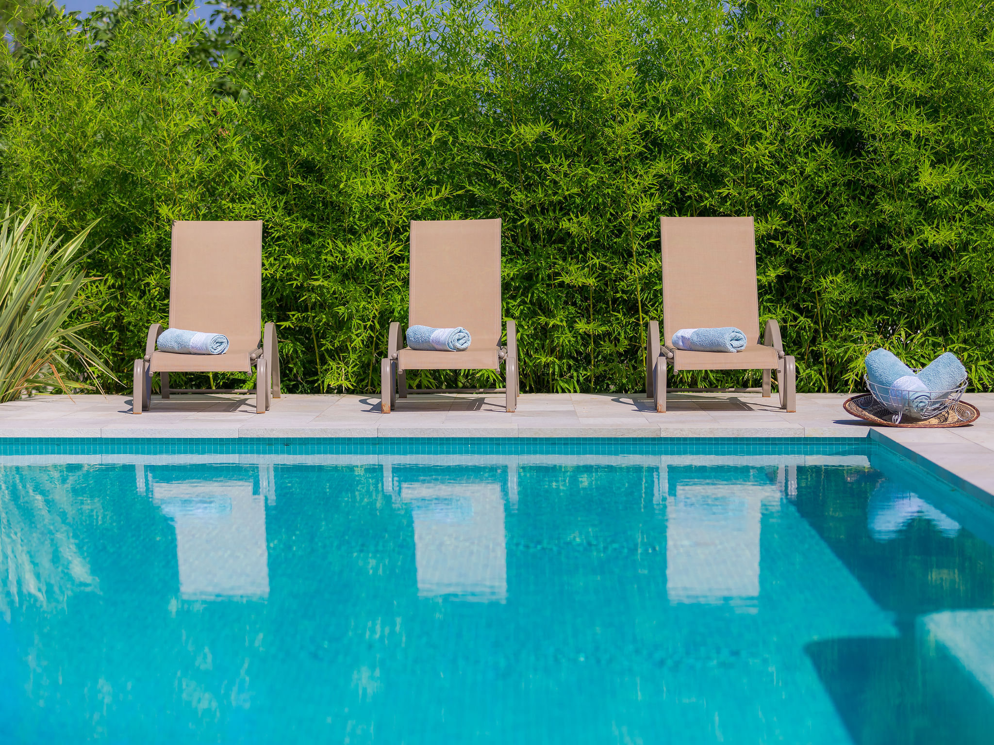 6-Zimmer-Villa 315 m2 auf 3 Stockwerken. Wohn-/Esszimmer mit Sat-TV (Flachbildschirm), Klimaanlage. Ausgang zur Terrasse. Küche (Backofen, Geschirrspüler, 4 Glaskeramikherd Platten, Mikrowelle, Tiefkühler, elektrische Kaffeemaschine) mit Klimaanlage. Dusche/Bidet/WC. Obergeschoss: 1 Zimmer mit 1 franz. Bett (180 cm, Länge 200 cm), Klimaanlage. Ausgang zur Terrasse. 1 Zimmer mit 2 Betten (90 cm, Länge 200 cm), Sat-TV (Flachbildschirm), Klimaanlage. Ausgang zur Terrasse. 1 Zimmer mit 1 franz. Bett (180 cm, Länge 200 cm), Bad/Bidet/WC, Doppelwaschbecken, Sprudelbad und Klimaanlage. Dusche/Bidet/WC. 3. Obergeschoss: 1 Zimmer mit 2 Betten (90 cm, Länge 200 cm), 2 Diwanbetten (90 cm, Länge 200 cm), Sat-TV (Flachbildschirm), Klimaanlage. Ausgang zur Terrasse. 1 Zimmer mit 2 Betten (90 cm, Länge 200 cm), Klimaanlage. Dusche/Bidet/WC. Heizung (extra). Terrasse 20 m2, überdacht, 3 Terrassen 10 m2. Terrassenmöbel, Gartengrill (mobil), Liegestühle. Sicht auf das Meer und das Schwimmbad. Zur Verfügung: Safe, Babybett, Haartrockner. Internet (Wireless LAN, gratis). Parkplatz (überdacht, 1 Auto). Bei Belegung mit weniger Personen als der maximalen Personenzahl steht eine Etage nicht zur Verfügung.