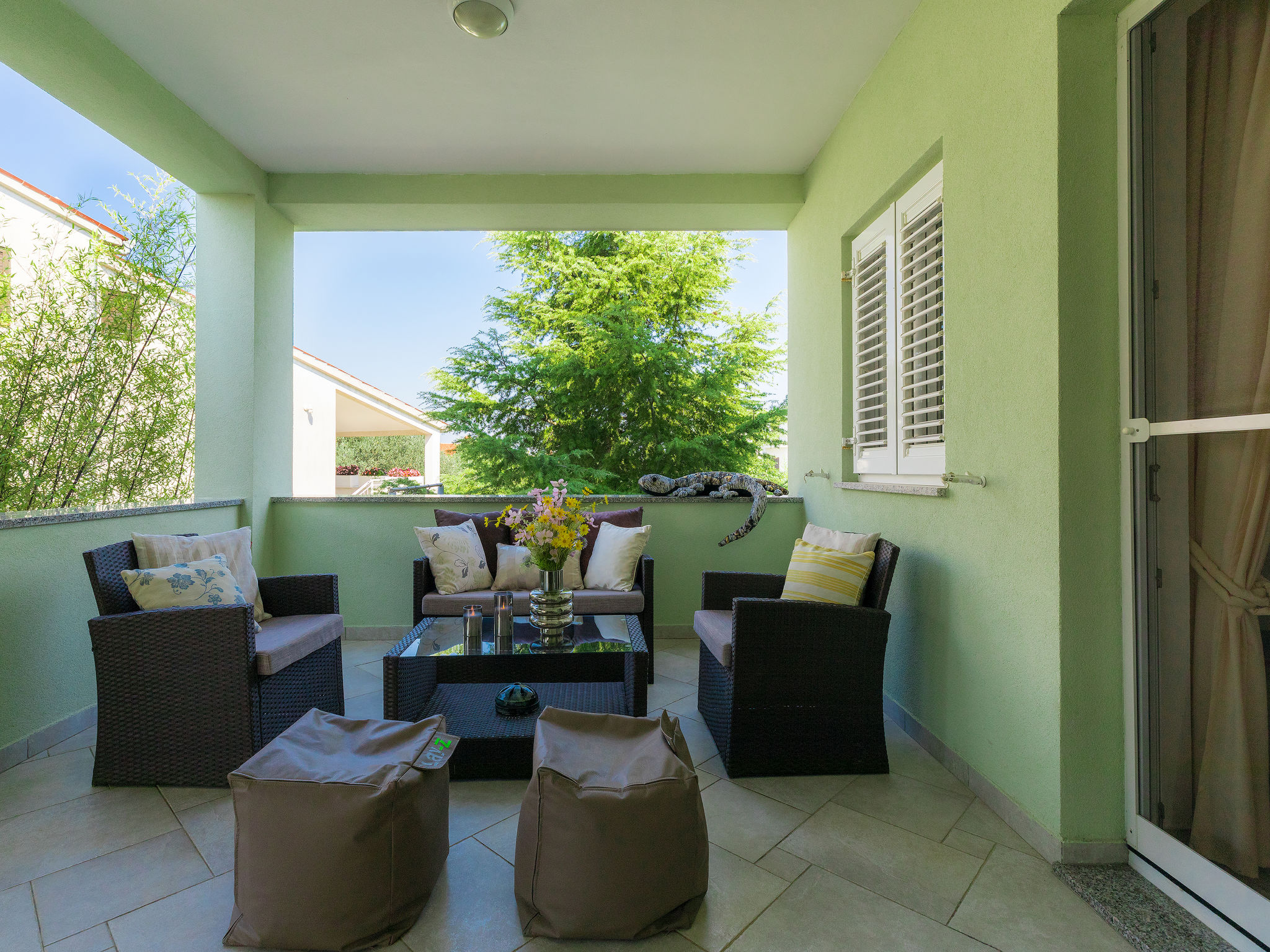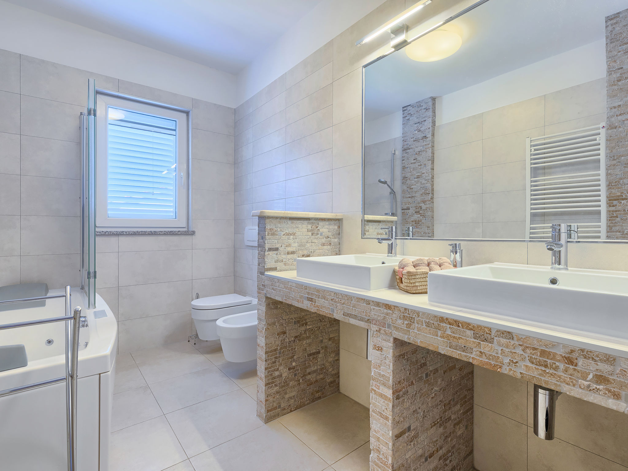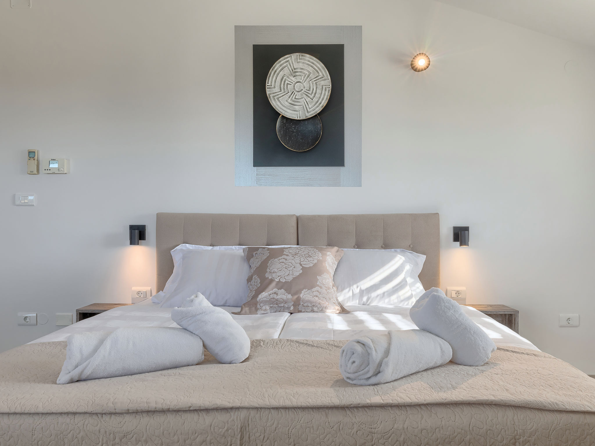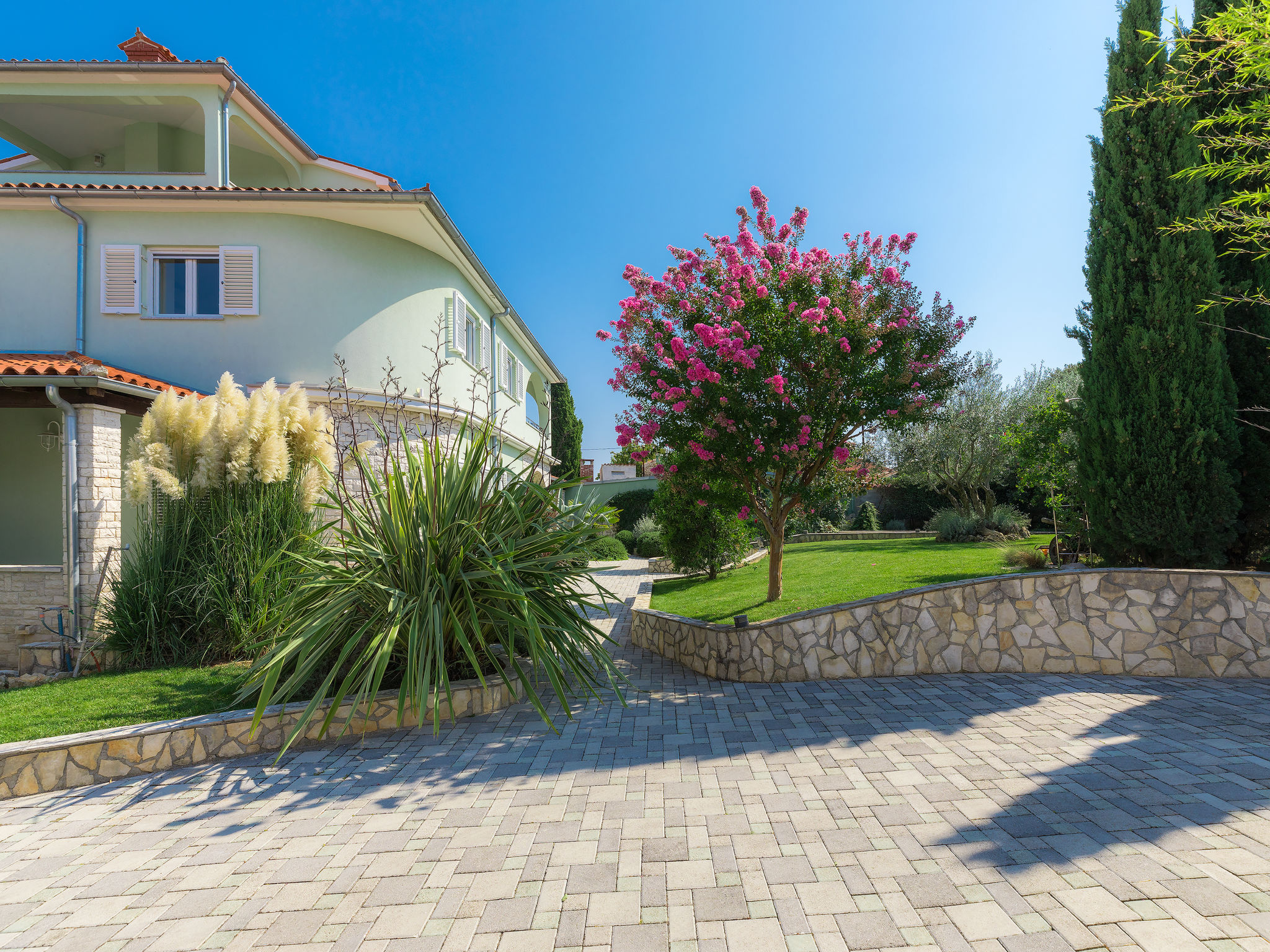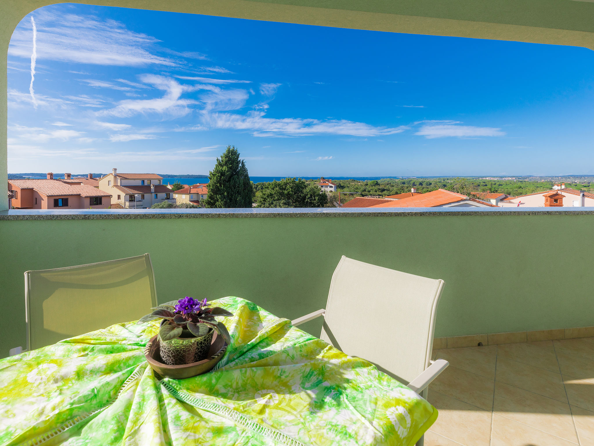 6-Zimmer-Villa 315 m2 auf 3 Stockwerken. Wohn-/Esszimmer mit Sat-TV (Flachbildschirm), Klimaanlage. Ausgang zur Terrasse. Küche (Backofen, Geschirrspüler, 4 Glaskeramikherd Platten, Mikrowelle, Tiefkühler, elektrische Kaffeemaschine) mit Klimaanlage. Dusche/Bidet/WC. Obergeschoss: 1 Zimmer mit 1 franz. Bett (180 cm, Länge 200 cm), Klimaanlage. Ausgang zur Terrasse. 1 Zimmer mit 2 Betten (90 cm, Länge 200 cm), Sat-TV (Flachbildschirm), Klimaanlage. Ausgang zur Terrasse. 1 Zimmer mit 1 franz. Bett (180 cm, Länge 200 cm), Bad/Bidet/WC, Doppelwaschbecken, Sprudelbad und Klimaanlage. Dusche/Bidet/WC. 3. Obergeschoss: 1 Zimmer mit 2 Betten (90 cm, Länge 200 cm), 2 Diwanbetten (90 cm, Länge 200 cm), Sat-TV (Flachbildschirm), Klimaanlage. Ausgang zur Terrasse. 1 Zimmer mit 2 Betten (90 cm, Länge 200 cm), Klimaanlage. Dusche/Bidet/WC. Heizung (extra). Terrasse 20 m2, überdacht, 3 Terrassen 10 m2. Terrassenmöbel, Gartengrill (mobil), Liegestühle. Sicht auf das Meer und das Schwimmbad. Zur Verfügung: Safe, Babybett, Haartrockner. Internet (Wireless LAN, gratis). Parkplatz (überdacht, 1 Auto). Bei Belegung mit weniger Personen als der maximalen Personenzahl steht eine Etage nicht zur Verfügung.