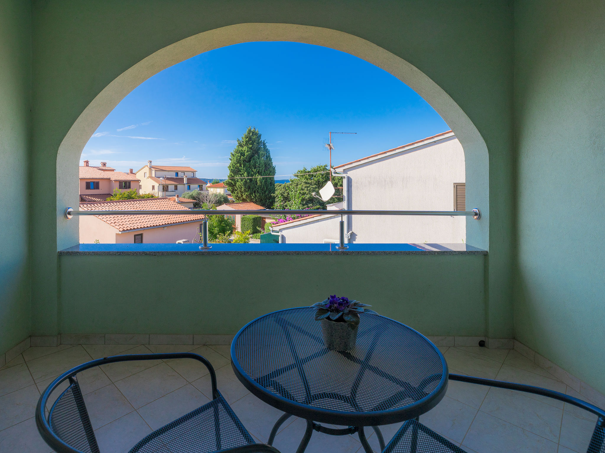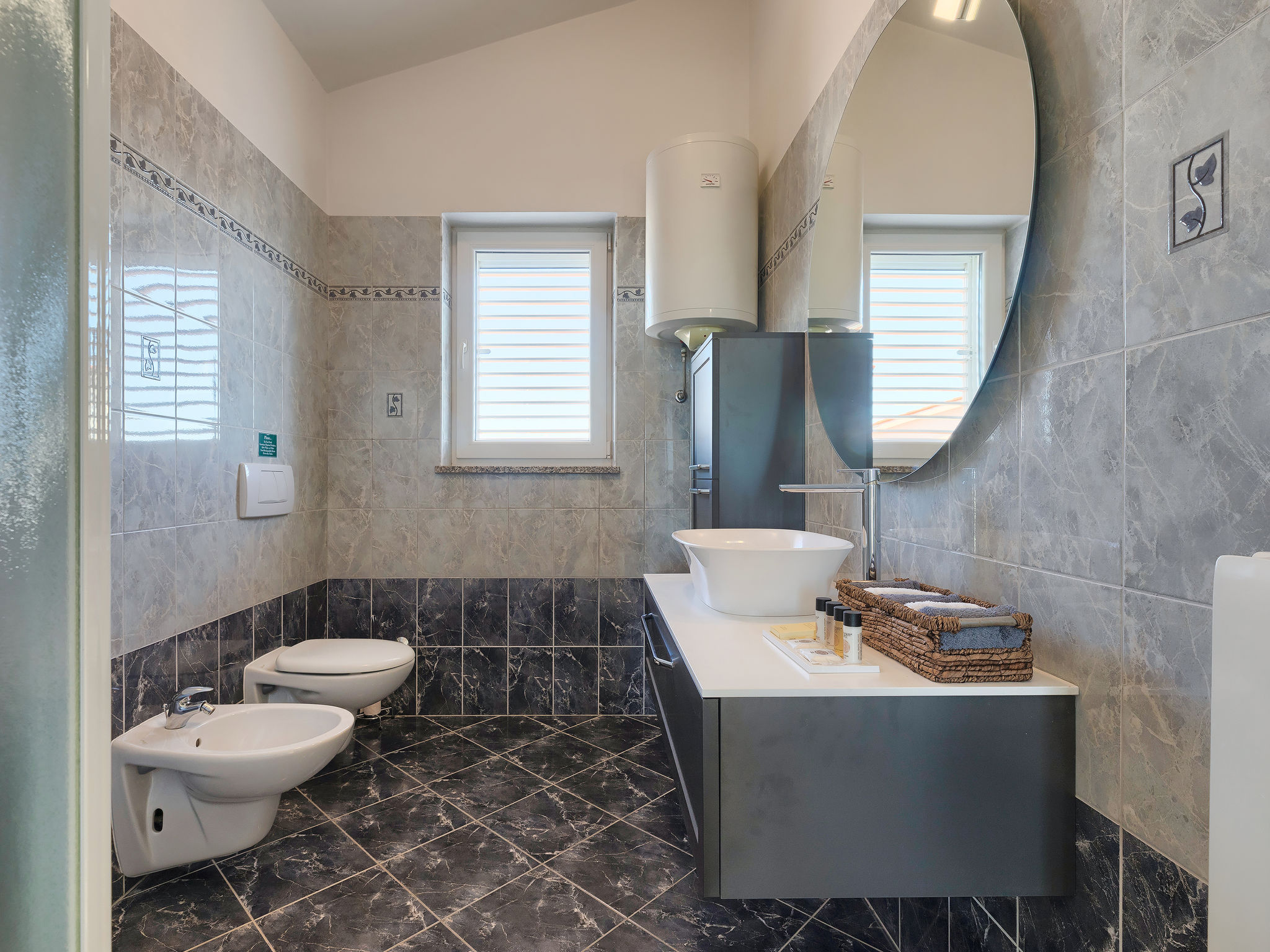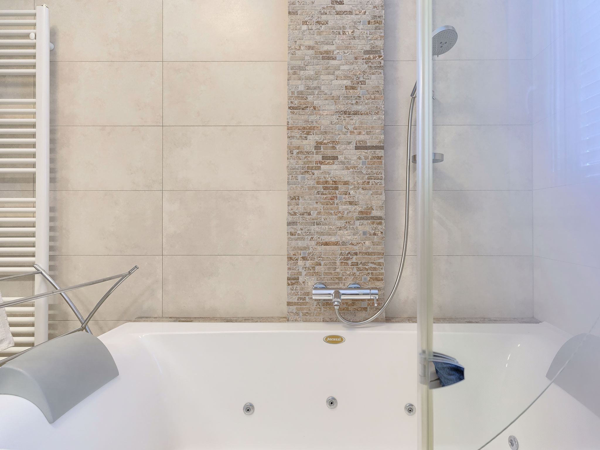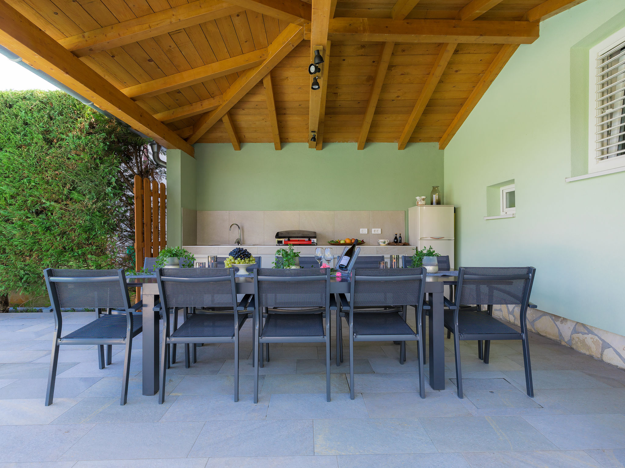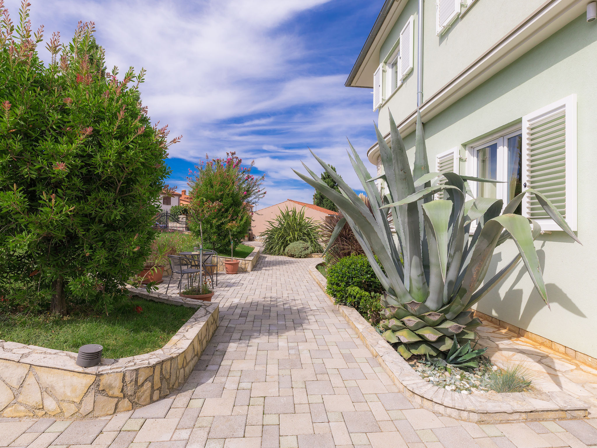 6-Zimmer-Villa 315 m2 auf 3 Stockwerken. Wohn-/Esszimmer mit Sat-TV (Flachbildschirm), Klimaanlage. Ausgang zur Terrasse. Küche (Backofen, Geschirrspüler, 4 Glaskeramikherd Platten, Mikrowelle, Tiefkühler, elektrische Kaffeemaschine) mit Klimaanlage. Dusche/Bidet/WC. Obergeschoss: 1 Zimmer mit 1 franz. Bett (180 cm, Länge 200 cm), Klimaanlage. Ausgang zur Terrasse. 1 Zimmer mit 2 Betten (90 cm, Länge 200 cm), Sat-TV (Flachbildschirm), Klimaanlage. Ausgang zur Terrasse. 1 Zimmer mit 1 franz. Bett (180 cm, Länge 200 cm), Bad/Bidet/WC, Doppelwaschbecken, Sprudelbad und Klimaanlage. Dusche/Bidet/WC. 3. Obergeschoss: 1 Zimmer mit 2 Betten (90 cm, Länge 200 cm), 2 Diwanbetten (90 cm, Länge 200 cm), Sat-TV (Flachbildschirm), Klimaanlage. Ausgang zur Terrasse. 1 Zimmer mit 2 Betten (90 cm, Länge 200 cm), Klimaanlage. Dusche/Bidet/WC. Heizung (extra). Terrasse 20 m2, überdacht, 3 Terrassen 10 m2. Terrassenmöbel, Gartengrill (mobil), Liegestühle. Sicht auf das Meer und das Schwimmbad. Zur Verfügung: Safe, Babybett, Haartrockner. Internet (Wireless LAN, gratis). Parkplatz (überdacht, 1 Auto). Bei Belegung mit weniger Personen als der maximalen Personenzahl steht eine Etage nicht zur Verfügung.