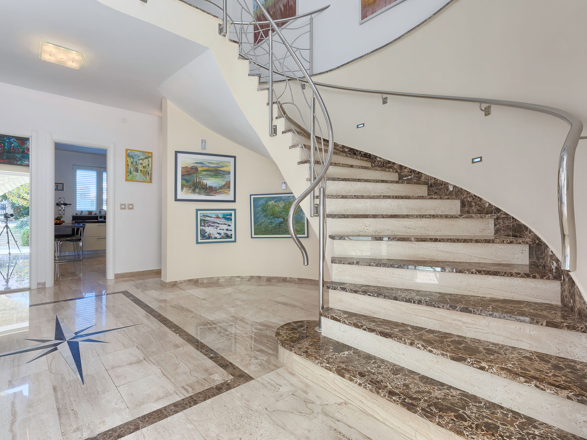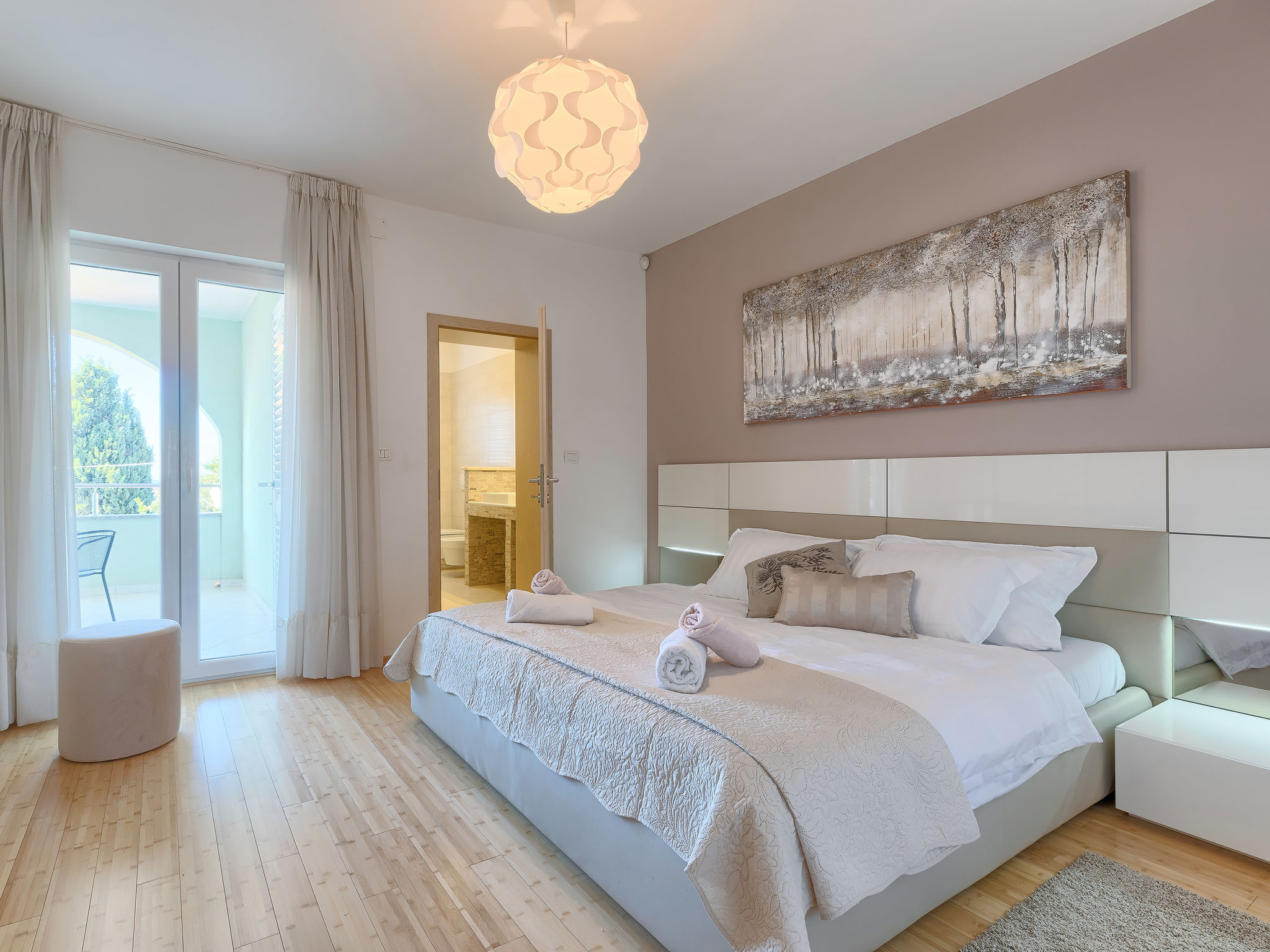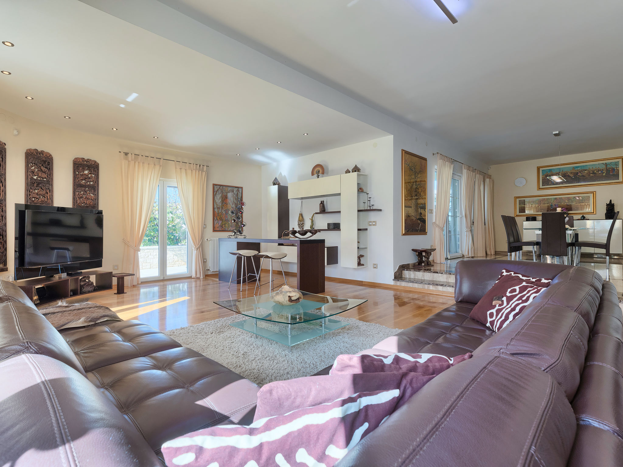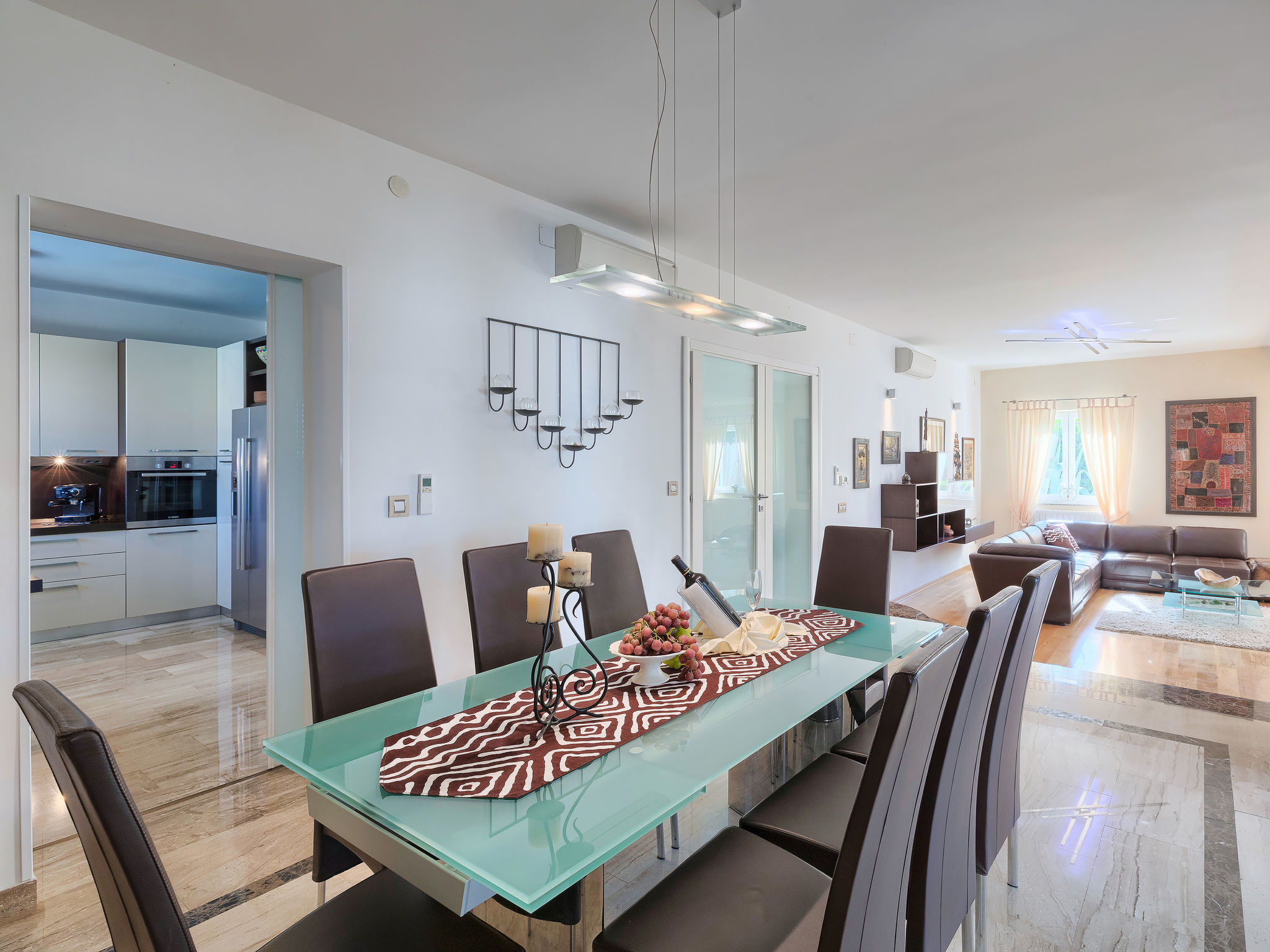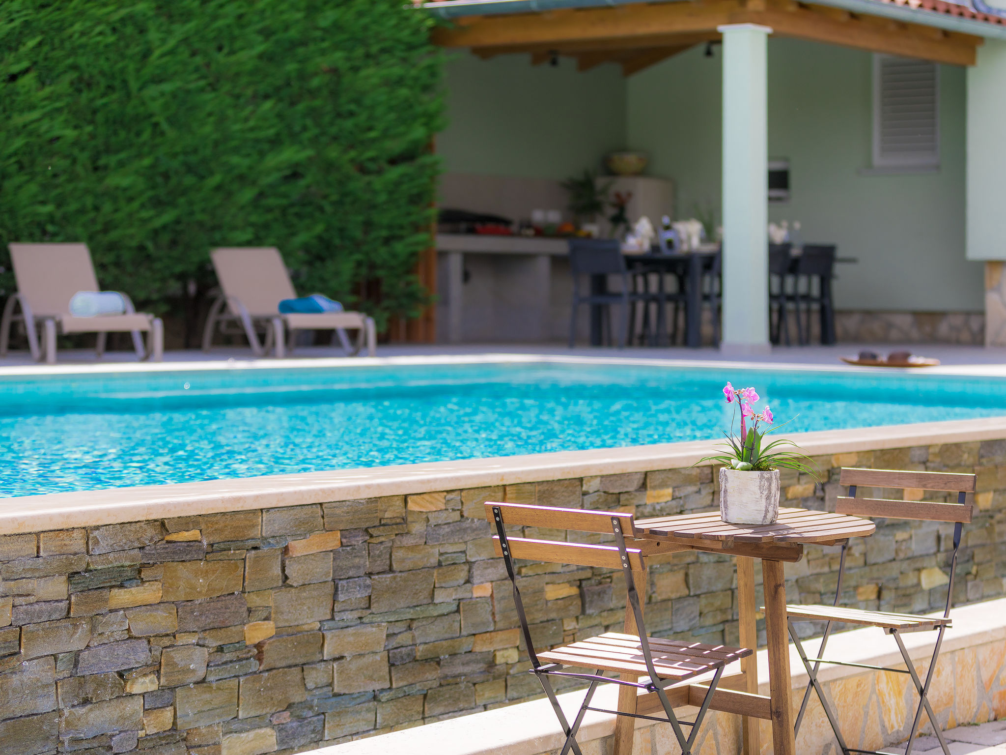 6-Zimmer-Villa 315 m2 auf 3 Stockwerken. Wohn-/Esszimmer mit Sat-TV (Flachbildschirm), Klimaanlage. Ausgang zur Terrasse. Küche (Backofen, Geschirrspüler, 4 Glaskeramikherd Platten, Mikrowelle, Tiefkühler, elektrische Kaffeemaschine) mit Klimaanlage. Dusche/Bidet/WC. Obergeschoss: 1 Zimmer mit 1 franz. Bett (180 cm, Länge 200 cm), Klimaanlage. Ausgang zur Terrasse. 1 Zimmer mit 2 Betten (90 cm, Länge 200 cm), Sat-TV (Flachbildschirm), Klimaanlage. Ausgang zur Terrasse. 1 Zimmer mit 1 franz. Bett (180 cm, Länge 200 cm), Bad/Bidet/WC, Doppelwaschbecken, Sprudelbad und Klimaanlage. Dusche/Bidet/WC. 3. Obergeschoss: 1 Zimmer mit 2 Betten (90 cm, Länge 200 cm), 2 Diwanbetten (90 cm, Länge 200 cm), Sat-TV (Flachbildschirm), Klimaanlage. Ausgang zur Terrasse. 1 Zimmer mit 2 Betten (90 cm, Länge 200 cm), Klimaanlage. Dusche/Bidet/WC. Heizung (extra). Terrasse 20 m2, überdacht, 3 Terrassen 10 m2. Terrassenmöbel, Gartengrill (mobil), Liegestühle. Sicht auf das Meer und das Schwimmbad. Zur Verfügung: Safe, Babybett, Haartrockner. Internet (Wireless LAN, gratis). Parkplatz (überdacht, 1 Auto). Bei Belegung mit weniger Personen als der maximalen Personenzahl steht eine Etage nicht zur Verfügung.