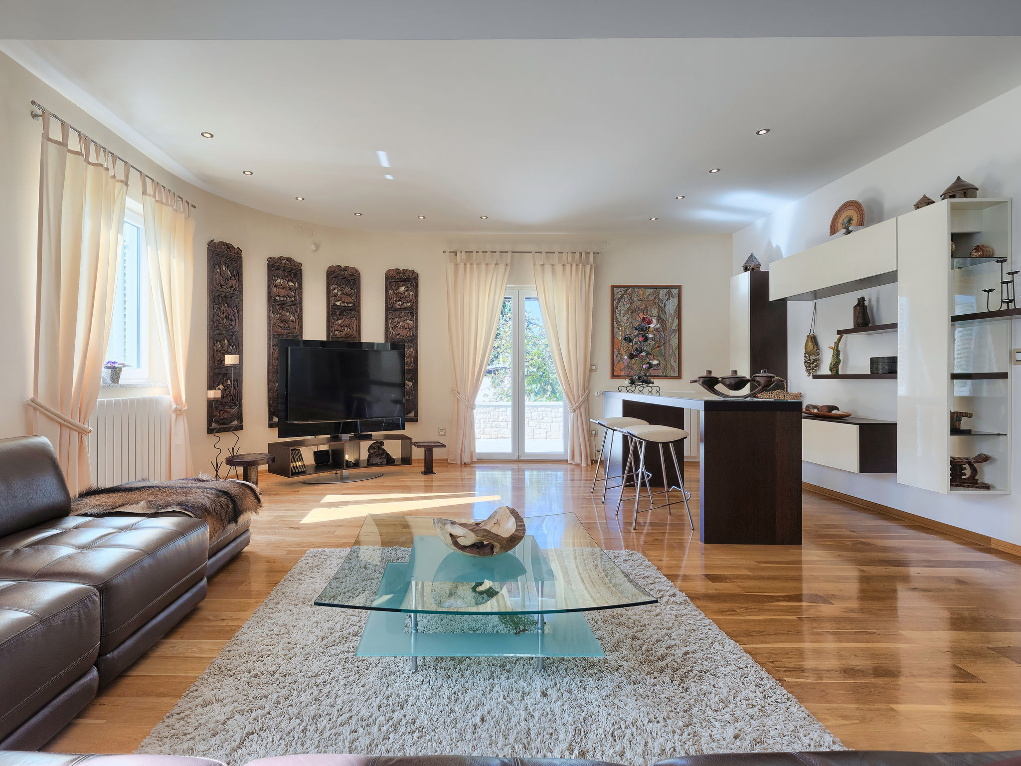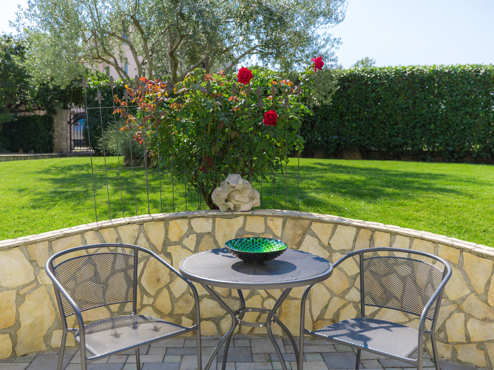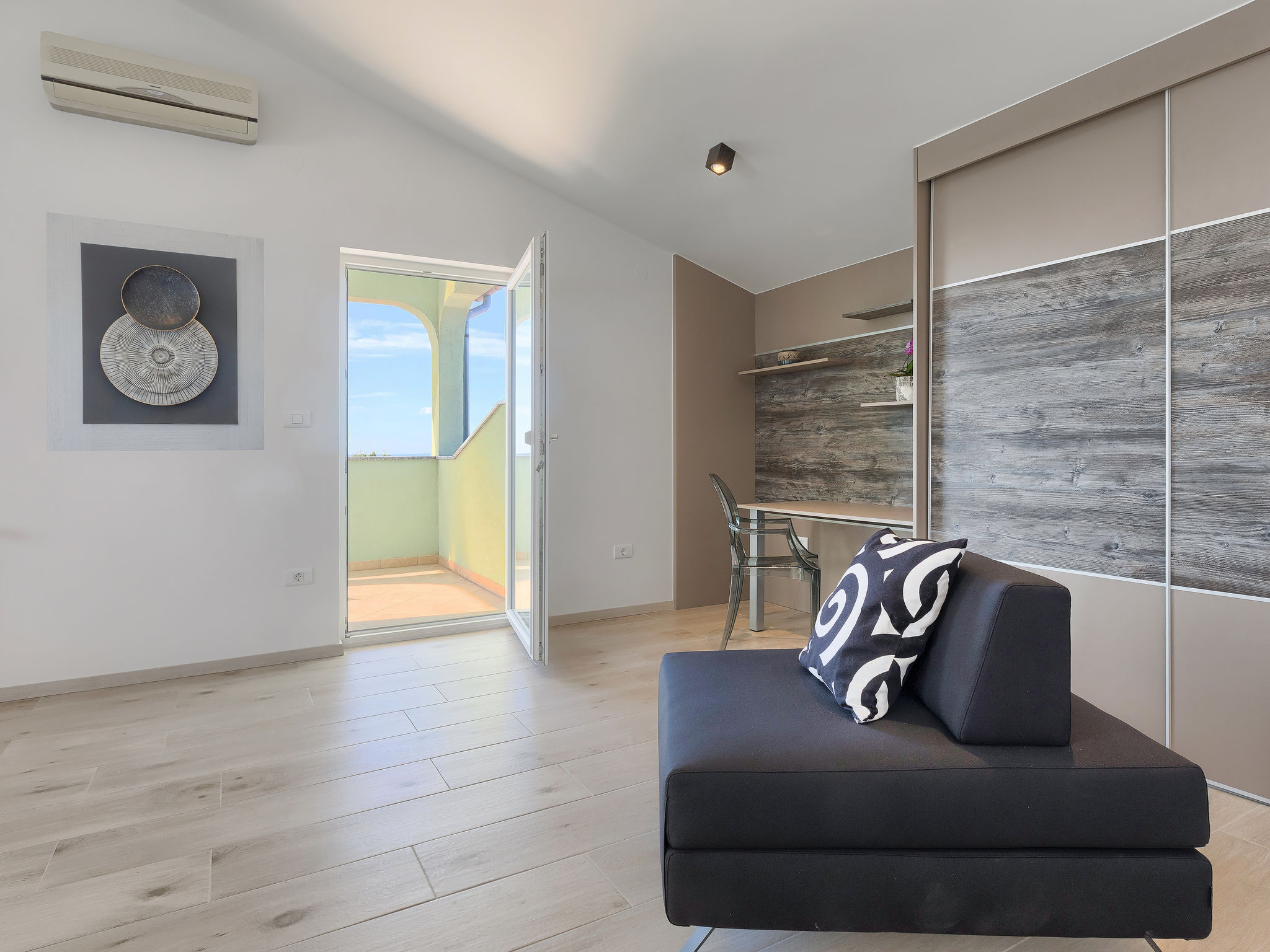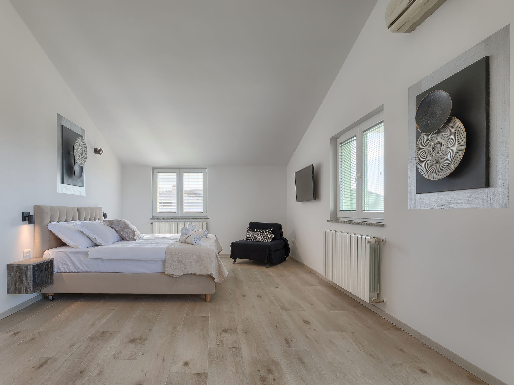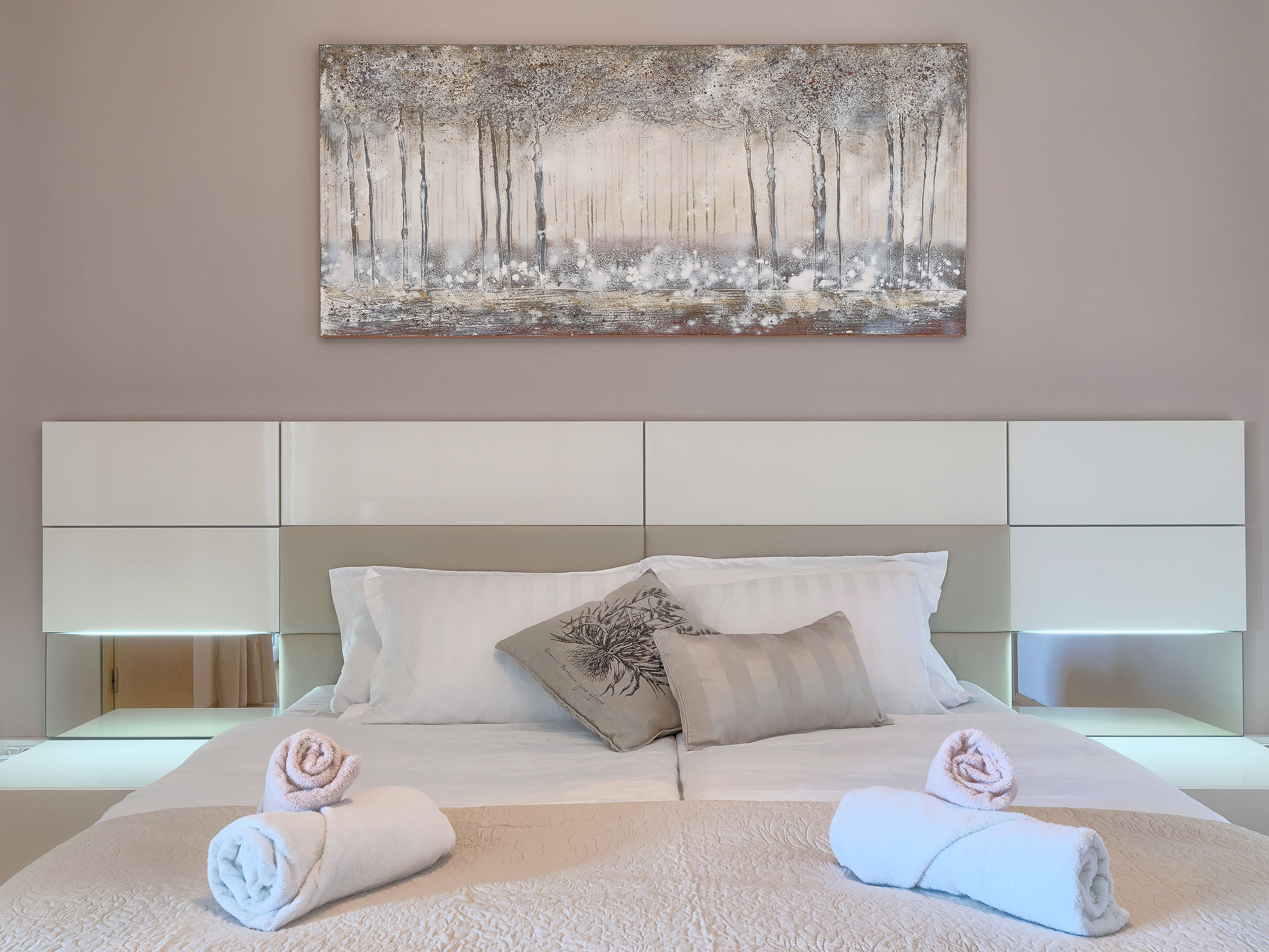 6-Zimmer-Villa 315 m2 auf 3 Stockwerken. Wohn-/Esszimmer mit Sat-TV (Flachbildschirm), Klimaanlage. Ausgang zur Terrasse. Küche (Backofen, Geschirrspüler, 4 Glaskeramikherd Platten, Mikrowelle, Tiefkühler, elektrische Kaffeemaschine) mit Klimaanlage. Dusche/Bidet/WC. Obergeschoss: 1 Zimmer mit 1 franz. Bett (180 cm, Länge 200 cm), Klimaanlage. Ausgang zur Terrasse. 1 Zimmer mit 2 Betten (90 cm, Länge 200 cm), Sat-TV (Flachbildschirm), Klimaanlage. Ausgang zur Terrasse. 1 Zimmer mit 1 franz. Bett (180 cm, Länge 200 cm), Bad/Bidet/WC, Doppelwaschbecken, Sprudelbad und Klimaanlage. Dusche/Bidet/WC. 3. Obergeschoss: 1 Zimmer mit 2 Betten (90 cm, Länge 200 cm), 2 Diwanbetten (90 cm, Länge 200 cm), Sat-TV (Flachbildschirm), Klimaanlage. Ausgang zur Terrasse. 1 Zimmer mit 2 Betten (90 cm, Länge 200 cm), Klimaanlage. Dusche/Bidet/WC. Heizung (extra). Terrasse 20 m2, überdacht, 3 Terrassen 10 m2. Terrassenmöbel, Gartengrill (mobil), Liegestühle. Sicht auf das Meer und das Schwimmbad. Zur Verfügung: Safe, Babybett, Haartrockner. Internet (Wireless LAN, gratis). Parkplatz (überdacht, 1 Auto). Bei Belegung mit weniger Personen als der maximalen Personenzahl steht eine Etage nicht zur Verfügung.