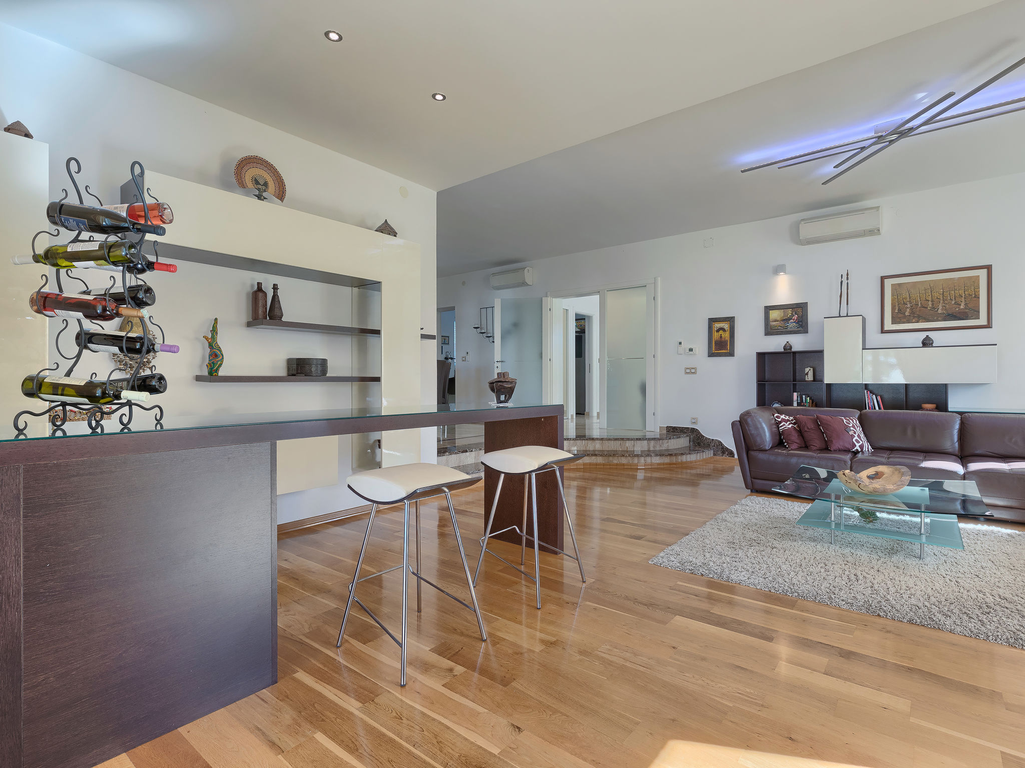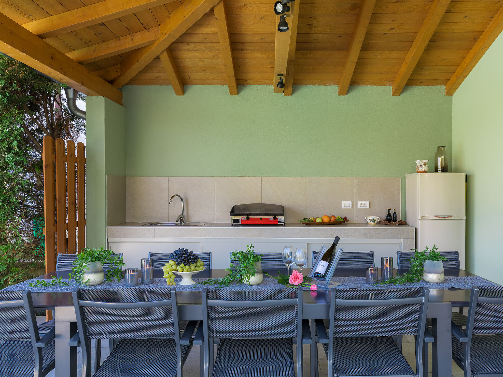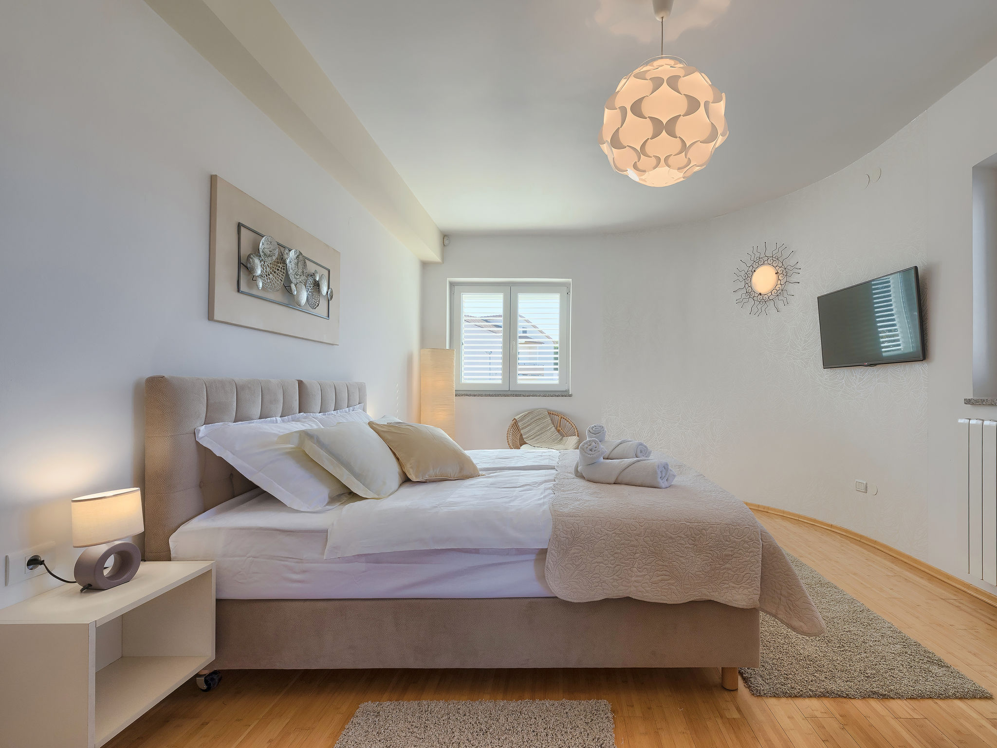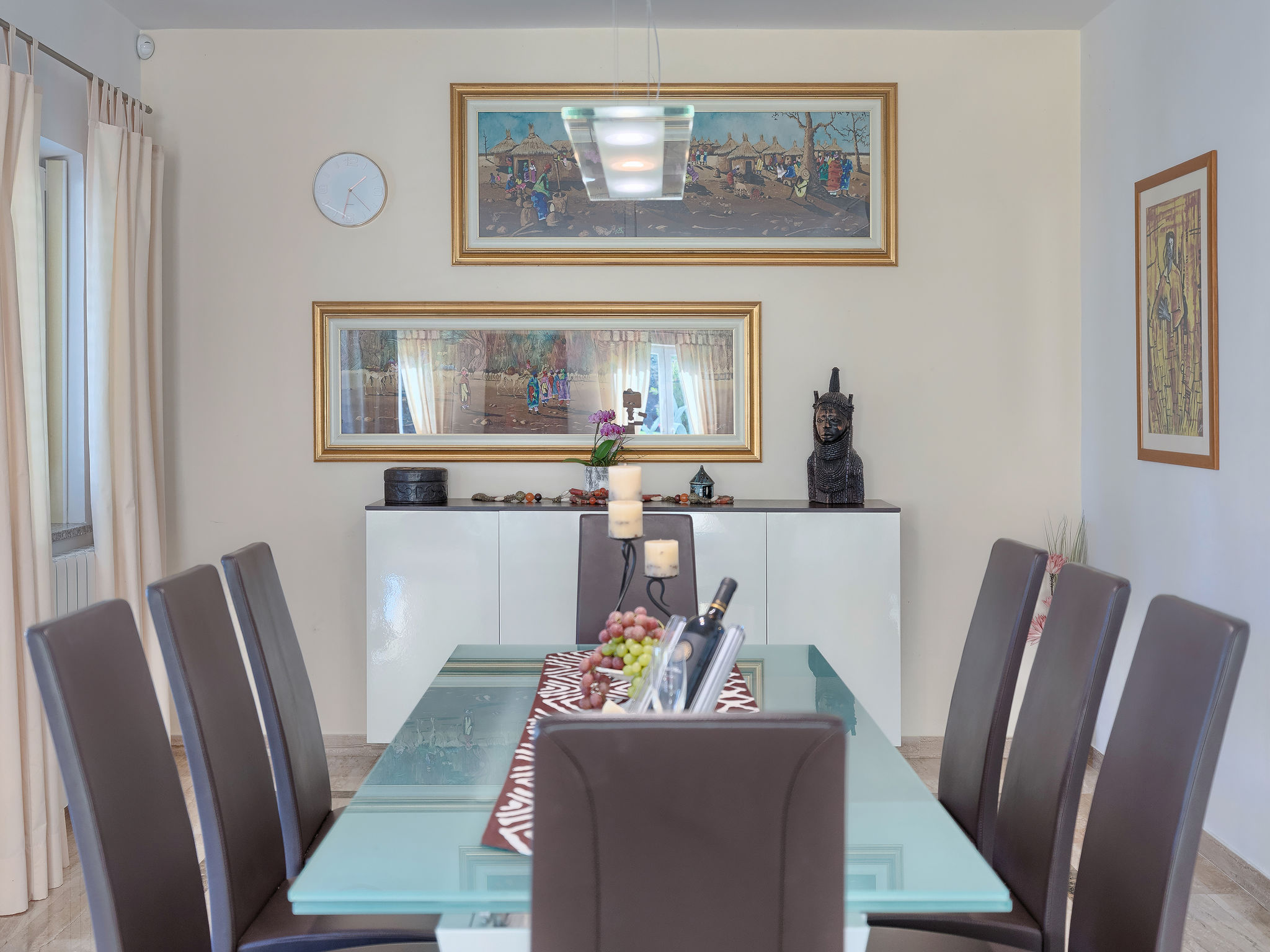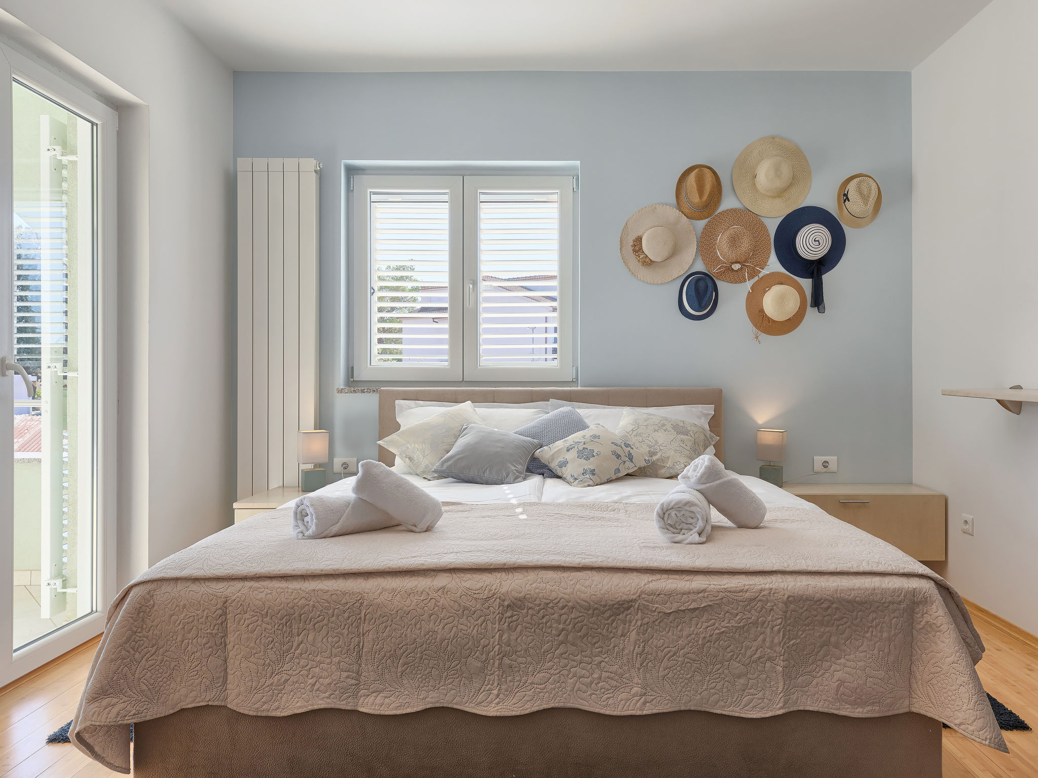 6-Zimmer-Villa 315 m2 auf 3 Stockwerken. Wohn-/Esszimmer mit Sat-TV (Flachbildschirm), Klimaanlage. Ausgang zur Terrasse. Küche (Backofen, Geschirrspüler, 4 Glaskeramikherd Platten, Mikrowelle, Tiefkühler, elektrische Kaffeemaschine) mit Klimaanlage. Dusche/Bidet/WC. Obergeschoss: 1 Zimmer mit 1 franz. Bett (180 cm, Länge 200 cm), Klimaanlage. Ausgang zur Terrasse. 1 Zimmer mit 2 Betten (90 cm, Länge 200 cm), Sat-TV (Flachbildschirm), Klimaanlage. Ausgang zur Terrasse. 1 Zimmer mit 1 franz. Bett (180 cm, Länge 200 cm), Bad/Bidet/WC, Doppelwaschbecken, Sprudelbad und Klimaanlage. Dusche/Bidet/WC. 3. Obergeschoss: 1 Zimmer mit 2 Betten (90 cm, Länge 200 cm), 2 Diwanbetten (90 cm, Länge 200 cm), Sat-TV (Flachbildschirm), Klimaanlage. Ausgang zur Terrasse. 1 Zimmer mit 2 Betten (90 cm, Länge 200 cm), Klimaanlage. Dusche/Bidet/WC. Heizung (extra). Terrasse 20 m2, überdacht, 3 Terrassen 10 m2. Terrassenmöbel, Gartengrill (mobil), Liegestühle. Sicht auf das Meer und das Schwimmbad. Zur Verfügung: Safe, Babybett, Haartrockner. Internet (Wireless LAN, gratis). Parkplatz (überdacht, 1 Auto). Bei Belegung mit weniger Personen als der maximalen Personenzahl steht eine Etage nicht zur Verfügung.