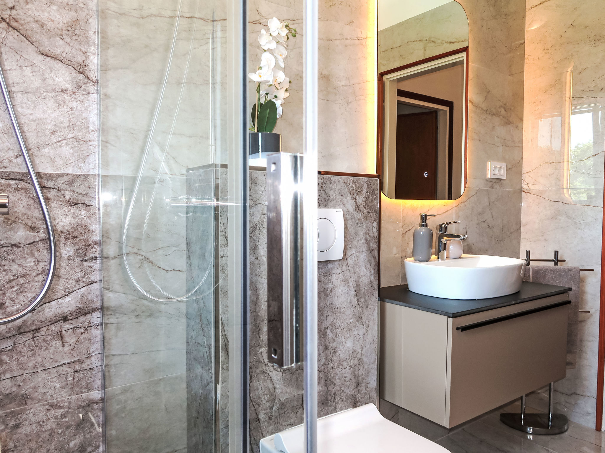 Doppelhaus "Anteo (LBN383)", auf 2 Stockwerken. Im Weiler Bečići, 4 km vom Zentrum von Labin, 10 km vom Zentrum von Rabac, 10 km vom Meer. Zur Alleinbenutzung: Grundstück 500 m2 mit Rasen und Bäumen, Schwimmbad eckig (7 x 4 m, 130 cm tief, 01.05.-31.10.) mit Innentreppe. Aussendusche, Terrasse, Grill, Poolpflege durch den Besitzer/Gärtner. Im Hause: Internetzugang, Waschmaschine. Parkplatz (für 2 Autos) auf dem Grundstück. Supermarkt 4 km, Kieselstrand 10 km. Bitte beachten: Flugplatz 47 km vom Haus. Motorboot des Hausbesitzers kann gemietet werden (auf Anfrage, extra). Bitte beachten: Lizenz erforderlich.