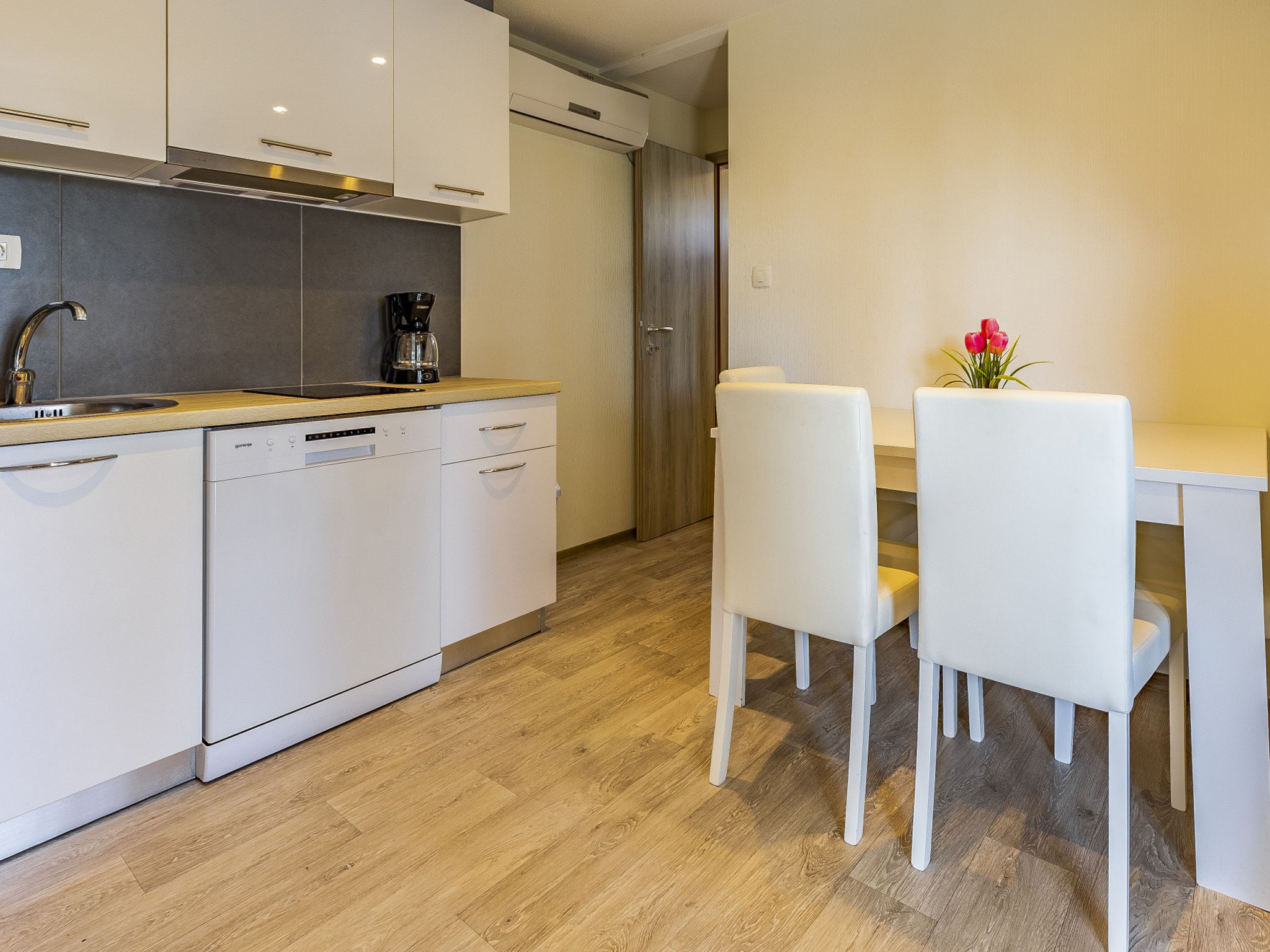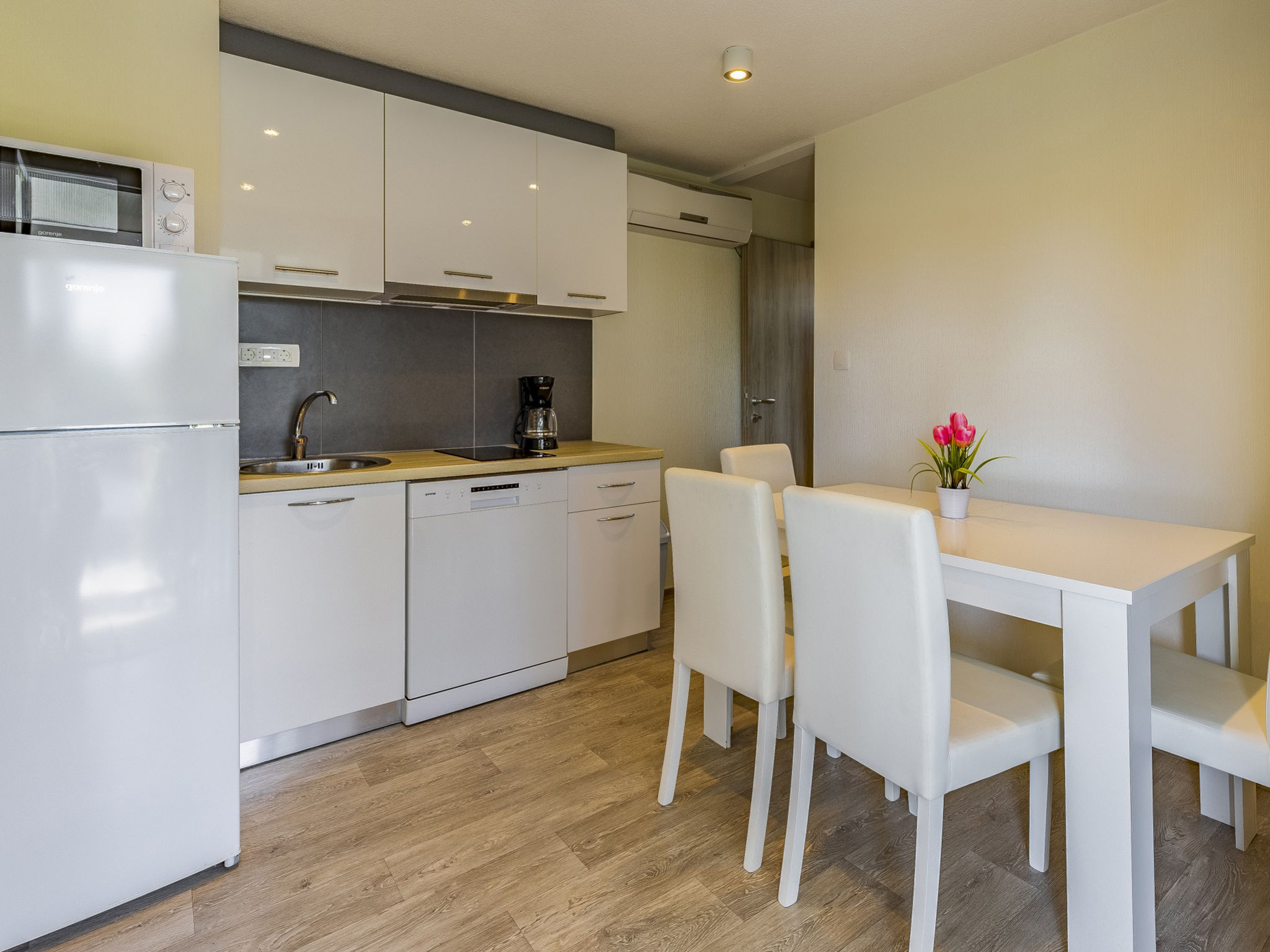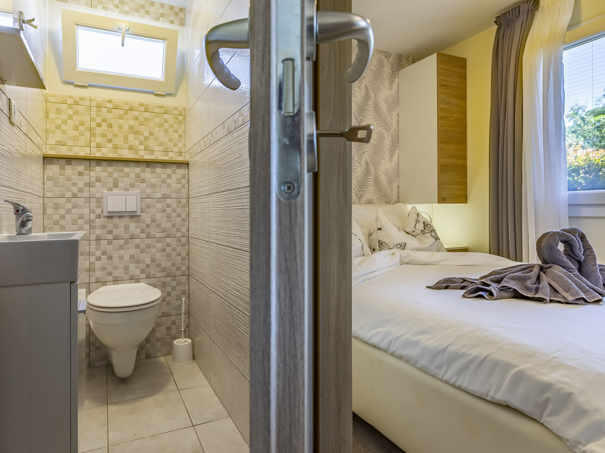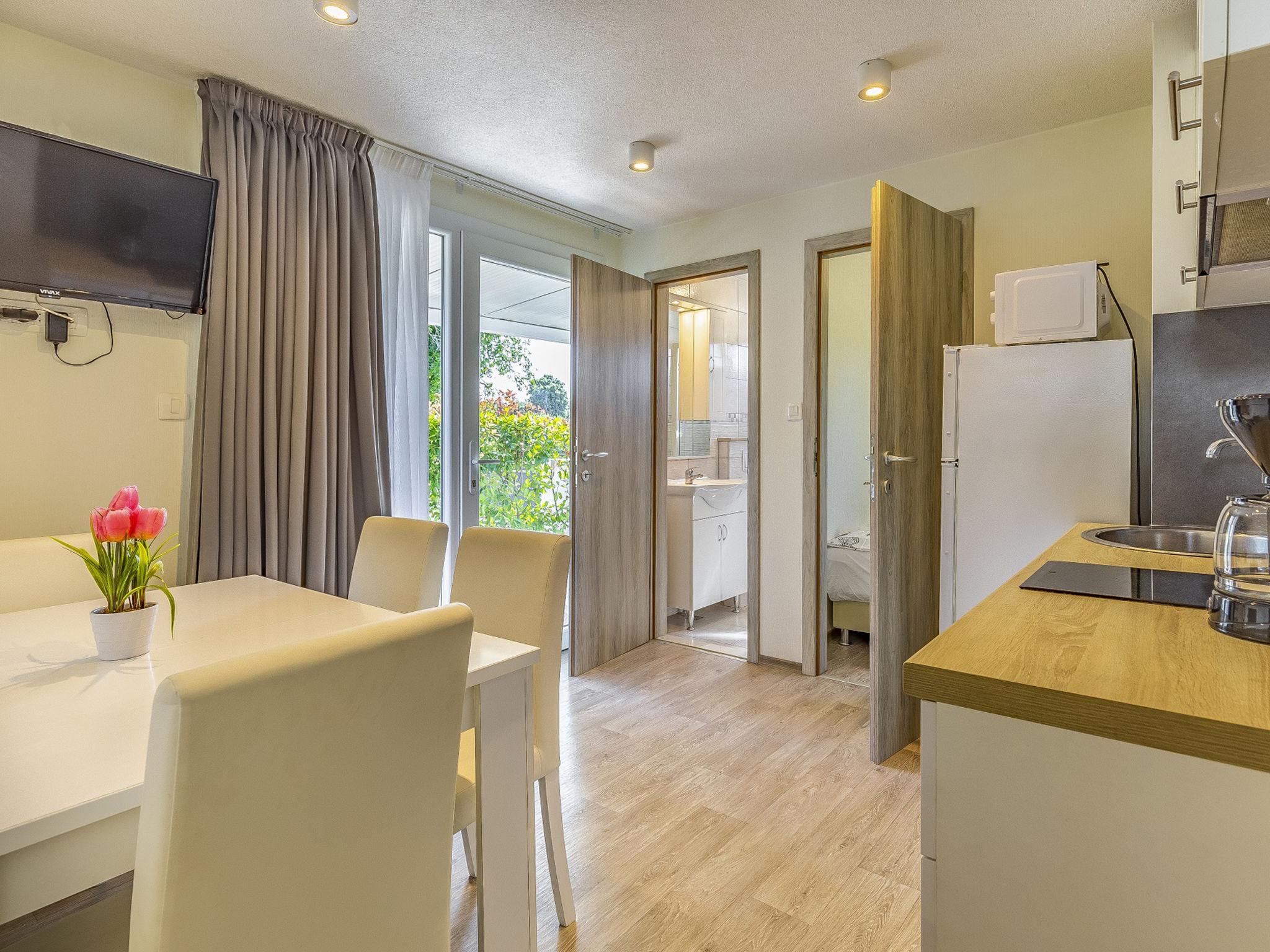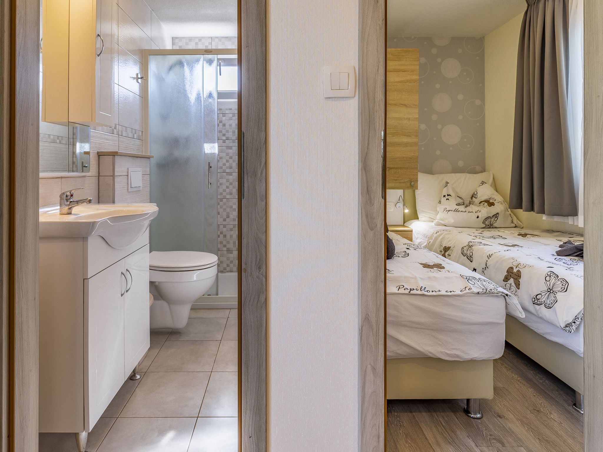 "Premium", 3-Zimmer-Mobilheim 31 m2. Wohn-/Esszimmer mit Sat-TV (Flachbildschirm), Klimaanlage. Ausgang zur Terrasse. 1 Zimmer mit 1 franz. Bett (160 cm, Länge 200 cm). 1 Zimmer mit 2 Betten (90 cm, Länge 200 cm). Offene Küche (Geschirrspüler, 2 Glaskeramikherd Platten, Mikrowelle, Tiefkühler, elektrische Kaffeemaschine). Dusche/WC, sep. WC. Terrasse 15 m2, überdacht. Terrassenmöbel. Zur Verfügung: Internet (Wireless LAN, gratis). 1 Haustier/Hund erlaubt.