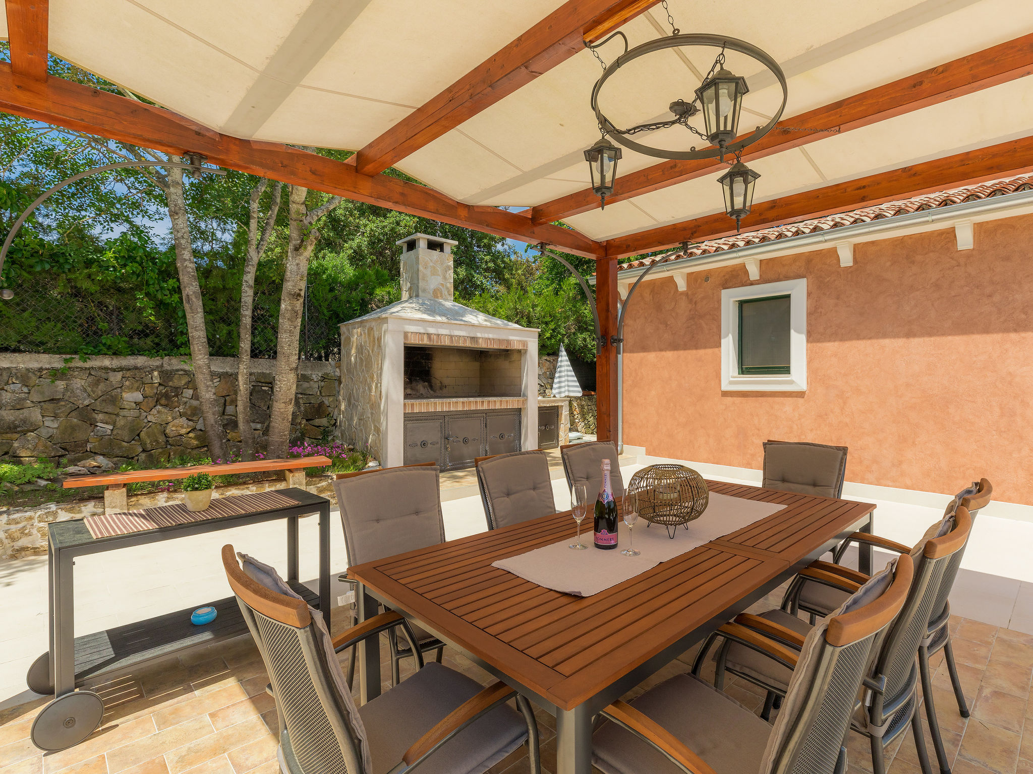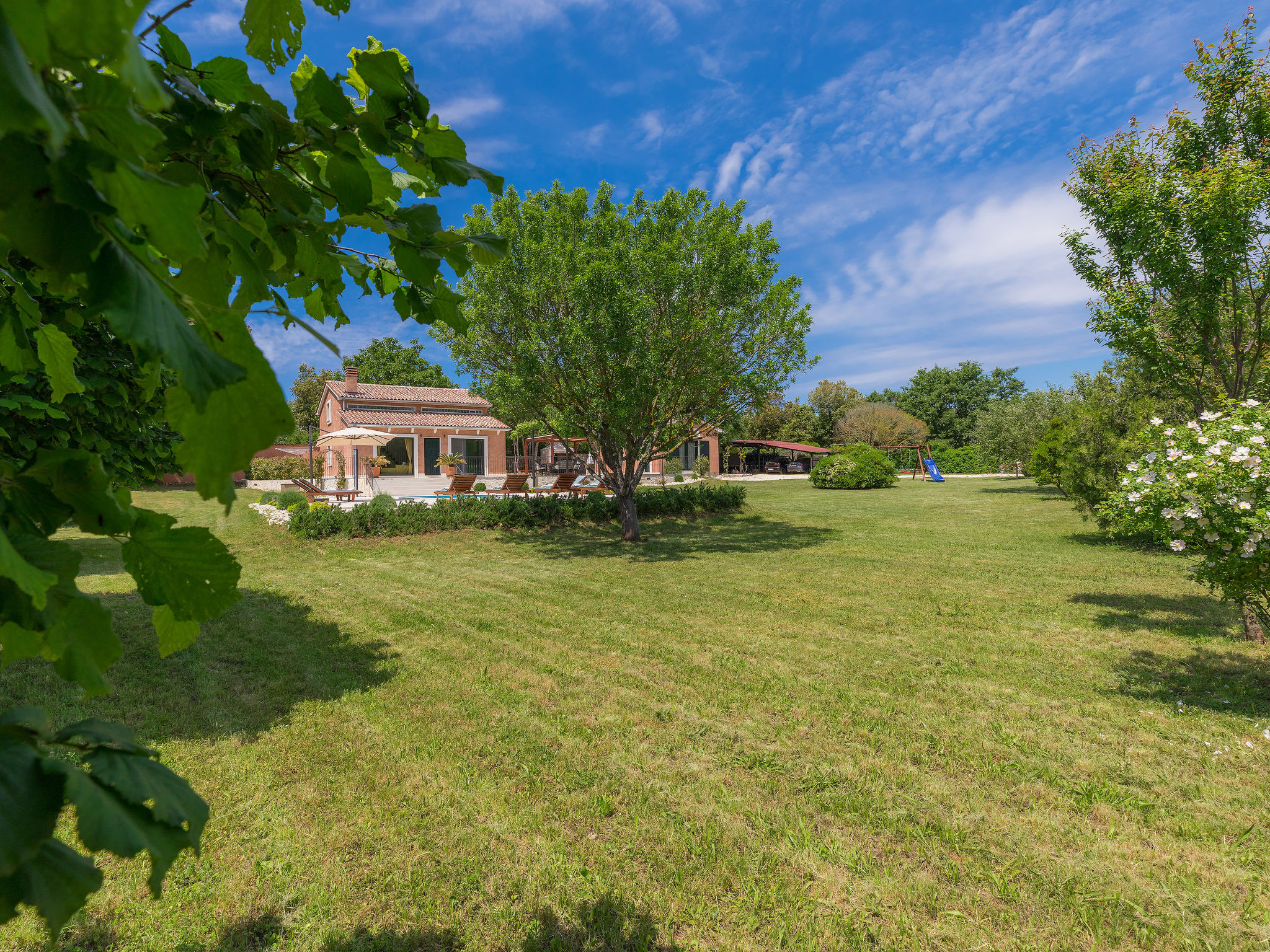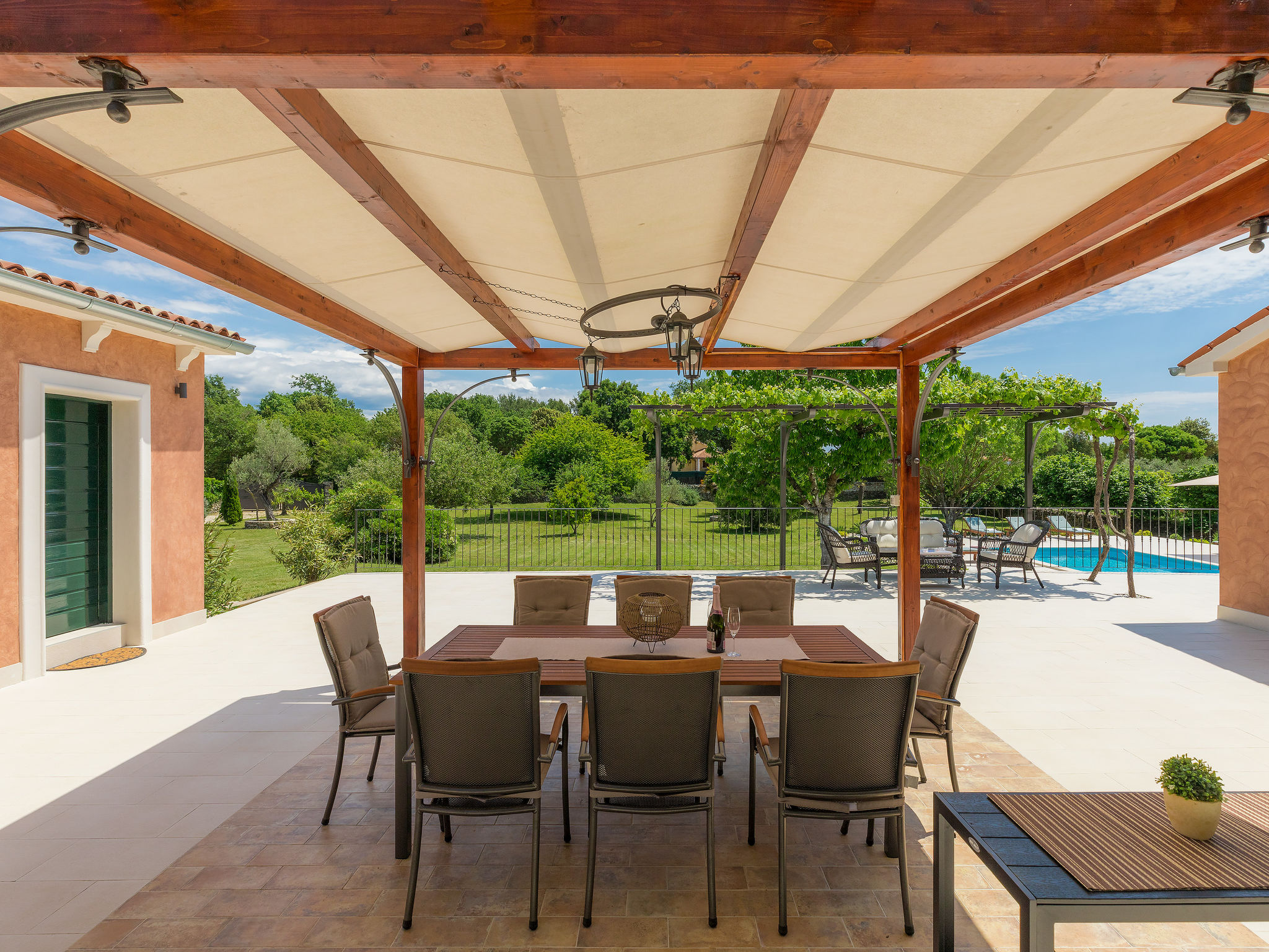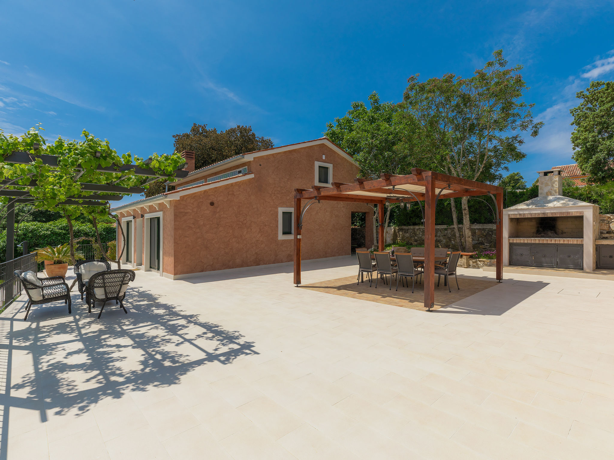 6-Zimmer-Haus 200 m2 auf 2 Stockwerken. Geschmackvoll eingerichtet: Wohn-/Esszimmer 20 m2 mit 1 Doppeldiwanbett (160 cm, Länge 200 cm), Küchenblock und Sat-TV (Flachbildschirm), Klimaanlage. Ausgang zur Terrasse. 1 Zimmer mit 1 Doppelbett (2 x 90 cm, Länge 200 cm), Dusche/Bidet/WC und Sat-TV (Flachbildschirm), Klimaanlage. Wohn-/Esszimmer 35 m2 mit Sat-TV (Flachbildschirm), Klimaanlage. Ausgang zur Terrasse. 1 Zimmer mit 1 Doppelbett (2 x 90 cm, Länge 200 cm), Bad/Bidet/WC und Sat-TV (Flachbildschirm), Klimaanlage. Ausgang zur Terrasse. 1 Zimmer mit 2 Betten (90 cm, Länge 200 cm), Dusche/Bidet/WC und Sat-TV (Flachbildschirm), Klimaanlage. Offene Küche (Backofen, Geschirrspüler, 4 Glaskeramikherd Platten, Mikrowelle, Tiefkühler, elektrische Kaffeemaschine). Sep. WC. Obergeschoss: offene Galerie mit Sat-TV (Flachbildschirm), Klimaanlage. 1 Zimmer mit 1 Doppelbett (2 x 90 cm, Länge 200 cm), Dusche/Bidet/WC und Sat-TV (Flachbildschirm), Klimaanlage. Terrasse 30 m2, Terrasse 15 m2. Terrassenmöbel, Liegestühle. Sicht auf das Schwimmbad. Zur Verfügung: Safe, Bügeleisen, Babybett, Haartrockner. Internet (Wireless LAN, gratis). Parkplatz (überdacht, 3 Autos). Terrasse 6 m2, überdacht.