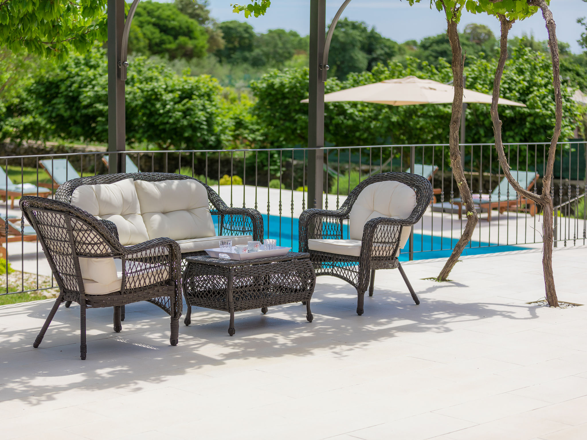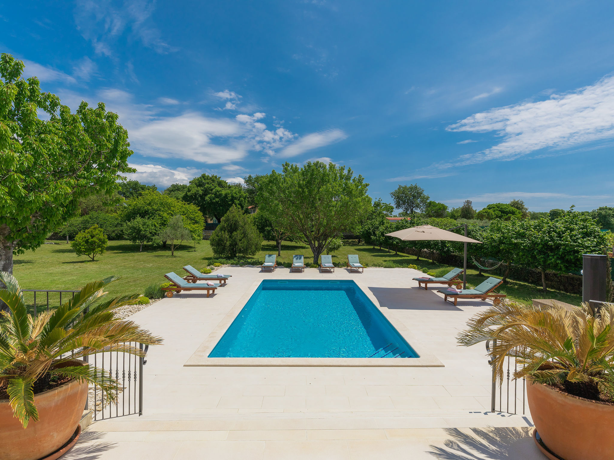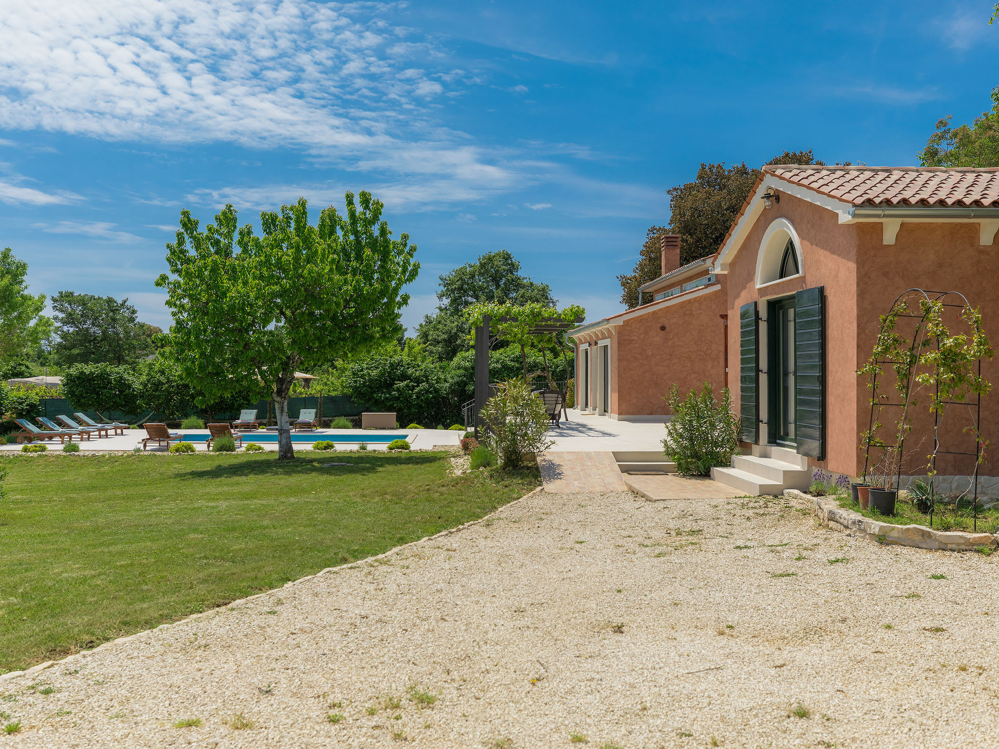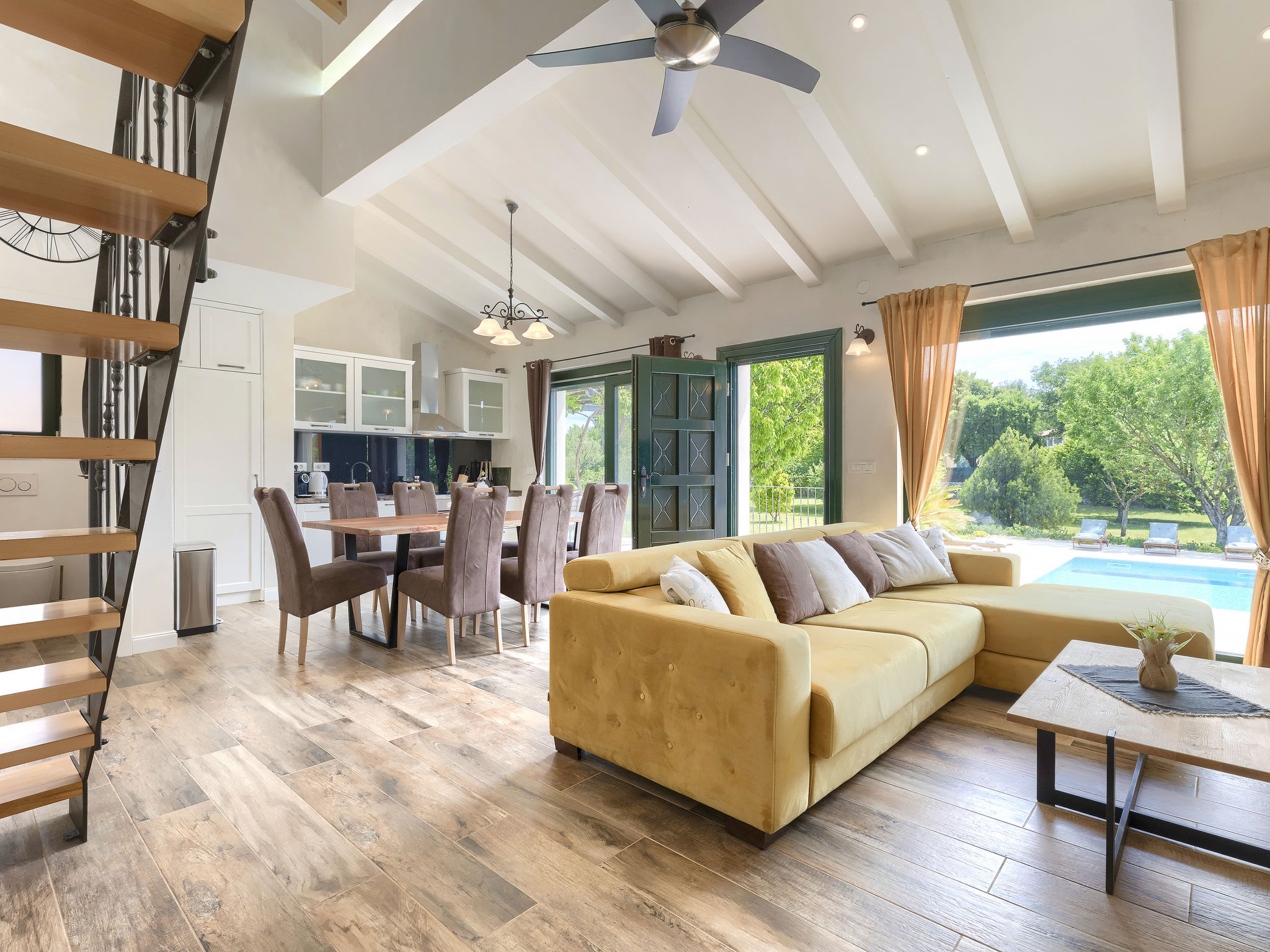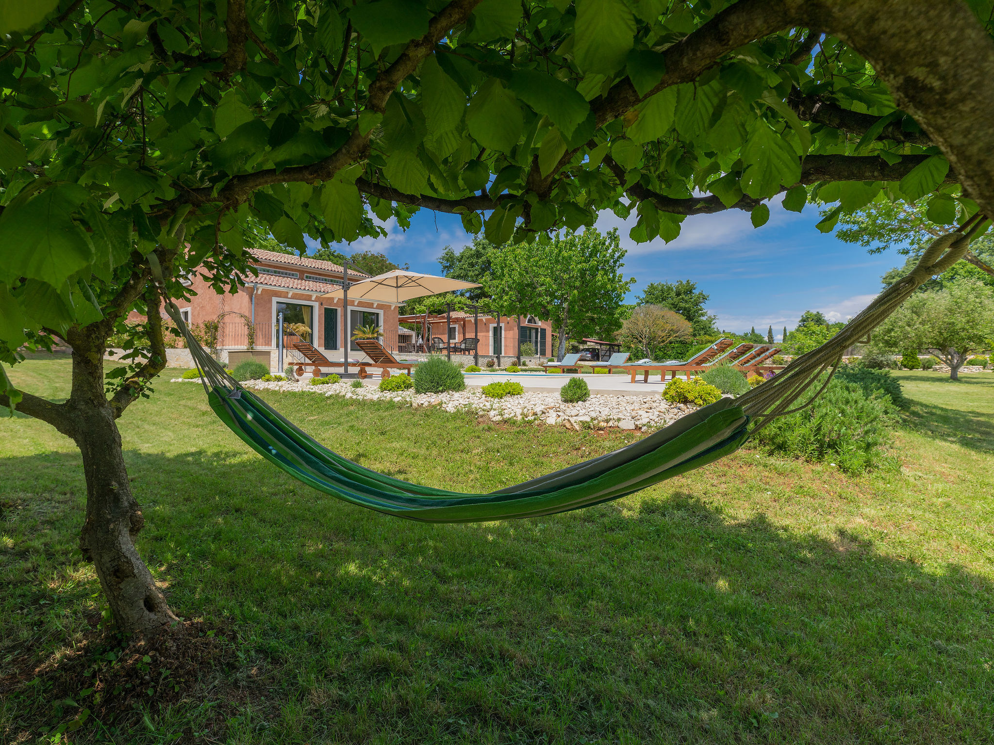6-Zimmer-Haus 200 m2 auf 2 Stockwerken. Geschmackvoll eingerichtet: Wohn-/Esszimmer 20 m2 mit 1 Doppeldiwanbett (160 cm, Länge 200 cm), Küchenblock und Sat-TV (Flachbildschirm), Klimaanlage. Ausgang zur Terrasse. 1 Zimmer mit 1 Doppelbett (2 x 90 cm, Länge 200 cm), Dusche/Bidet/WC und Sat-TV (Flachbildschirm), Klimaanlage. Wohn-/Esszimmer 35 m2 mit Sat-TV (Flachbildschirm), Klimaanlage. Ausgang zur Terrasse. 1 Zimmer mit 1 Doppelbett (2 x 90 cm, Länge 200 cm), Bad/Bidet/WC und Sat-TV (Flachbildschirm), Klimaanlage. Ausgang zur Terrasse. 1 Zimmer mit 2 Betten (90 cm, Länge 200 cm), Dusche/Bidet/WC und Sat-TV (Flachbildschirm), Klimaanlage. Offene Küche (Backofen, Geschirrspüler, 4 Glaskeramikherd Platten, Mikrowelle, Tiefkühler, elektrische Kaffeemaschine). Sep. WC. Obergeschoss: offene Galerie mit Sat-TV (Flachbildschirm), Klimaanlage. 1 Zimmer mit 1 Doppelbett (2 x 90 cm, Länge 200 cm), Dusche/Bidet/WC und Sat-TV (Flachbildschirm), Klimaanlage. Terrasse 30 m2, Terrasse 15 m2. Terrassenmöbel, Liegestühle. Sicht auf das Schwimmbad. Zur Verfügung: Safe, Bügeleisen, Babybett, Haartrockner. Internet (Wireless LAN, gratis). Parkplatz (überdacht, 3 Autos). Terrasse 6 m2, überdacht.
