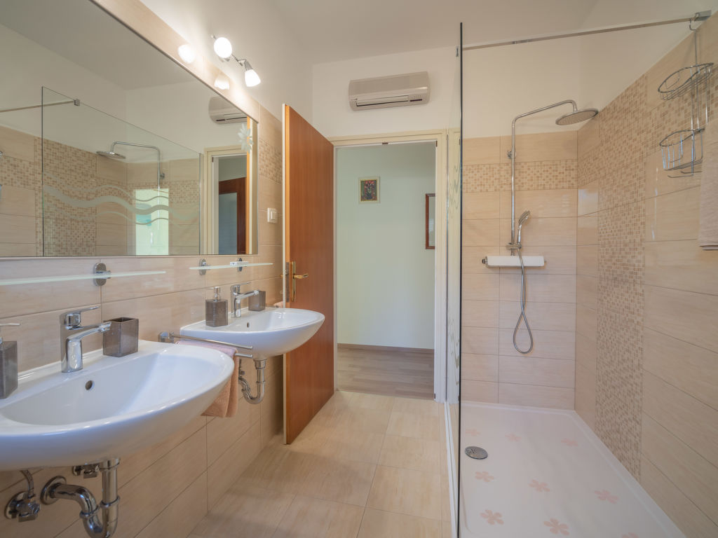 4-Zimmer-Wohnung 120 m2, im erhöhten Erdgeschoss. Wohn-/Esszimmer 30 m2 mit TV (Flachbildschirm), Klimaanlage. Ausgang zur Terrasse. 1 Zimmer mit 2 Betten (90 cm, Länge 190 cm). 1 Zimmer mit 1 franz. Bett (180 cm, Länge 200 cm). Ausgang zur Terrasse. 1 Zimmer mit 1 franz. Bett (140 cm, Länge 200 cm). Ausgang zum Balkon. Offene Küche (Backofen, Geschirrspüler, 4 Glaskeramikherd Platten, Tiefkühler). Dusche/WC, Doppelwaschbecken. Balkon 4 m2, Terrasse 16 m2 teilweise überdacht. Terrassenmöbel. Zur Verfügung: Waschmaschine, Babybett, Haartrockner. Internet (Wireless LAN, gratis). Garage (2 Autos). Bitte beachten: eigener Eingang.